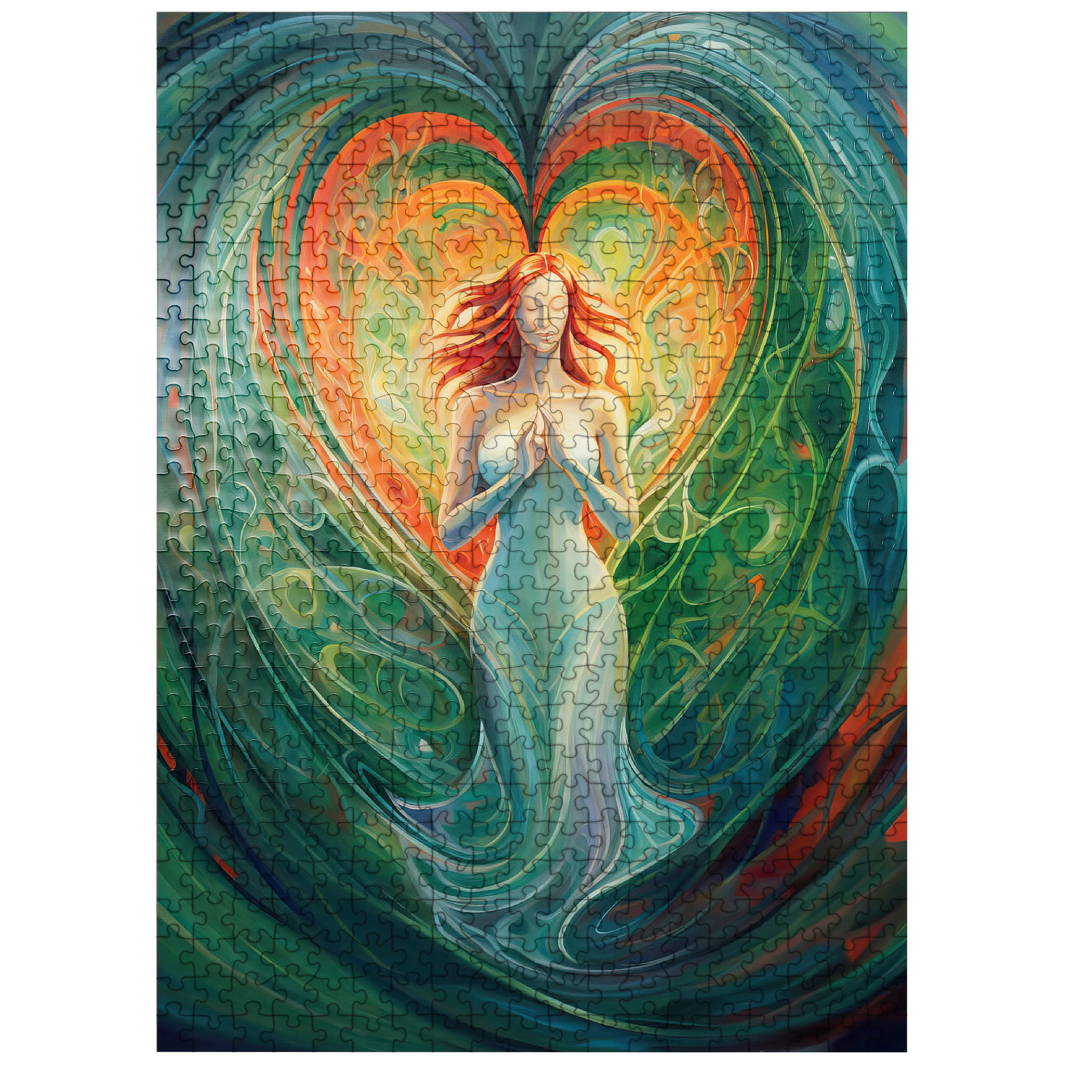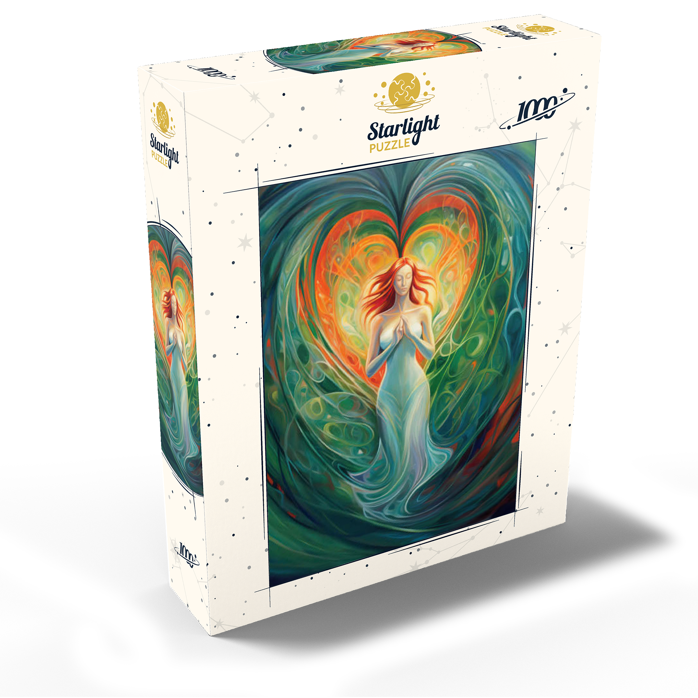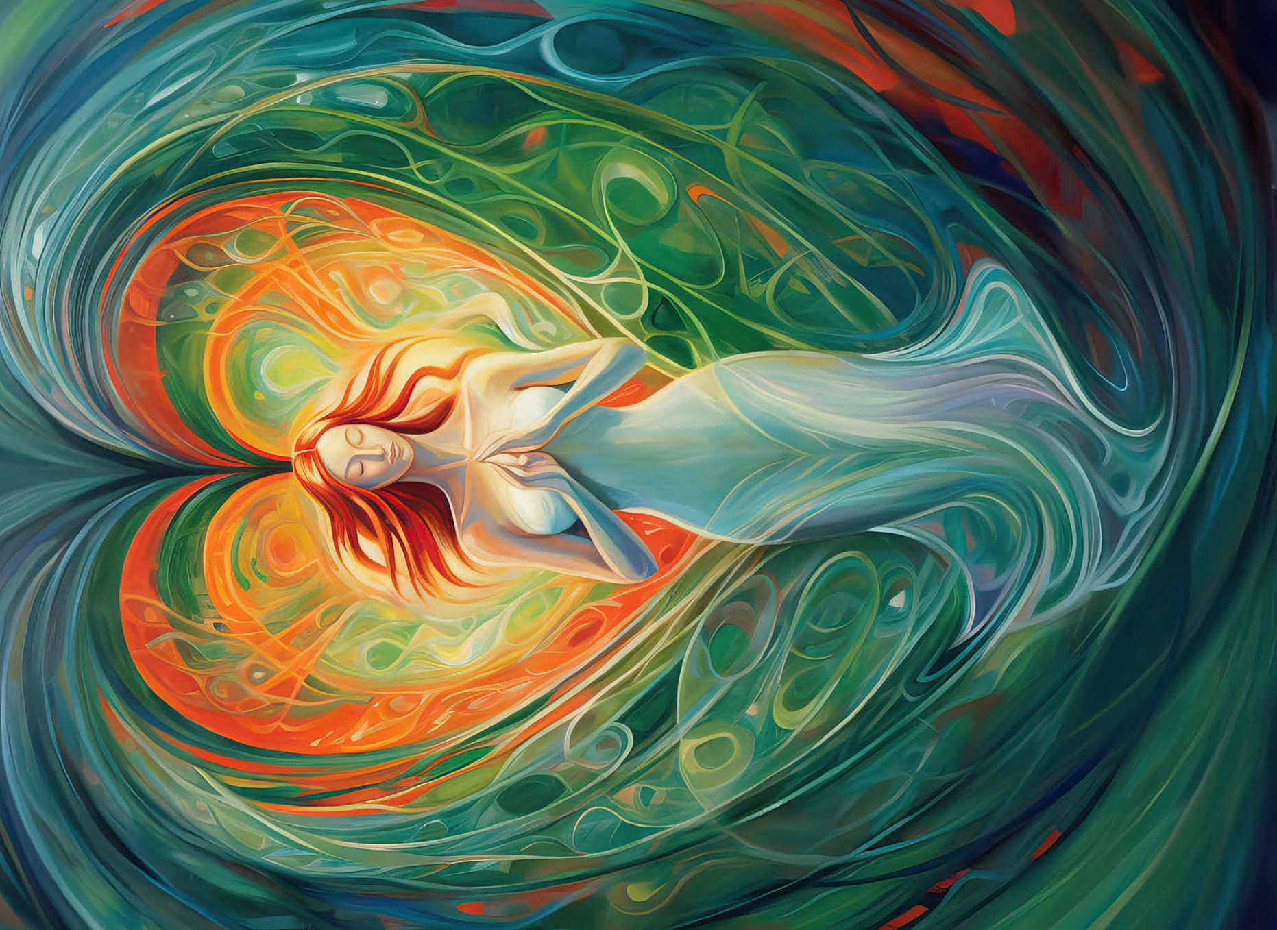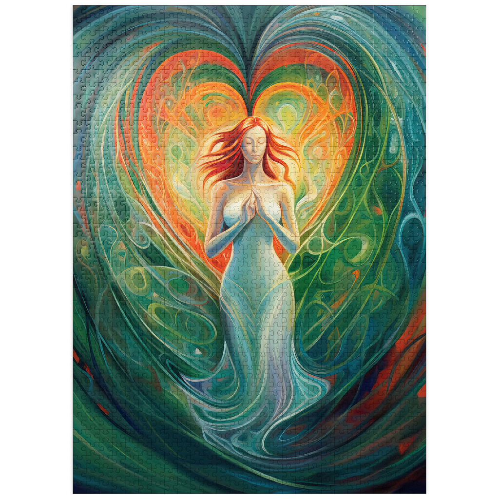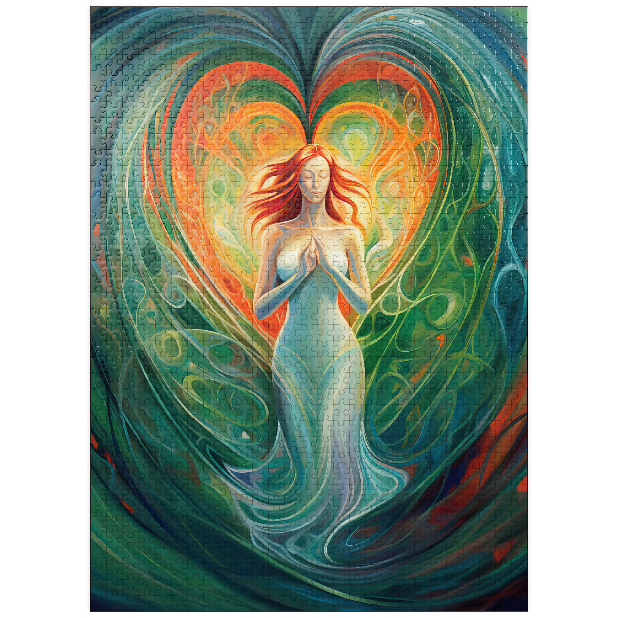 A breathtaking digital artwork featuring an ethereal goddess with flowing red hair, centered within a glowing heart-shaped aura. her serene expression and hands in a meditative pose evoke a deep sense of inner peace, love, and connection to nature. the swirling green and orange hues create a mesmerizing, almost dreamlike atmosphere, symbolizing balance, healing, and spiritual awakening. perfect for those who appreciate mystical, fantasy-inspired art, sacred feminine energy, and visionary aesthetics, this piece adds a touch of tranquility and inspiration to any space.