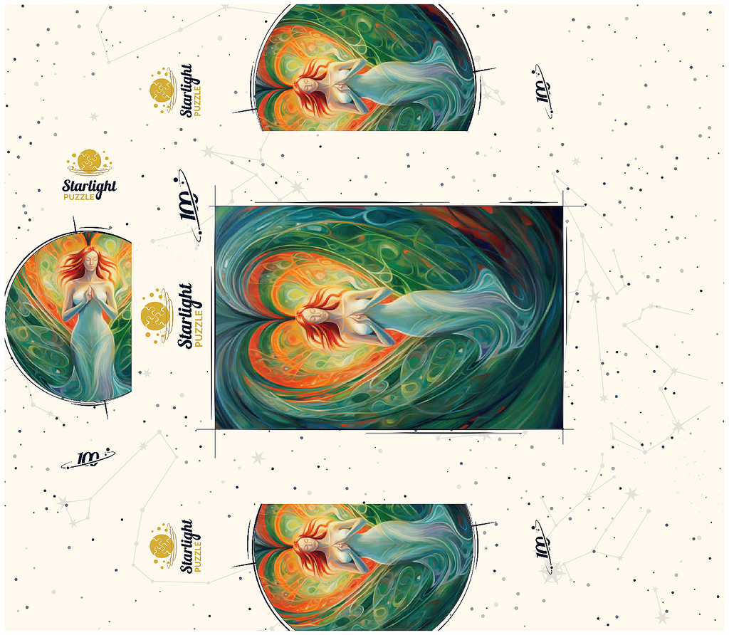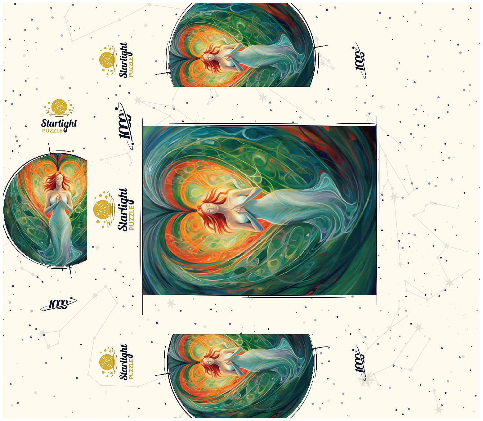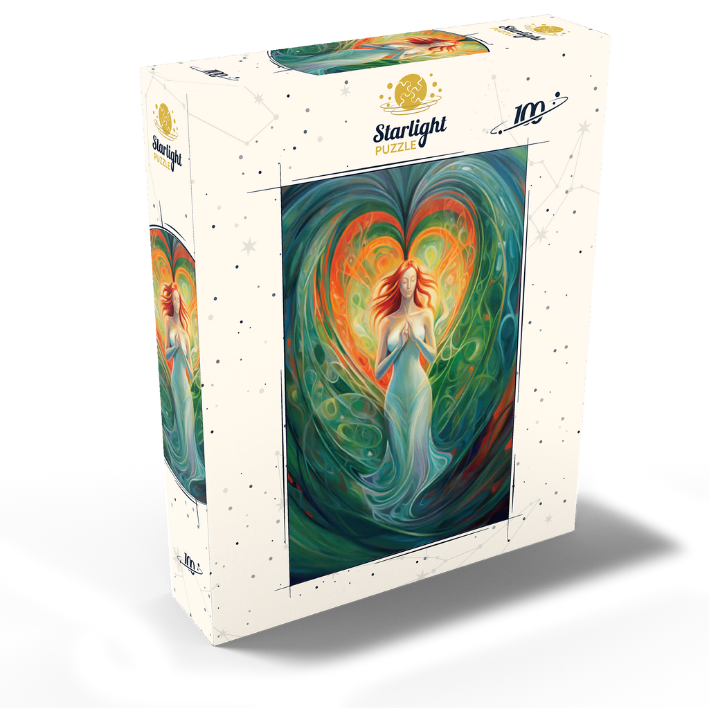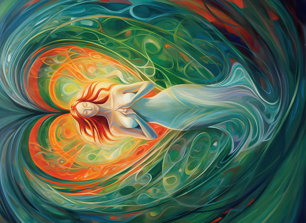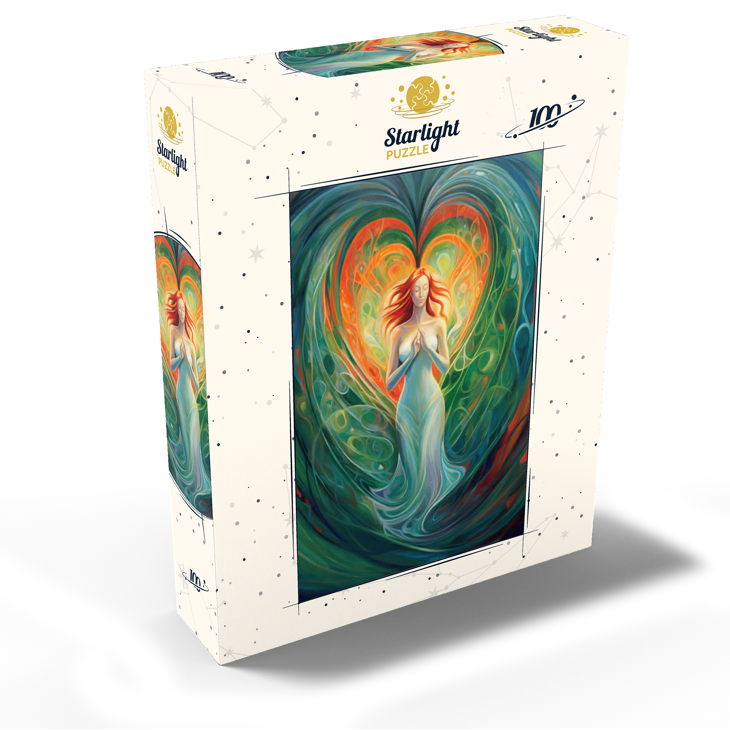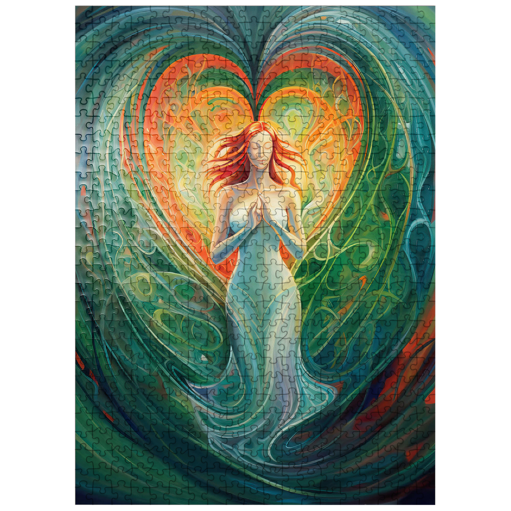 A breathtaking digital artwork featuring an ethereal goddess with flowing red hair, centered within a glowing heart-shaped aura. her serene expression and hands in a meditative pose evoke a deep sense of inner peace, love, and connection to nature. the swirling green and orange hues create a mesmerizing, almost dreamlike atmosphere, symbolizing balance, healing, and spiritual awakening. perfect for those who appreciate mystical, fantasy-inspired art, sacred feminine energy, and visionary aesthetics, this piece adds a touch of tranquility and inspiration to any space.