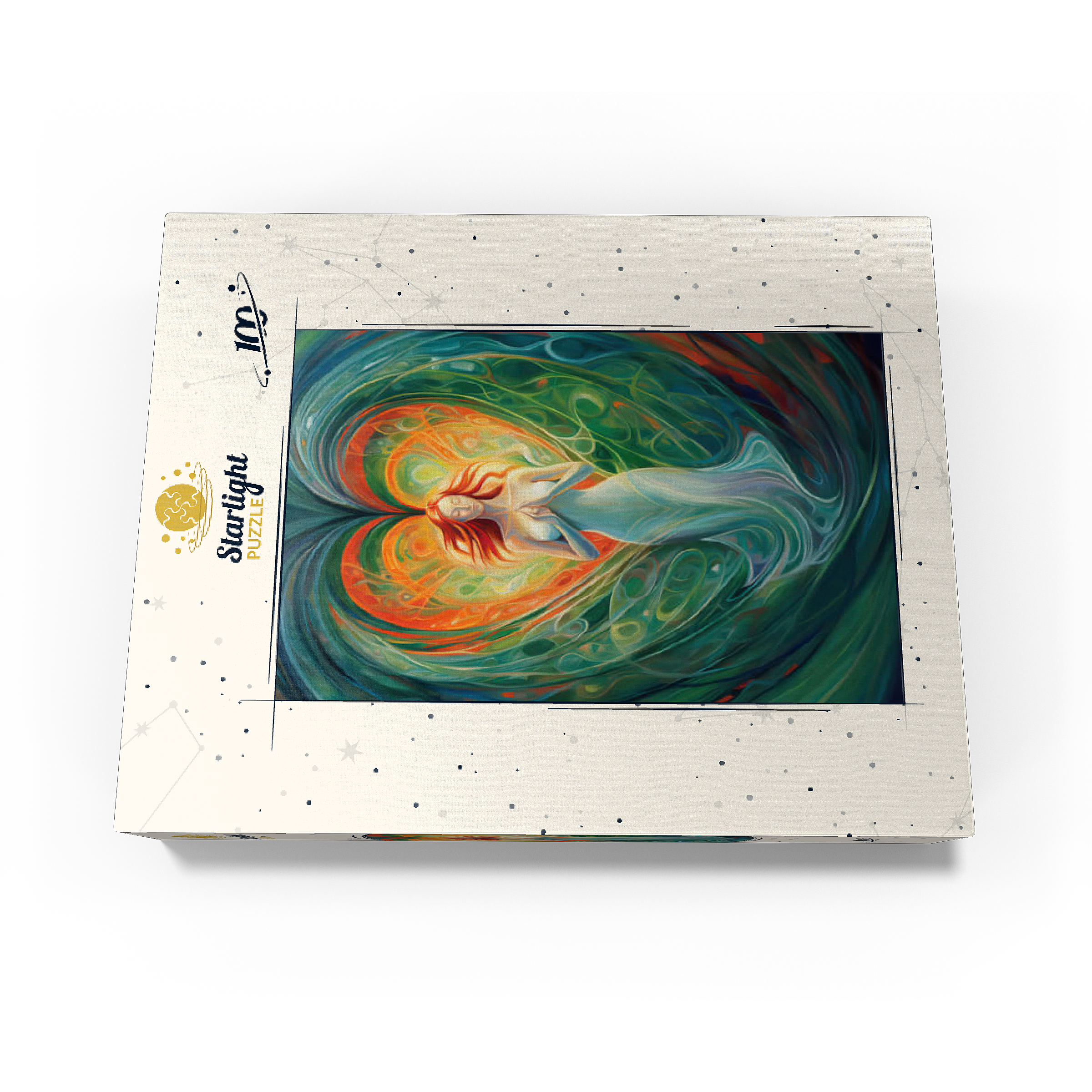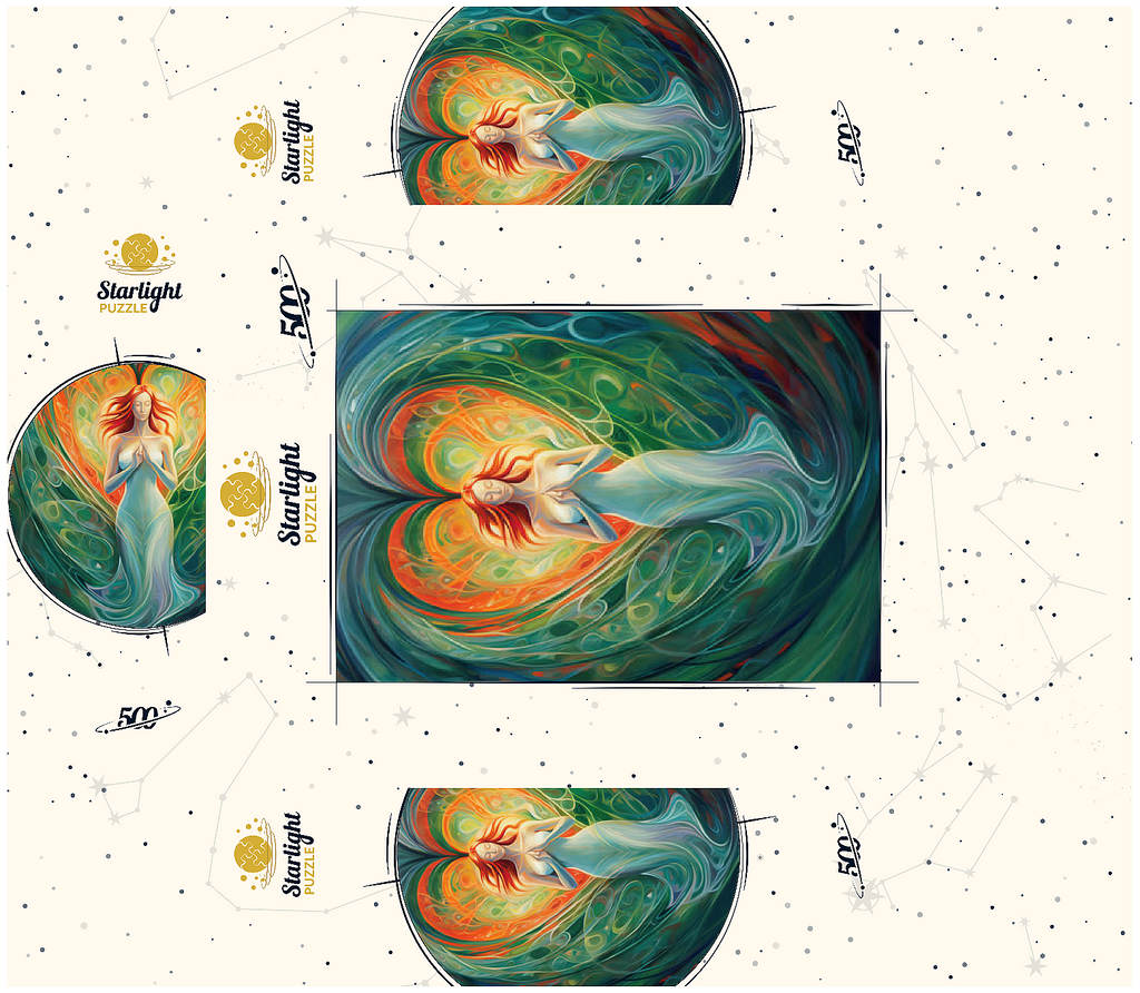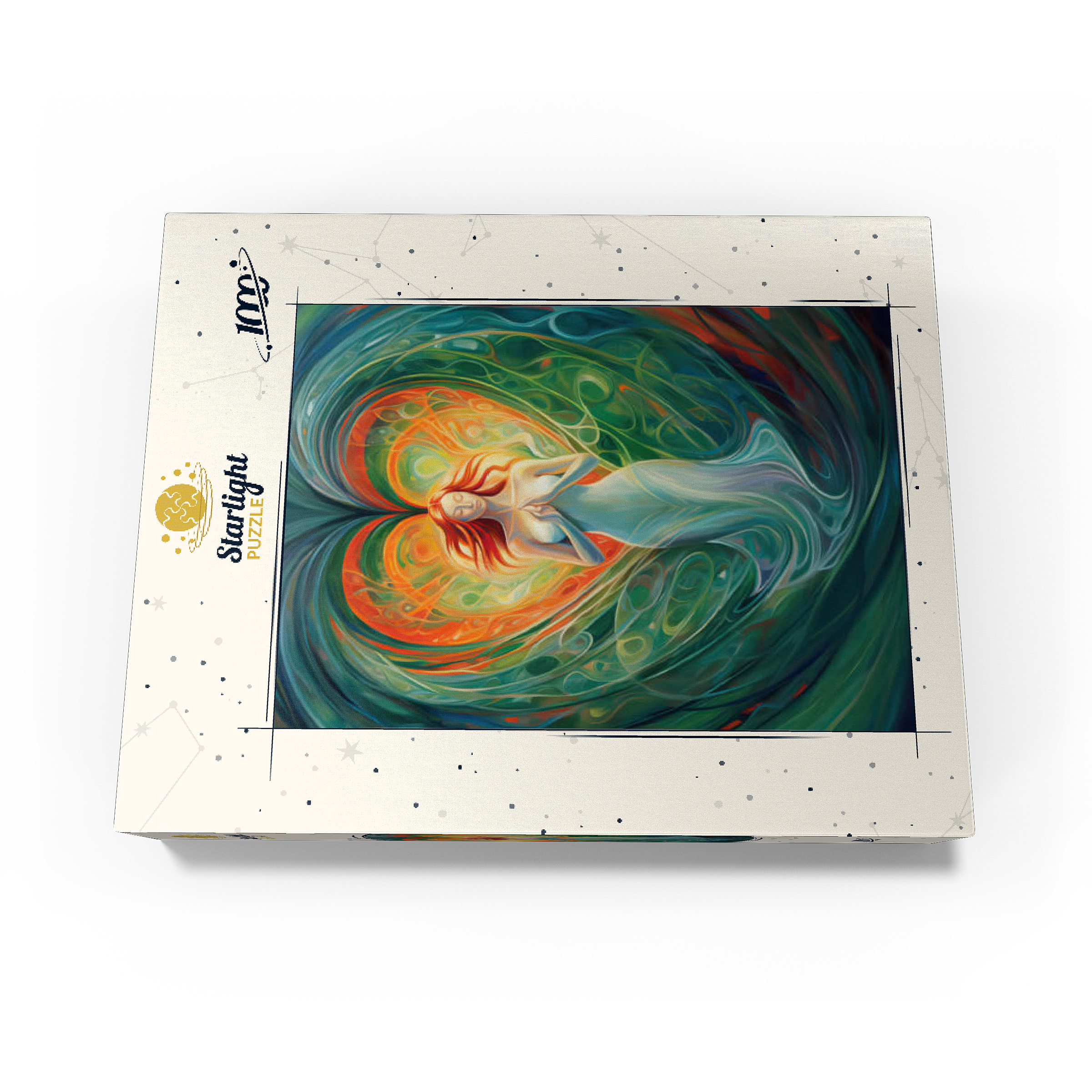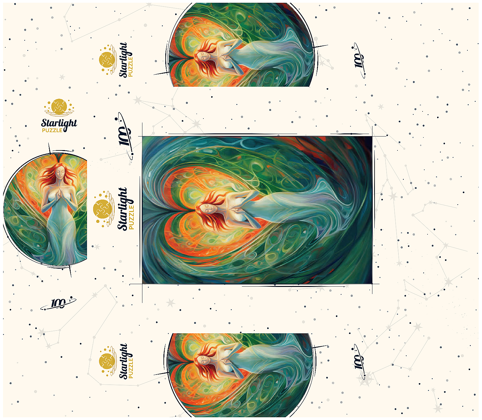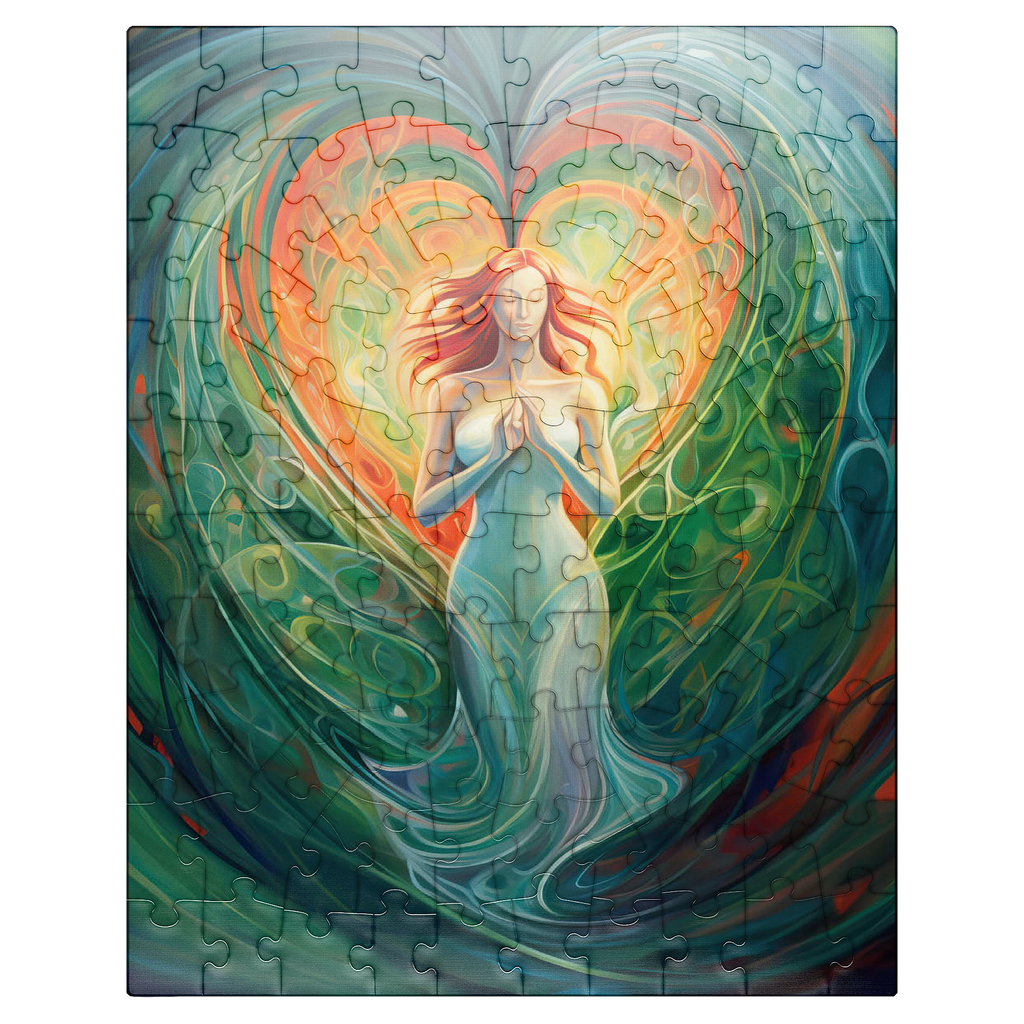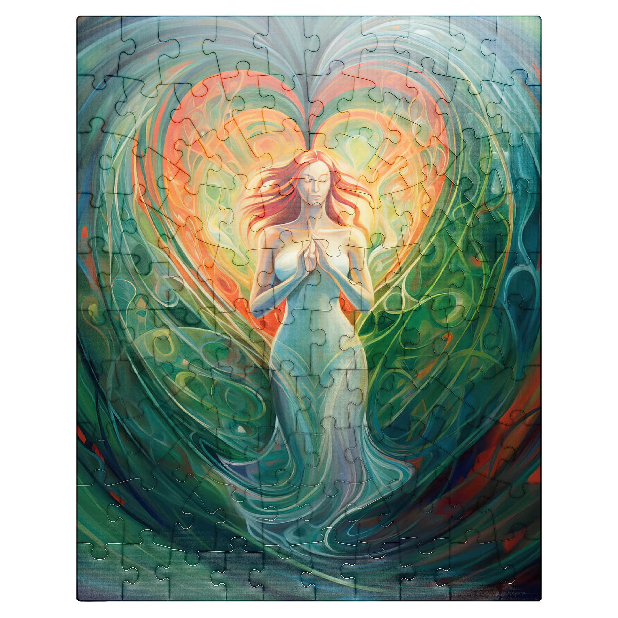 A breathtaking digital artwork featuring an ethereal goddess with flowing red hair, centered within a glowing heart-shaped aura. her serene expression and hands in a meditative pose evoke a deep sense of inner peace, love, and connection to nature. the swirling green and orange hues create a mesmerizing, almost dreamlike atmosphere, symbolizing balance, healing, and spiritual awakening. perfect for those who appreciate mystical, fantasy-inspired art, sacred feminine energy, and visionary aesthetics, this piece adds a touch of tranquility and inspiration to any space.