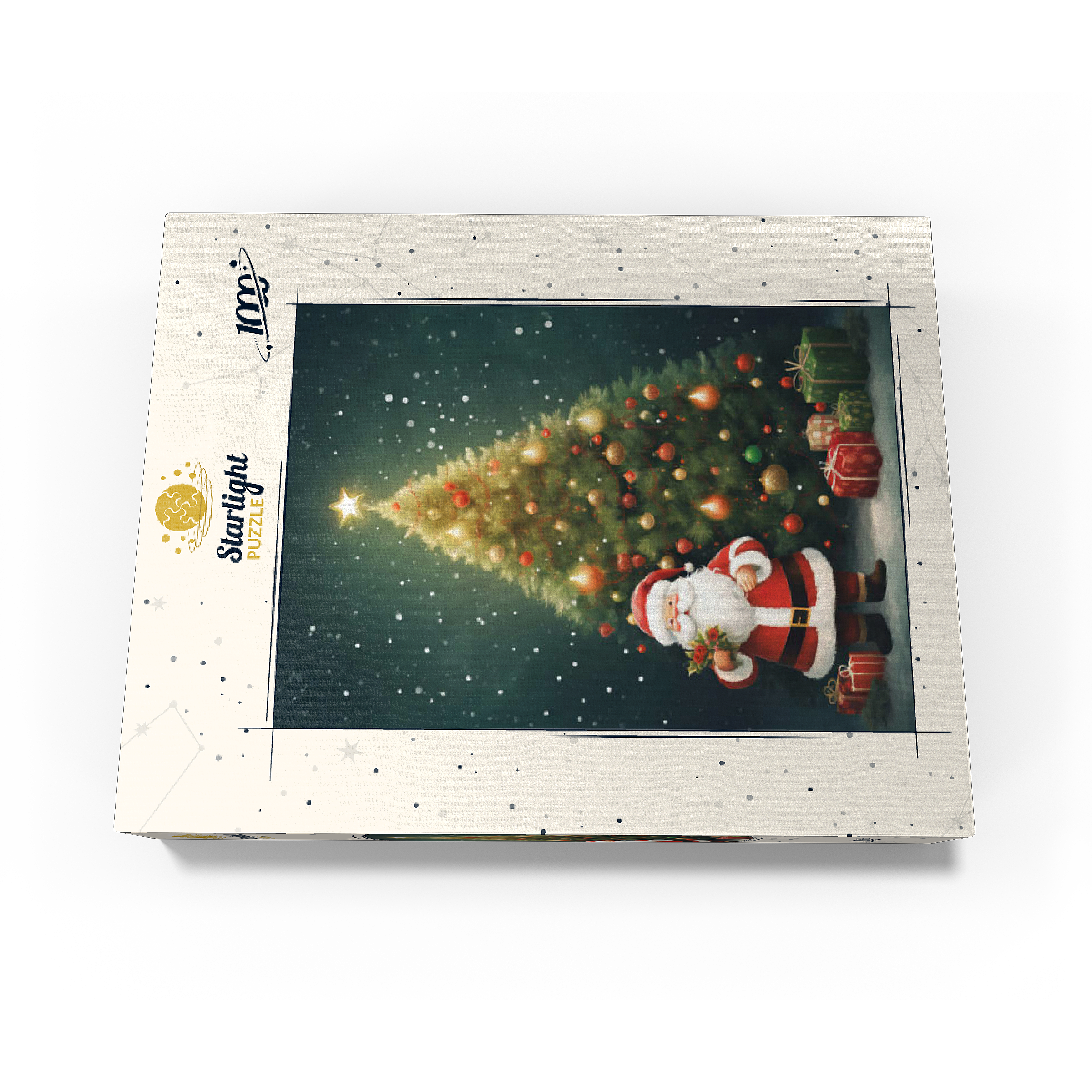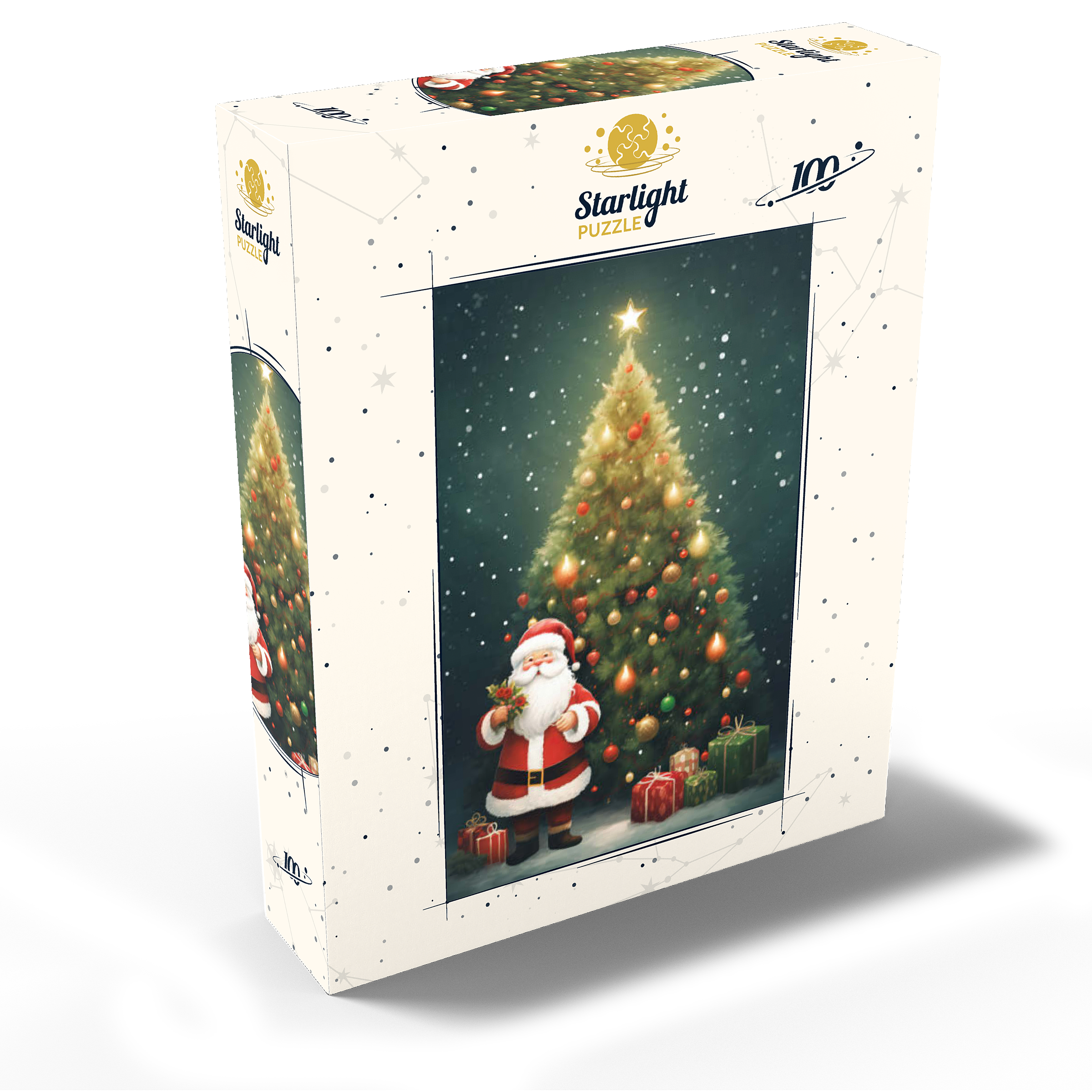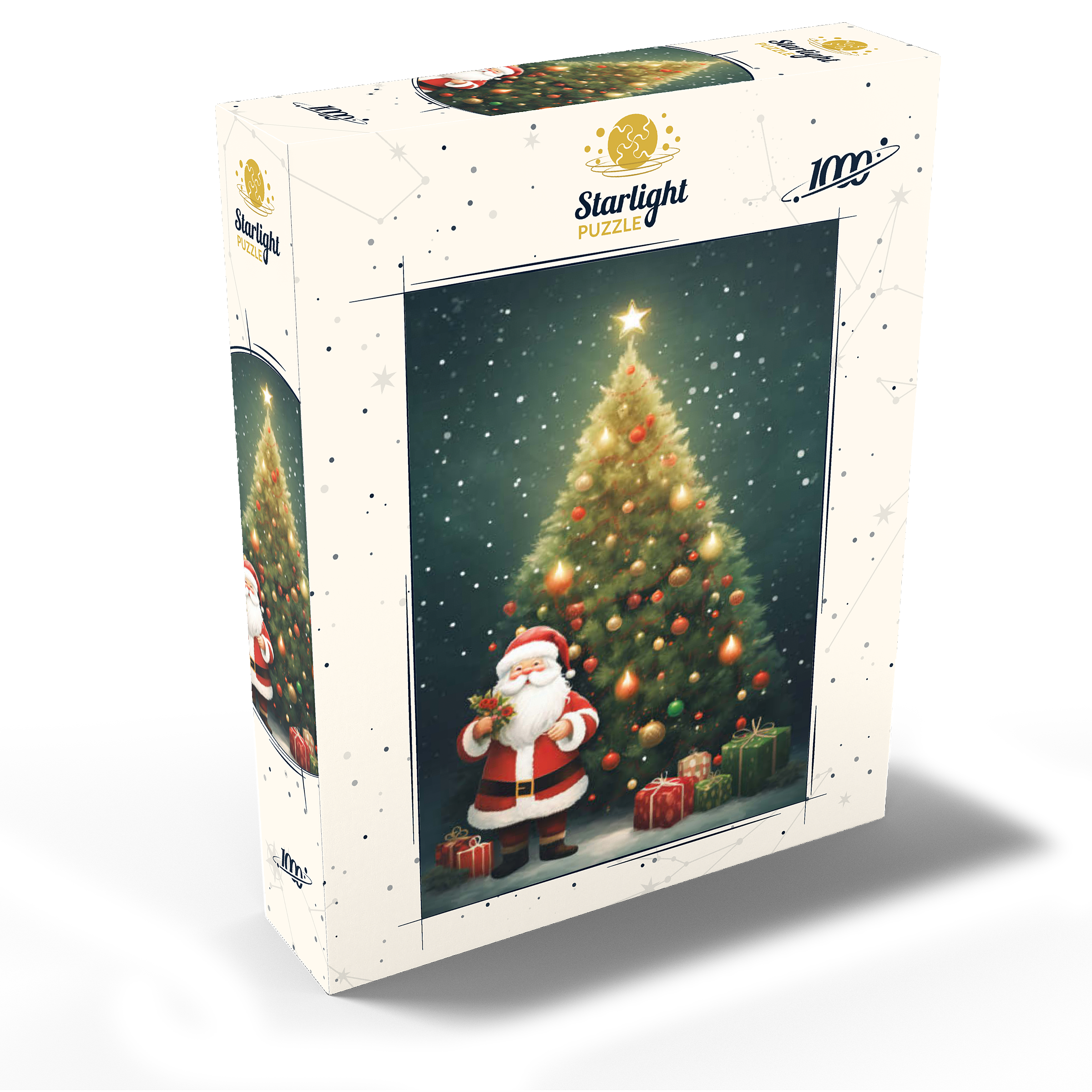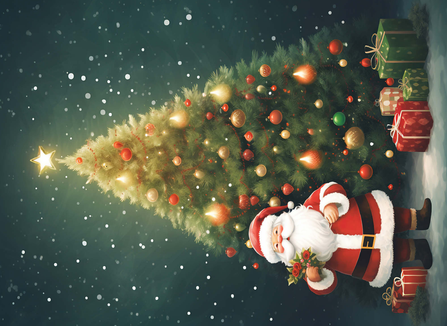 A delightful holiday scene showcasing Santa Claus standing cheerfully beside a beautifully adorned Christmas tree. The tree is glowing with golden lights, red ornaments, and a radiant star on top. At its base, a variety of festive gifts add to the charm of the season. Snowfall in the background completes the magical ambiance of this joyful Christmas celebration.