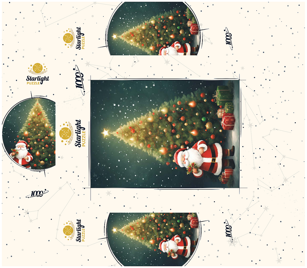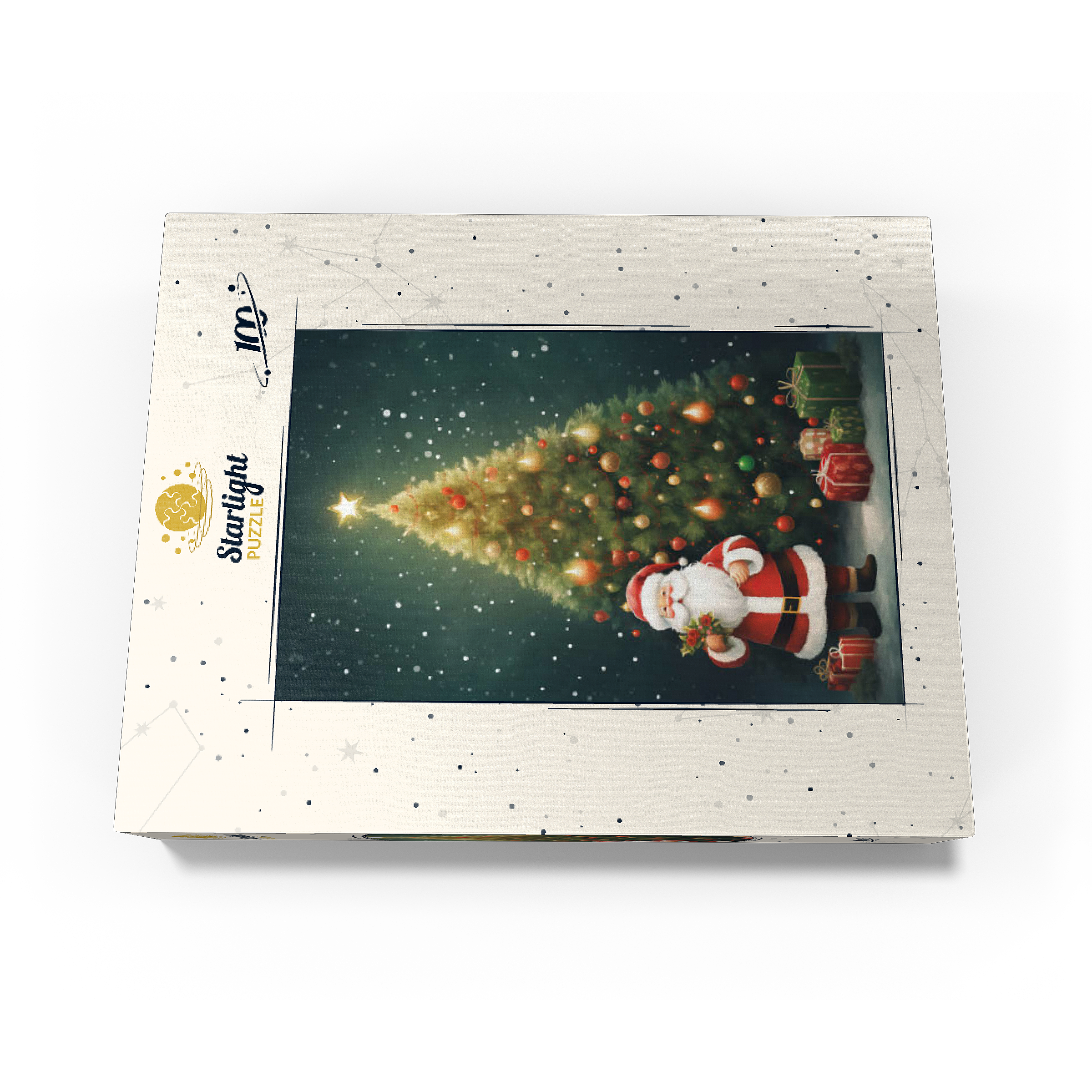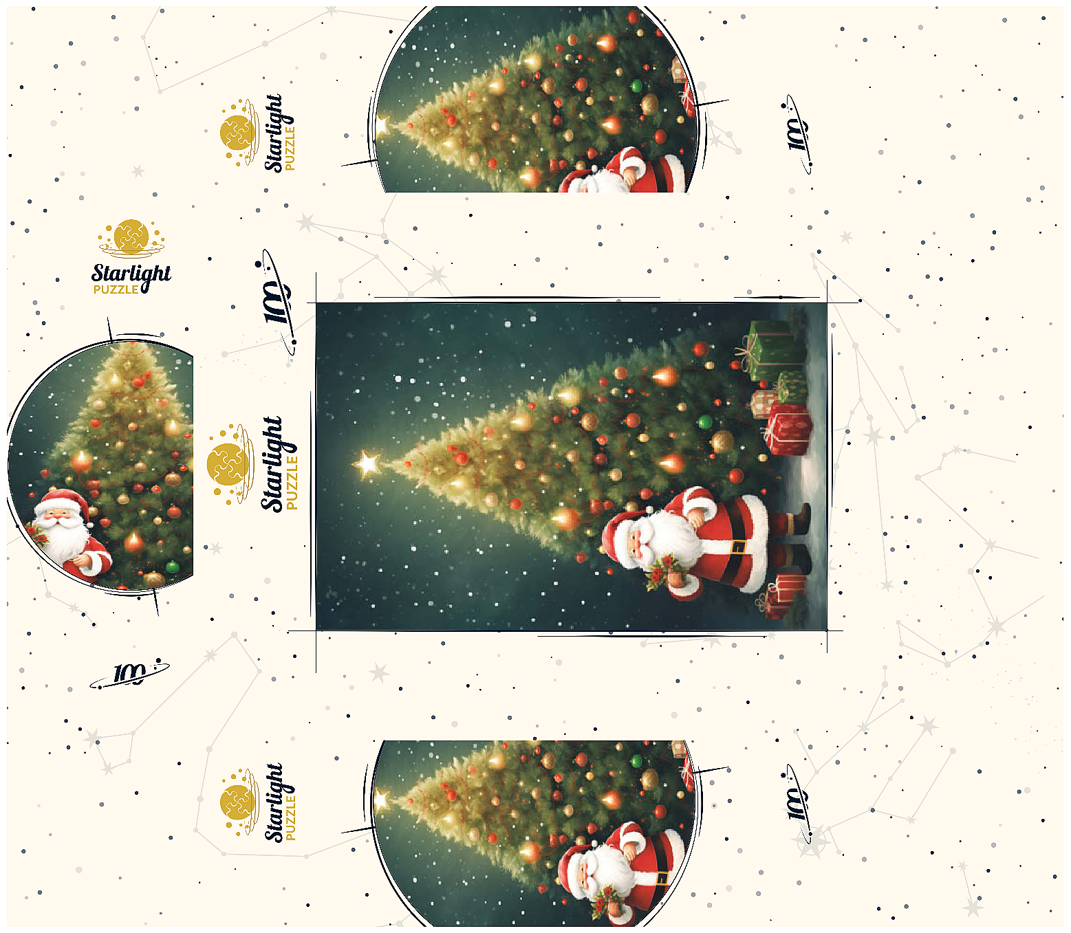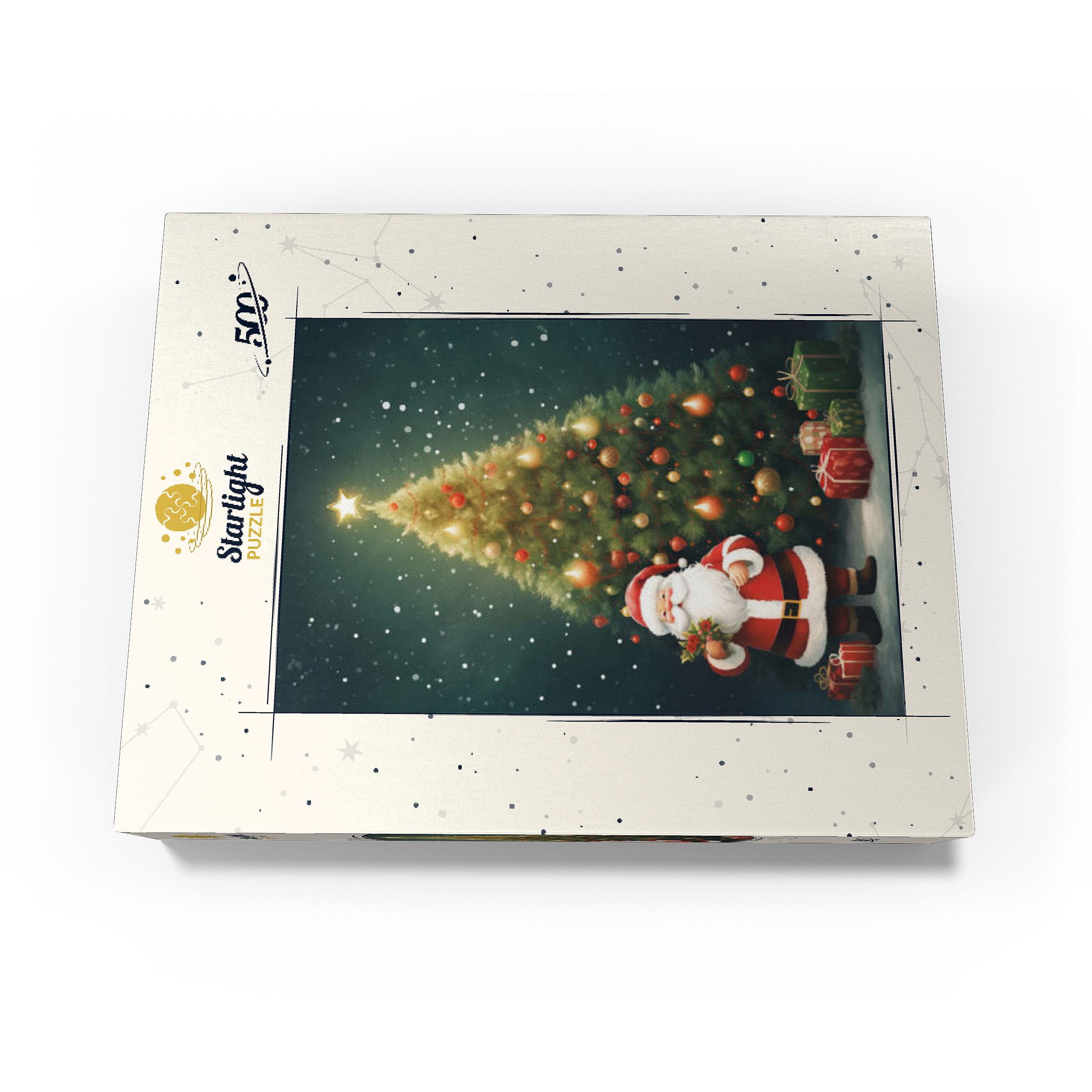 A delightful holiday scene showcasing Santa Claus standing cheerfully beside a beautifully adorned Christmas tree. The tree is glowing with golden lights, red ornaments, and a radiant star on top. At its base, a variety of festive gifts add to the charm of the season. Snowfall in the background completes the magical ambiance of this joyful Christmas celebration.