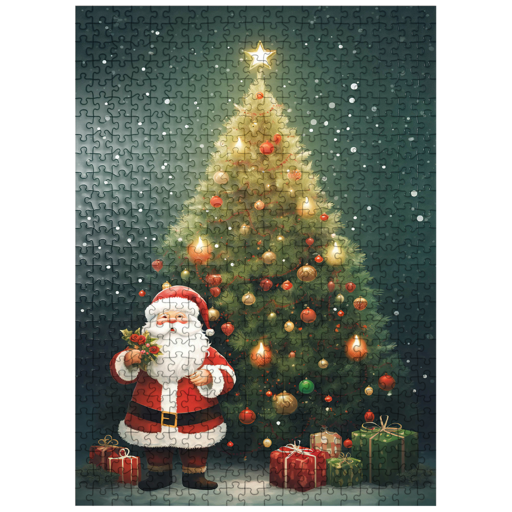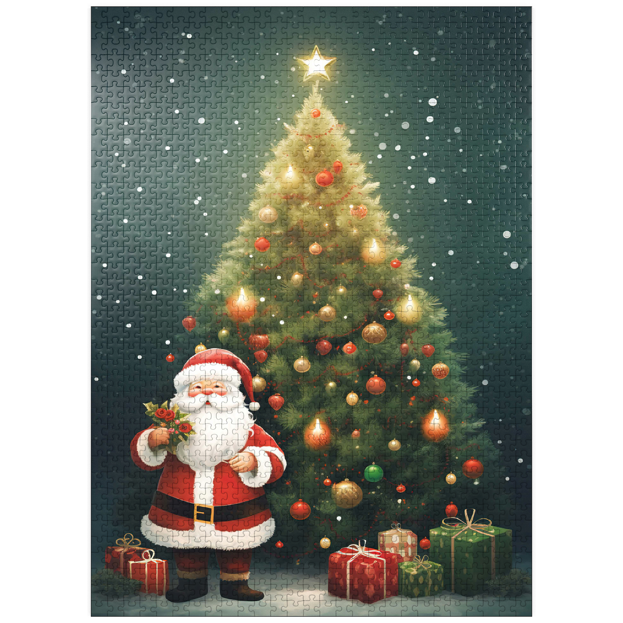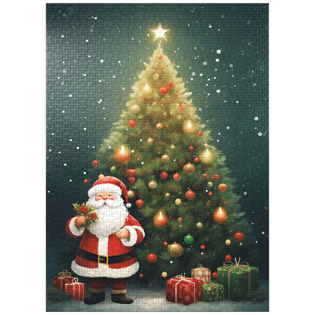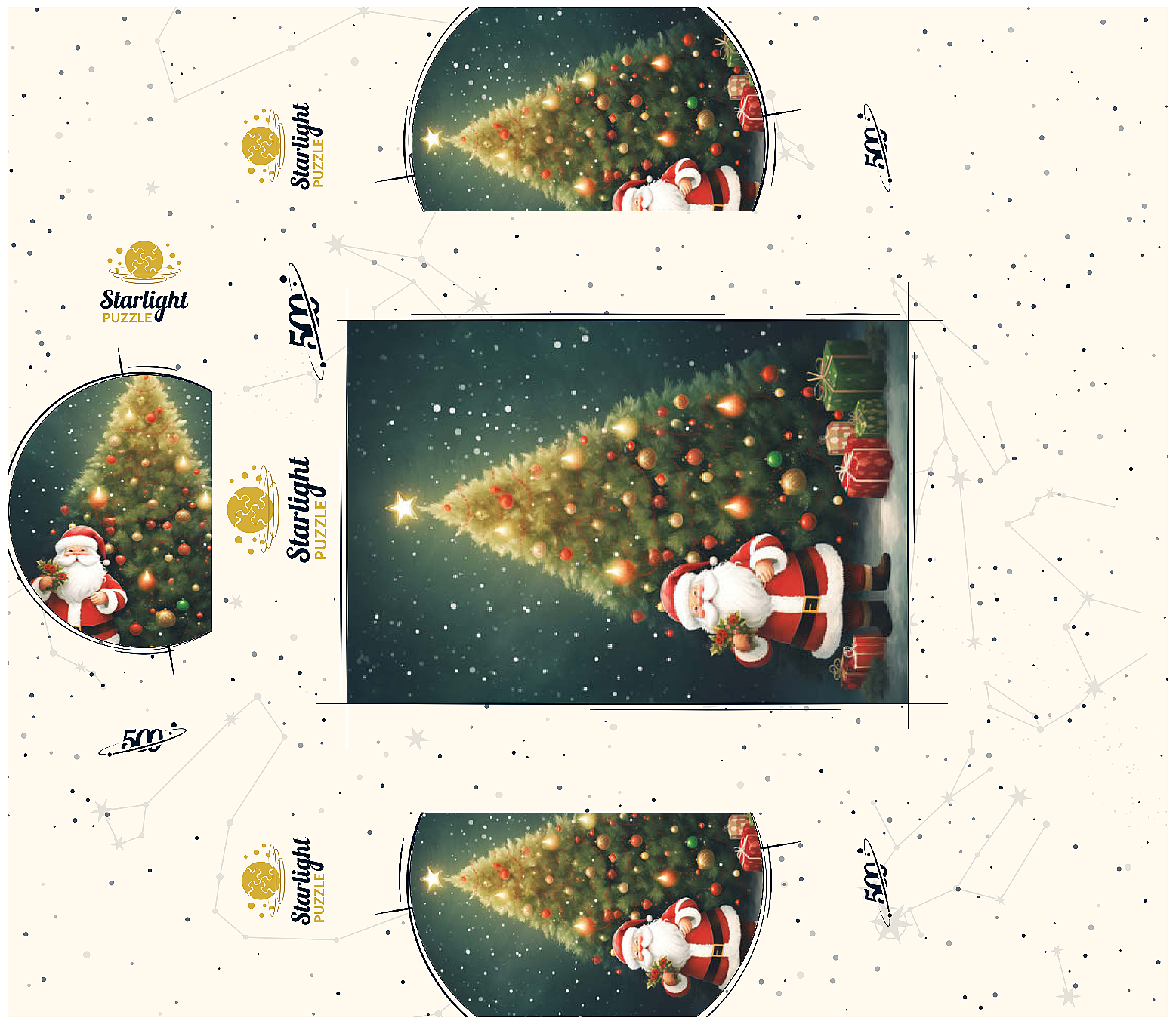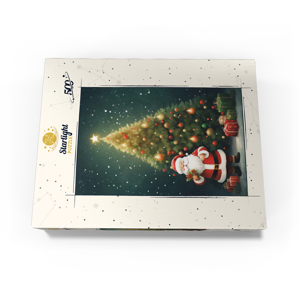 A delightful holiday scene showcasing Santa Claus standing cheerfully beside a beautifully adorned Christmas tree. The tree is glowing with golden lights, red ornaments, and a radiant star on top. At its base, a variety of festive gifts add to the charm of the season. Snowfall in the background completes the magical ambiance of this joyful Christmas celebration.