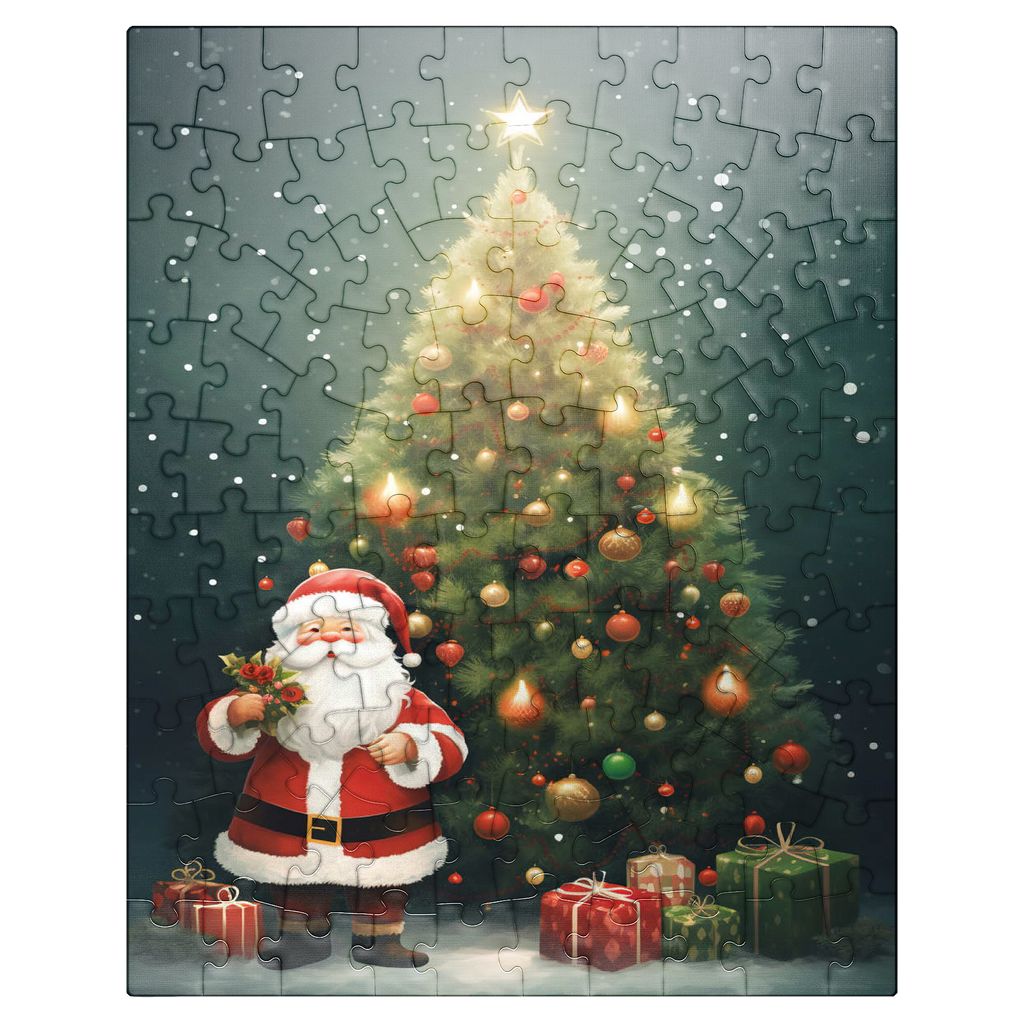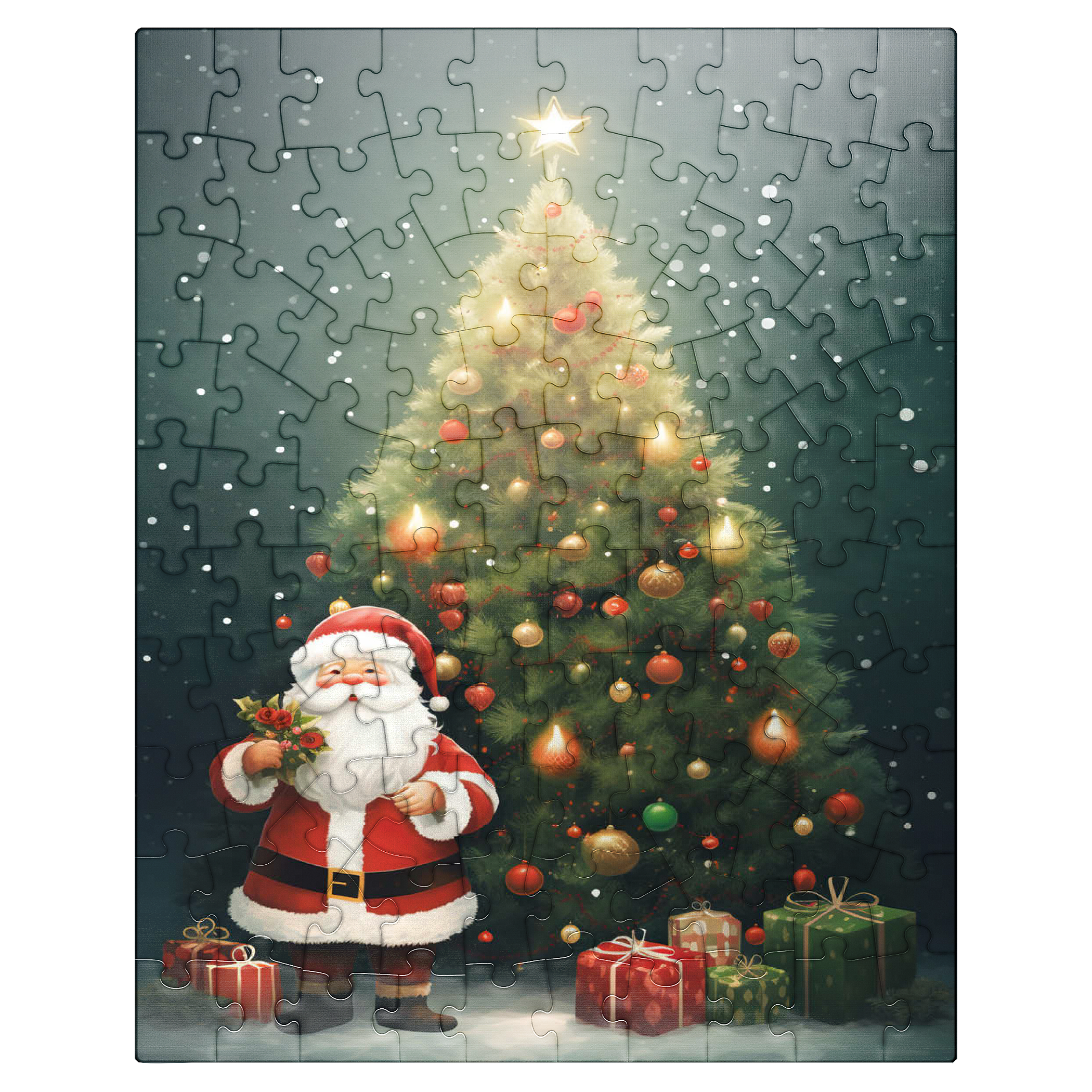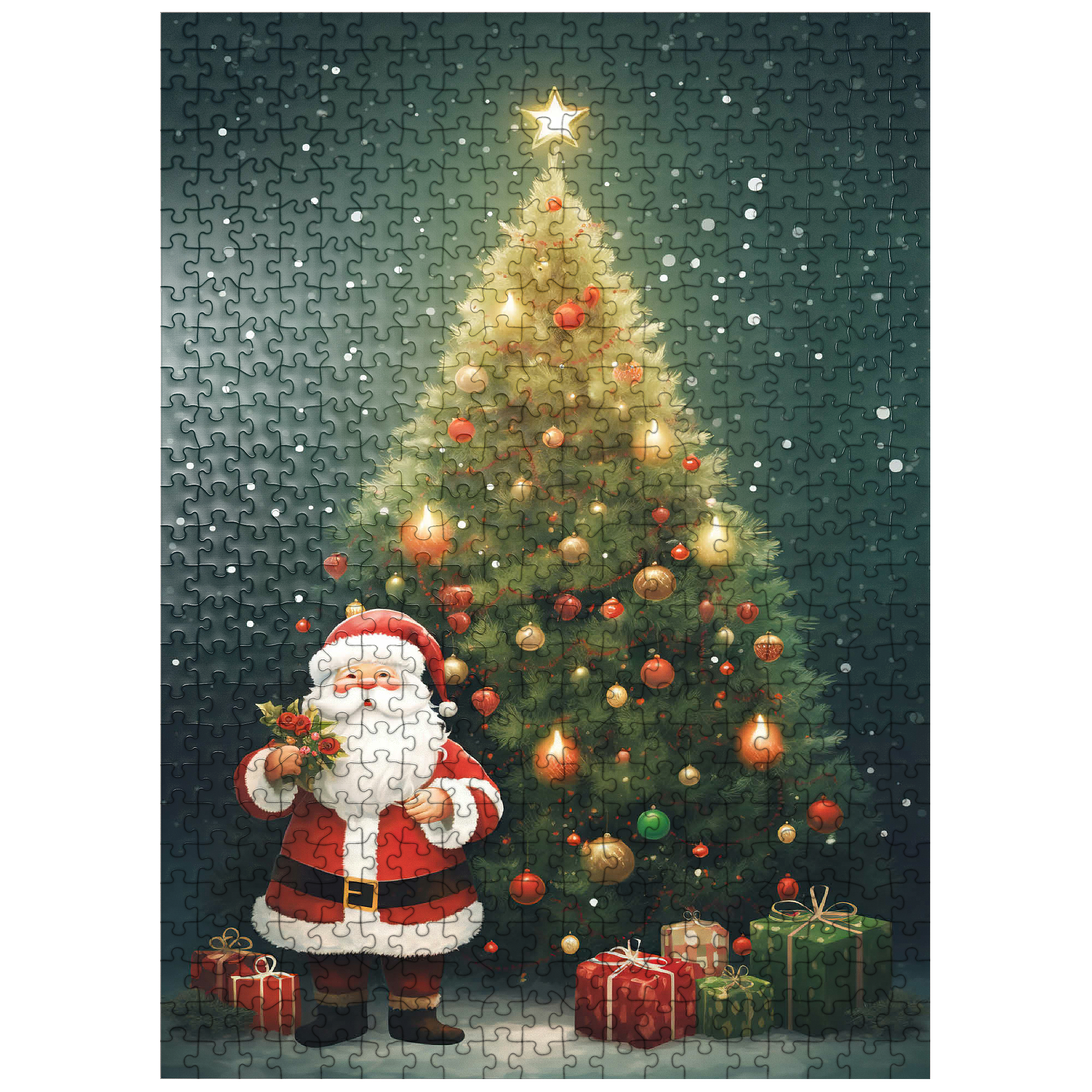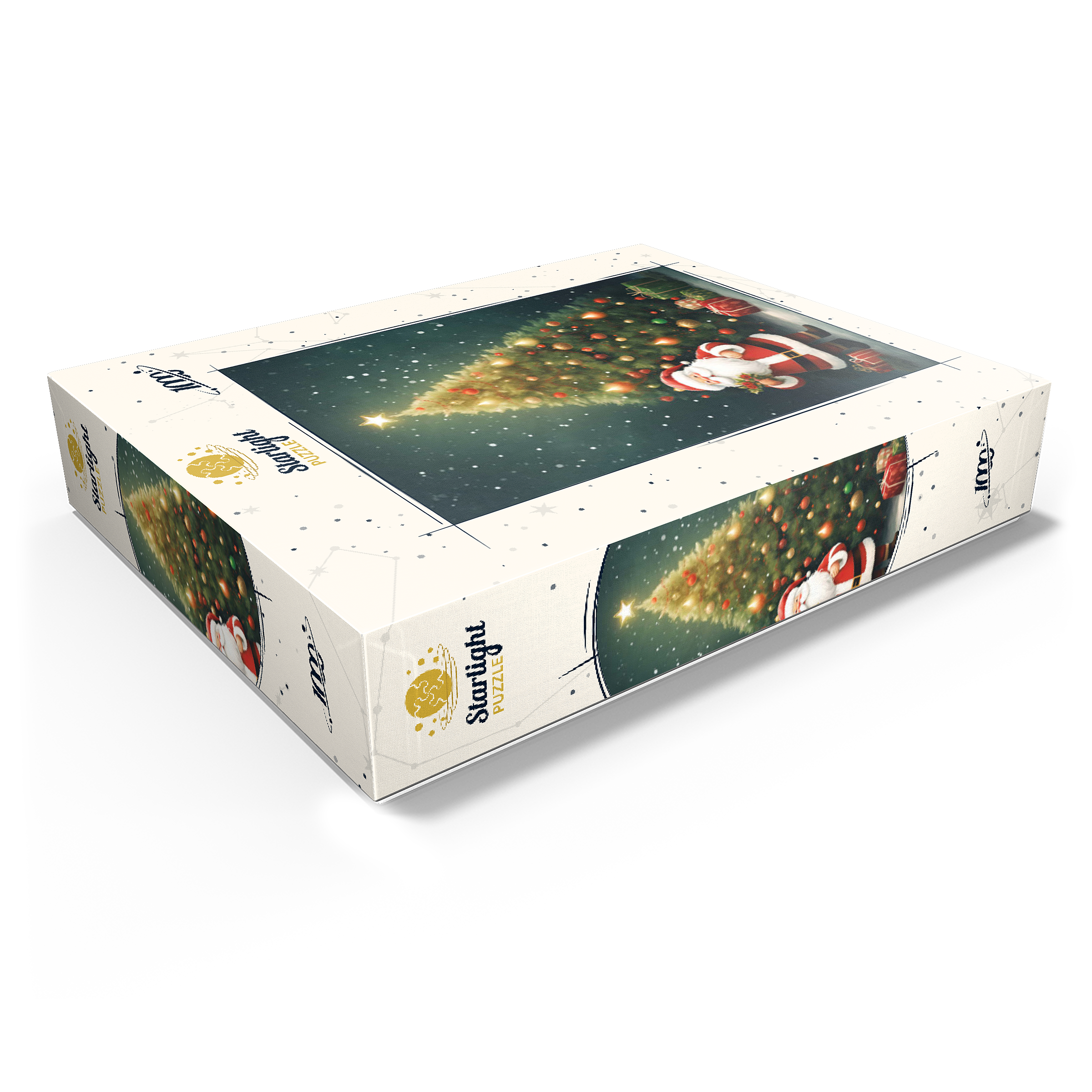 A delightful holiday scene showcasing Santa Claus standing cheerfully beside a beautifully adorned Christmas tree. The tree is glowing with golden lights, red ornaments, and a radiant star on top. At its base, a variety of festive gifts add to the charm of the season. Snowfall in the background completes the magical ambiance of this joyful Christmas celebration.