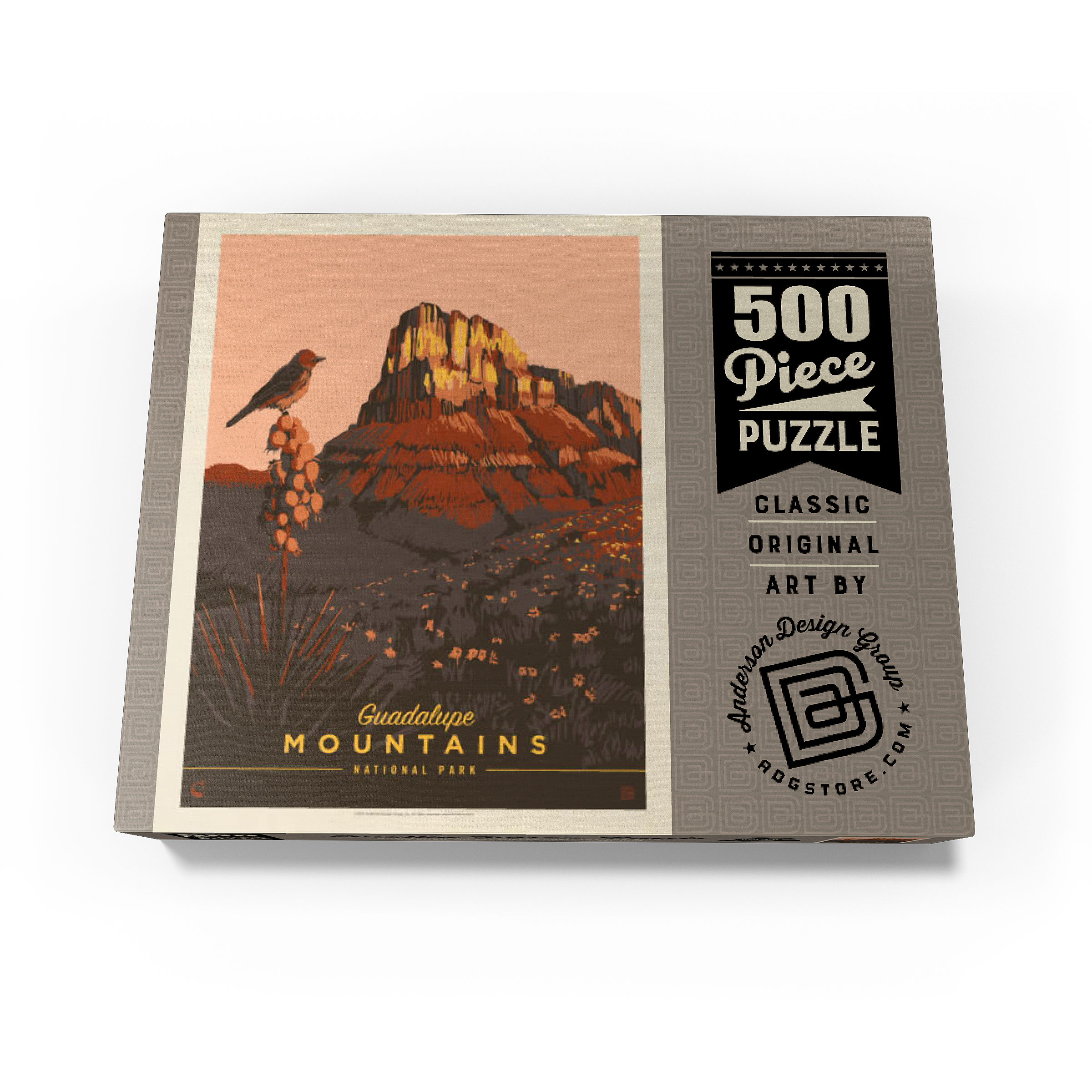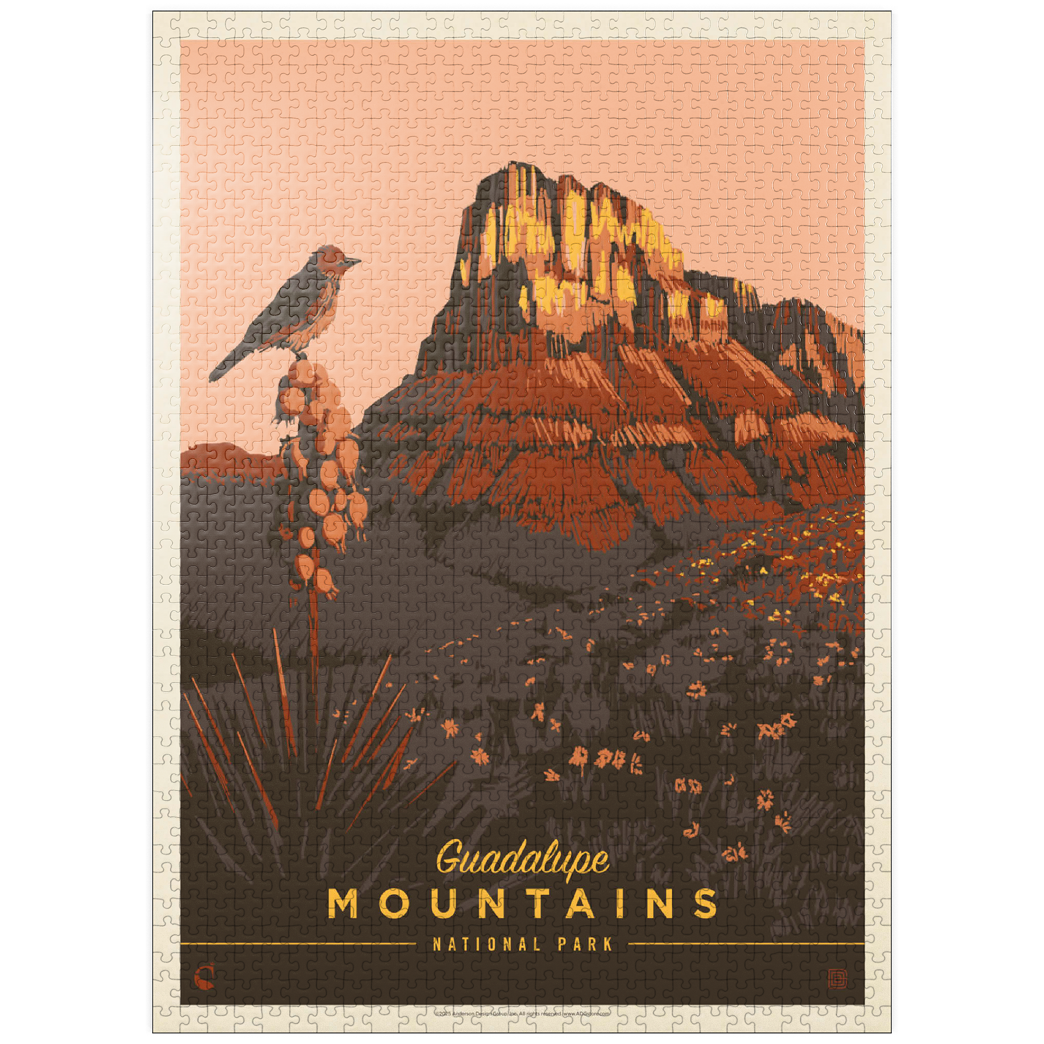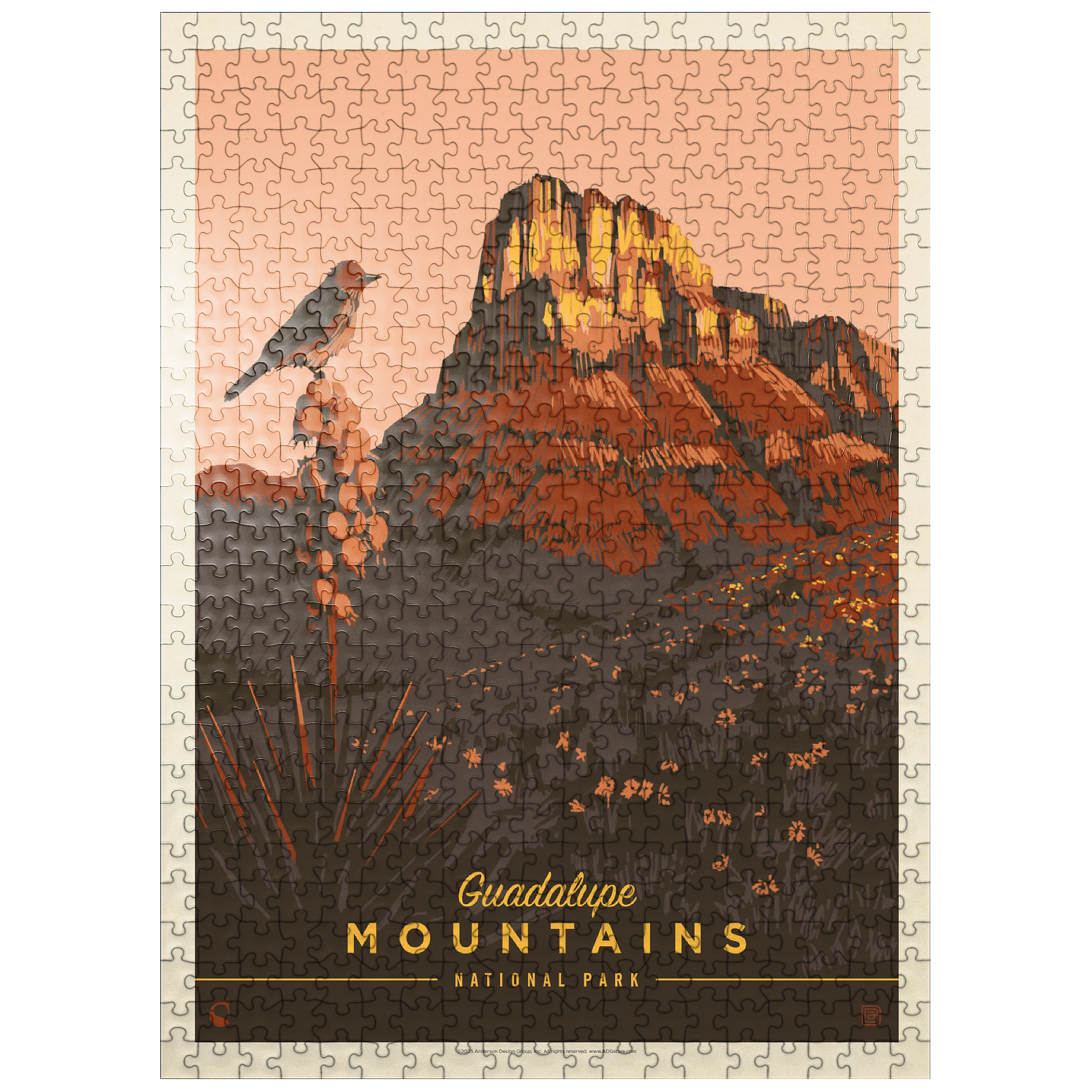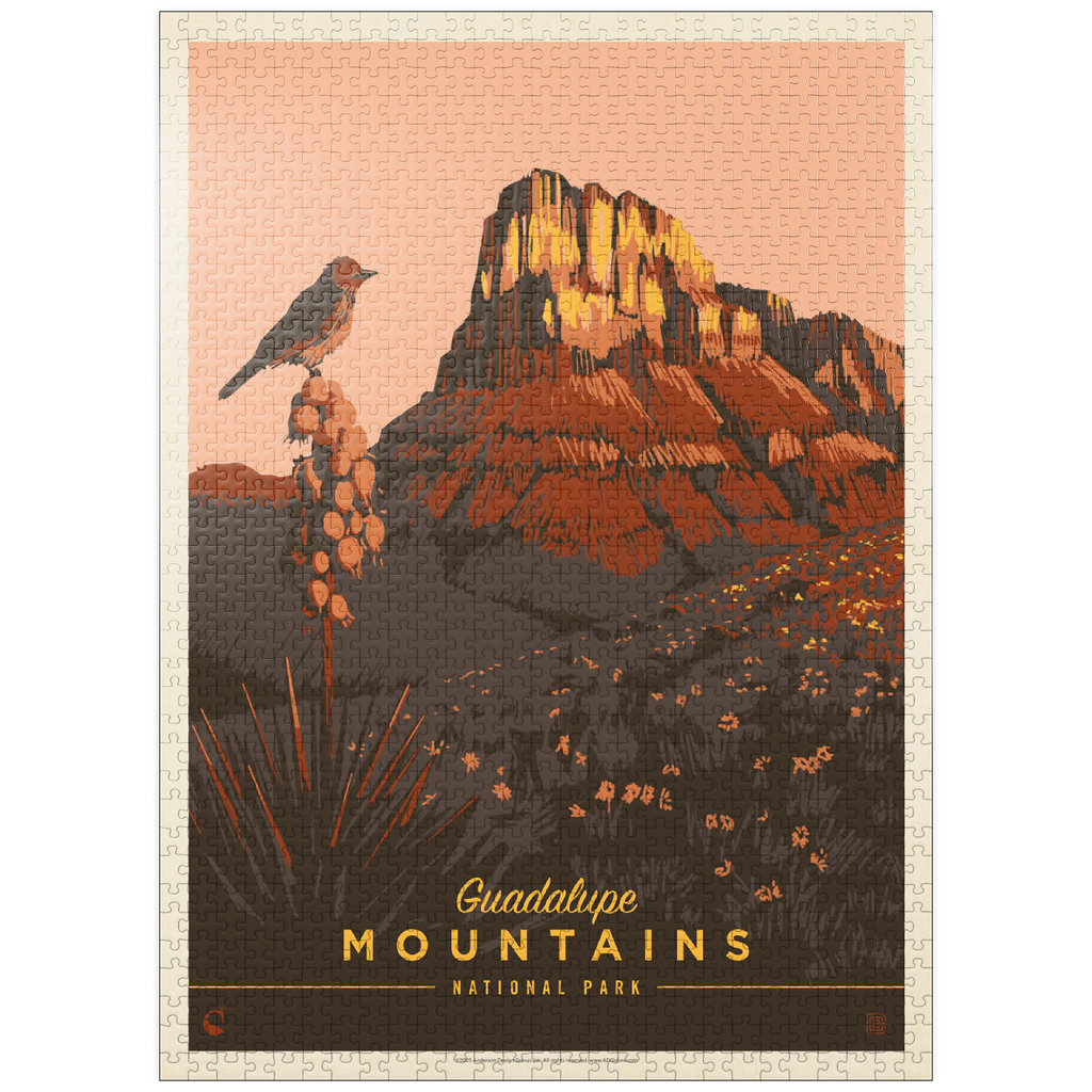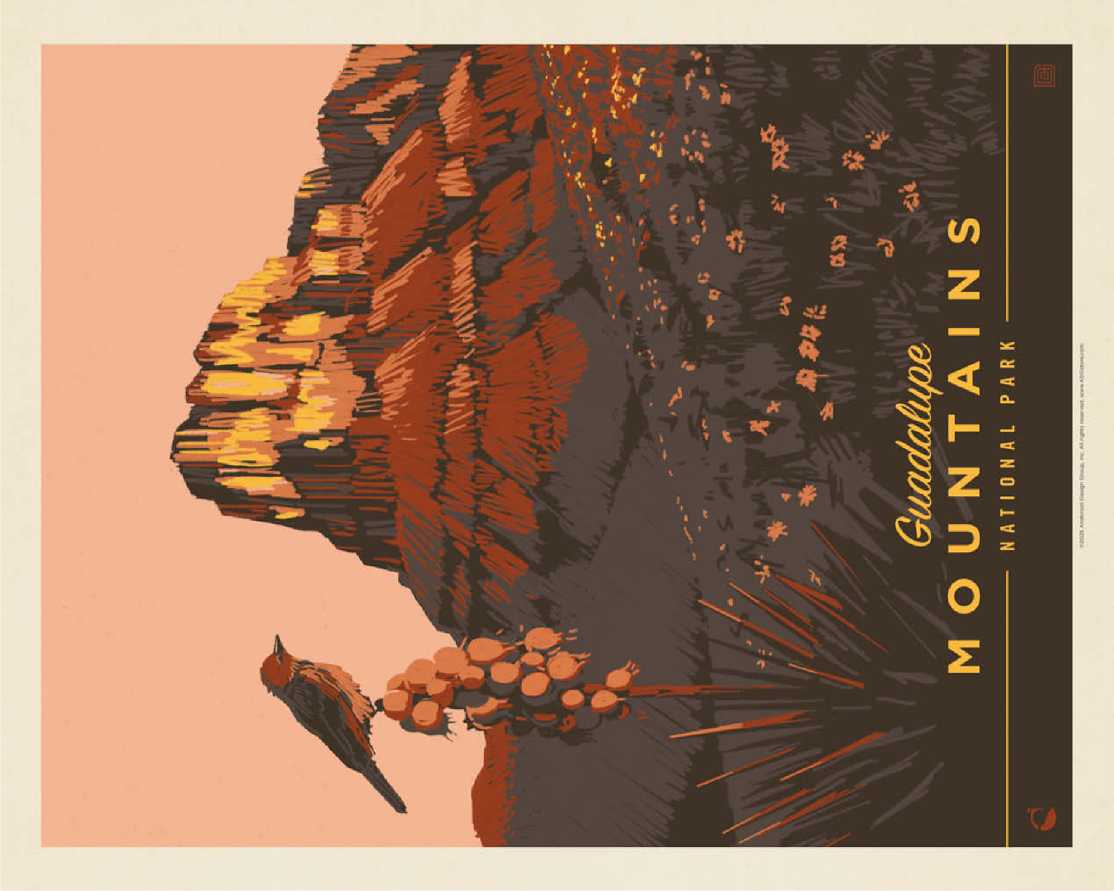 The Guadalupe Mountains National Park in Texas showcases a dramatic desert landscape dominated by El Capitan, a towering limestone peak glowing in warm sunset hues. This artistic depiction captures the serene beauty of the park, featuring a perched bird on a blooming yucca plant and vibrant wildflowers scattered across the arid terrain. The composition emphasizes the unique biodiversity and rugged topography of this iconic Southwest location. Known for its hiking trails, fossil-rich formations, and striking desert flora, Guadalupe Mountains is a must-see destination for nature lovers and adventurers seeking panoramic views and native wildlife in their natural habitat.