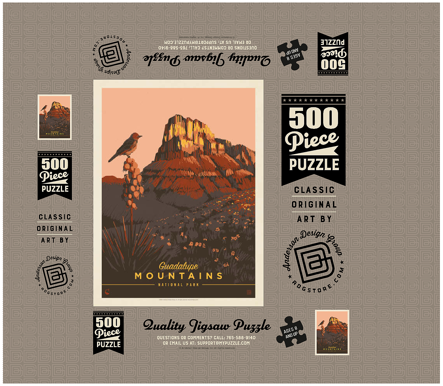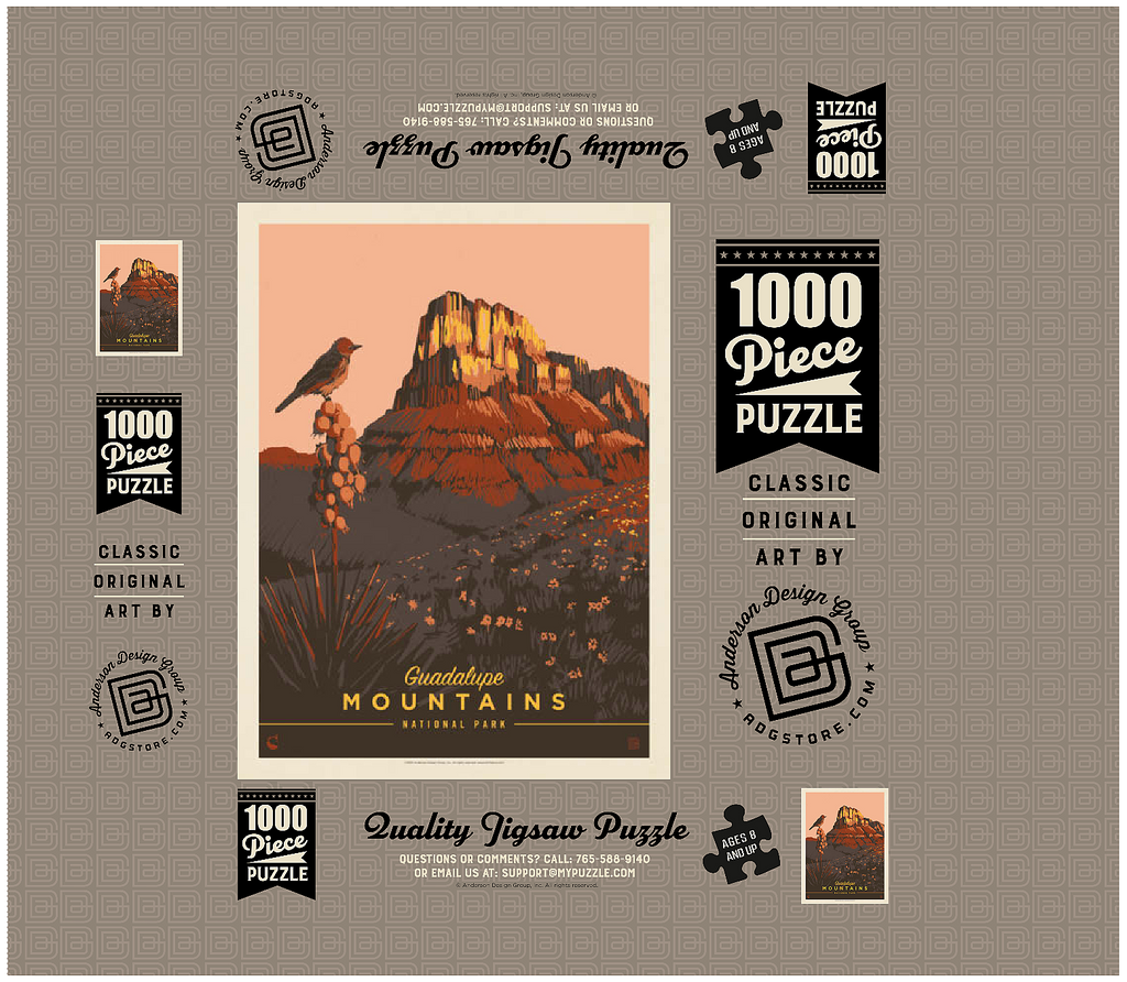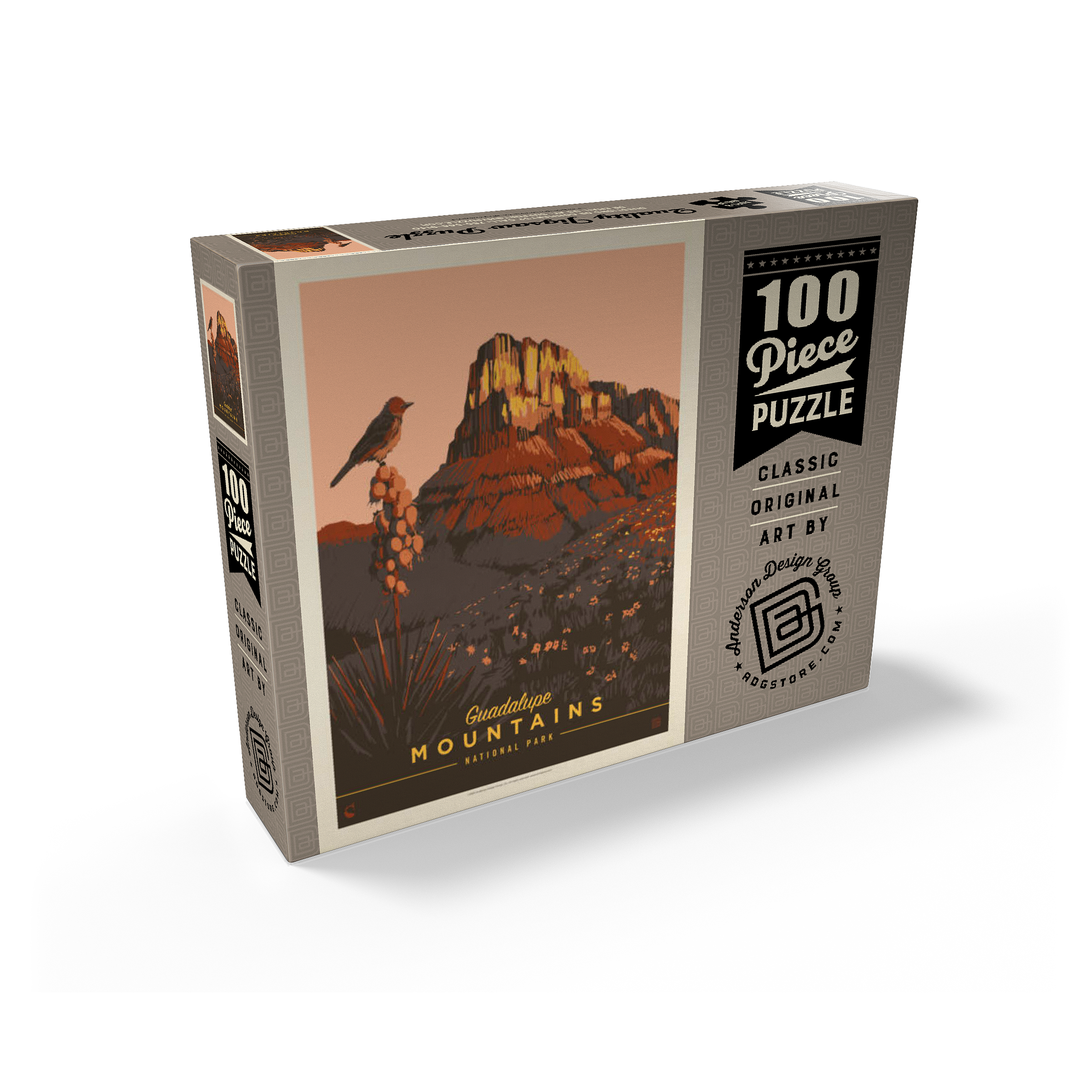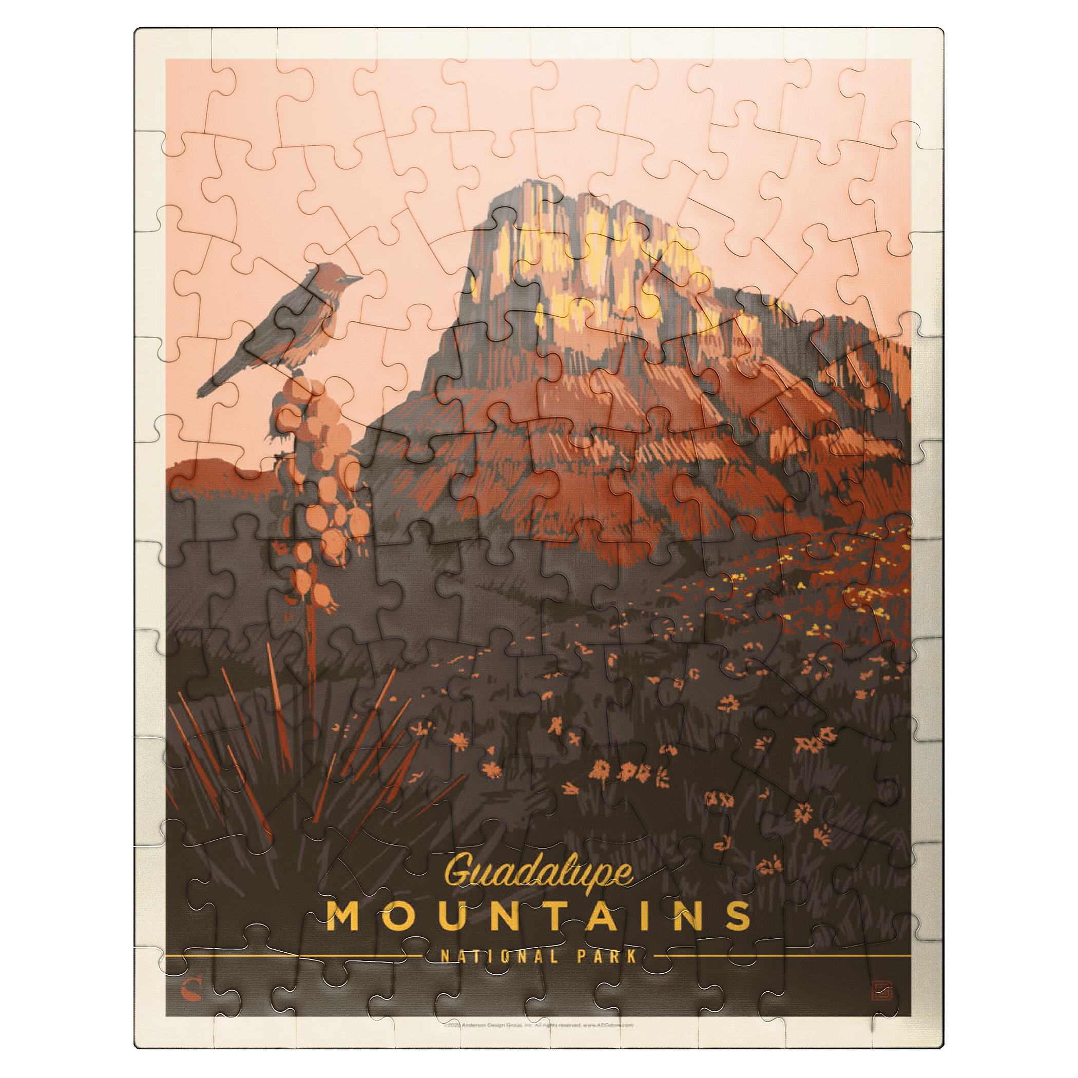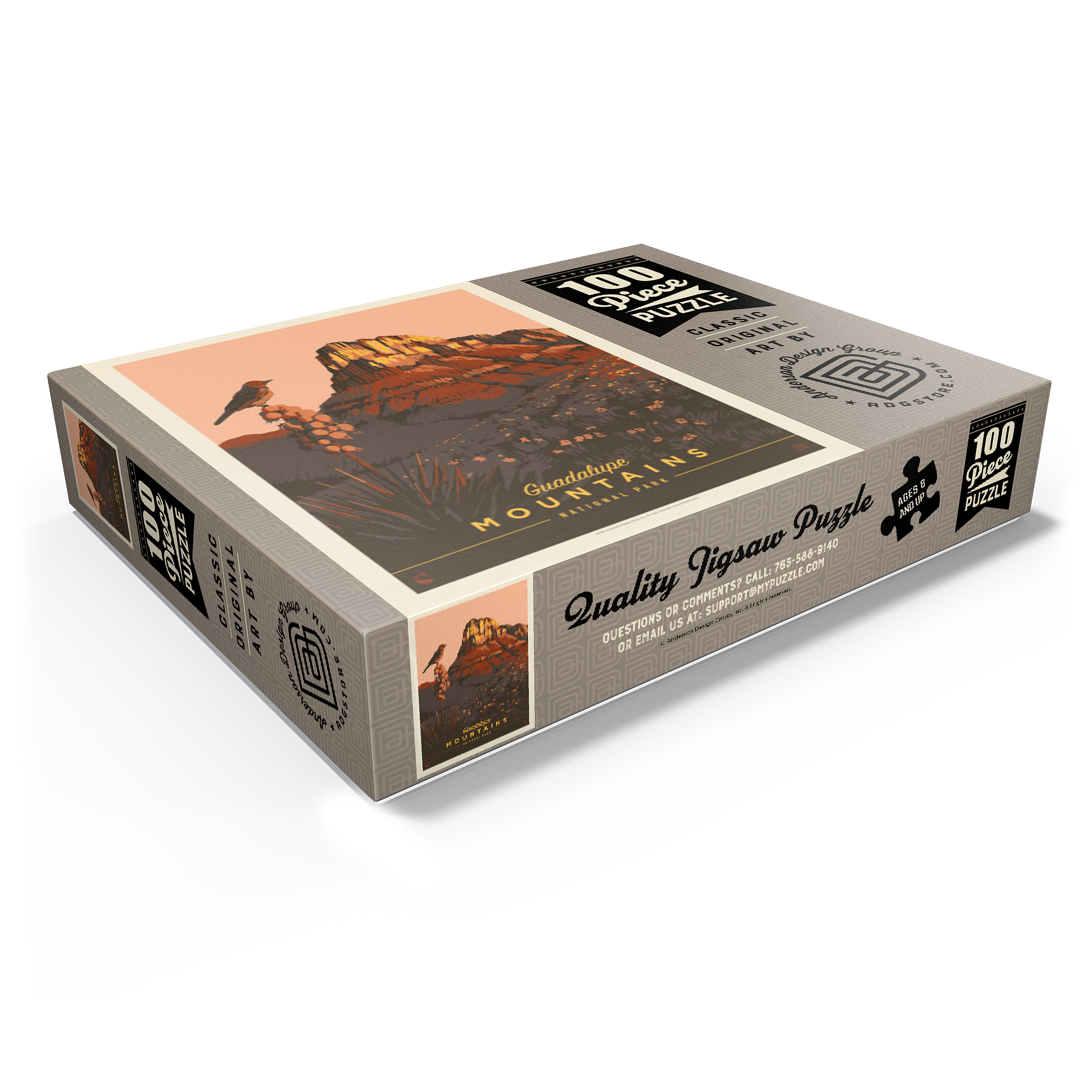 The Guadalupe Mountains National Park in Texas showcases a dramatic desert landscape dominated by El Capitan, a towering limestone peak glowing in warm sunset hues. This artistic depiction captures the serene beauty of the park, featuring a perched bird on a blooming yucca plant and vibrant wildflowers scattered across the arid terrain. The composition emphasizes the unique biodiversity and rugged topography of this iconic Southwest location. Known for its hiking trails, fossil-rich formations, and striking desert flora, Guadalupe Mountains is a must-see destination for nature lovers and adventurers seeking panoramic views and native wildlife in their natural habitat.