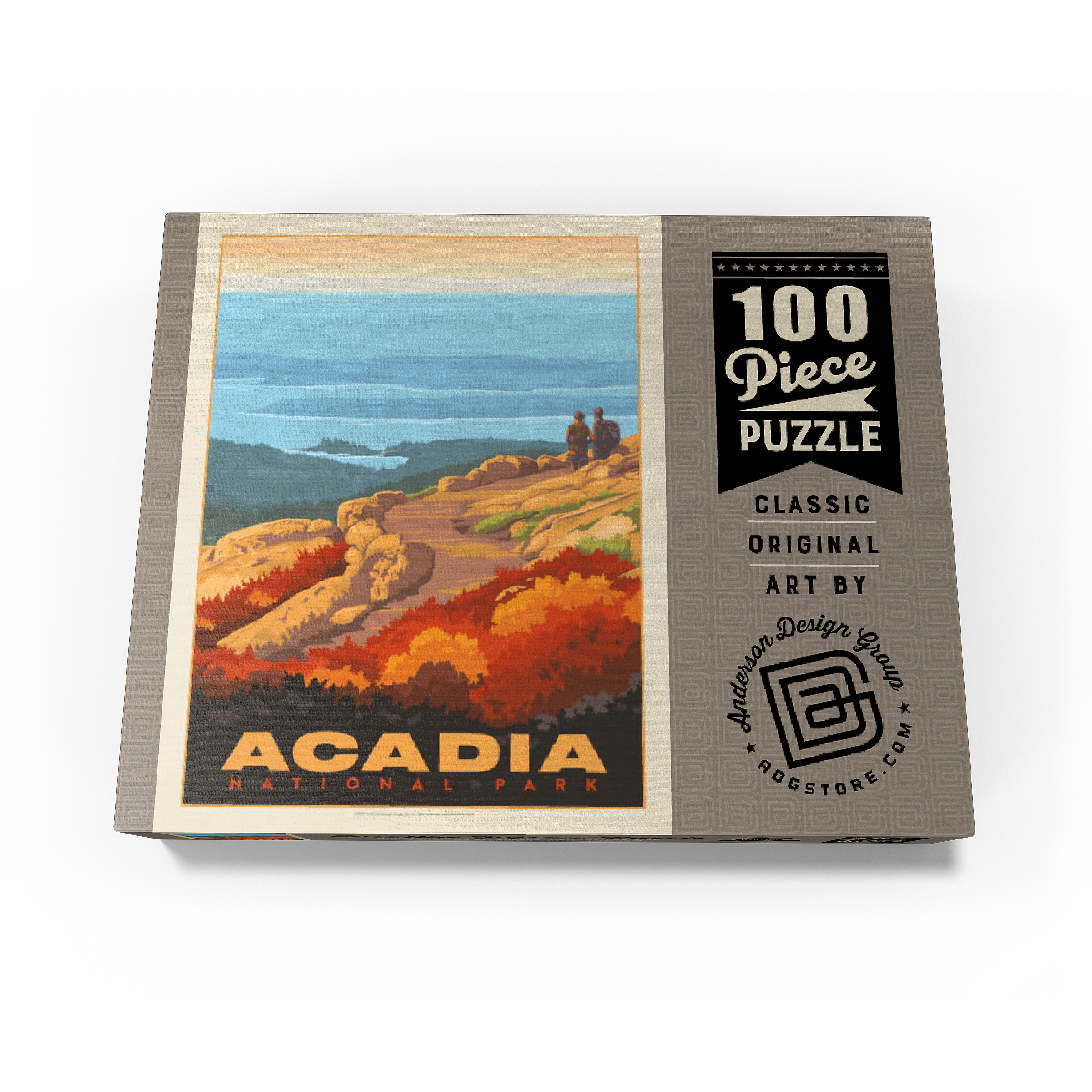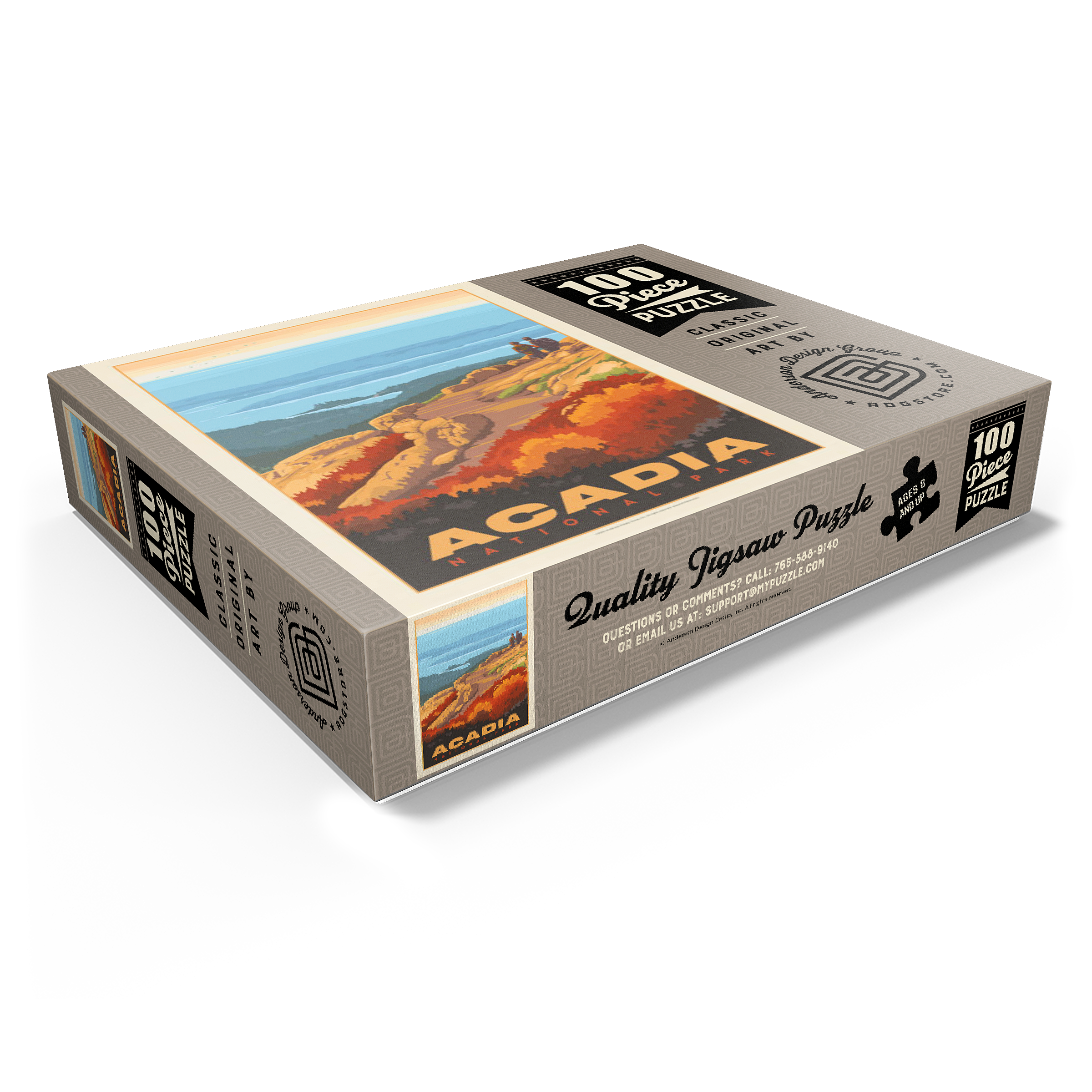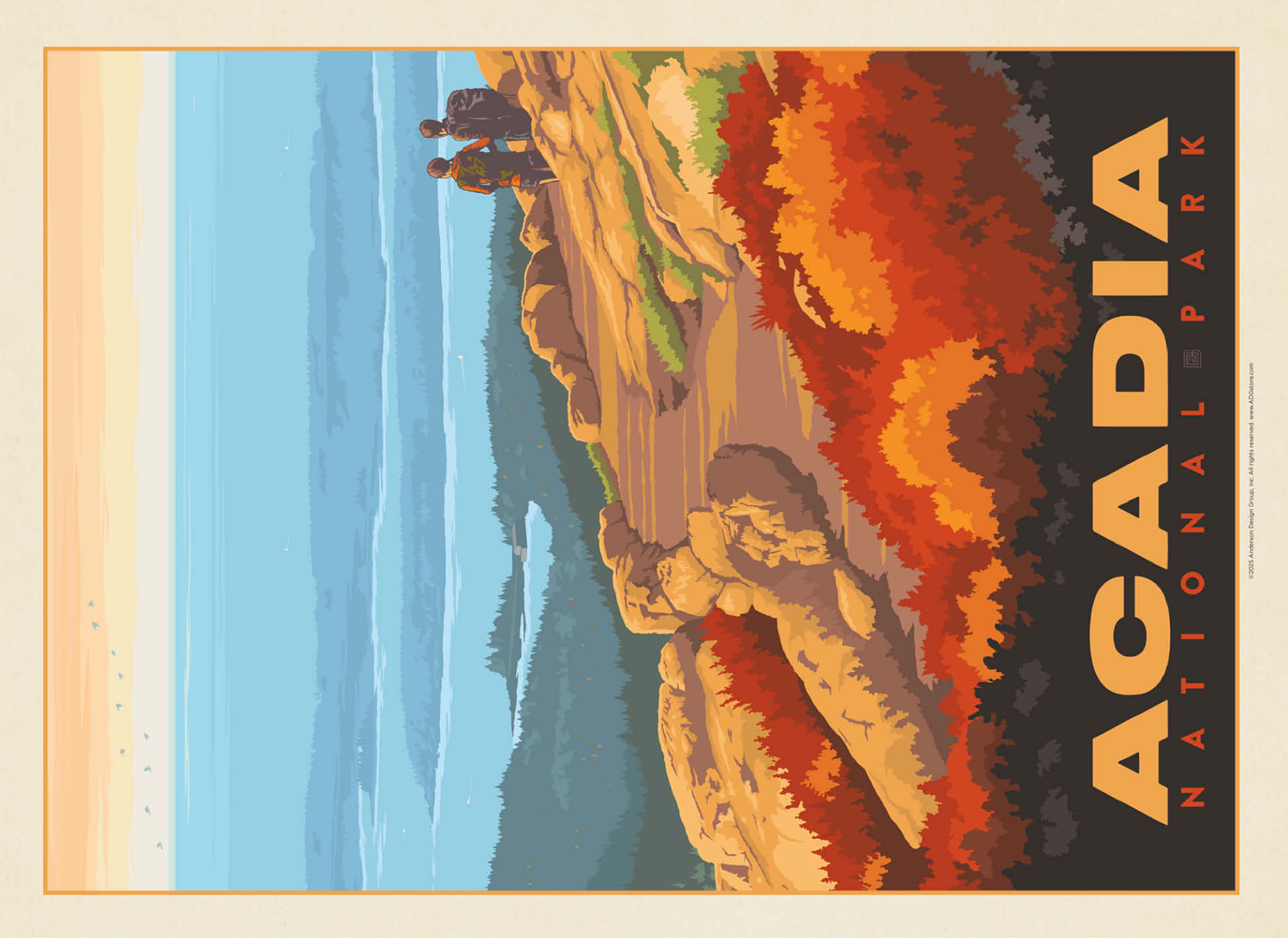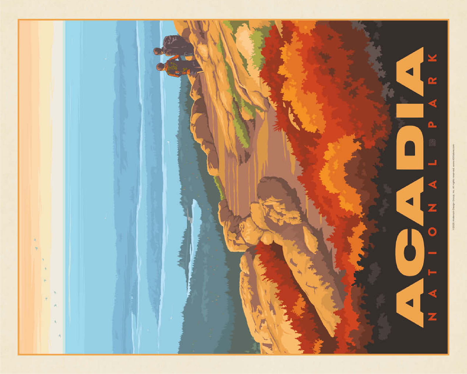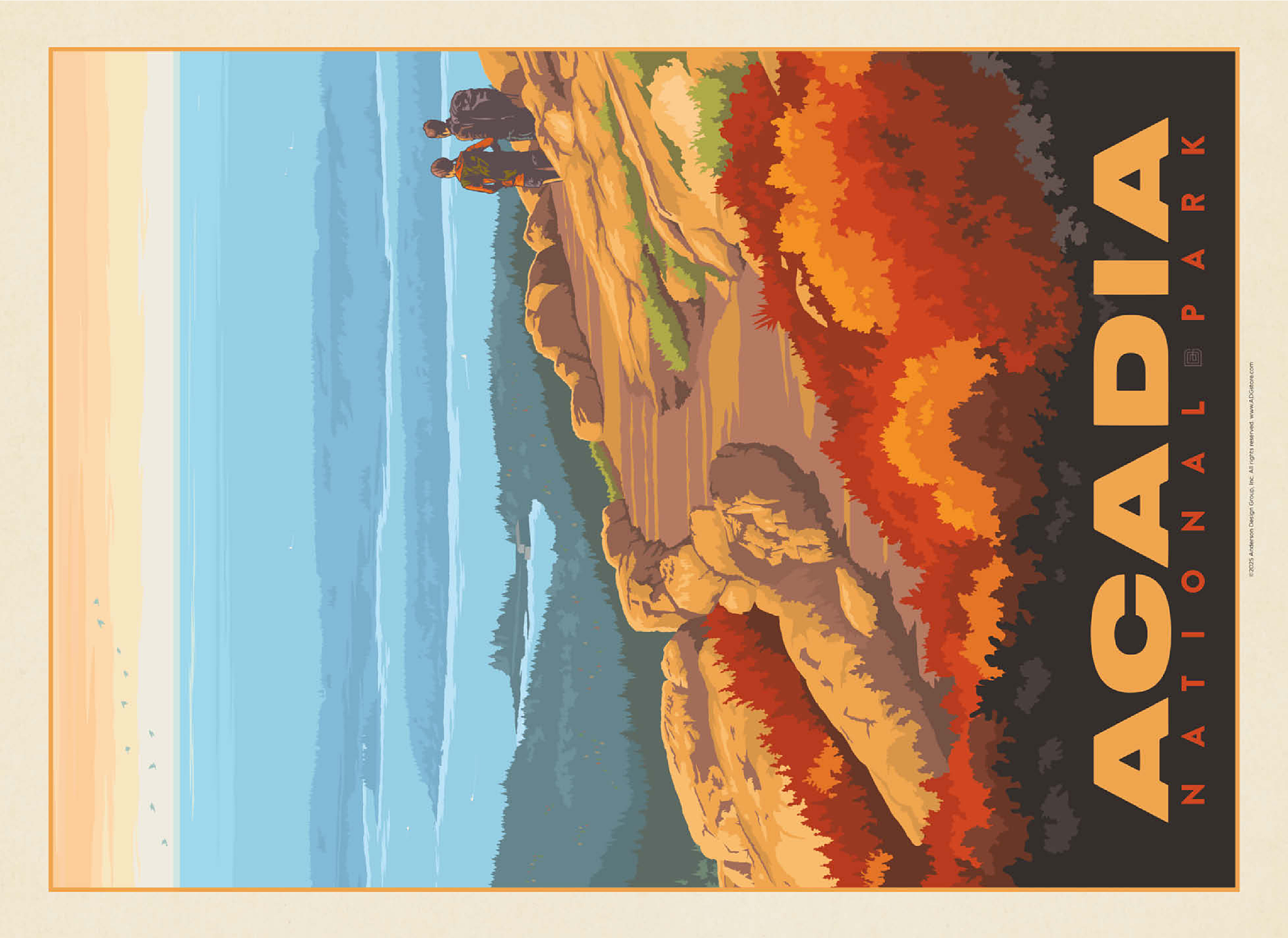 Acadia National Park in Maine is captured in this stunning autumn scene, where vibrant red, orange, and gold foliage contrasts beautifully with rugged granite cliffs. From the mountaintop trail, the sweeping view of the Atlantic Ocean and scattered islands stretches into the horizon under a pastel evening sky. This artwork highlights the park's dramatic coastal landscape, famous for its hiking trails, rocky shores, and breathtaking seasonal colors. Acadia, established in 1919, remains one of the most beloved national parks in the United States, drawing millions of visitors each year to experience its unique blend of mountains, forests, and ocean vistas.