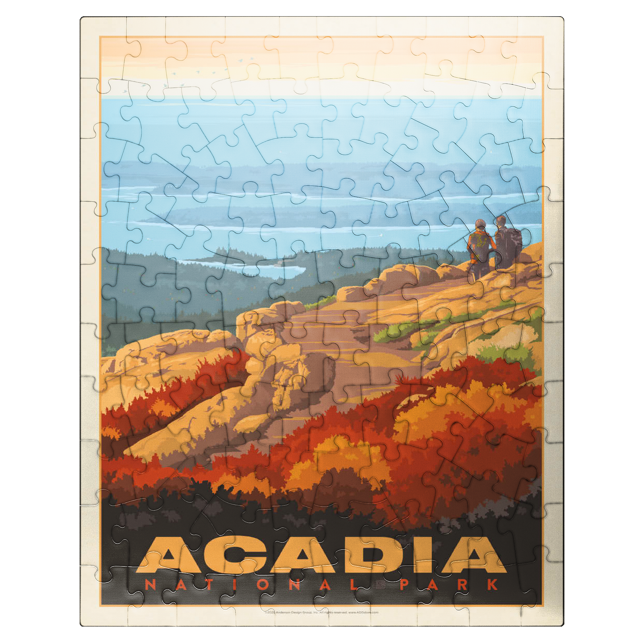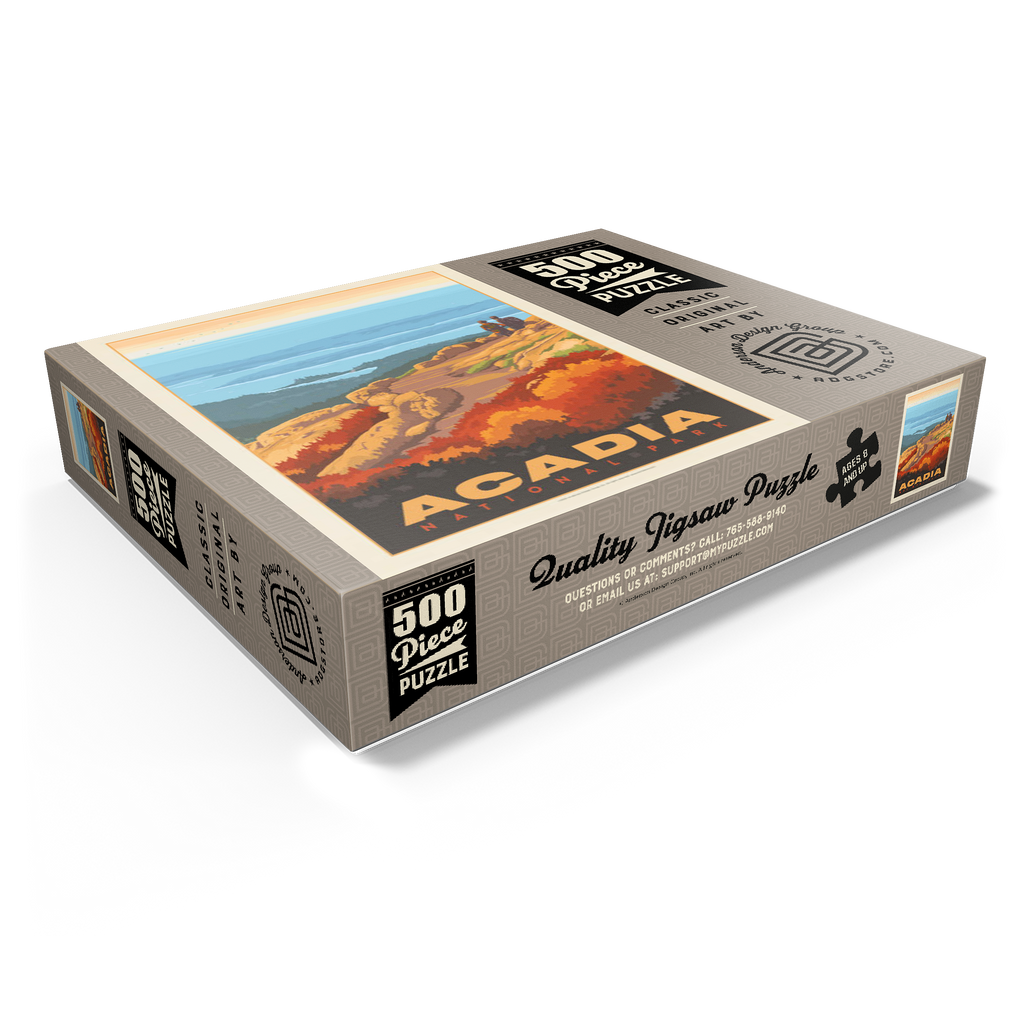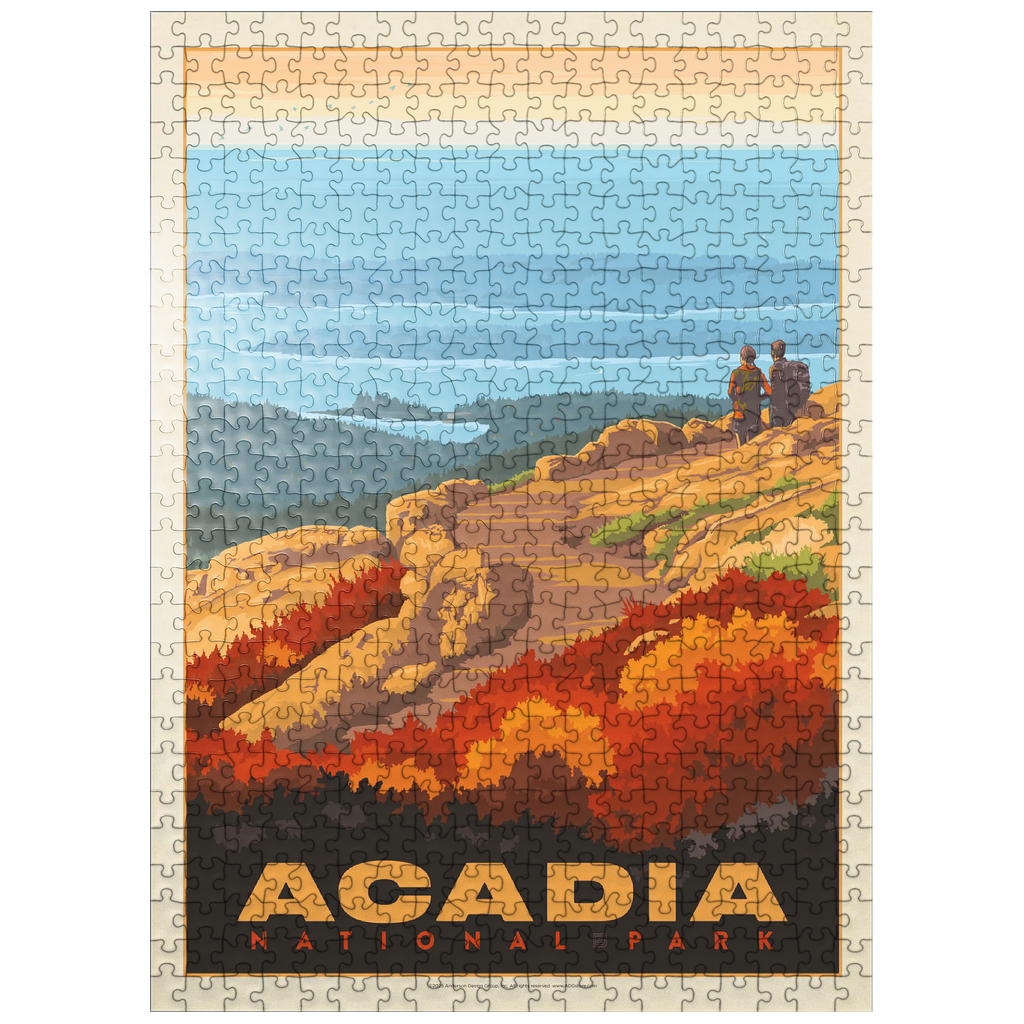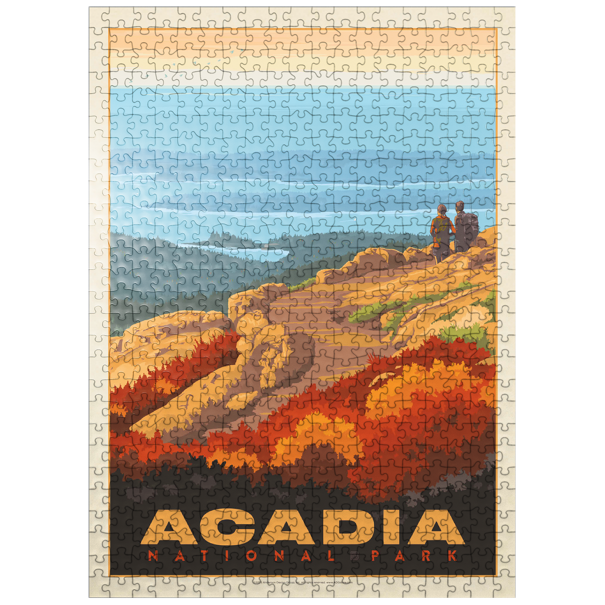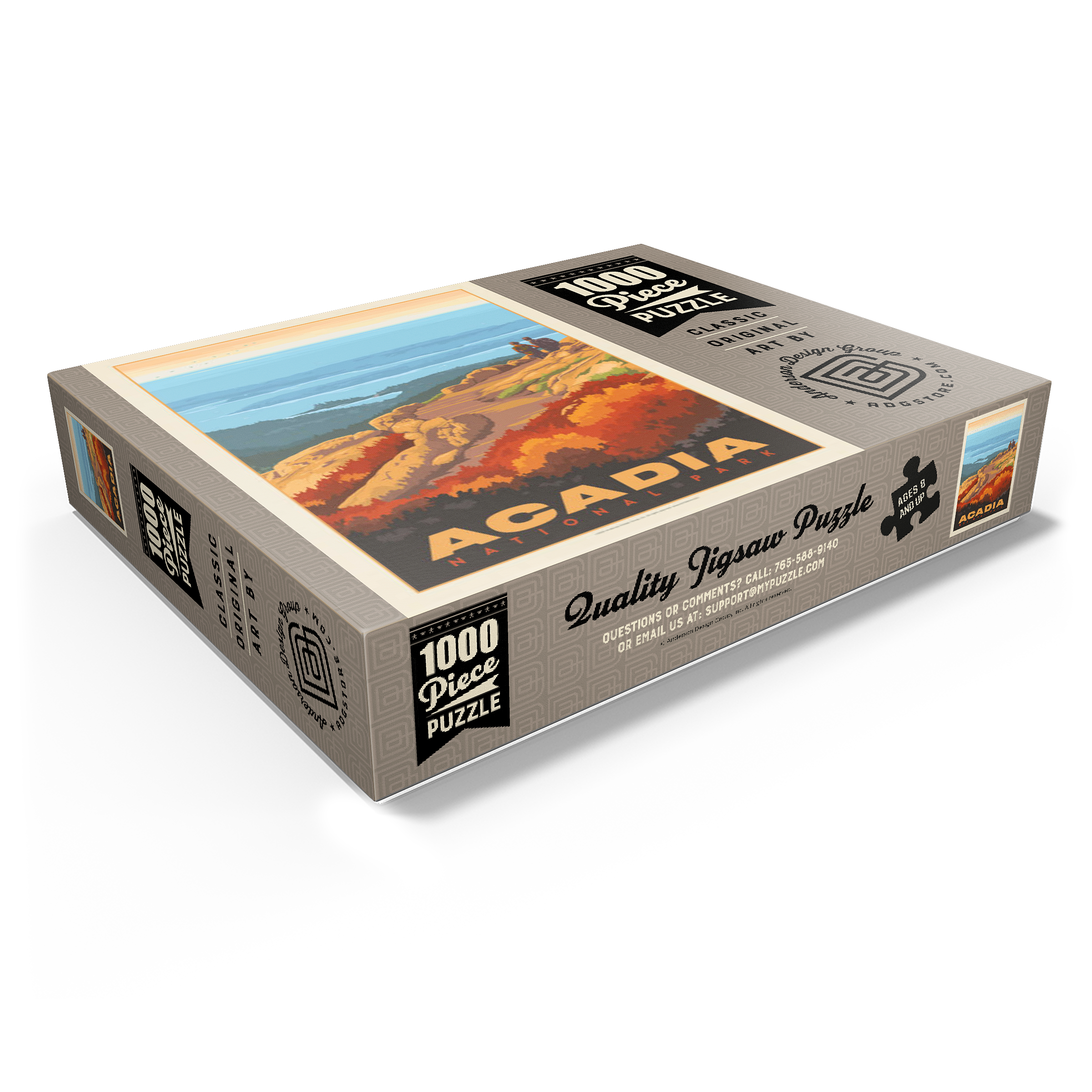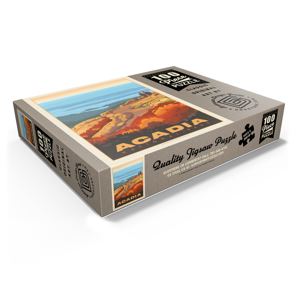 Acadia National Park in Maine is captured in this stunning autumn scene, where vibrant red, orange, and gold foliage contrasts beautifully with rugged granite cliffs. From the mountaintop trail, the sweeping view of the Atlantic Ocean and scattered islands stretches into the horizon under a pastel evening sky. This artwork highlights the park's dramatic coastal landscape, famous for its hiking trails, rocky shores, and breathtaking seasonal colors. Acadia, established in 1919, remains one of the most beloved national parks in the United States, drawing millions of visitors each year to experience its unique blend of mountains, forests, and ocean vistas.