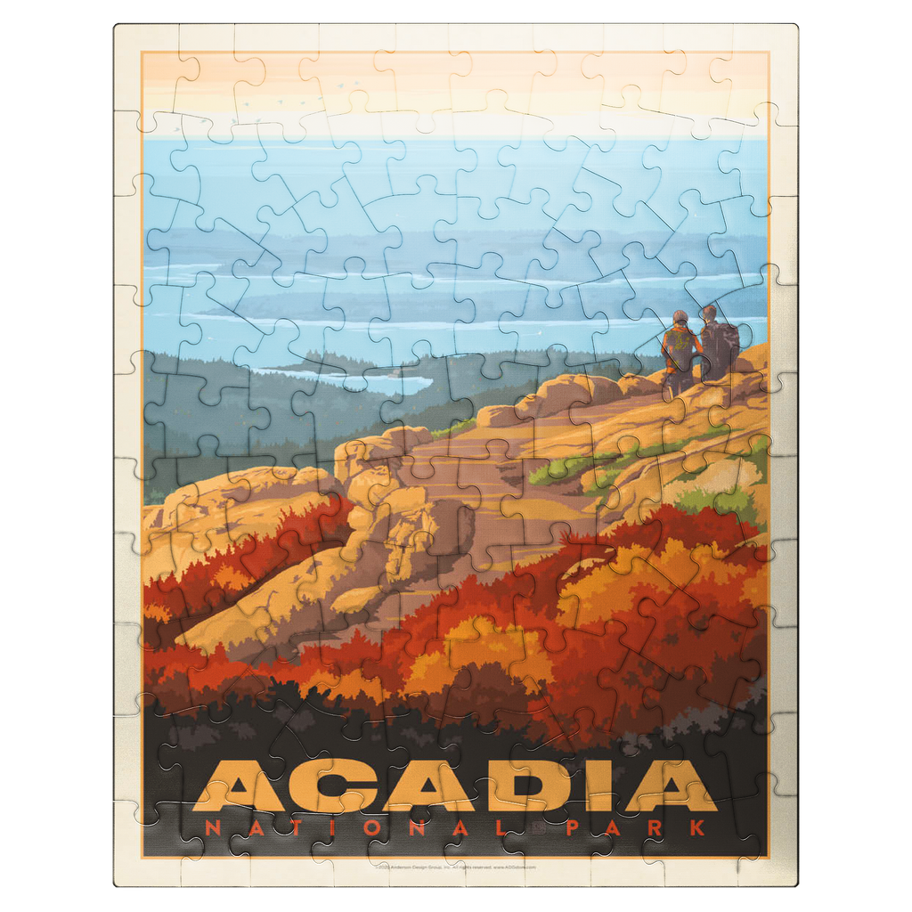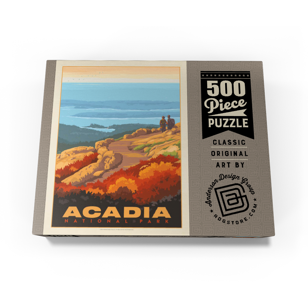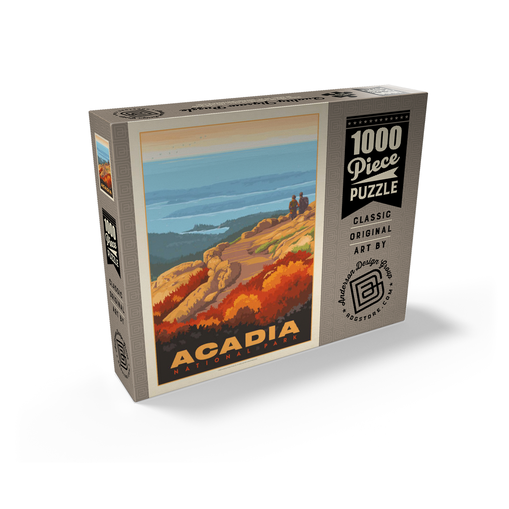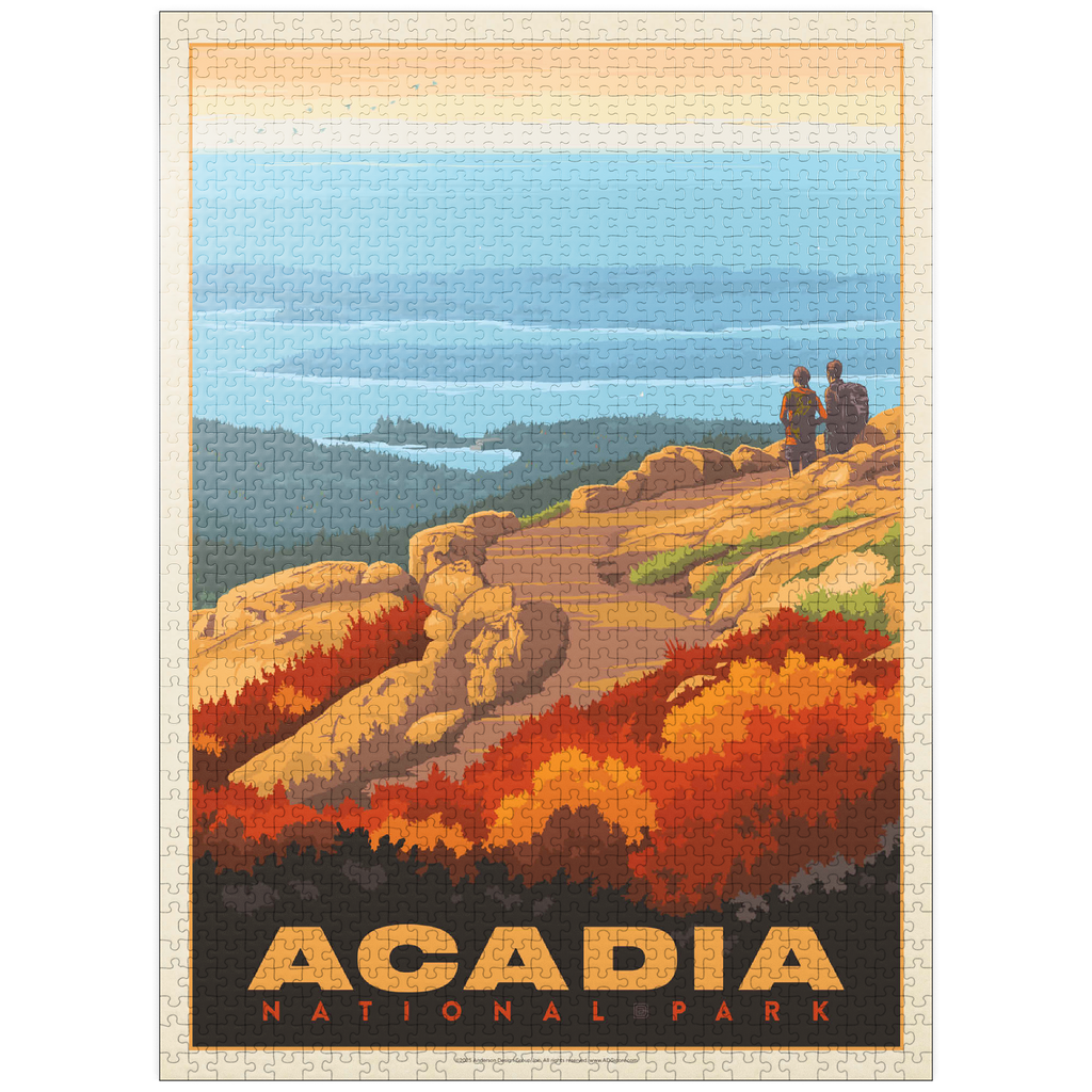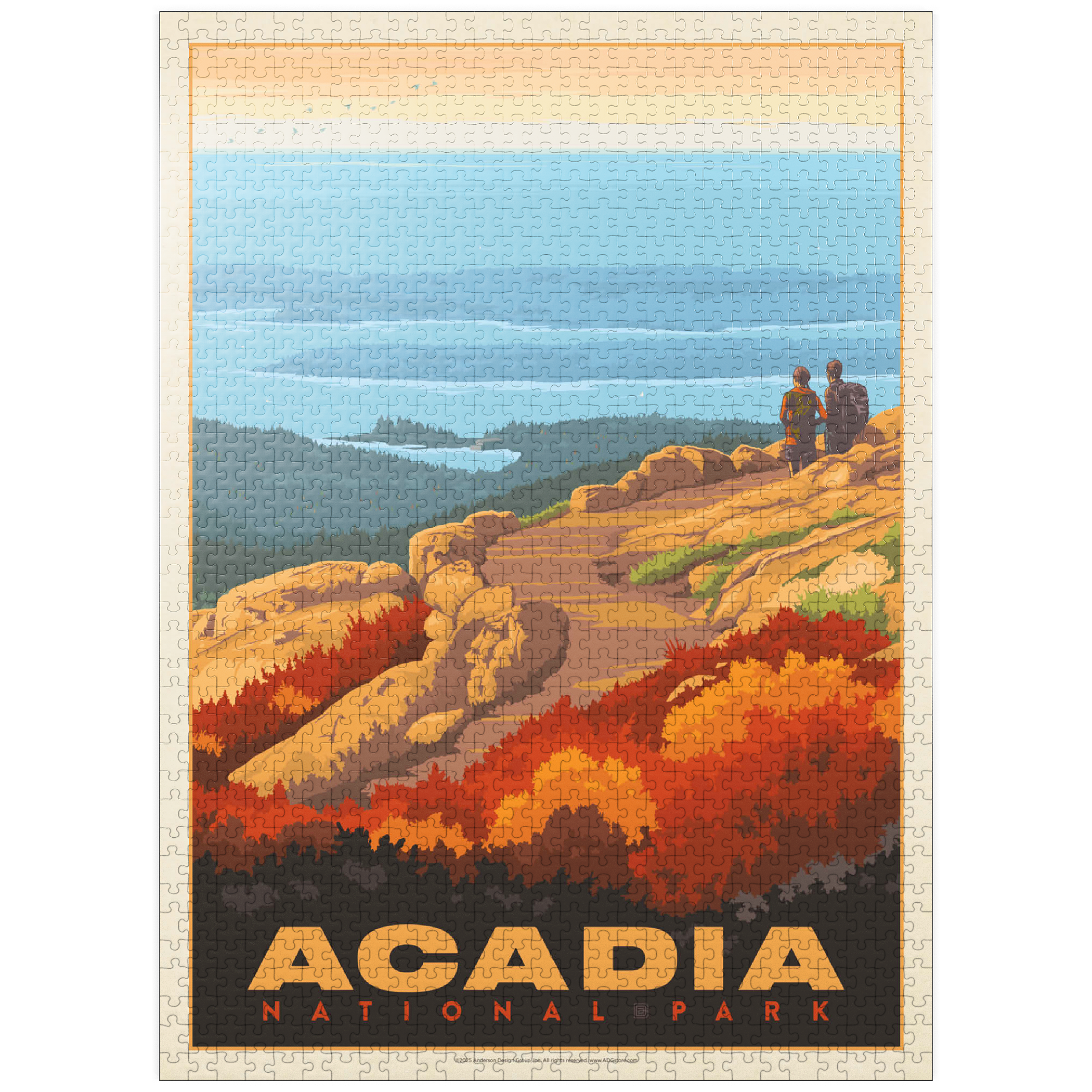 Acadia National Park in Maine is captured in this stunning autumn scene, where vibrant red, orange, and gold foliage contrasts beautifully with rugged granite cliffs. From the mountaintop trail, the sweeping view of the Atlantic Ocean and scattered islands stretches into the horizon under a pastel evening sky. This artwork highlights the park's dramatic coastal landscape, famous for its hiking trails, rocky shores, and breathtaking seasonal colors. Acadia, established in 1919, remains one of the most beloved national parks in the United States, drawing millions of visitors each year to experience its unique blend of mountains, forests, and ocean vistas.