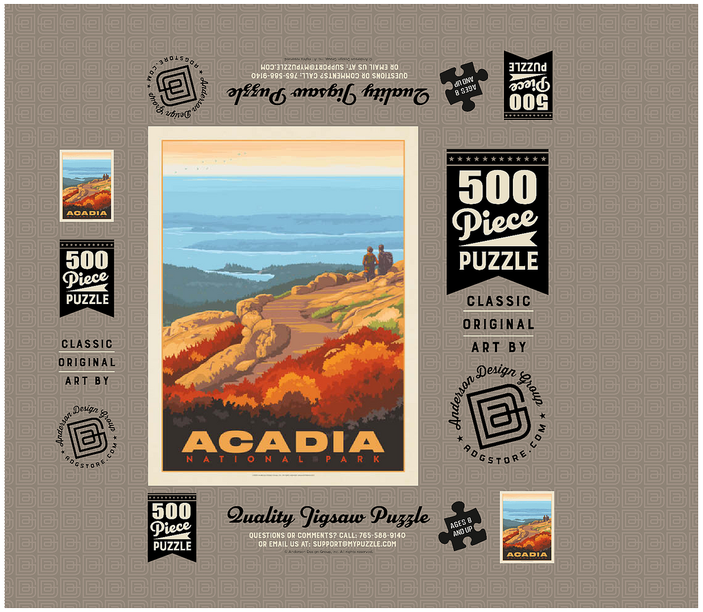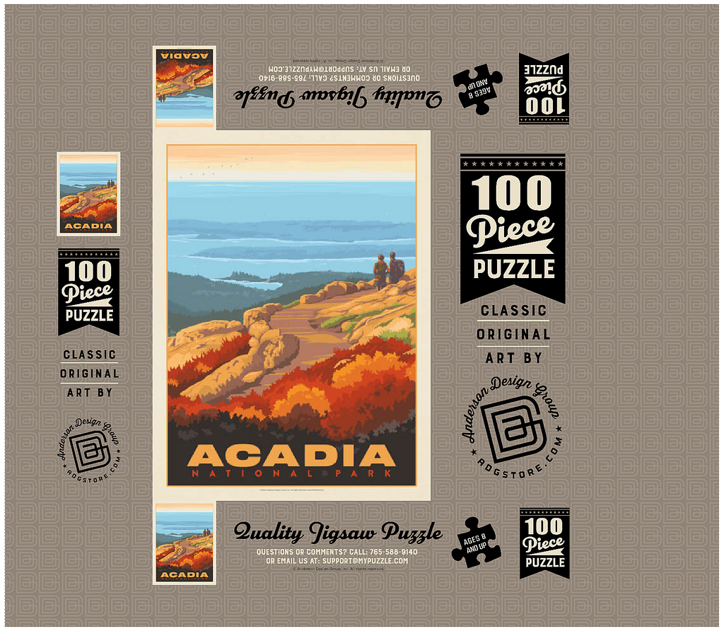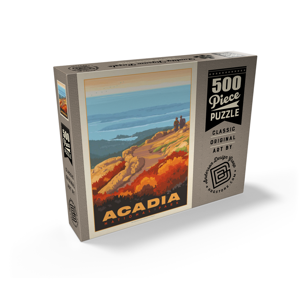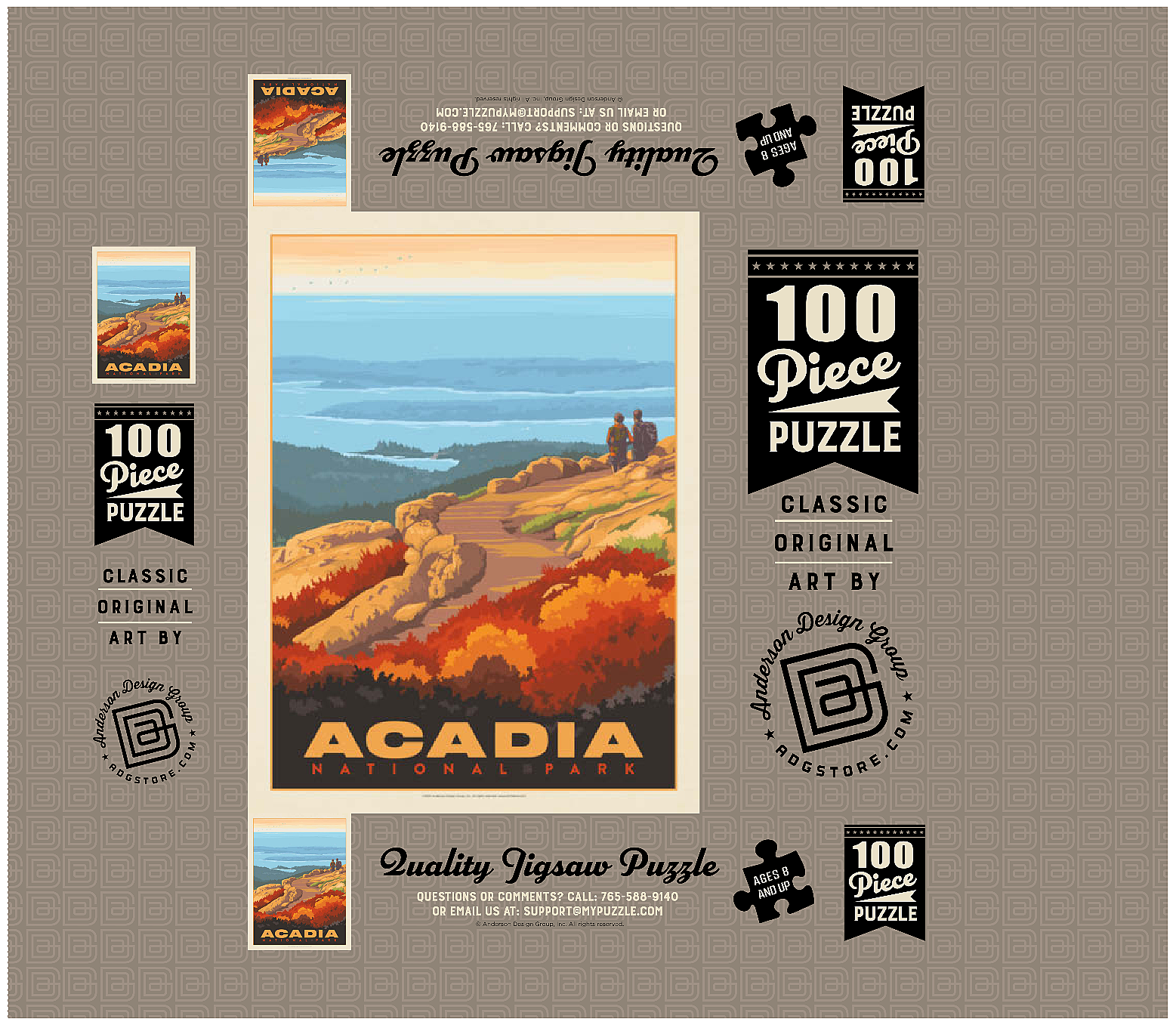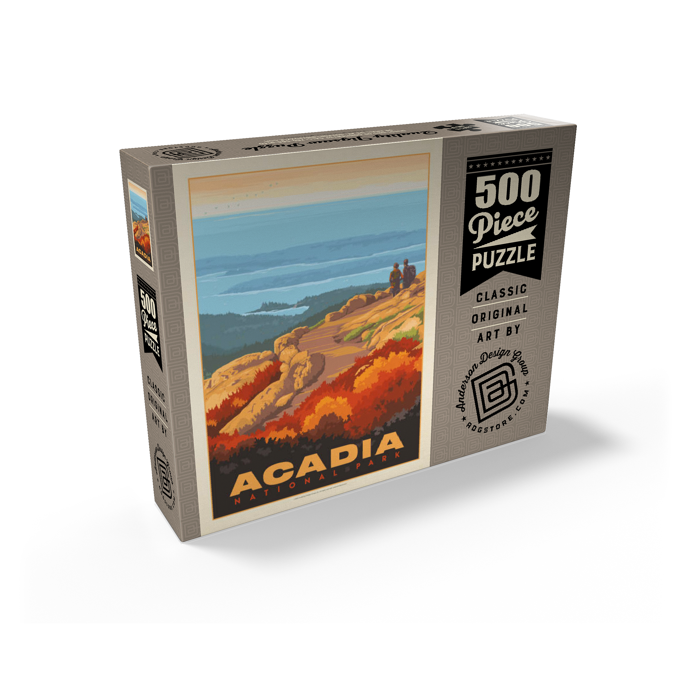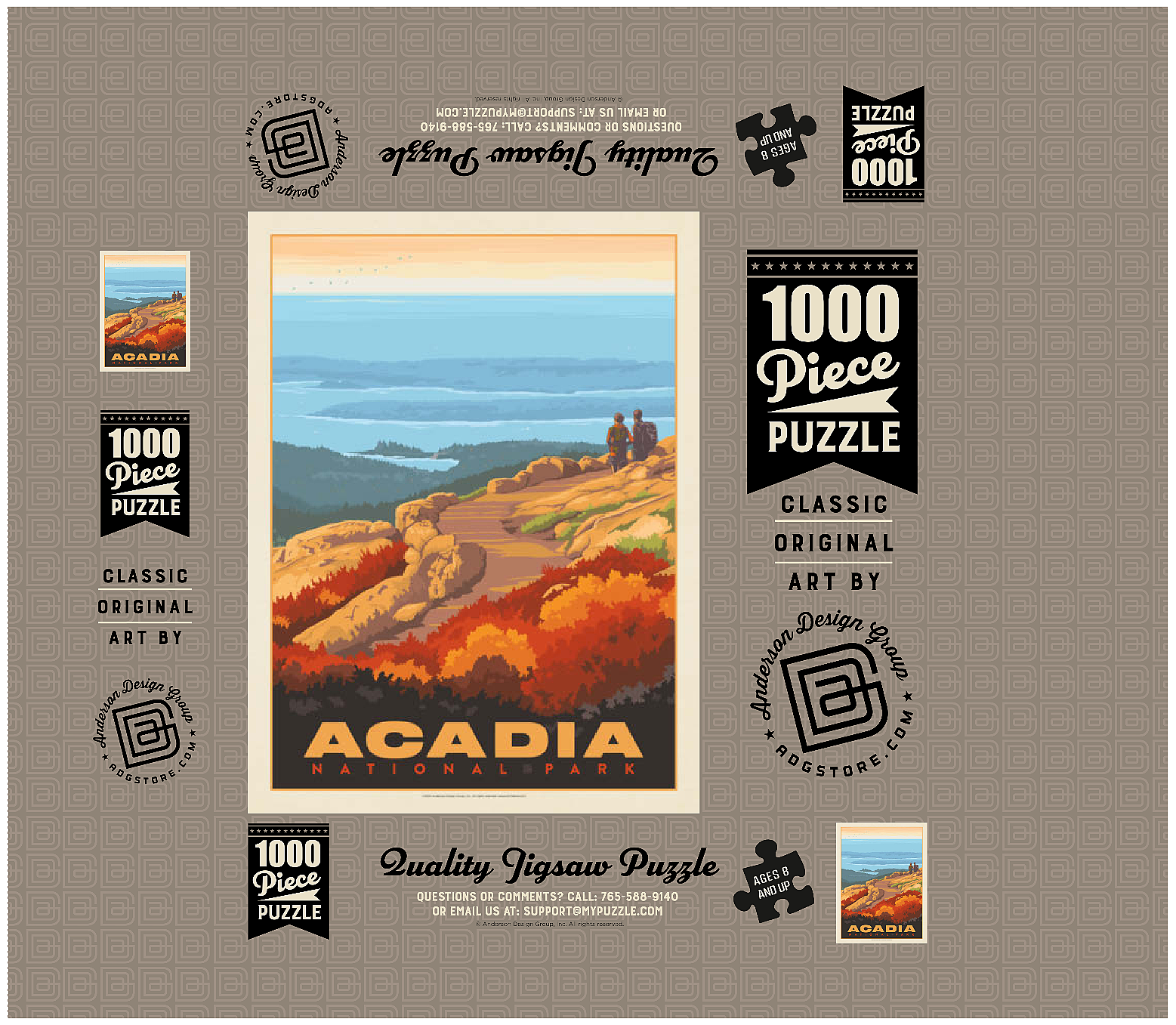 Acadia National Park in Maine is captured in this stunning autumn scene, where vibrant red, orange, and gold foliage contrasts beautifully with rugged granite cliffs. From the mountaintop trail, the sweeping view of the Atlantic Ocean and scattered islands stretches into the horizon under a pastel evening sky. This artwork highlights the park's dramatic coastal landscape, famous for its hiking trails, rocky shores, and breathtaking seasonal colors. Acadia, established in 1919, remains one of the most beloved national parks in the United States, drawing millions of visitors each year to experience its unique blend of mountains, forests, and ocean vistas.
