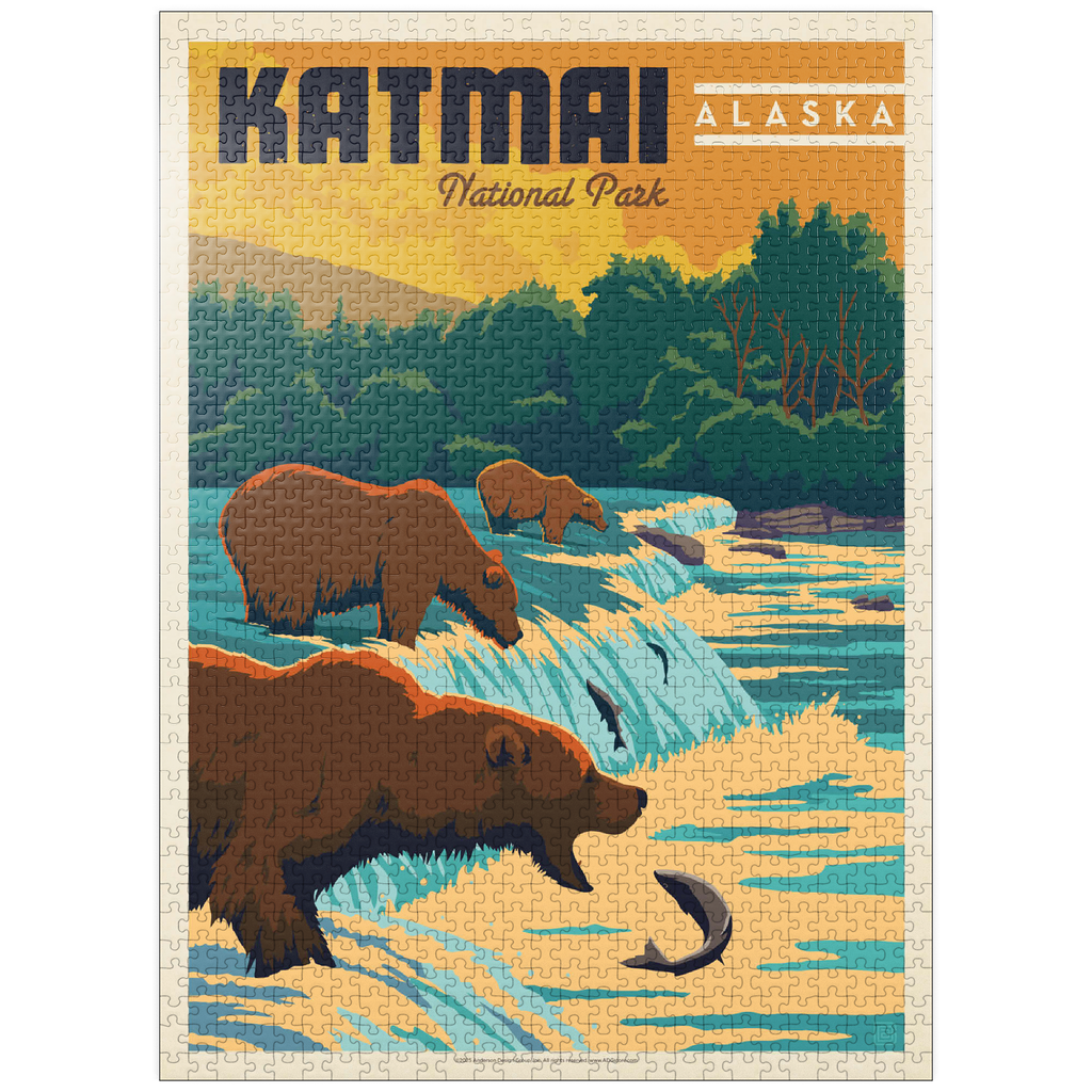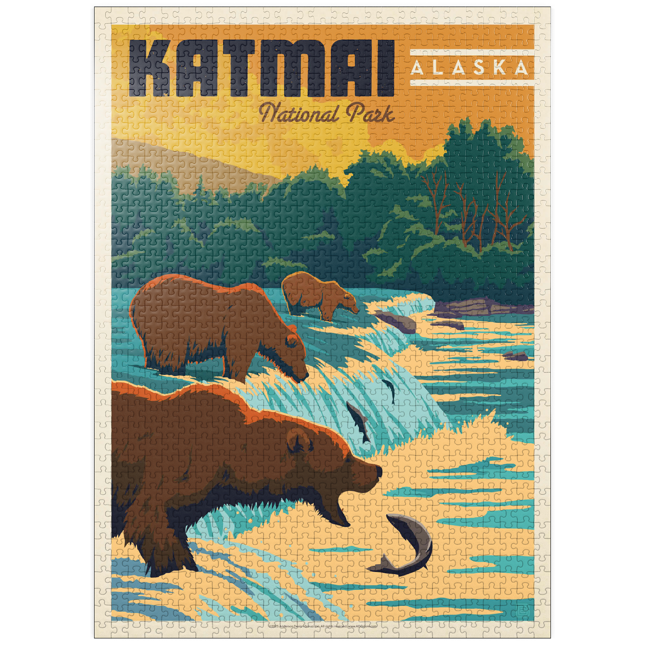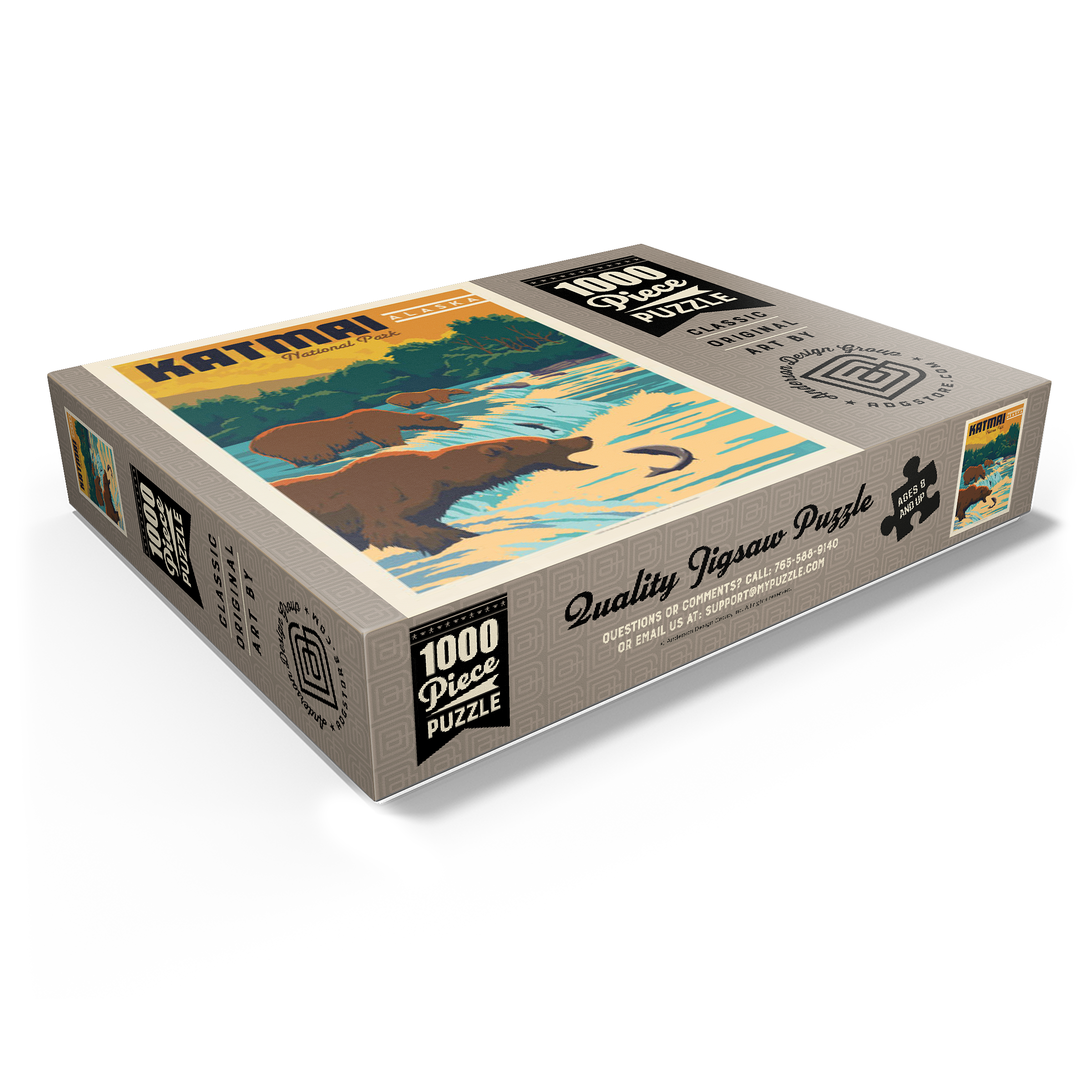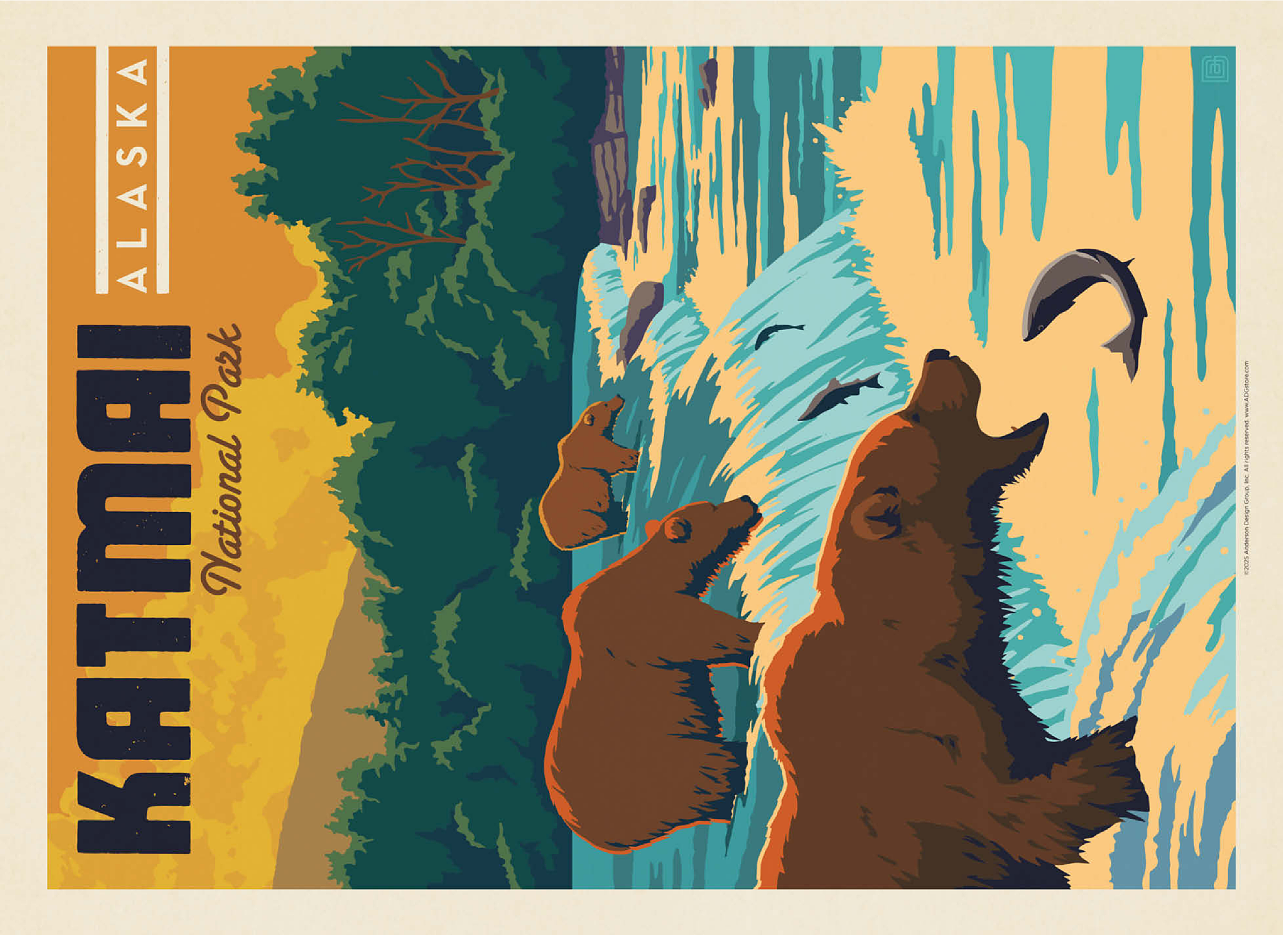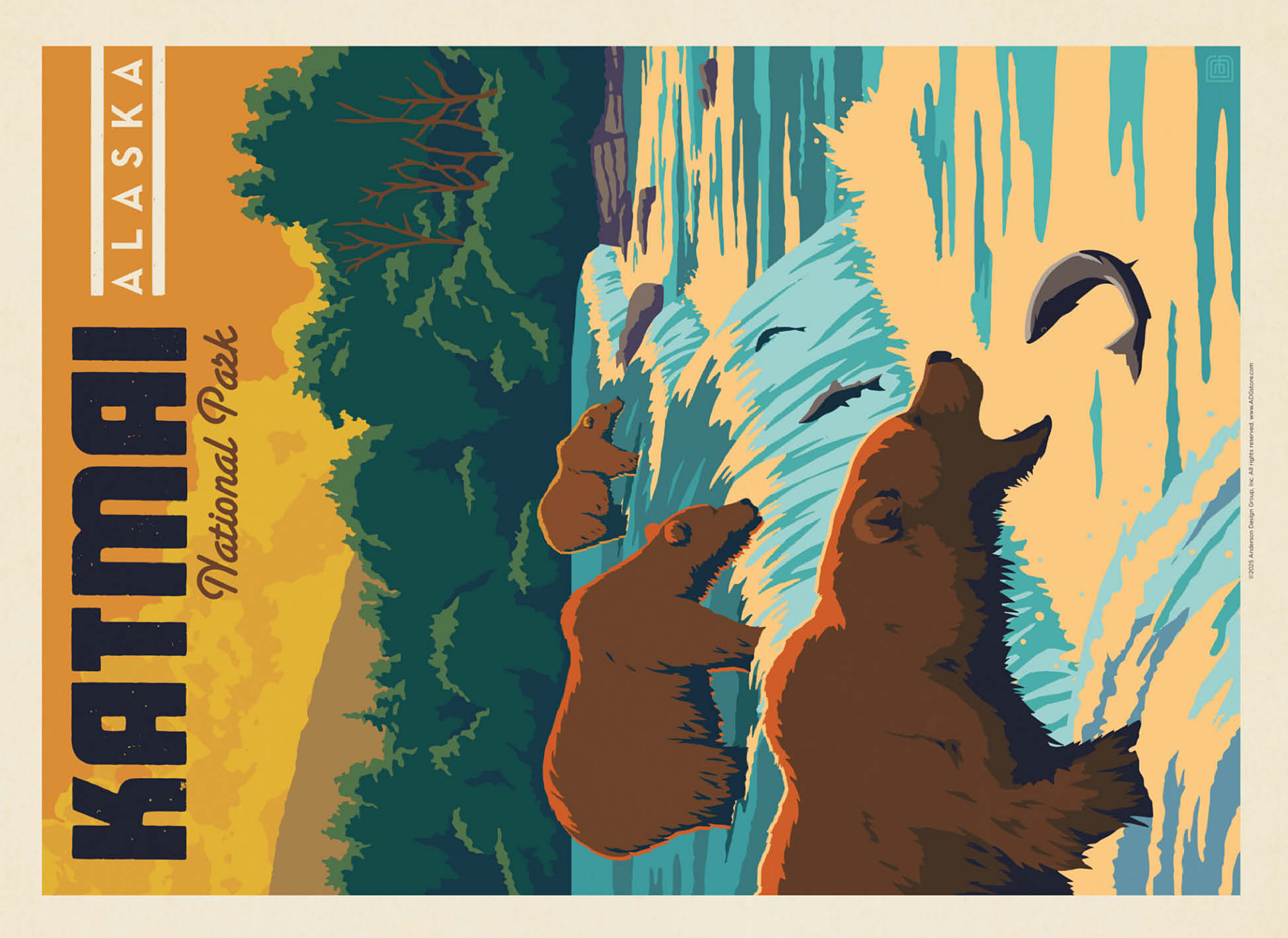 Katmai National Park in Alaska is powerfully illustrated with brown bears standing at Brooks Falls, skillfully catching leaping salmon in the rushing river. the golden light of the Alaskan wilderness highlights the dynamic energy of this iconic wildlife moment, surrounded by dense green forests and distant mountains. this scene captures the essence of Katmai's untamed nature, where bears gather each summer to feed during the salmon run. the bold colors and stylized composition emphasize both the strength of the bears and the beauty of Alaska's rugged landscape, celebrating one of North America's most famous wildlife spectacles.