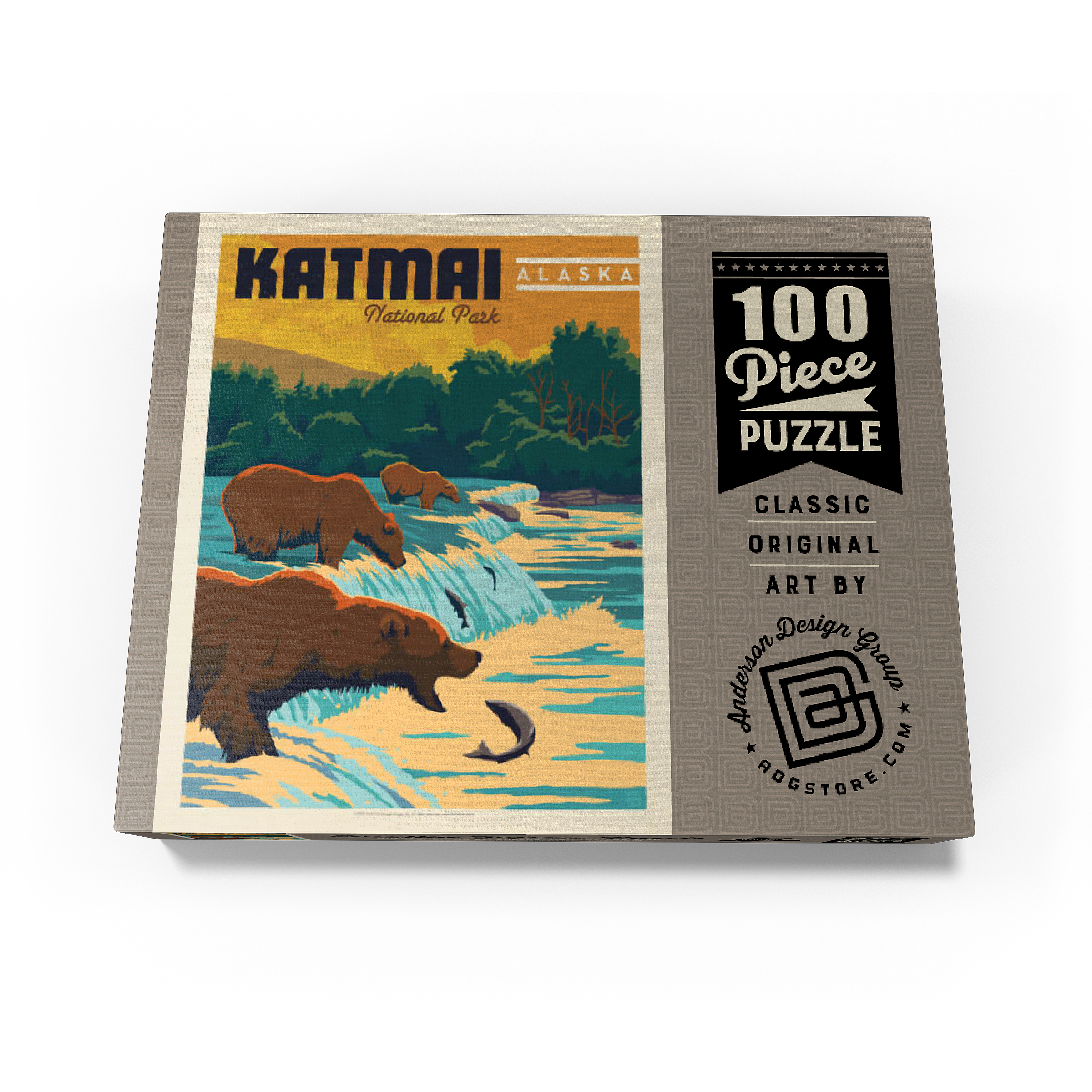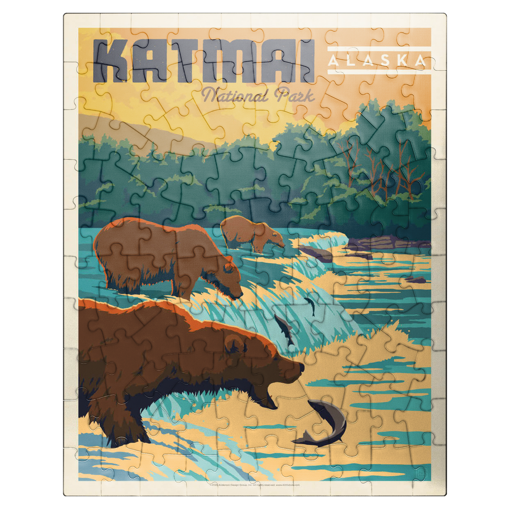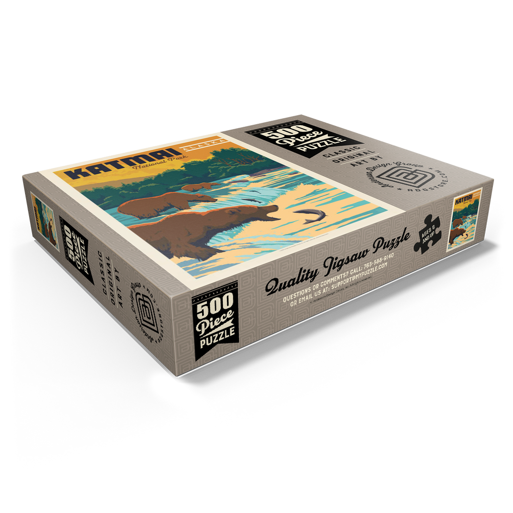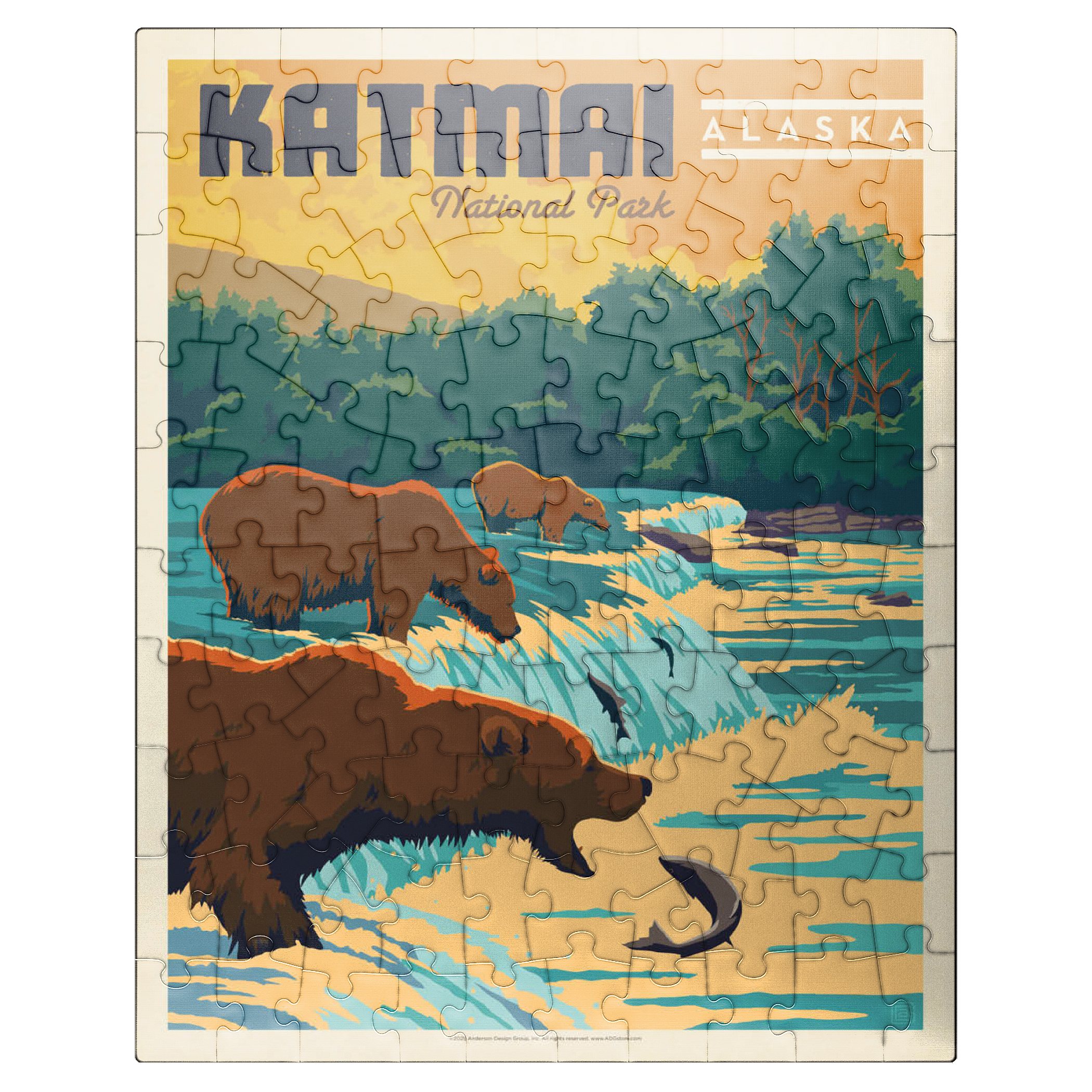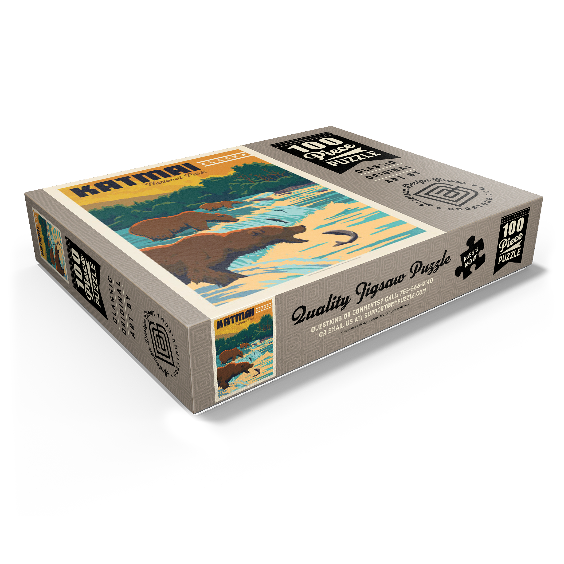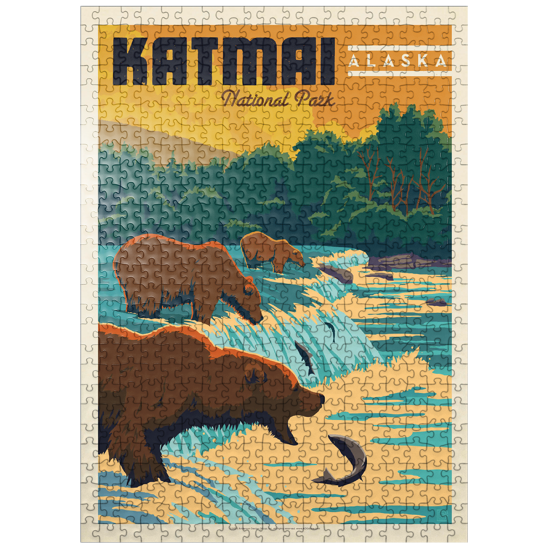 Katmai National Park in Alaska is powerfully illustrated with brown bears standing at Brooks Falls, skillfully catching leaping salmon in the rushing river. the golden light of the Alaskan wilderness highlights the dynamic energy of this iconic wildlife moment, surrounded by dense green forests and distant mountains. this scene captures the essence of Katmai's untamed nature, where bears gather each summer to feed during the salmon run. the bold colors and stylized composition emphasize both the strength of the bears and the beauty of Alaska's rugged landscape, celebrating one of North America's most famous wildlife spectacles.