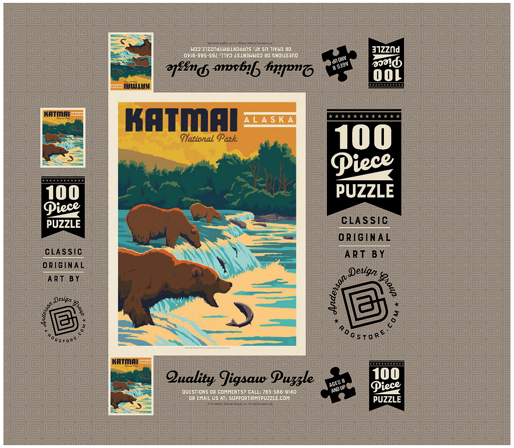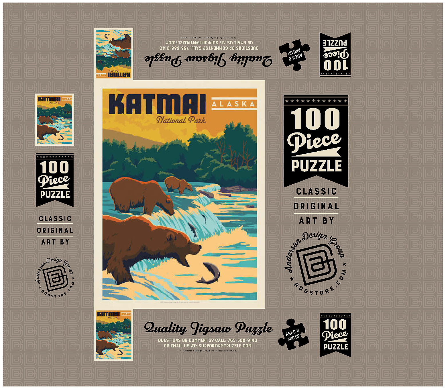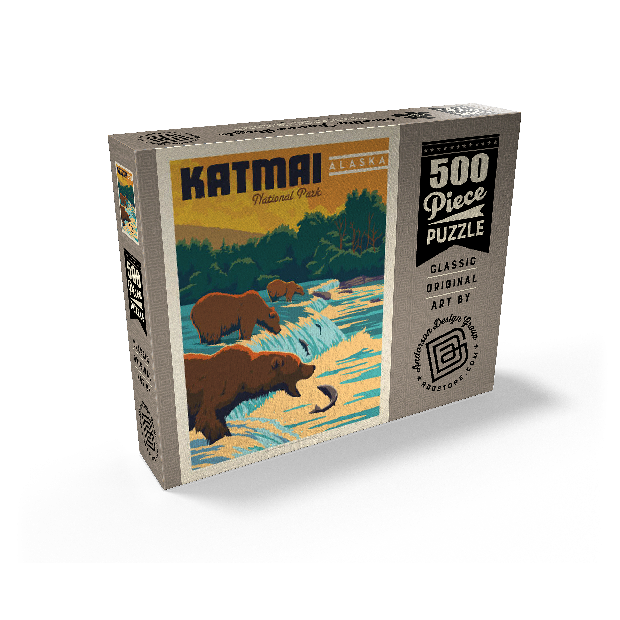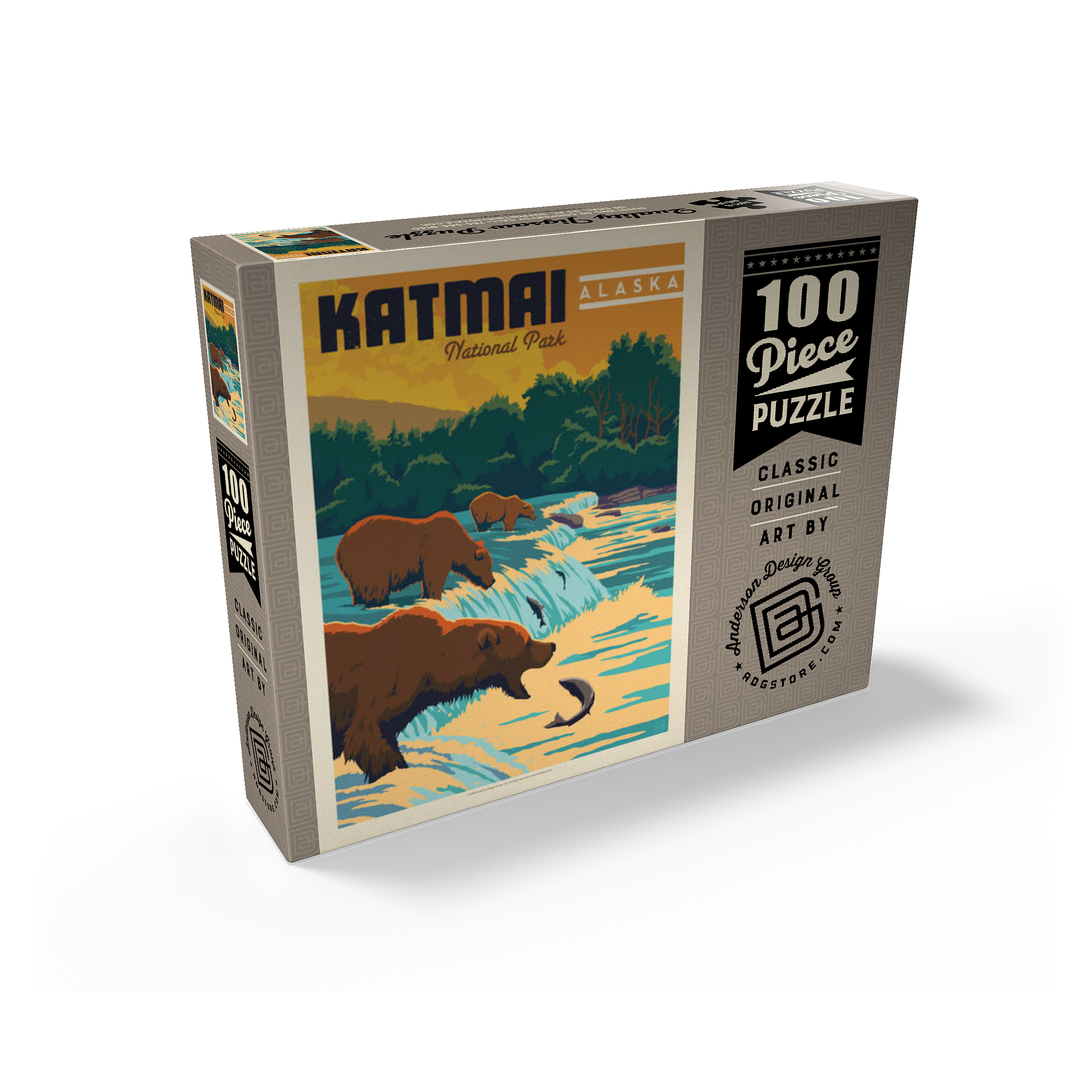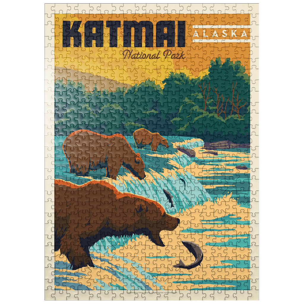 Katmai National Park in Alaska is powerfully illustrated with brown bears standing at Brooks Falls, skillfully catching leaping salmon in the rushing river. the golden light of the Alaskan wilderness highlights the dynamic energy of this iconic wildlife moment, surrounded by dense green forests and distant mountains. this scene captures the essence of Katmai's untamed nature, where bears gather each summer to feed during the salmon run. the bold colors and stylized composition emphasize both the strength of the bears and the beauty of Alaska's rugged landscape, celebrating one of North America's most famous wildlife spectacles.