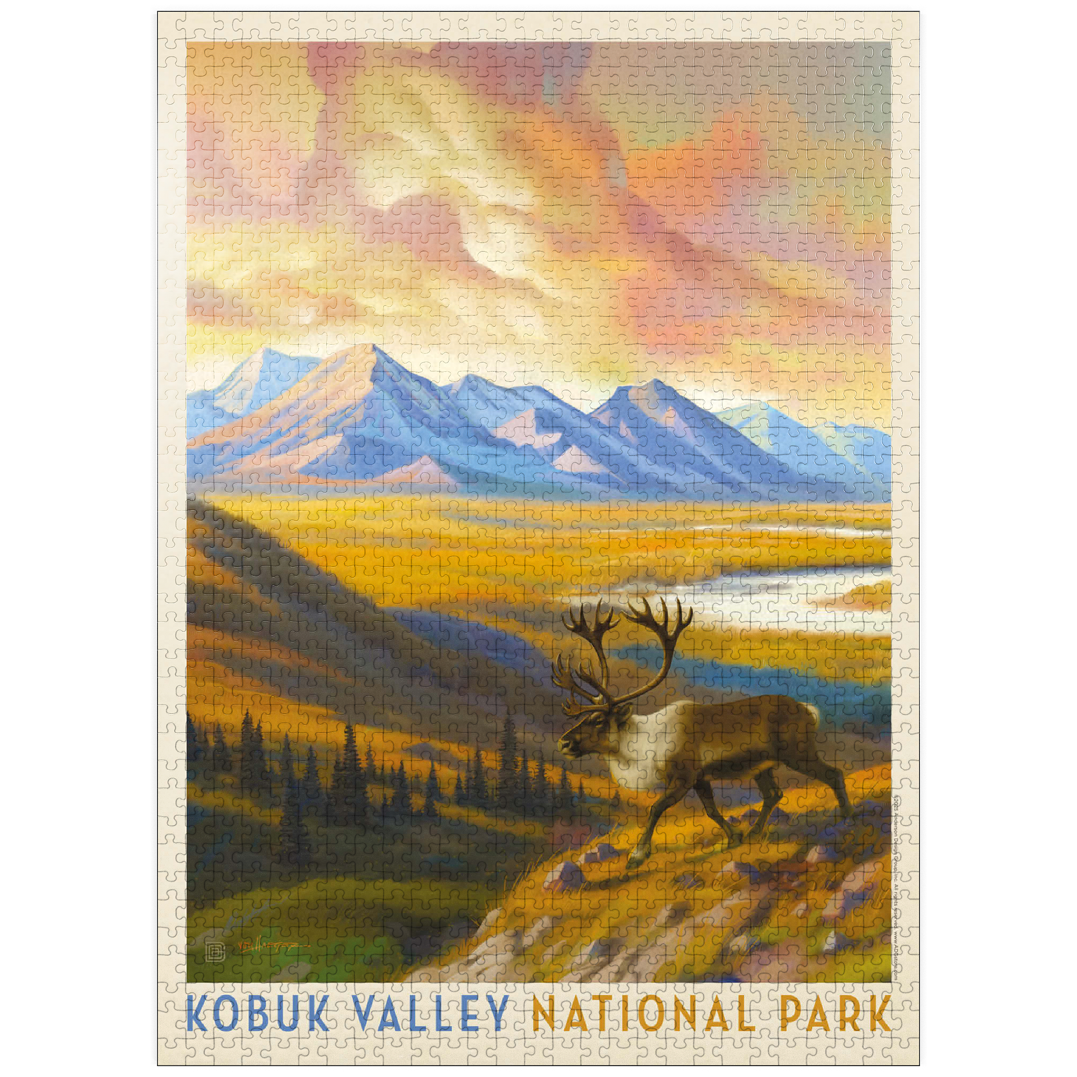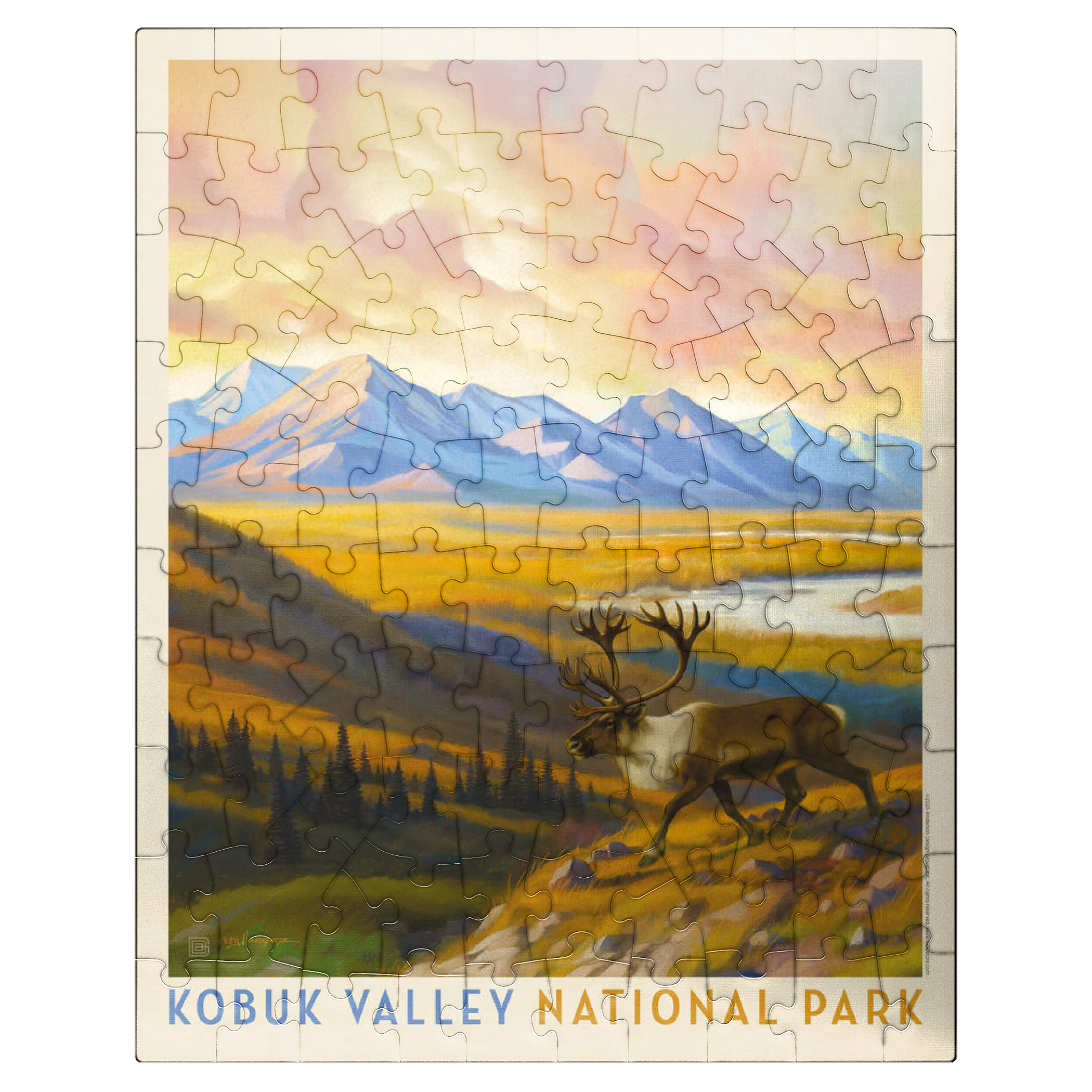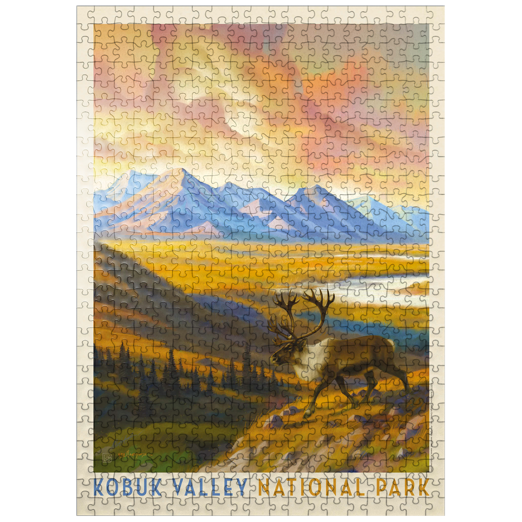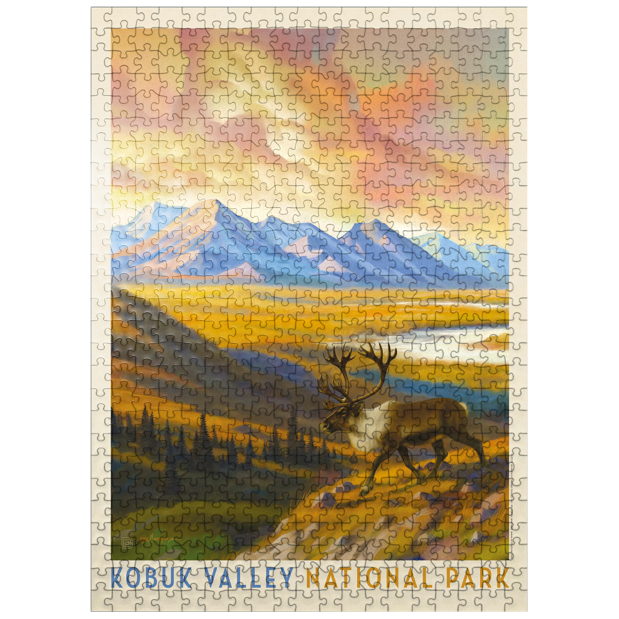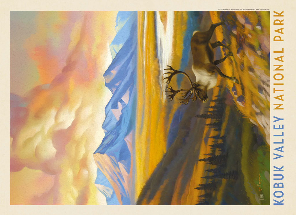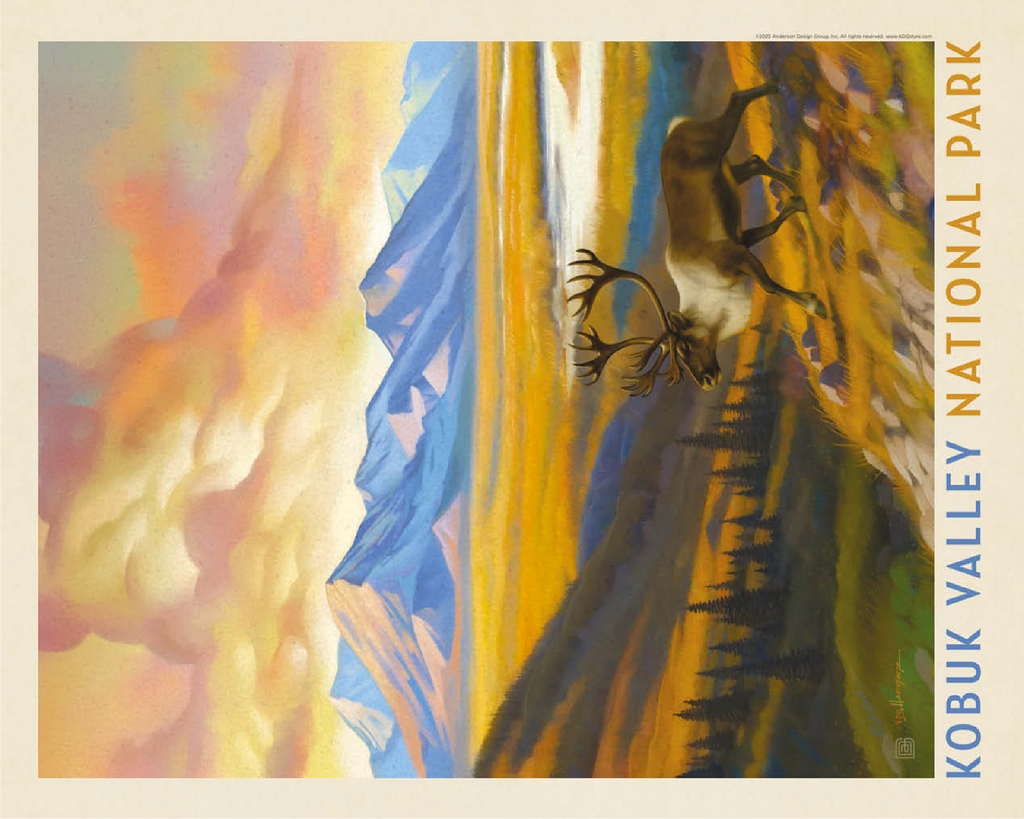 Kobuk Valley National Park in northwestern Alaska is beautifully portrayed with a majestic caribou roaming across the golden tundra beneath pastel-colored Arctic skies. Towering blue mountains rise in the distance as the Kobuk River winds through the vast valley, reflecting the soft glow of evening light. This depiction captures the wild essence of Alaska's interior, where migrating caribou traverse sweeping landscapes of sand dunes, forests, and open plains. The warm hues and expansive scenery evoke the solitude and natural wonder of this remote wilderness, emphasizing the harmony between wildlife and the untouched Arctic environment.