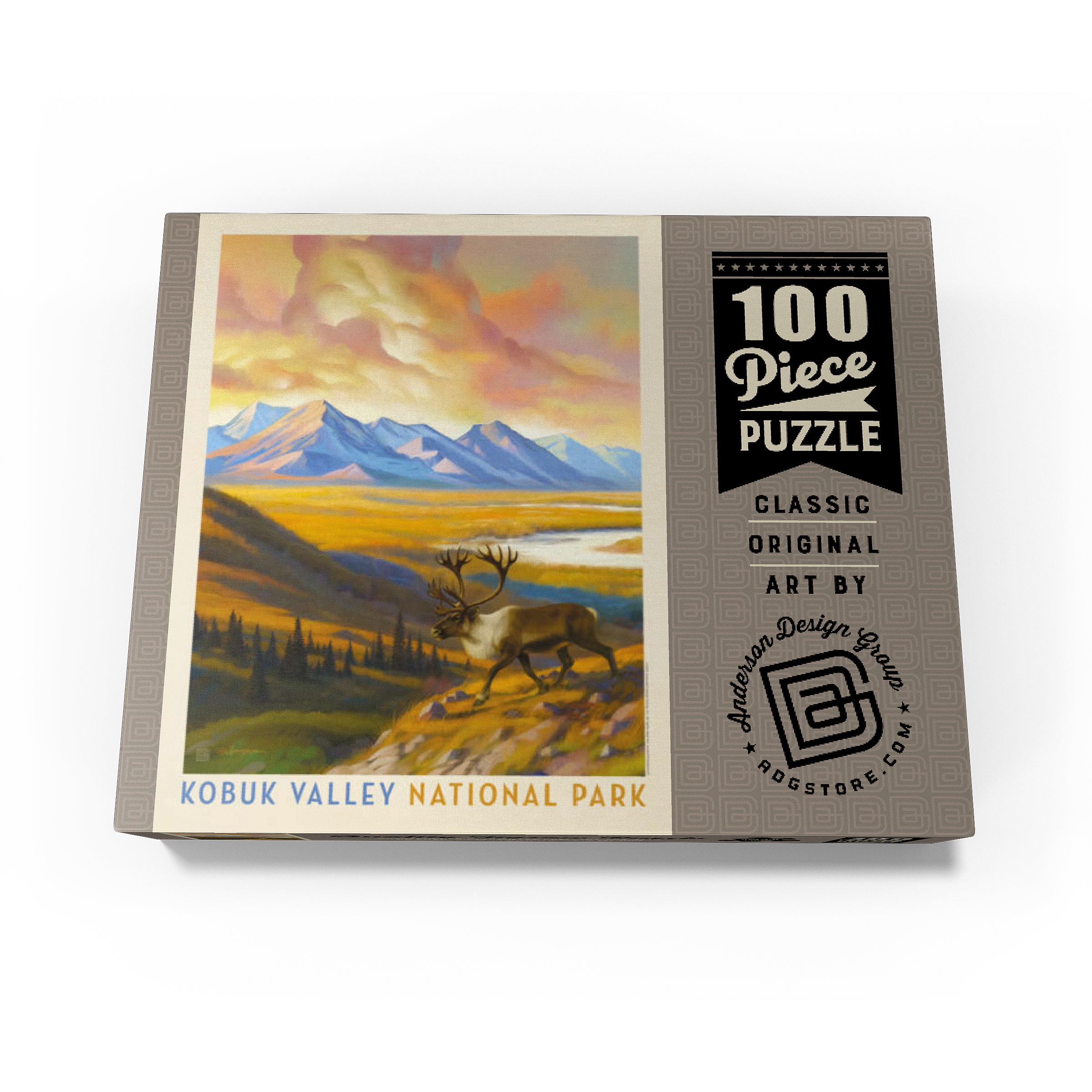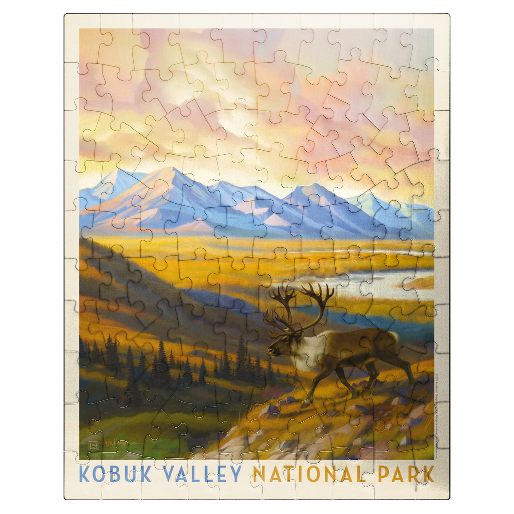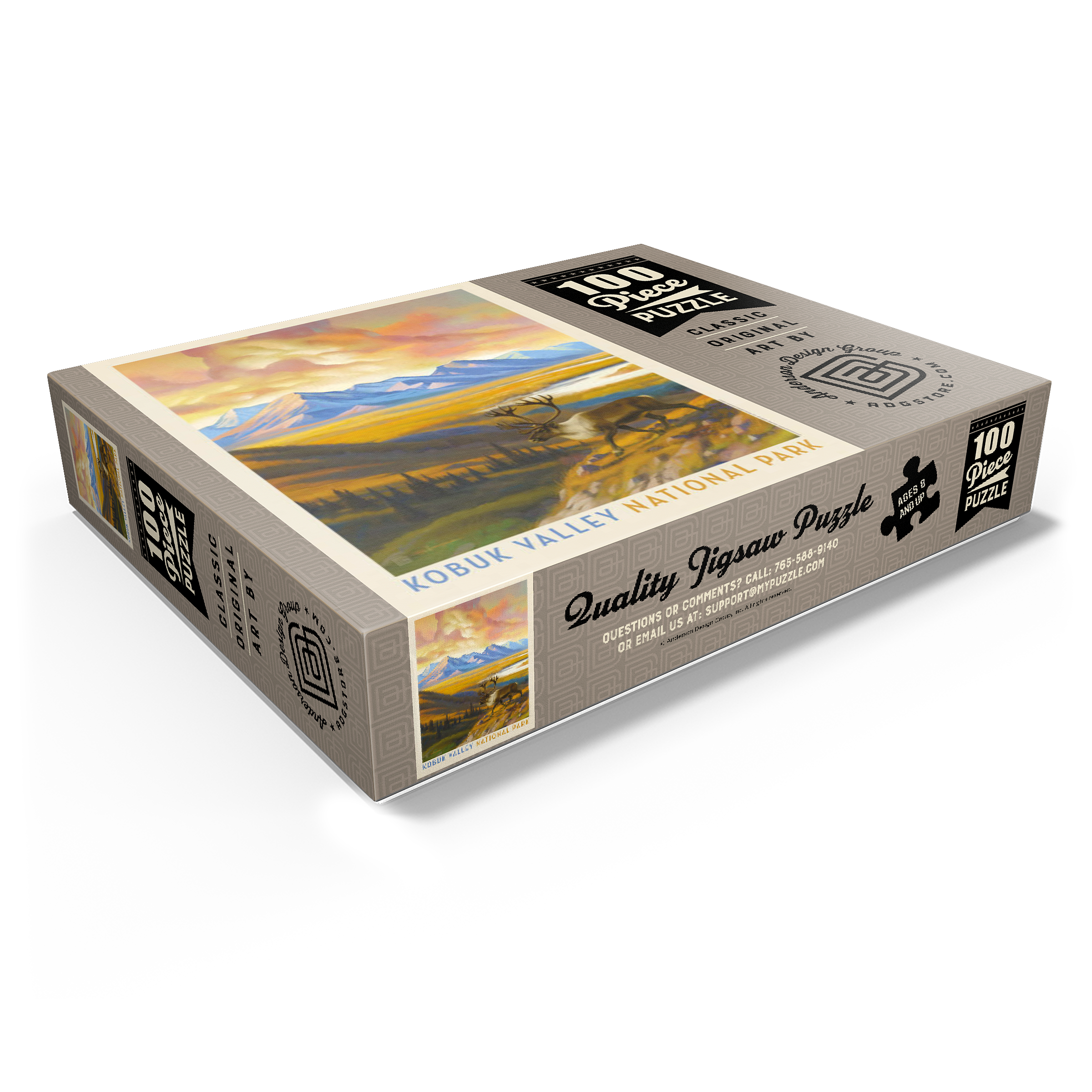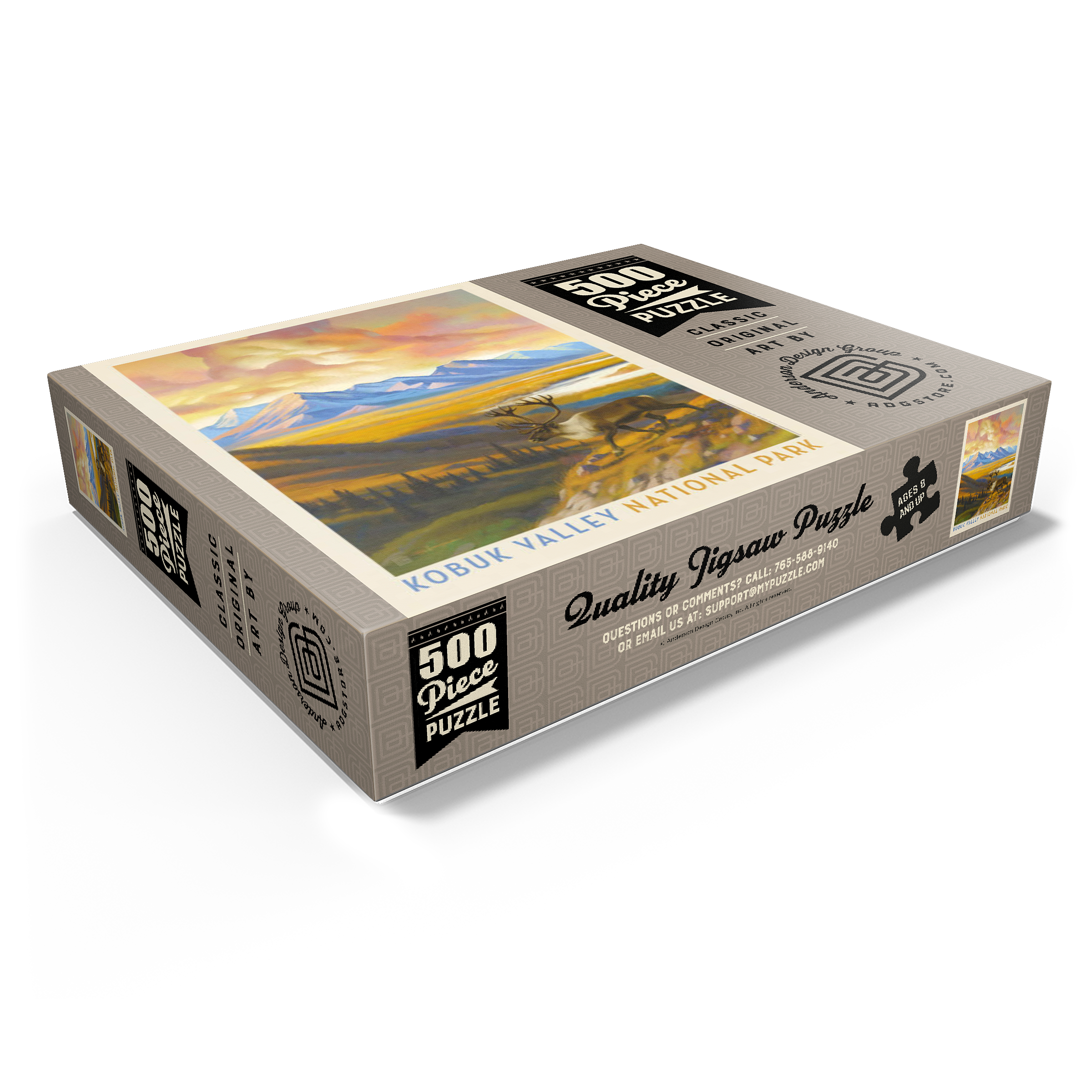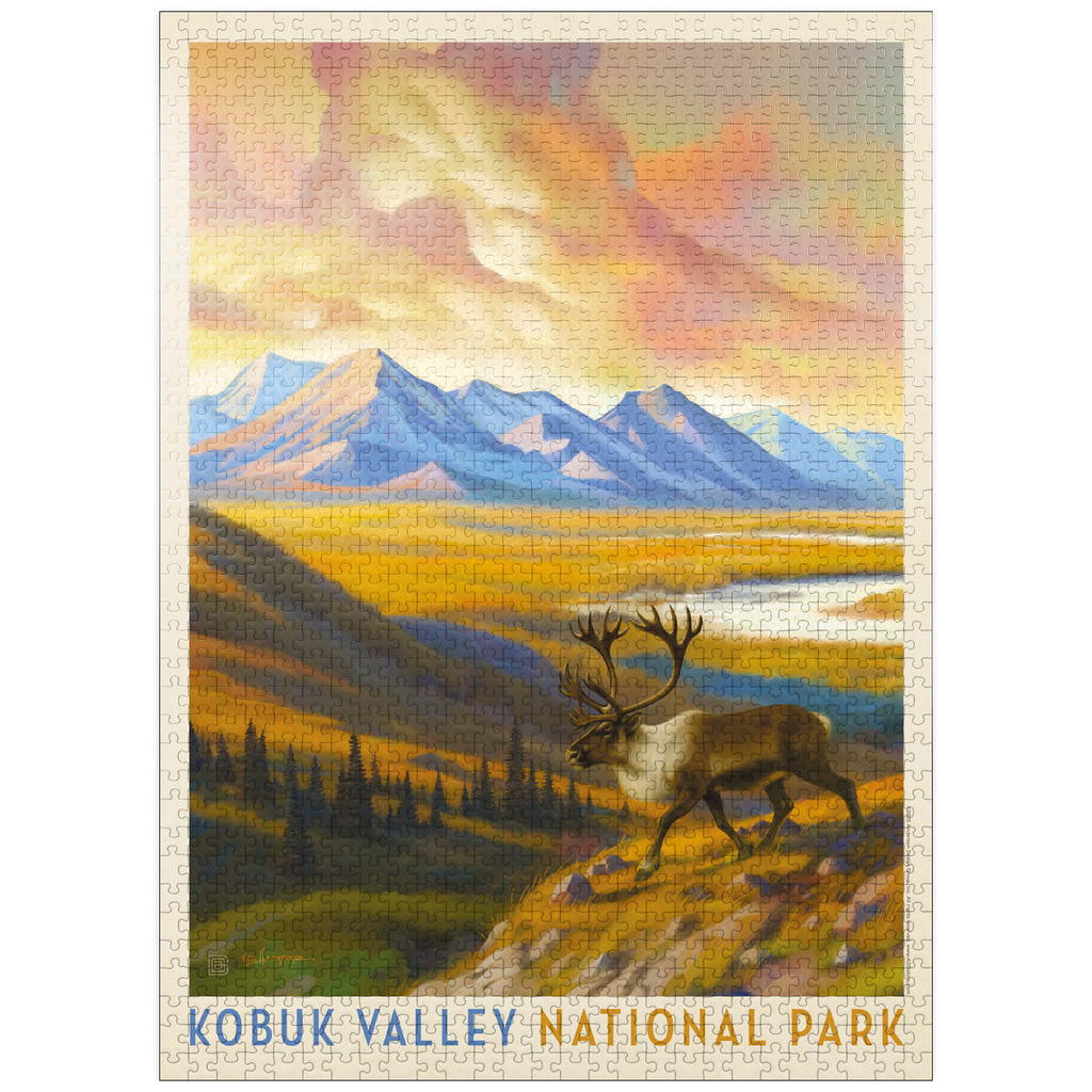 Kobuk Valley National Park in northwestern Alaska is beautifully portrayed with a majestic caribou roaming across the golden tundra beneath pastel-colored Arctic skies. Towering blue mountains rise in the distance as the Kobuk River winds through the vast valley, reflecting the soft glow of evening light. This depiction captures the wild essence of Alaska's interior, where migrating caribou traverse sweeping landscapes of sand dunes, forests, and open plains. The warm hues and expansive scenery evoke the solitude and natural wonder of this remote wilderness, emphasizing the harmony between wildlife and the untouched Arctic environment.