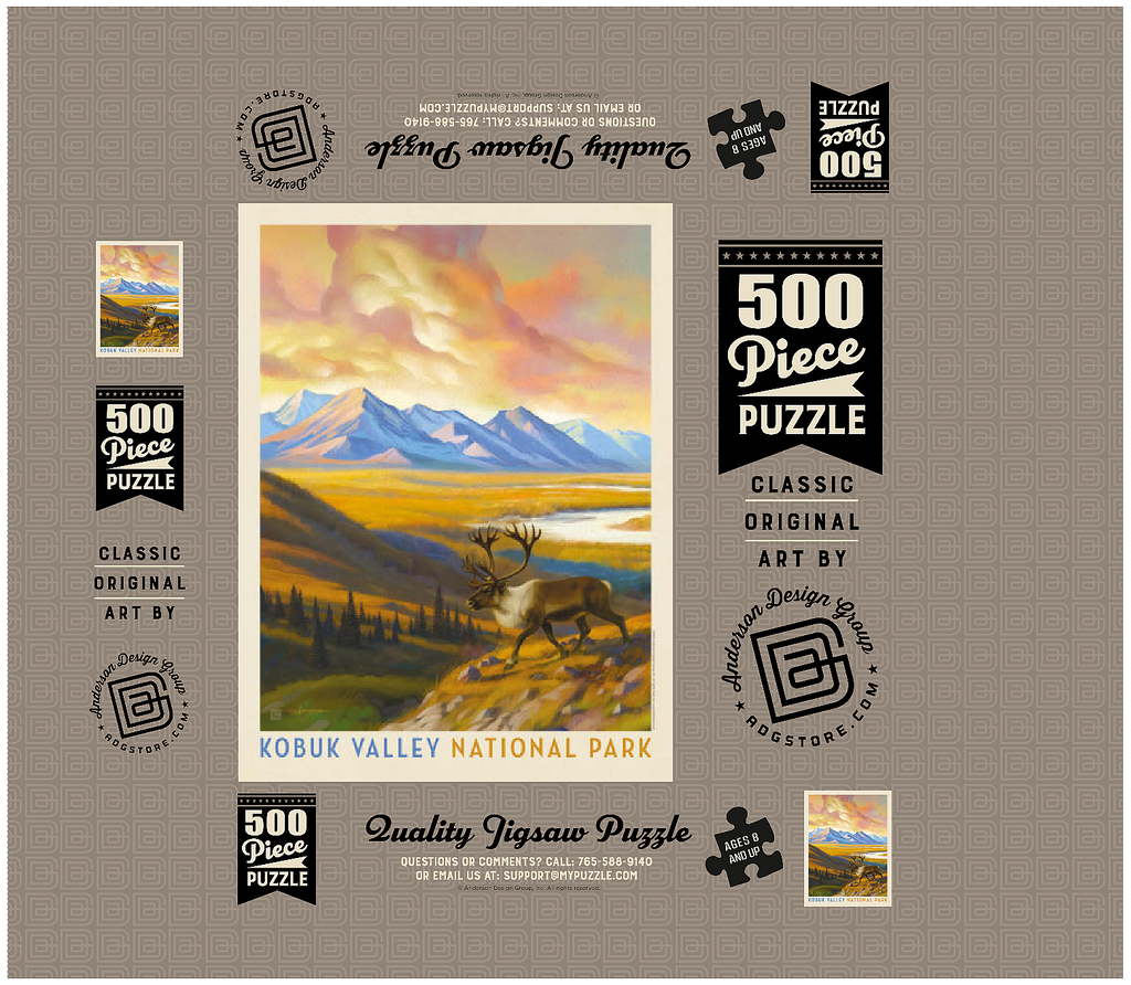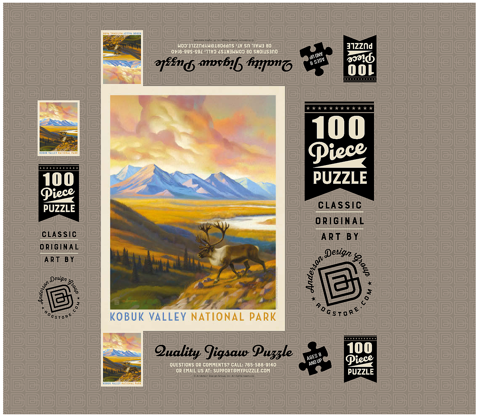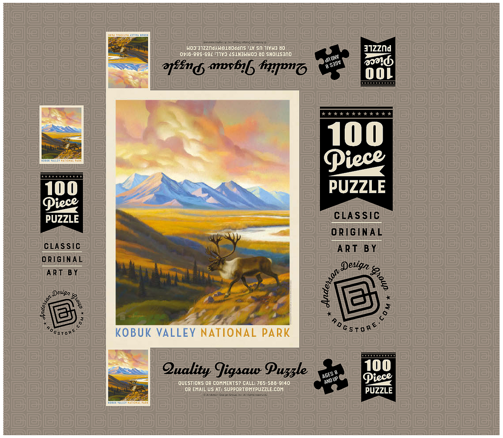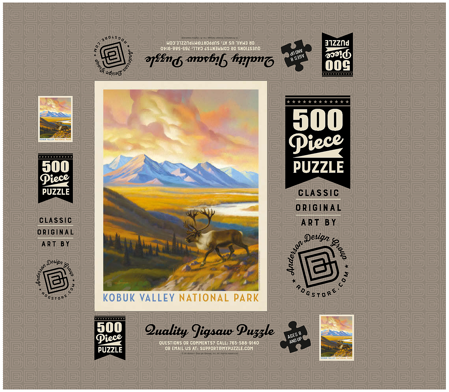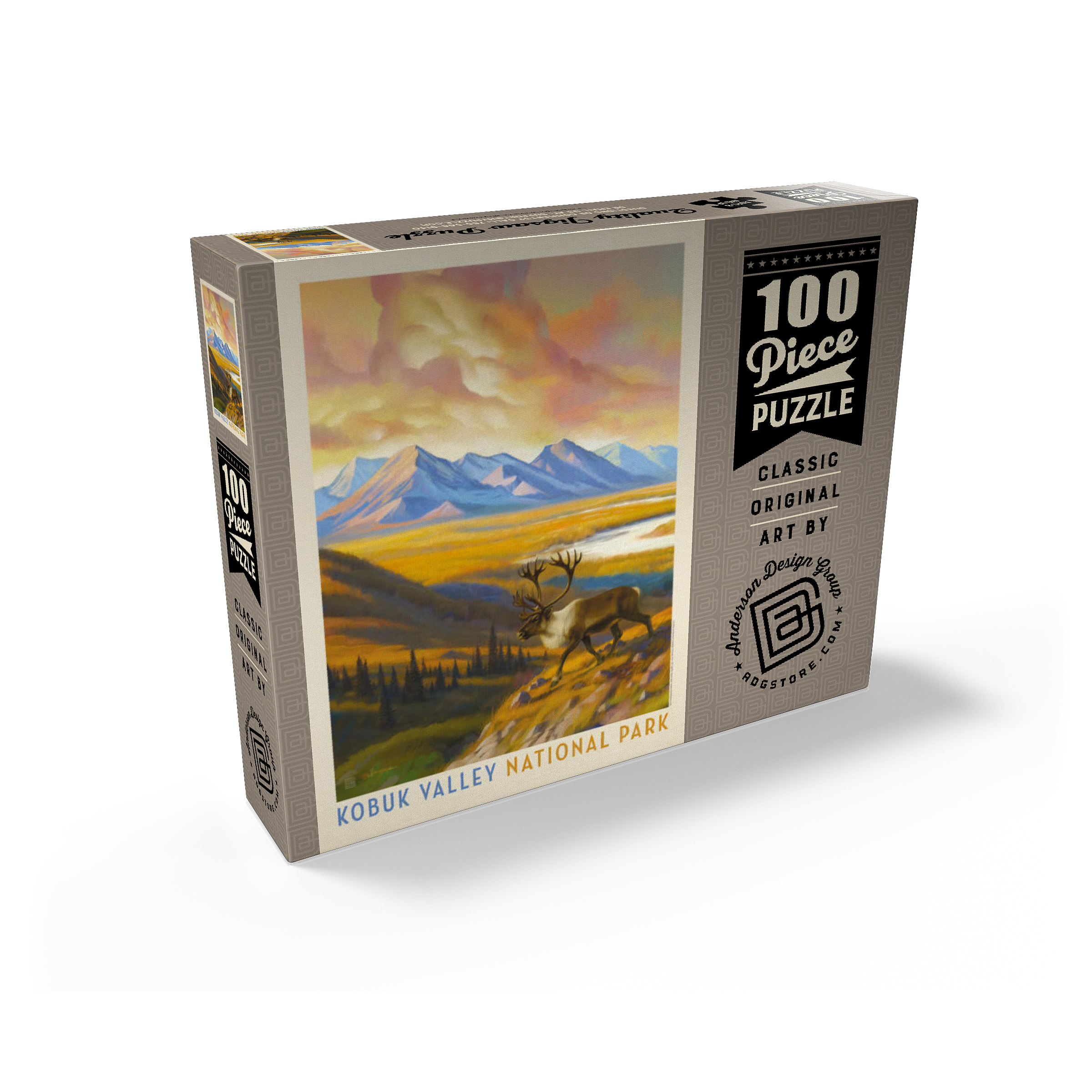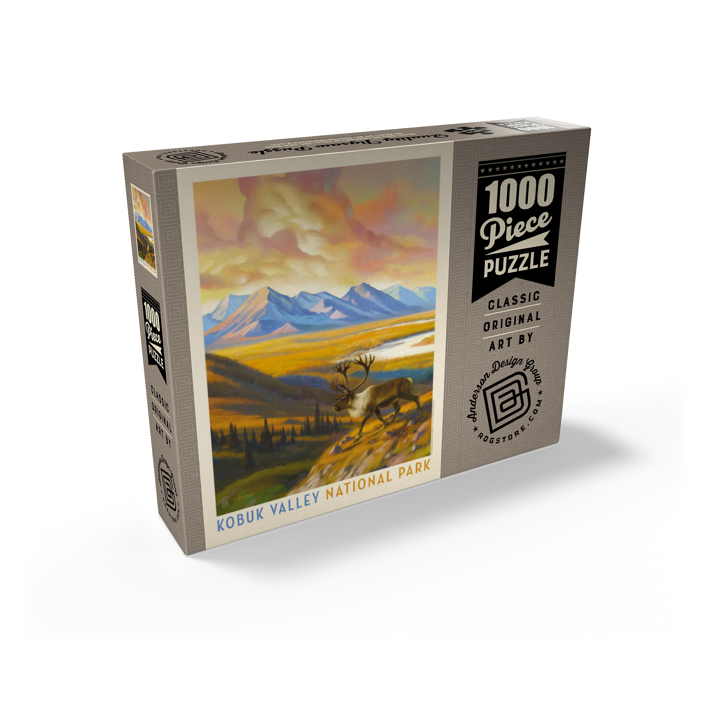 Kobuk Valley National Park in northwestern Alaska is beautifully portrayed with a majestic caribou roaming across the golden tundra beneath pastel-colored Arctic skies. Towering blue mountains rise in the distance as the Kobuk River winds through the vast valley, reflecting the soft glow of evening light. This depiction captures the wild essence of Alaska's interior, where migrating caribou traverse sweeping landscapes of sand dunes, forests, and open plains. The warm hues and expansive scenery evoke the solitude and natural wonder of this remote wilderness, emphasizing the harmony between wildlife and the untouched Arctic environment.