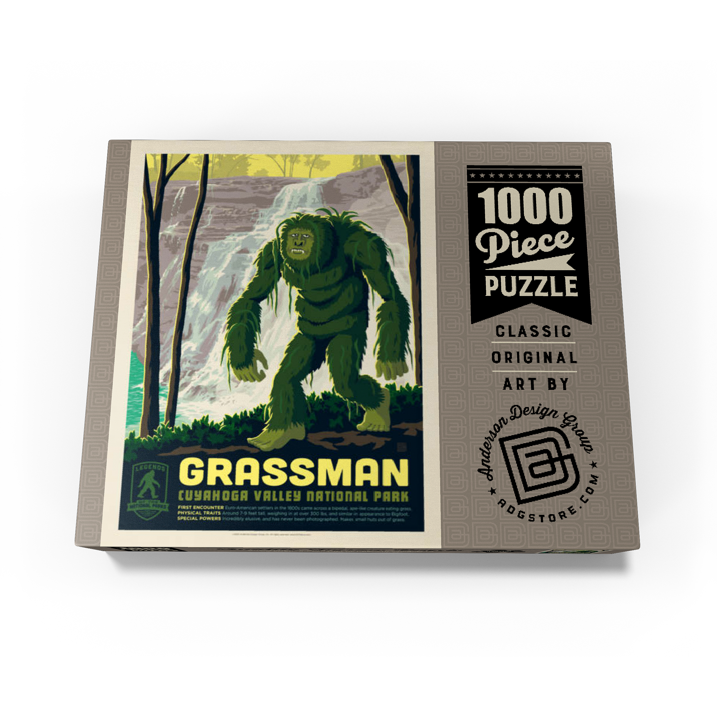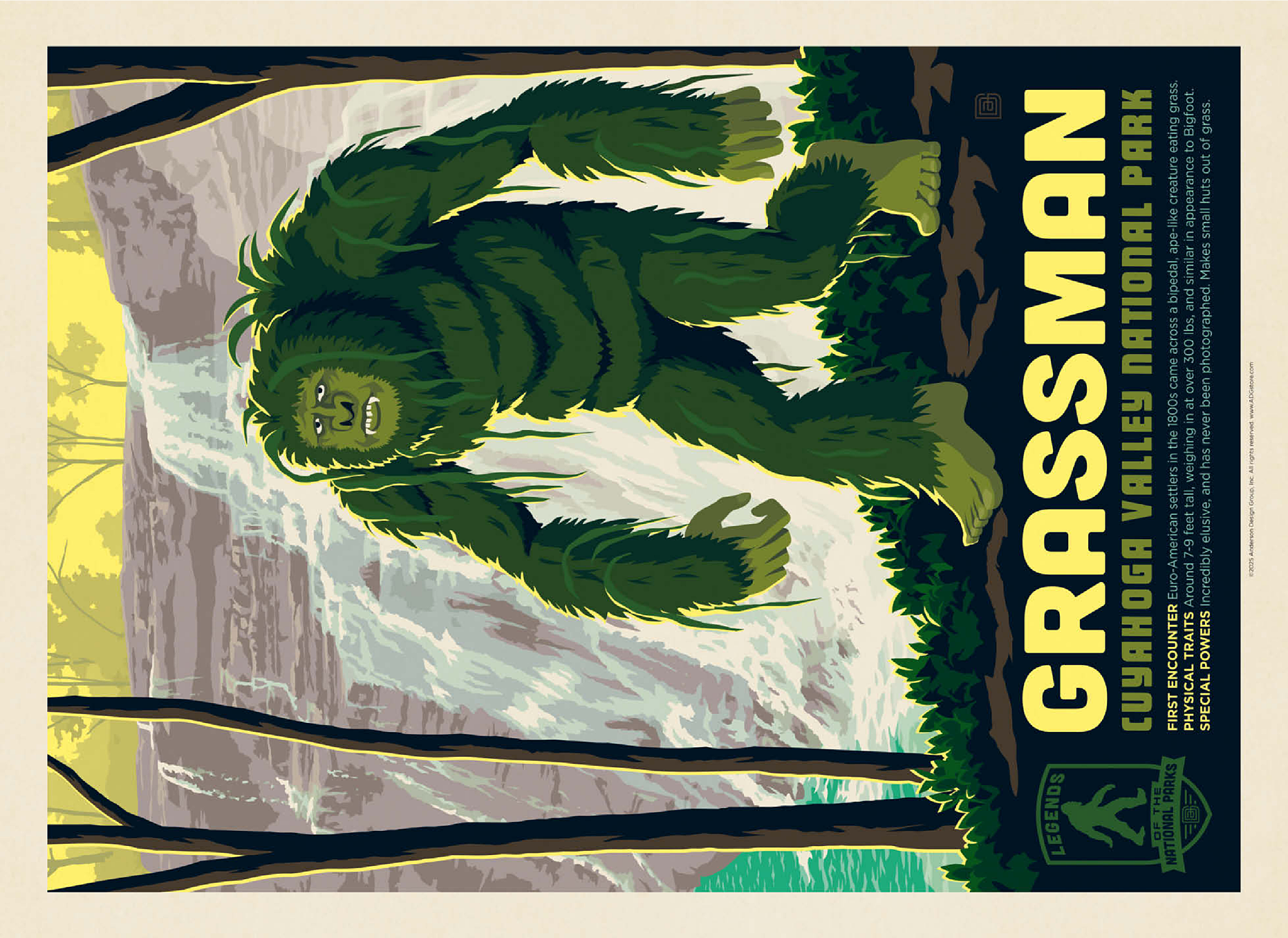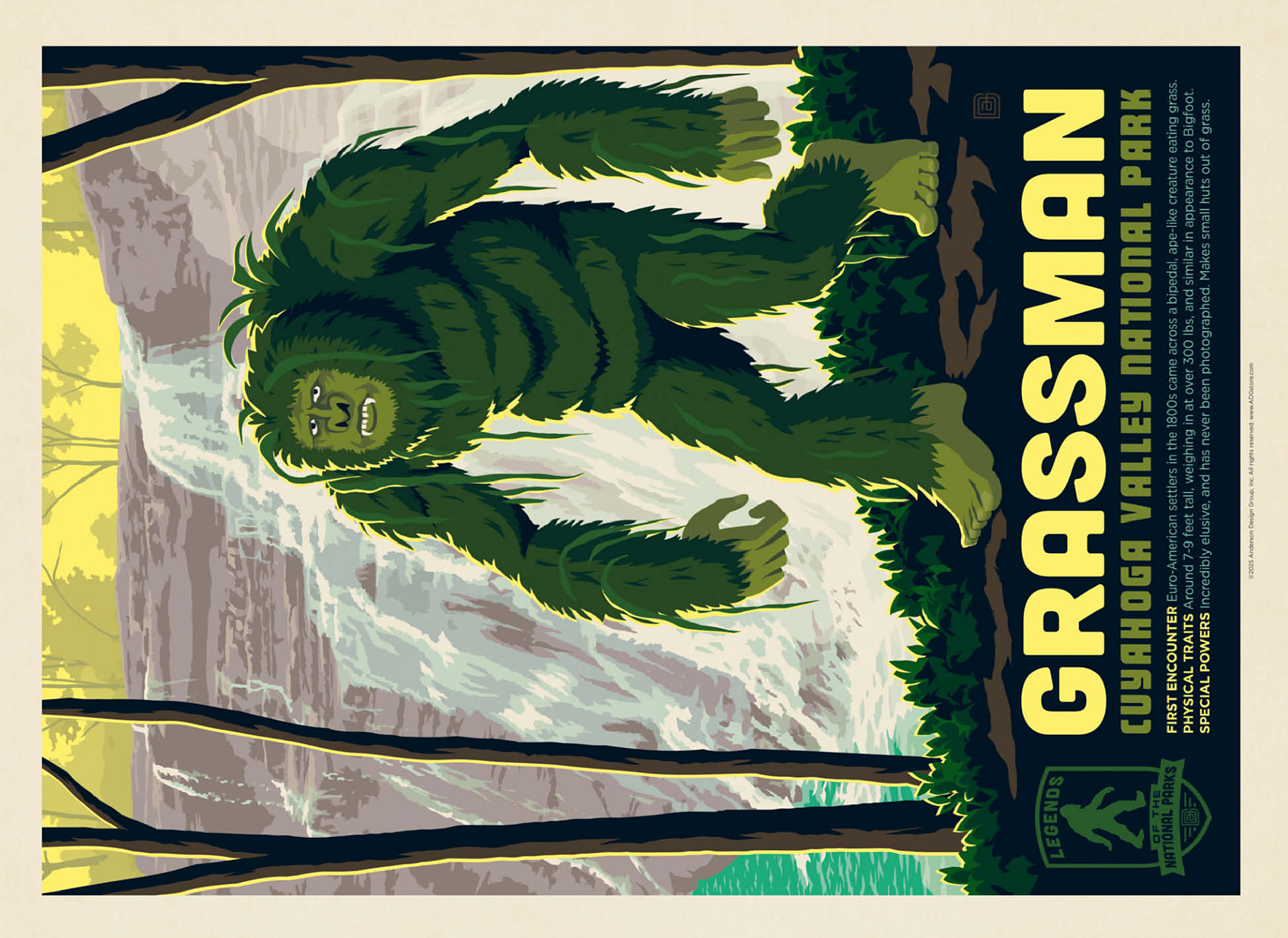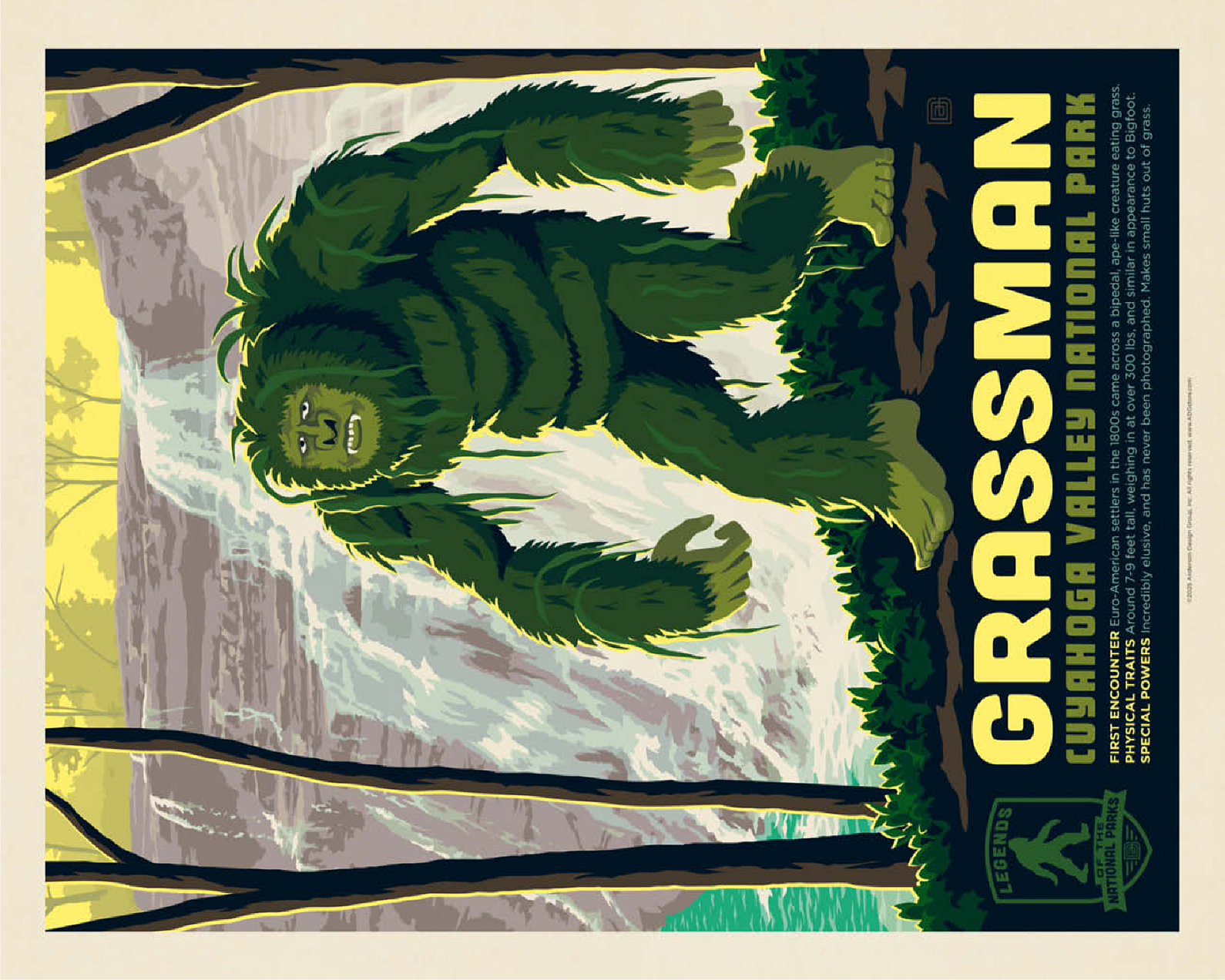 The Grassman is an Ohio-based cryptid often compared to Bigfoot, said to inhabit the dense forests of Cuyahoga Valley National Park. First reported by Euro-American settlers in the 1800s, this mysterious creature is described as a large, bipedal ape-like figure, standing between 7 to 9 feet tall and weighing over 300 pounds. Unlike other Sasquatch legends, the Grassman is noted for its thick, grass-covered fur and its ability to build small huts out of grass, adding to its mystique. Incredibly elusive, no confirmed photographs exist, making it one of the most intriguing creatures in American folklore. This vintage-style illustration captures the eerie presence of the Grassman emerging from the wilderness, set against the backdrop of a stunning waterfall in Cuyahoga Valley. A perfect piece for cryptid enthusiasts, Bigfoot hunters, and lovers of national park legends, this artwork brings a local legend to life.