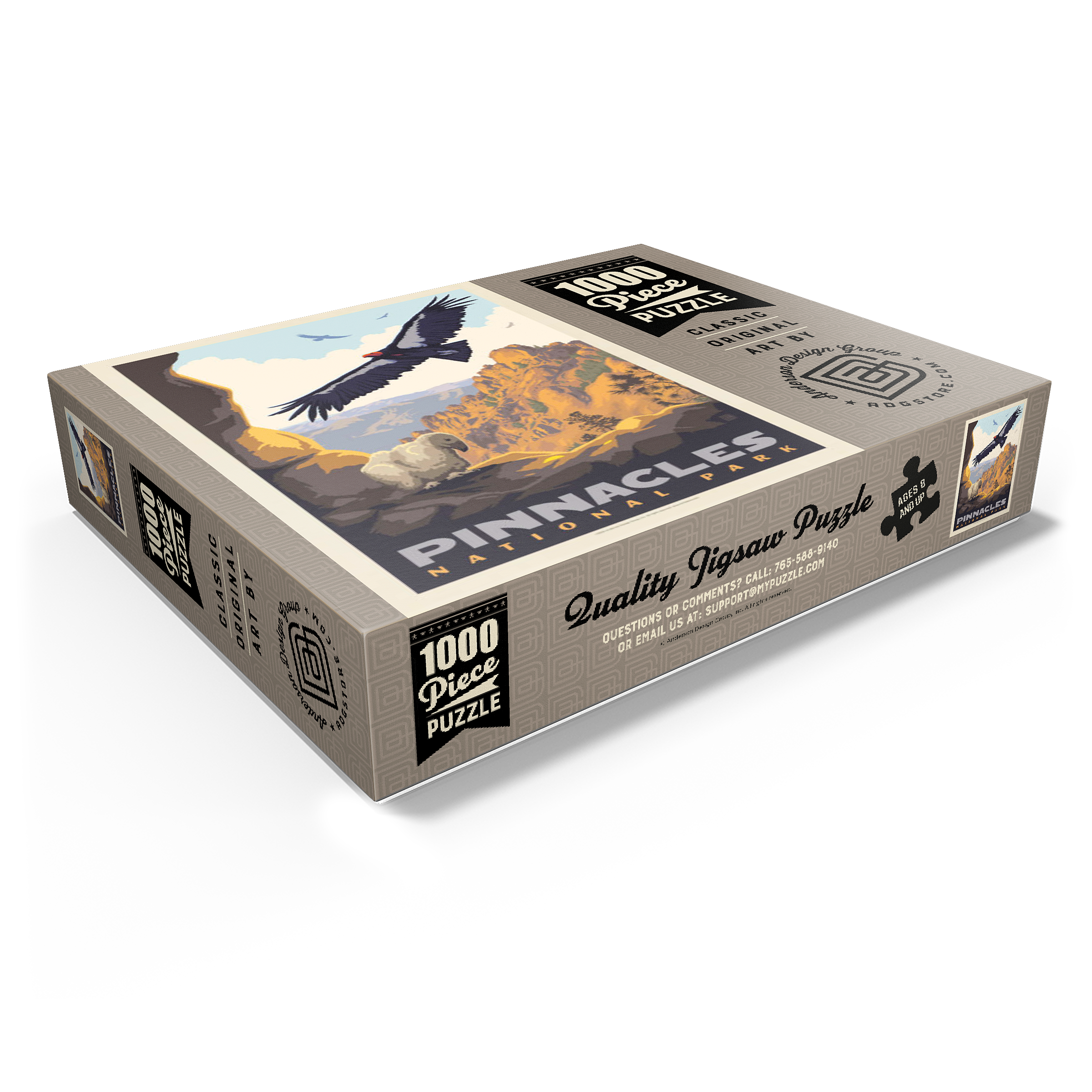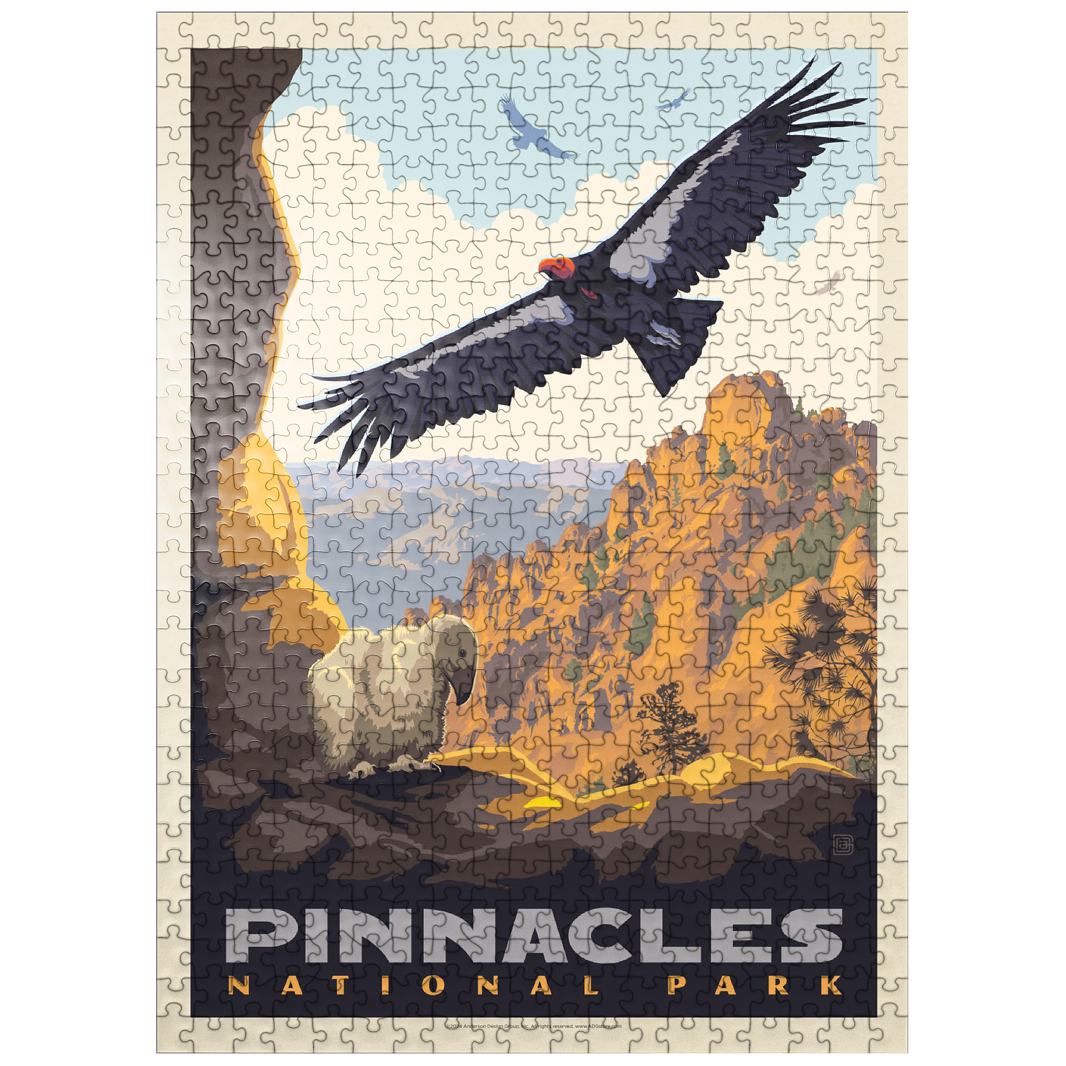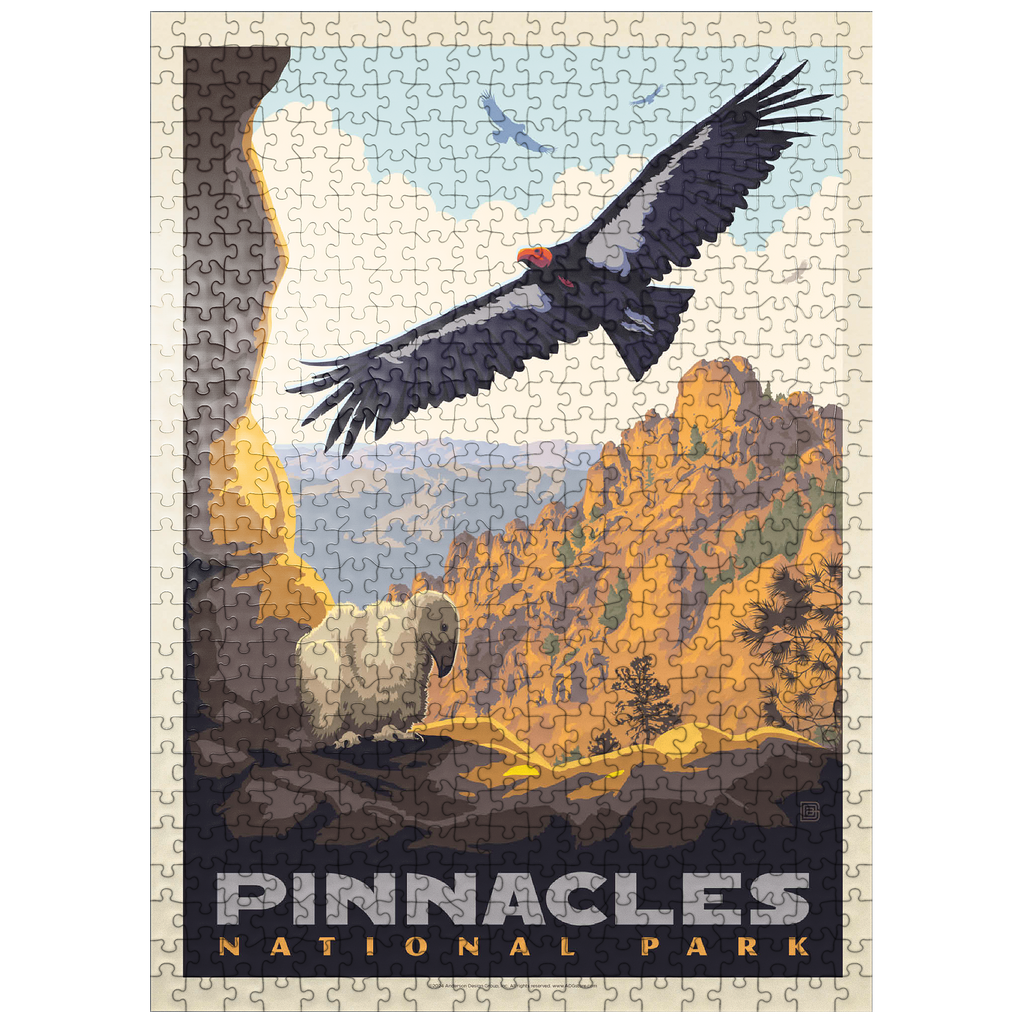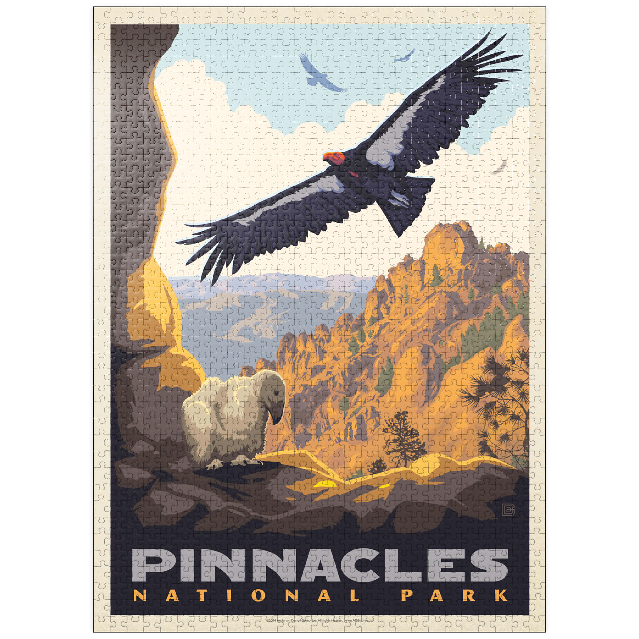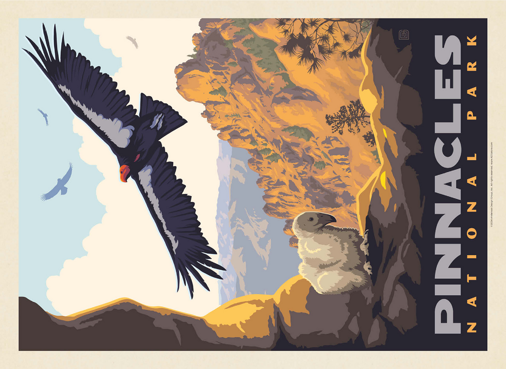 This artwork showcases the majestic California condors soaring over the rugged landscape of Pinnacles National Park. One condor glides through the clear sky, while a young condor perches on a rocky ledge, surrounded by the park's striking orange-hued rock formations. The expansive view of the canyon and distant mountains highlights the park's dramatic beauty, while the soaring condors symbolize freedom and the preservation of wildlife in this unique environment.