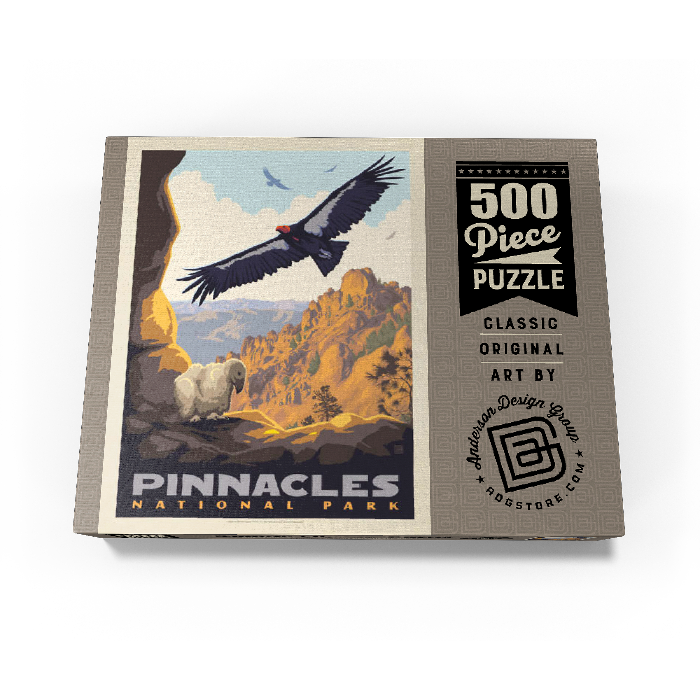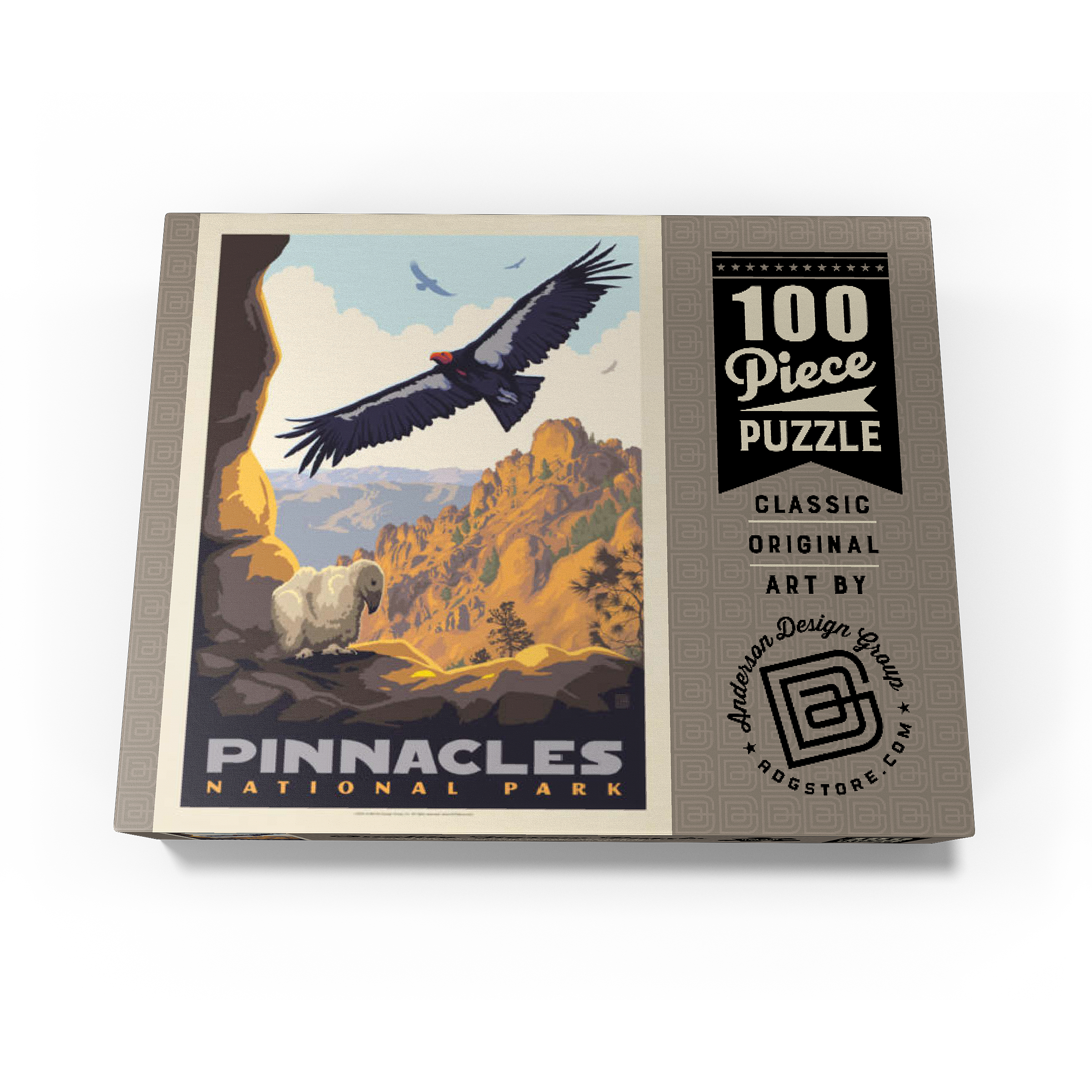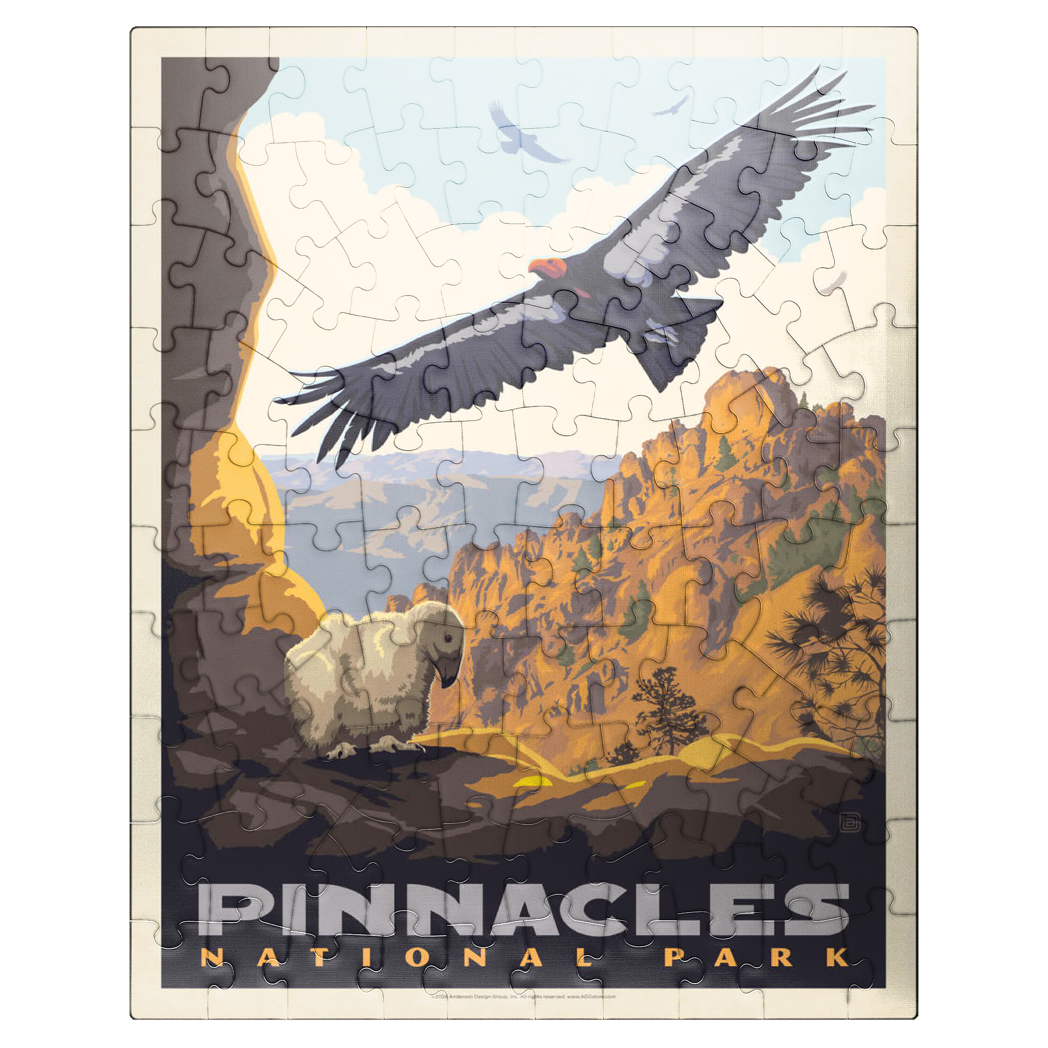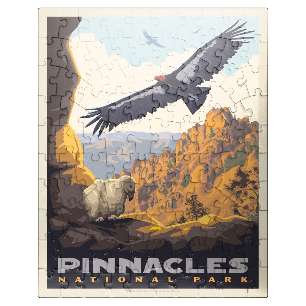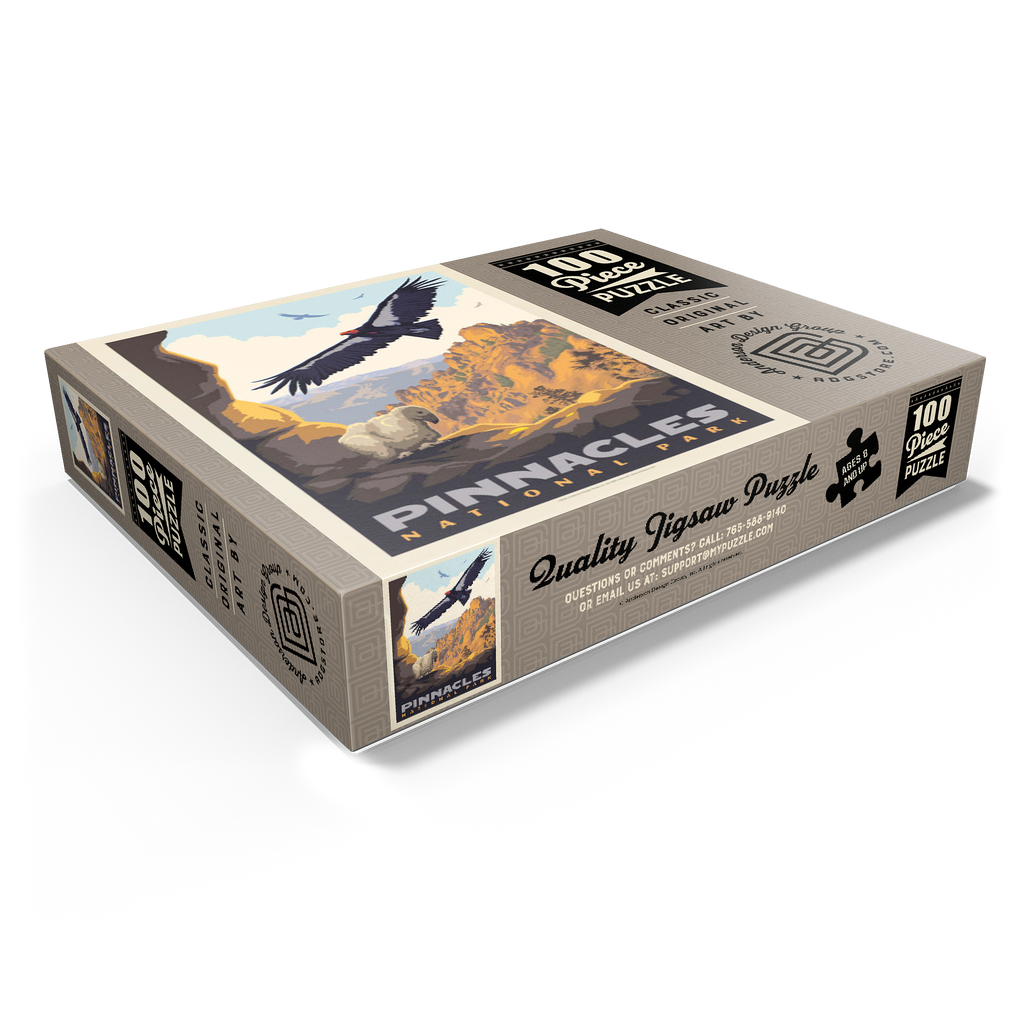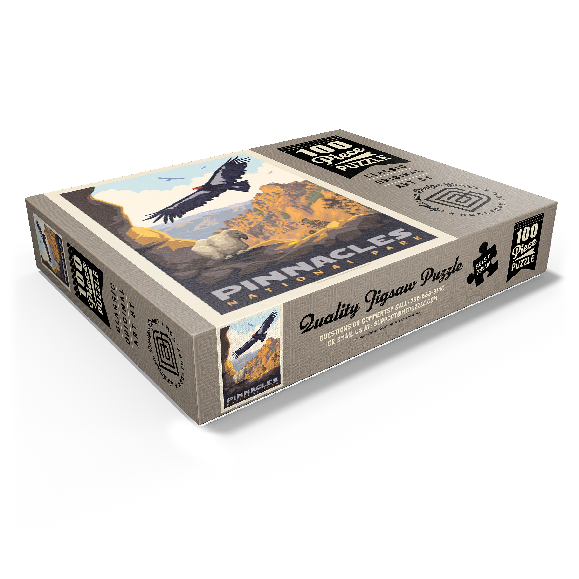 This artwork showcases the majestic California condors soaring over the rugged landscape of Pinnacles National Park. One condor glides through the clear sky, while a young condor perches on a rocky ledge, surrounded by the park's striking orange-hued rock formations. The expansive view of the canyon and distant mountains highlights the park's dramatic beauty, while the soaring condors symbolize freedom and the preservation of wildlife in this unique environment.