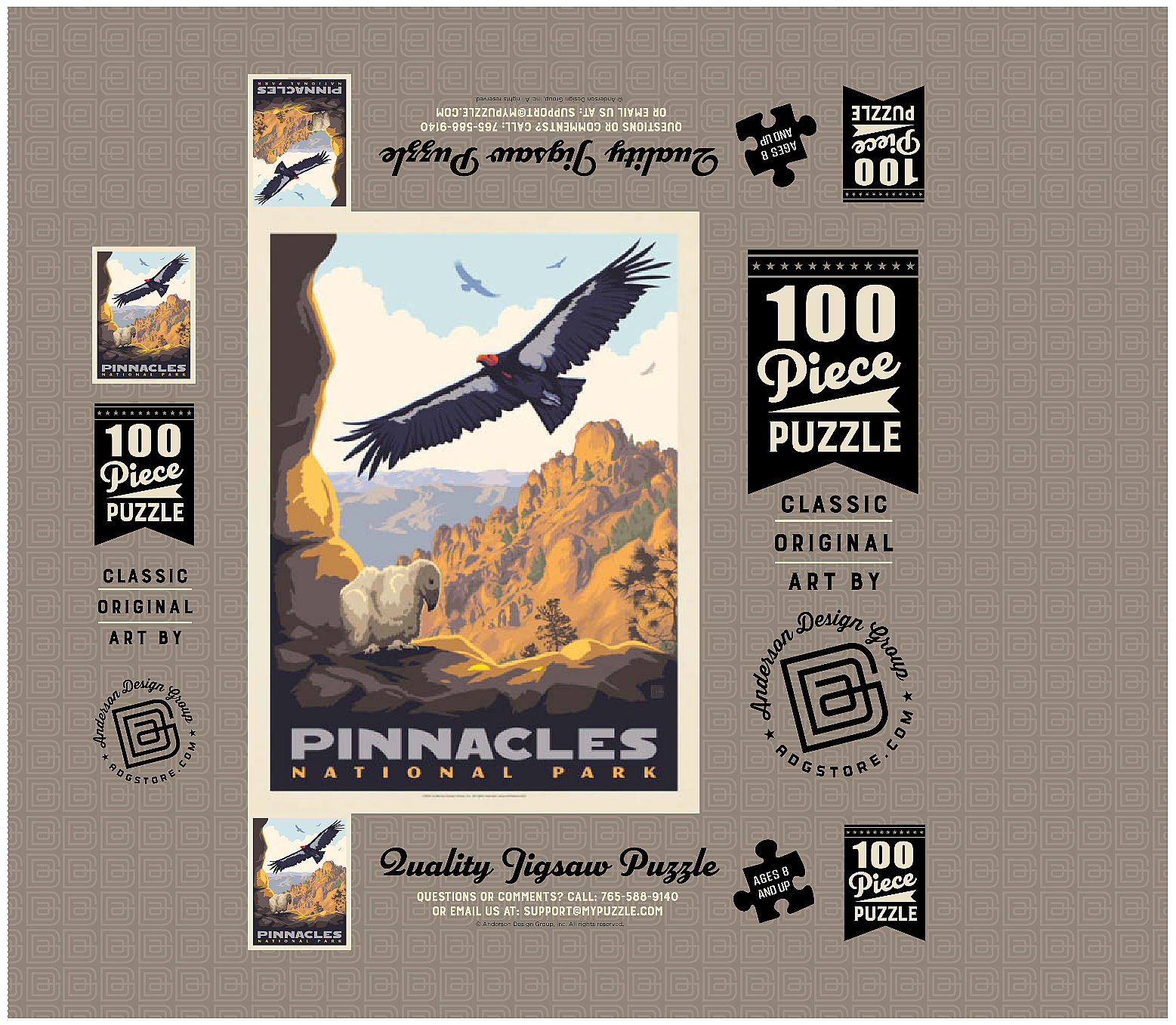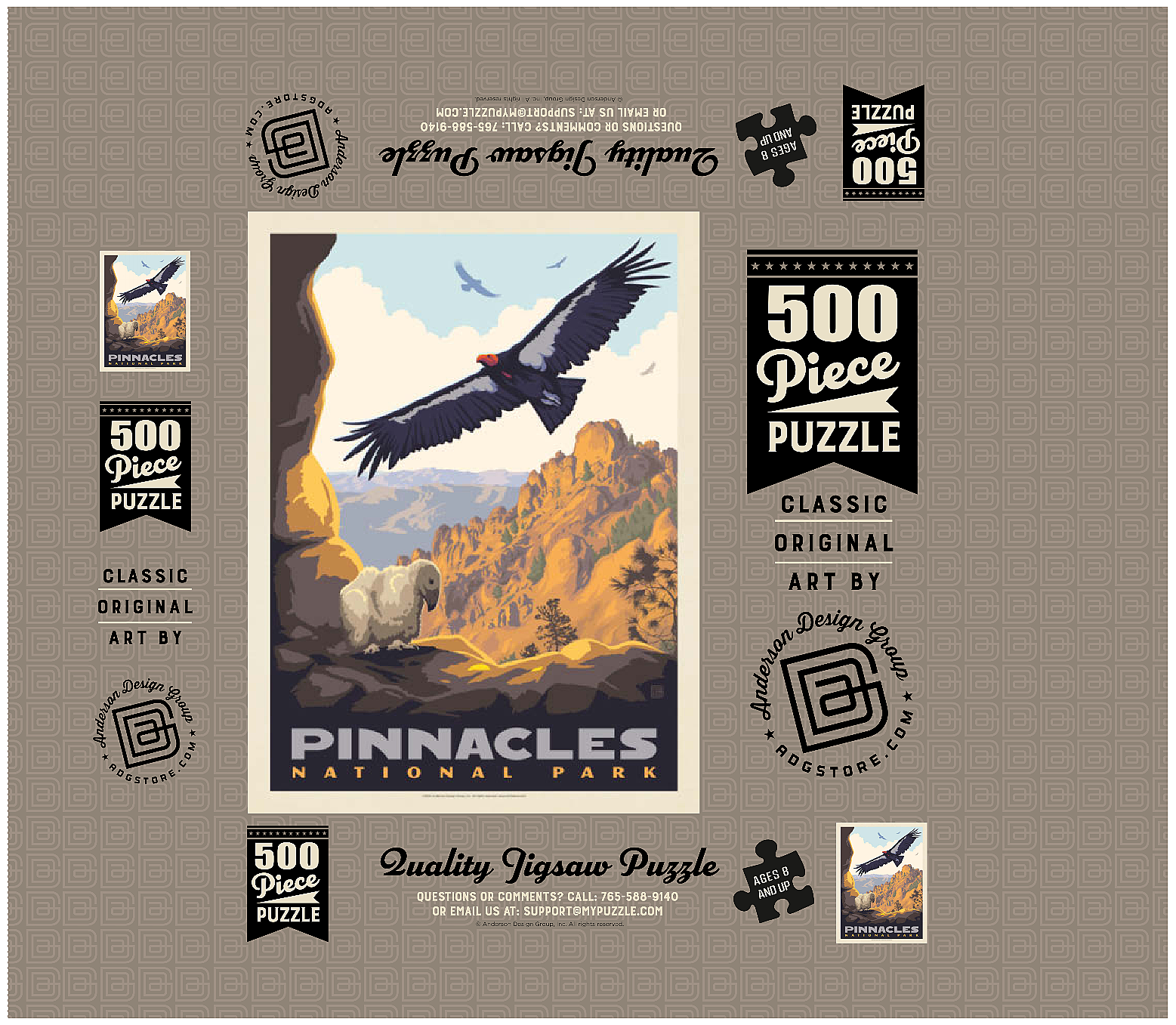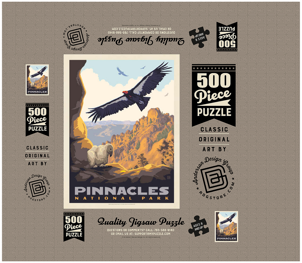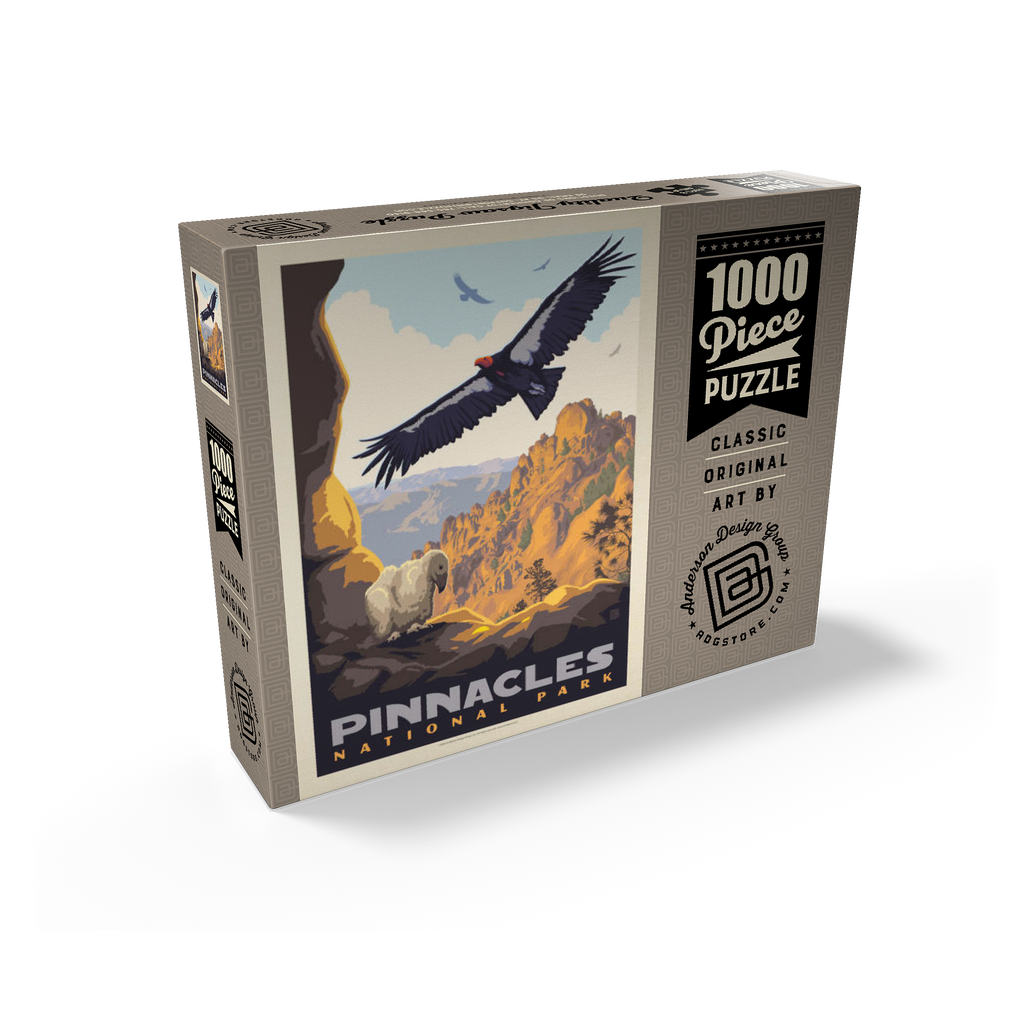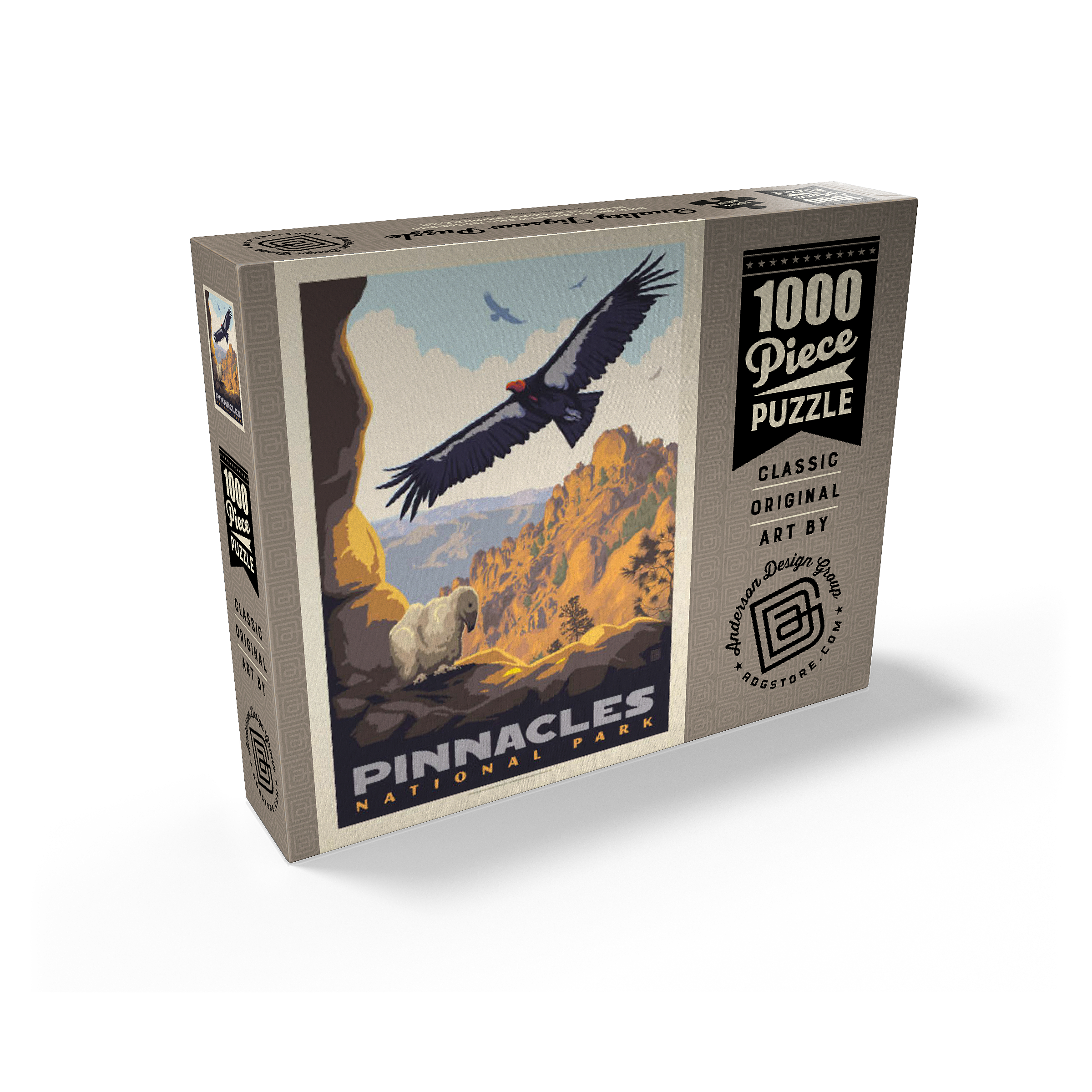 This artwork showcases the majestic California condors soaring over the rugged landscape of Pinnacles National Park. One condor glides through the clear sky, while a young condor perches on a rocky ledge, surrounded by the park's striking orange-hued rock formations. The expansive view of the canyon and distant mountains highlights the park's dramatic beauty, while the soaring condors symbolize freedom and the preservation of wildlife in this unique environment.
