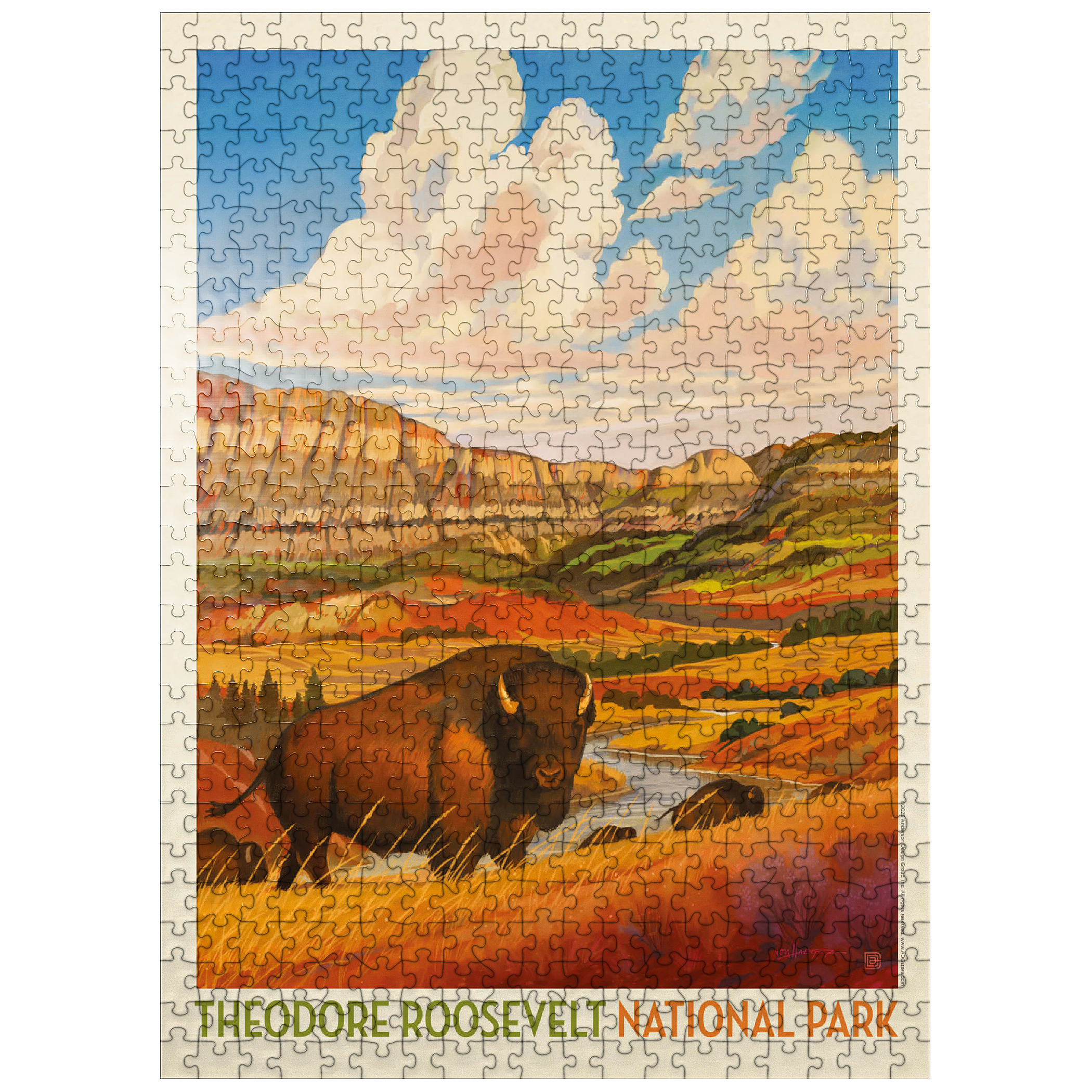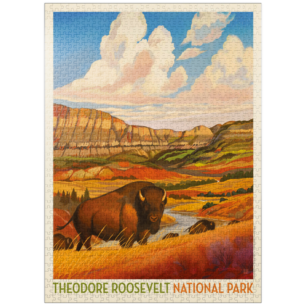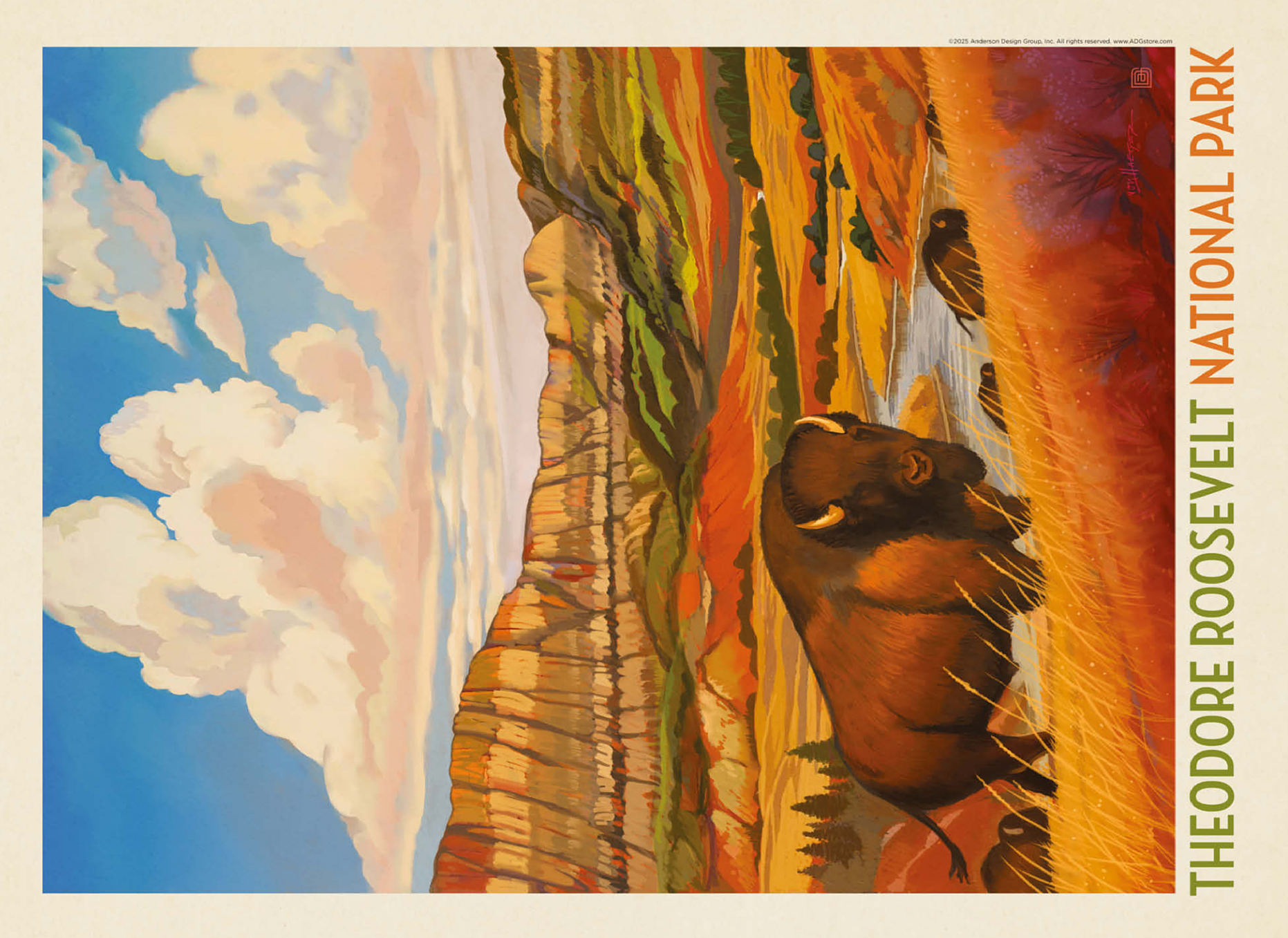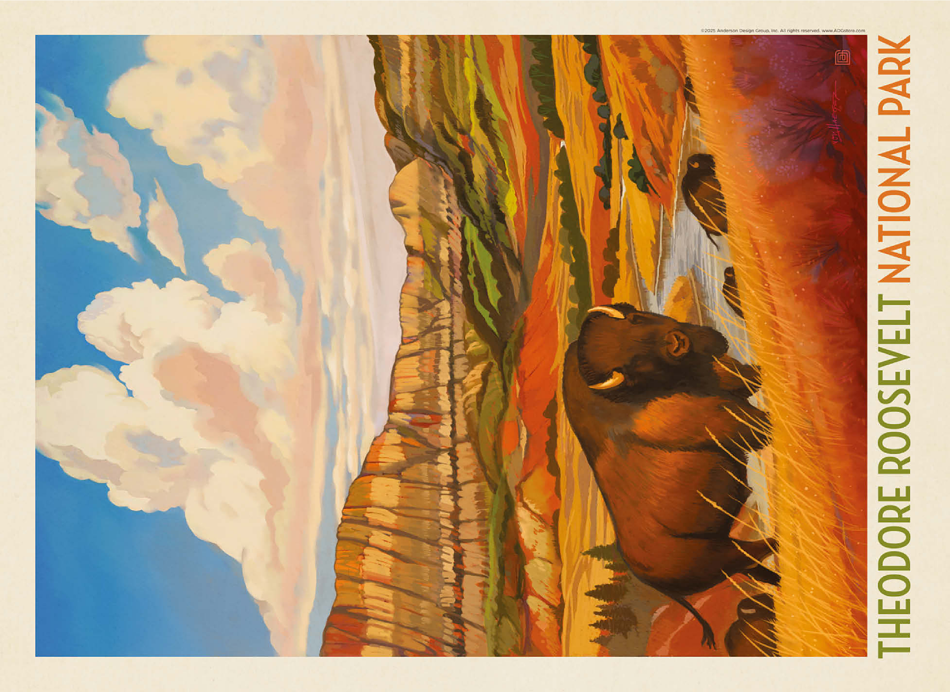 Theodore Roosevelt National Park in North Dakota is beautifully portrayed with a powerful bison standing beside a winding river beneath expansive skies. The layered cliffs of the Badlands rise in warm hues of red, gold, and ochre, creating a striking backdrop to the sweeping prairie. This depiction captures the rugged spirit of the American West, where wild bison roam freely across vast open plains. The soft sunlight and dramatic clouds emphasize the park's natural grandeur and its deep connection to conservation history. This artistic portrayal celebrates the wild beauty and timeless heritage of Theodore Roosevelt National Park.