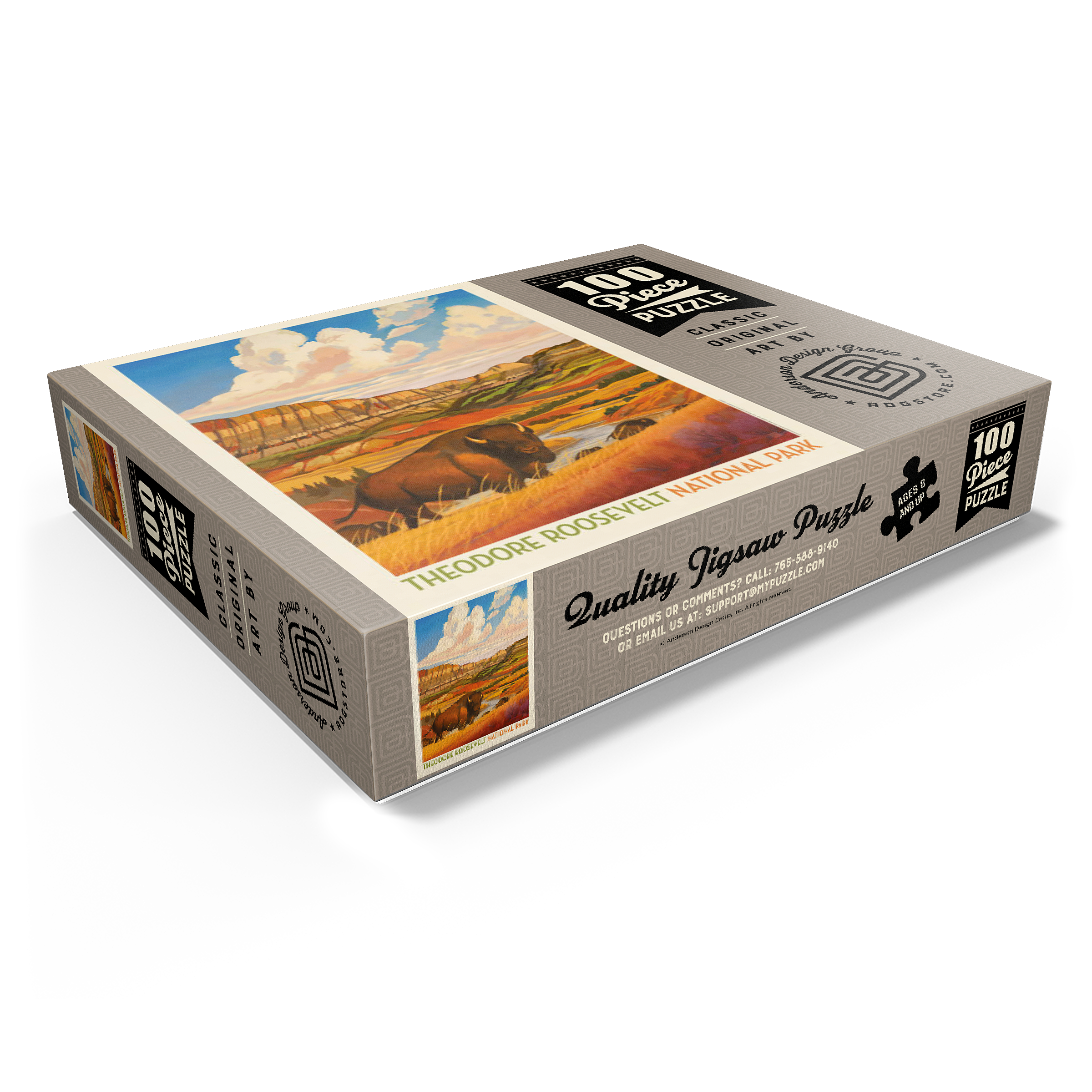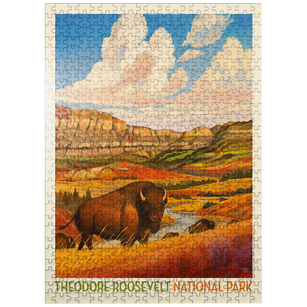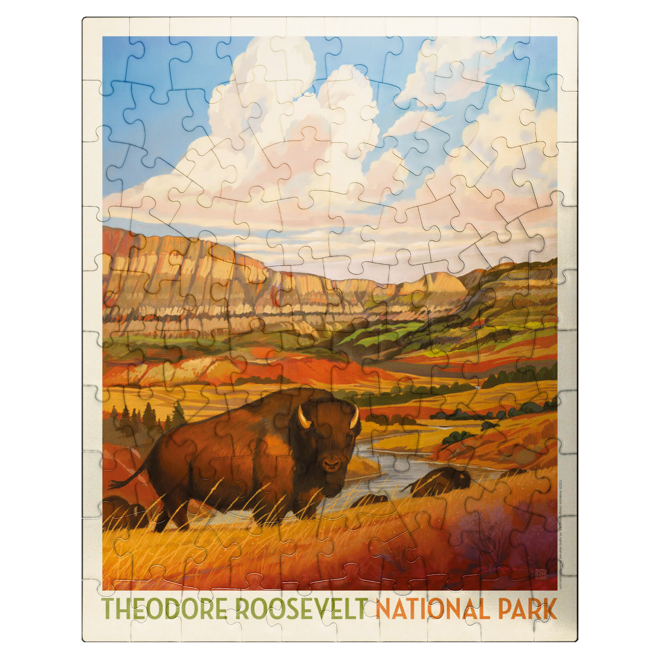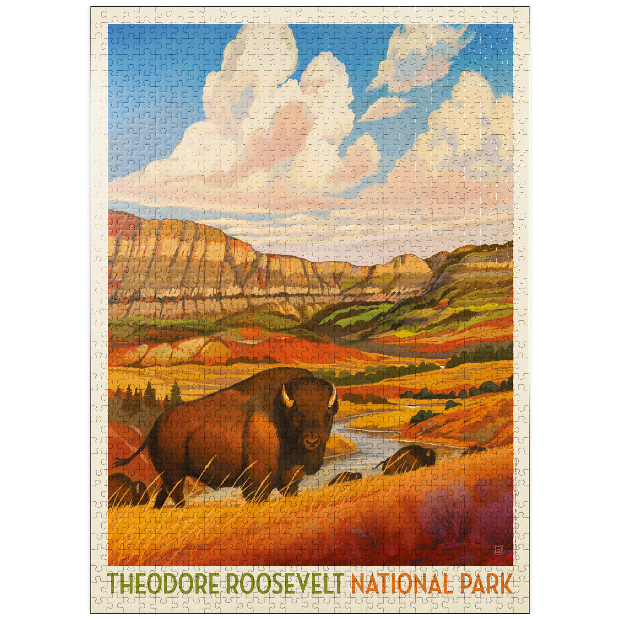 Theodore Roosevelt National Park in North Dakota is beautifully portrayed with a powerful bison standing beside a winding river beneath expansive skies. The layered cliffs of the Badlands rise in warm hues of red, gold, and ochre, creating a striking backdrop to the sweeping prairie. This depiction captures the rugged spirit of the American West, where wild bison roam freely across vast open plains. The soft sunlight and dramatic clouds emphasize the park's natural grandeur and its deep connection to conservation history. This artistic portrayal celebrates the wild beauty and timeless heritage of Theodore Roosevelt National Park.