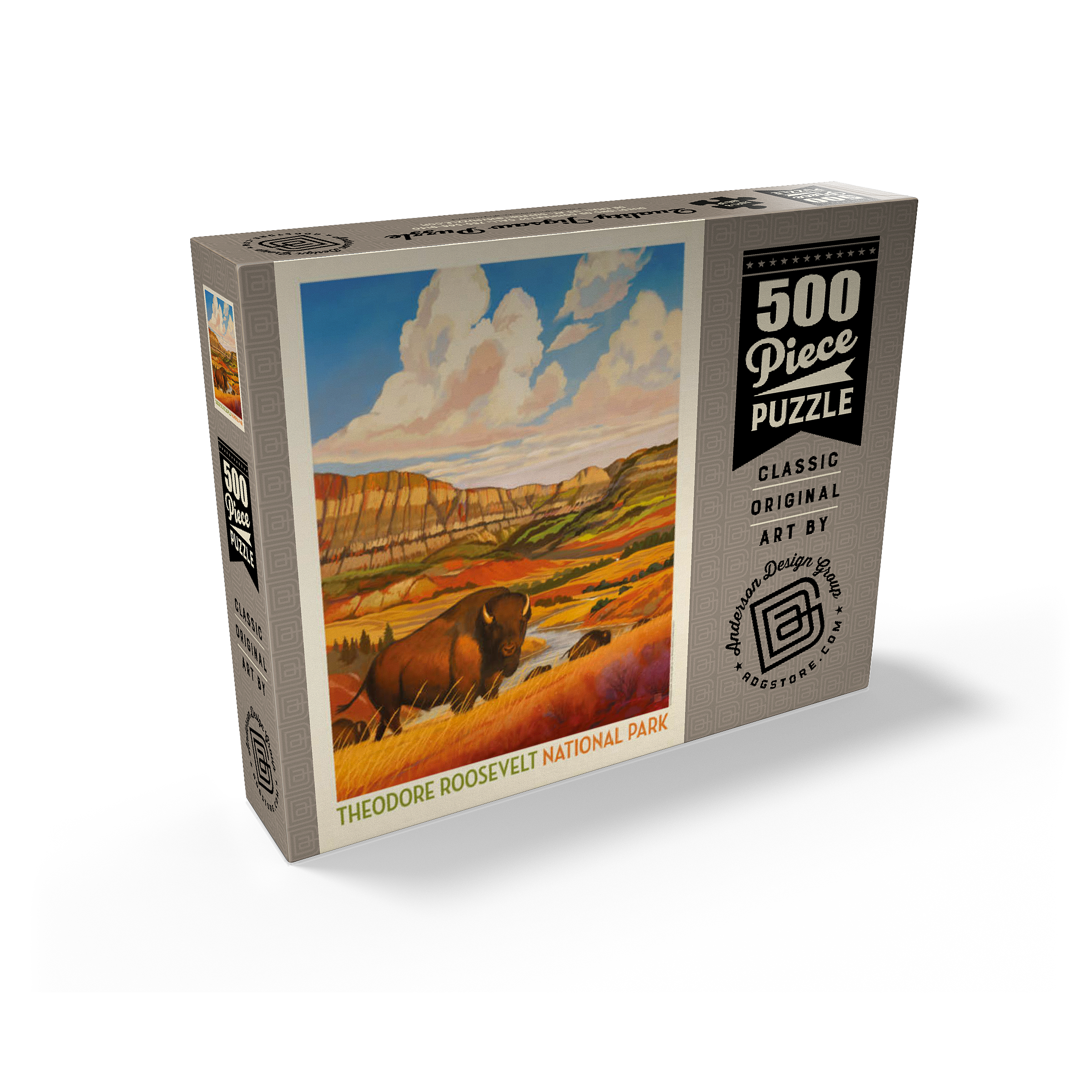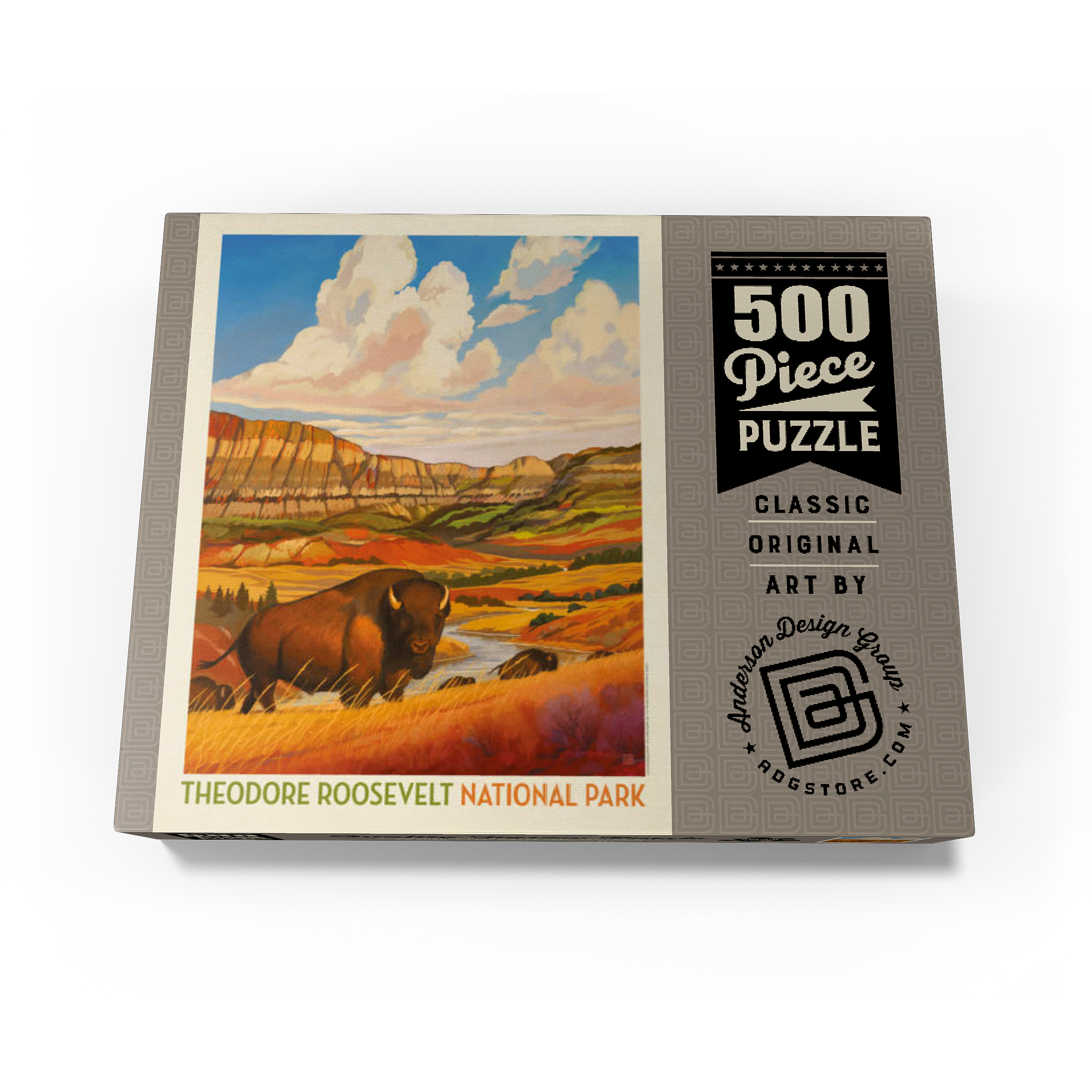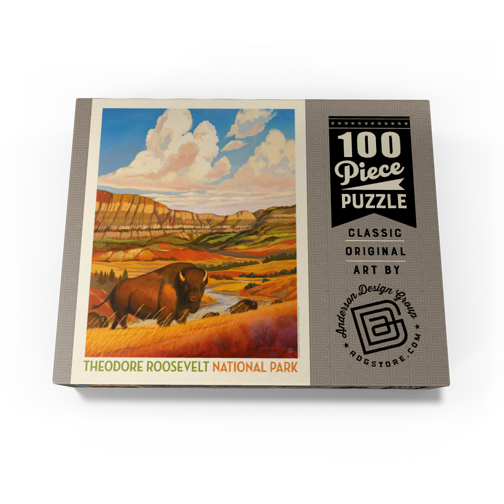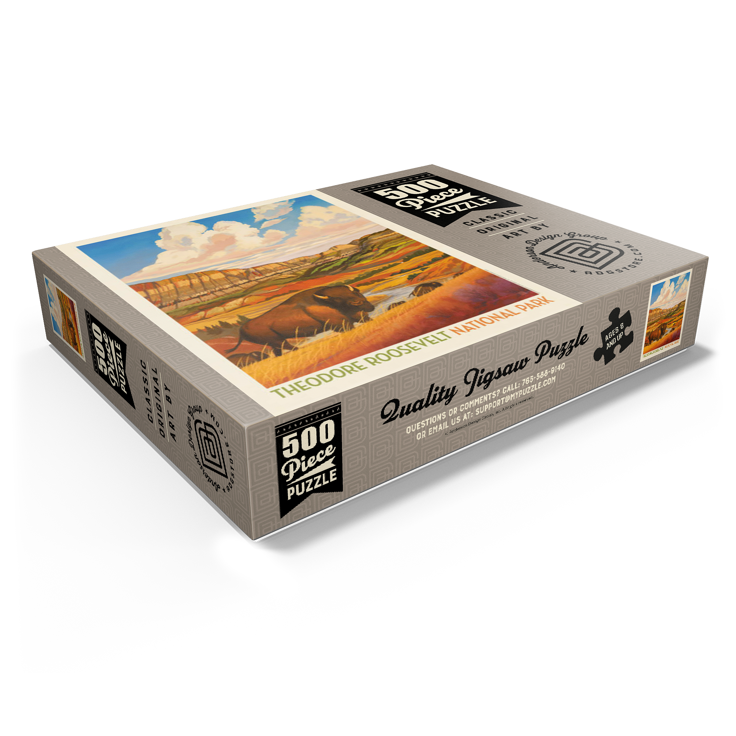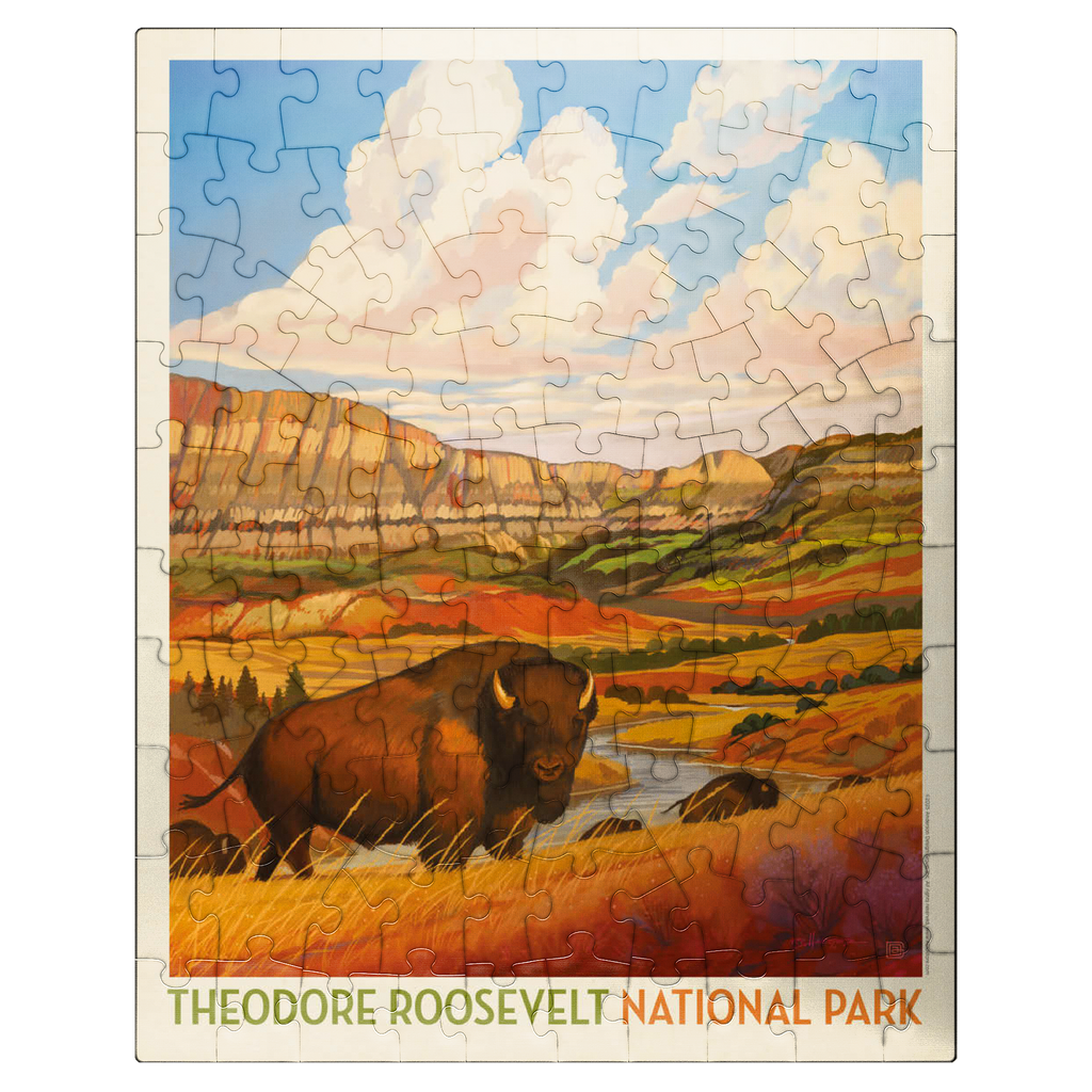 Theodore Roosevelt National Park in North Dakota is beautifully portrayed with a powerful bison standing beside a winding river beneath expansive skies. The layered cliffs of the Badlands rise in warm hues of red, gold, and ochre, creating a striking backdrop to the sweeping prairie. This depiction captures the rugged spirit of the American West, where wild bison roam freely across vast open plains. The soft sunlight and dramatic clouds emphasize the park's natural grandeur and its deep connection to conservation history. This artistic portrayal celebrates the wild beauty and timeless heritage of Theodore Roosevelt National Park.