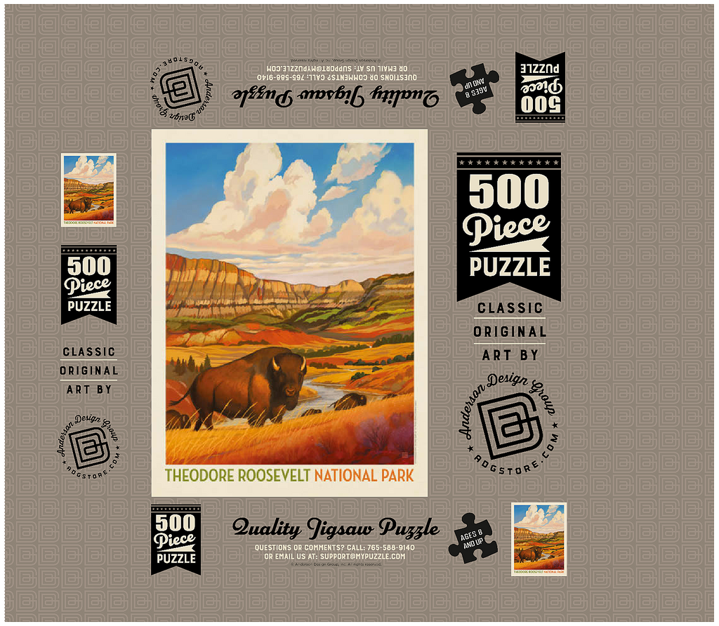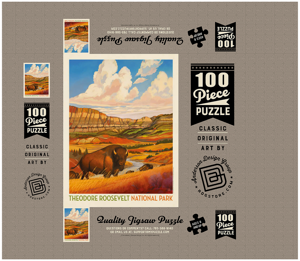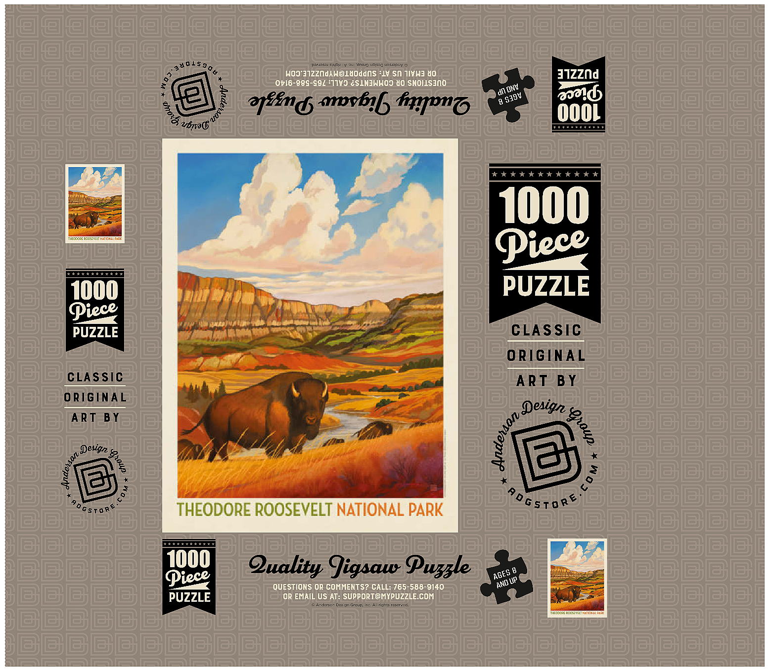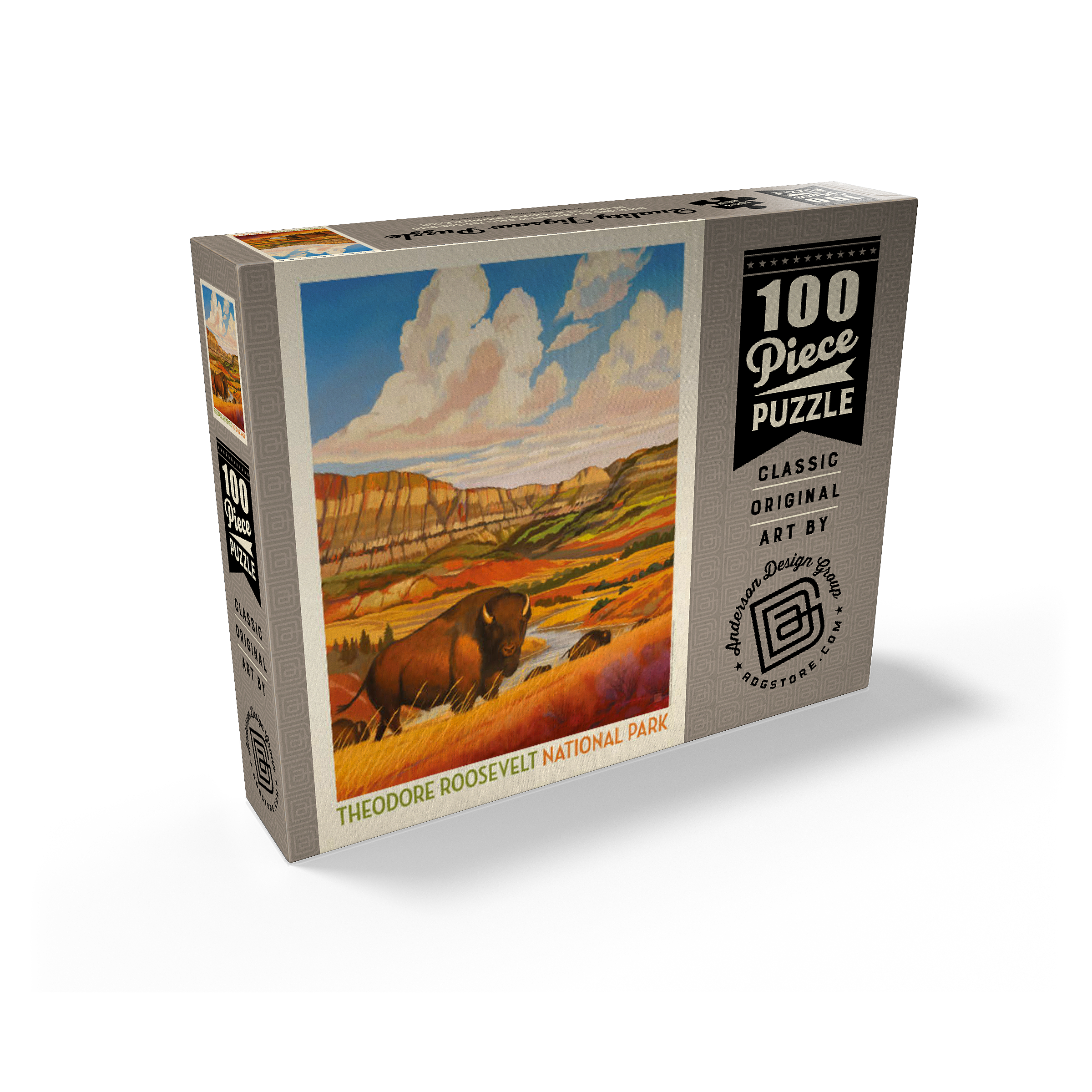 Theodore Roosevelt National Park in North Dakota is beautifully portrayed with a powerful bison standing beside a winding river beneath expansive skies. The layered cliffs of the Badlands rise in warm hues of red, gold, and ochre, creating a striking backdrop to the sweeping prairie. This depiction captures the rugged spirit of the American West, where wild bison roam freely across vast open plains. The soft sunlight and dramatic clouds emphasize the park's natural grandeur and its deep connection to conservation history. This artistic portrayal celebrates the wild beauty and timeless heritage of Theodore Roosevelt National Park.