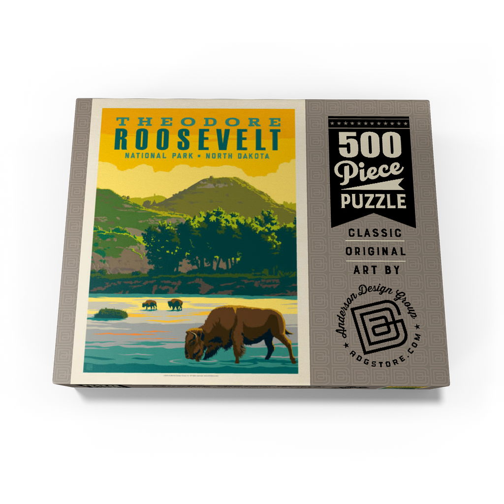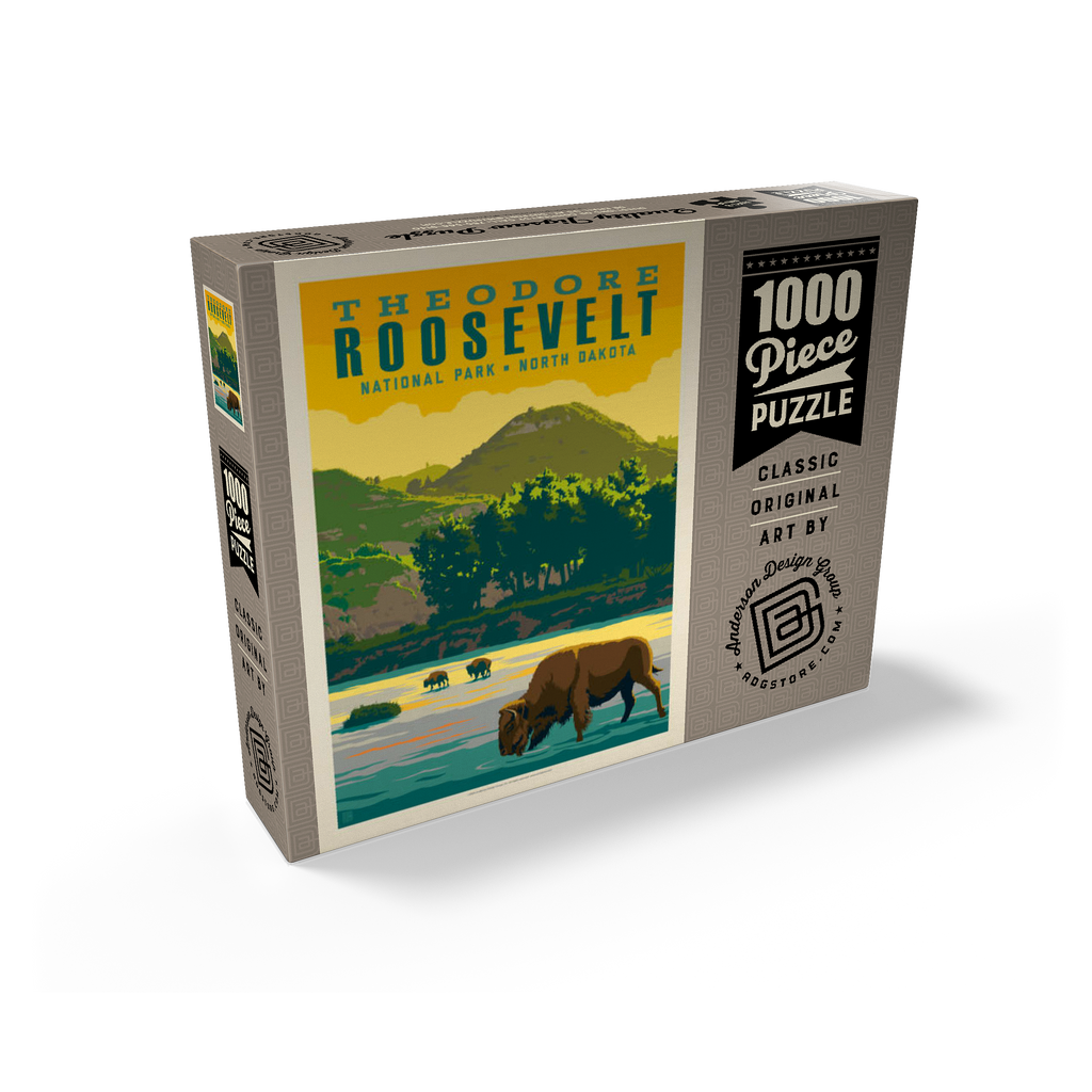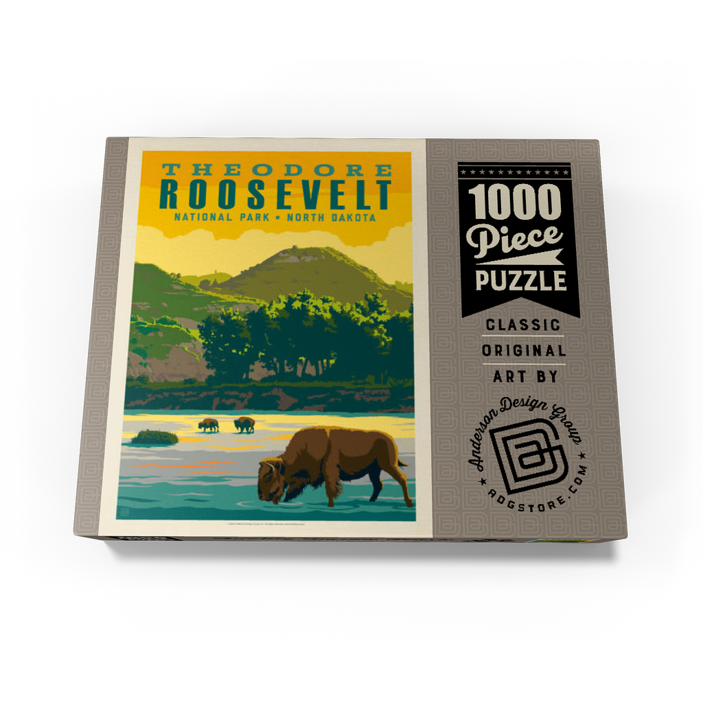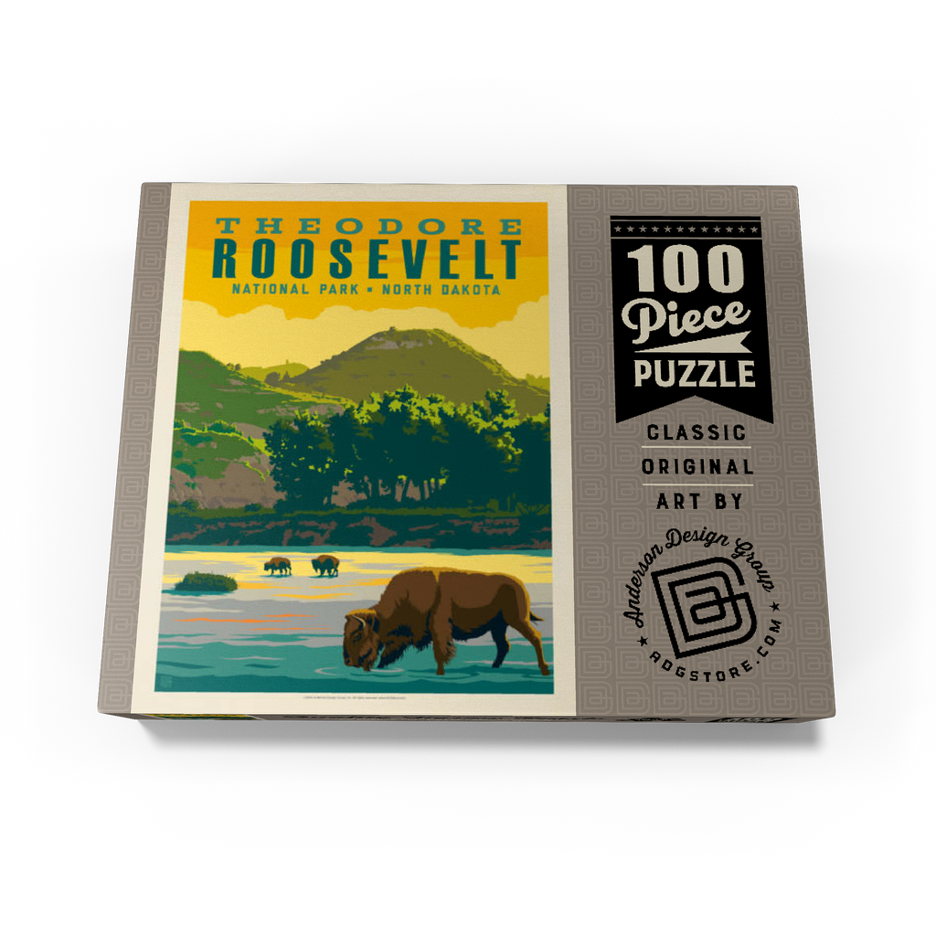 This scene from Theodore Roosevelt National Park highlights the majestic bison roaming the riverbanks at sunset. A large bison wades through the shallow water in the foreground, while two more can be seen grazing in the distance, framed by the rolling hills and lush trees of the park. The golden hues of the setting sun cast a warm glow across the landscape, reflecting off the water and creating a serene yet powerful representation of the park's wildlife and natural beauty.