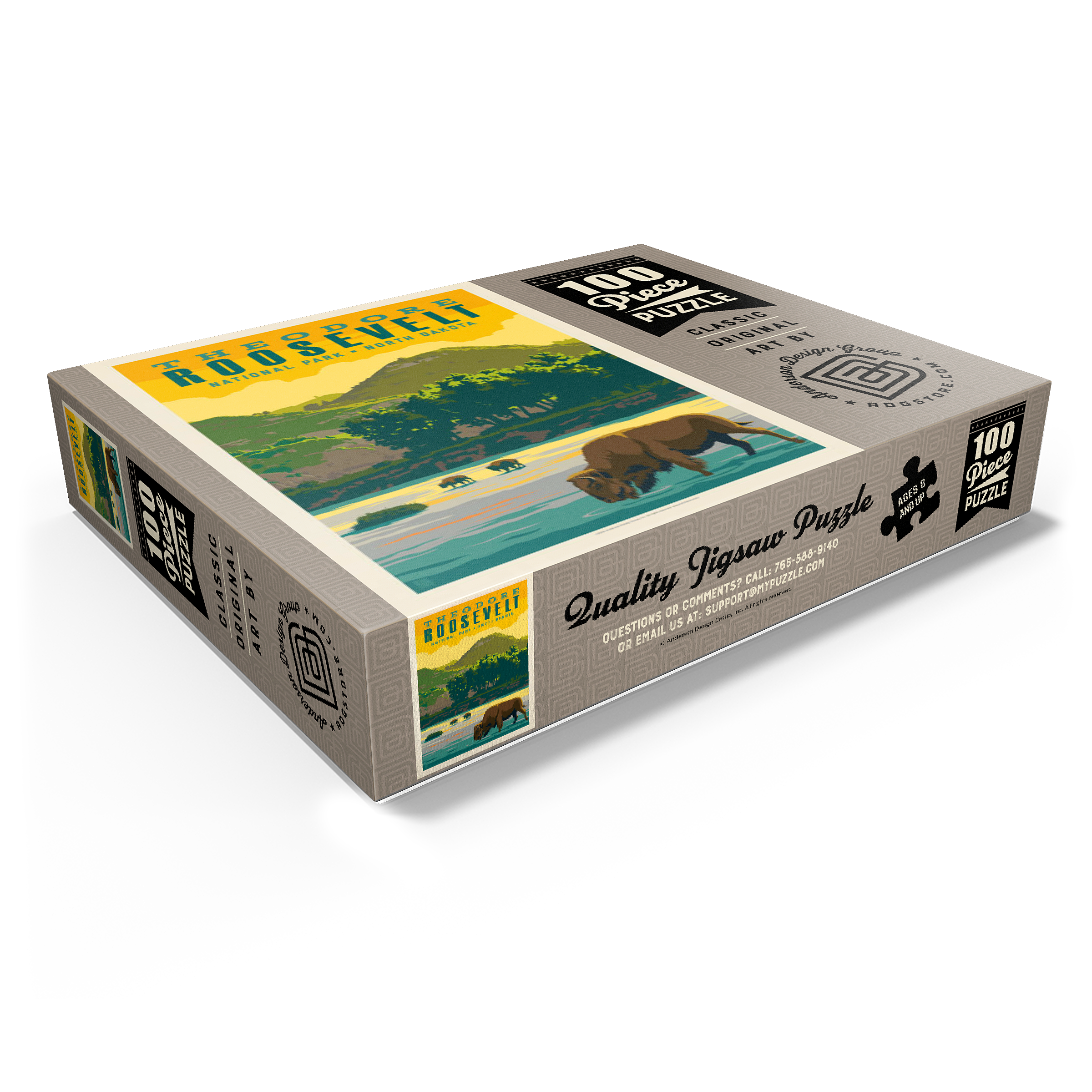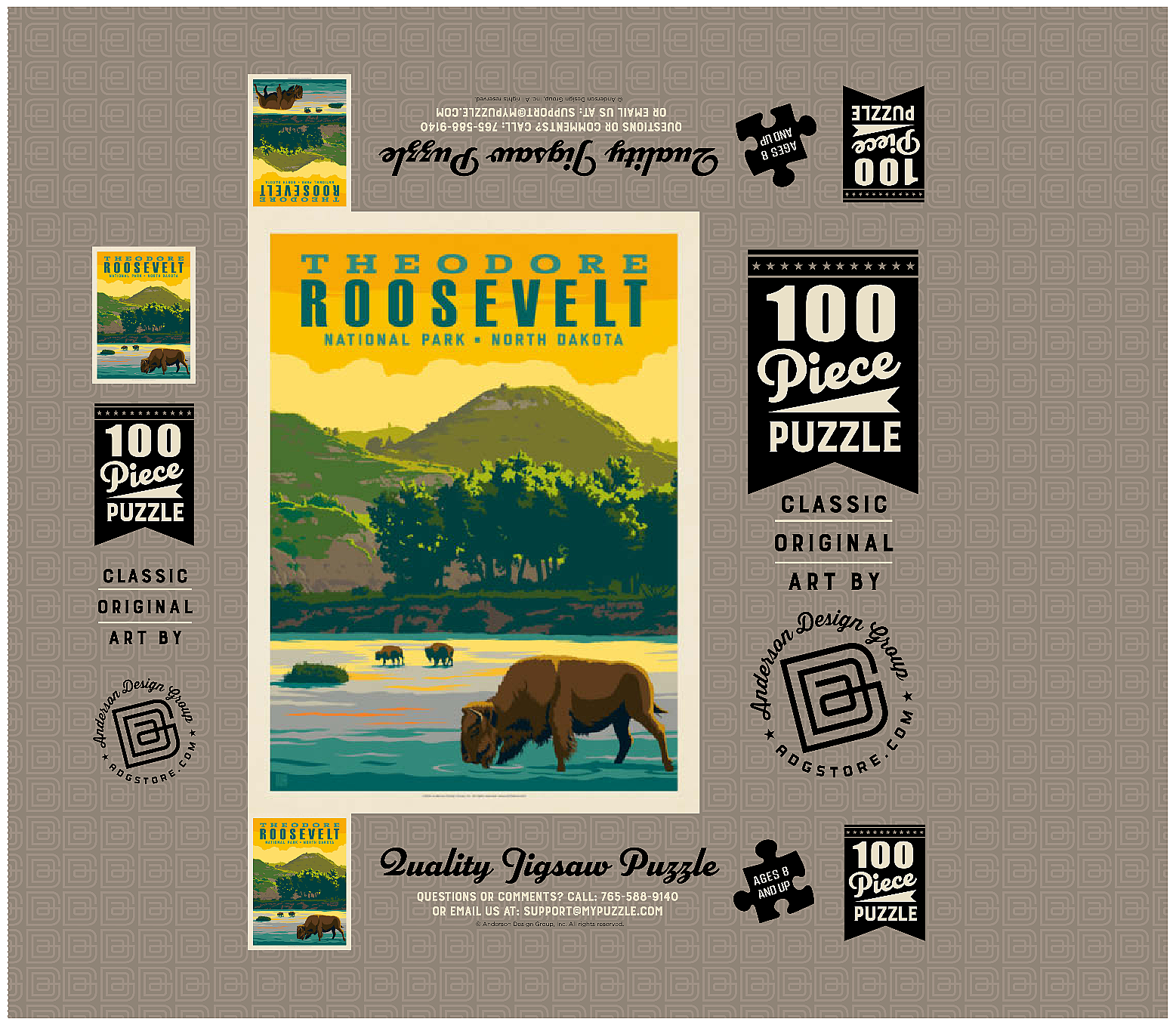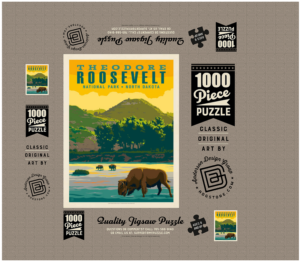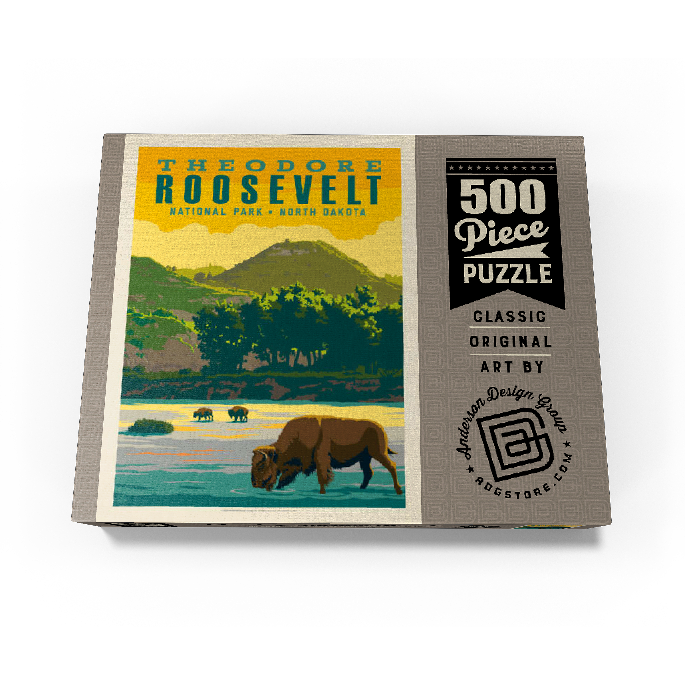 This scene from Theodore Roosevelt National Park highlights the majestic bison roaming the riverbanks at sunset. A large bison wades through the shallow water in the foreground, while two more can be seen grazing in the distance, framed by the rolling hills and lush trees of the park. The golden hues of the setting sun cast a warm glow across the landscape, reflecting off the water and creating a serene yet powerful representation of the park's wildlife and natural beauty.