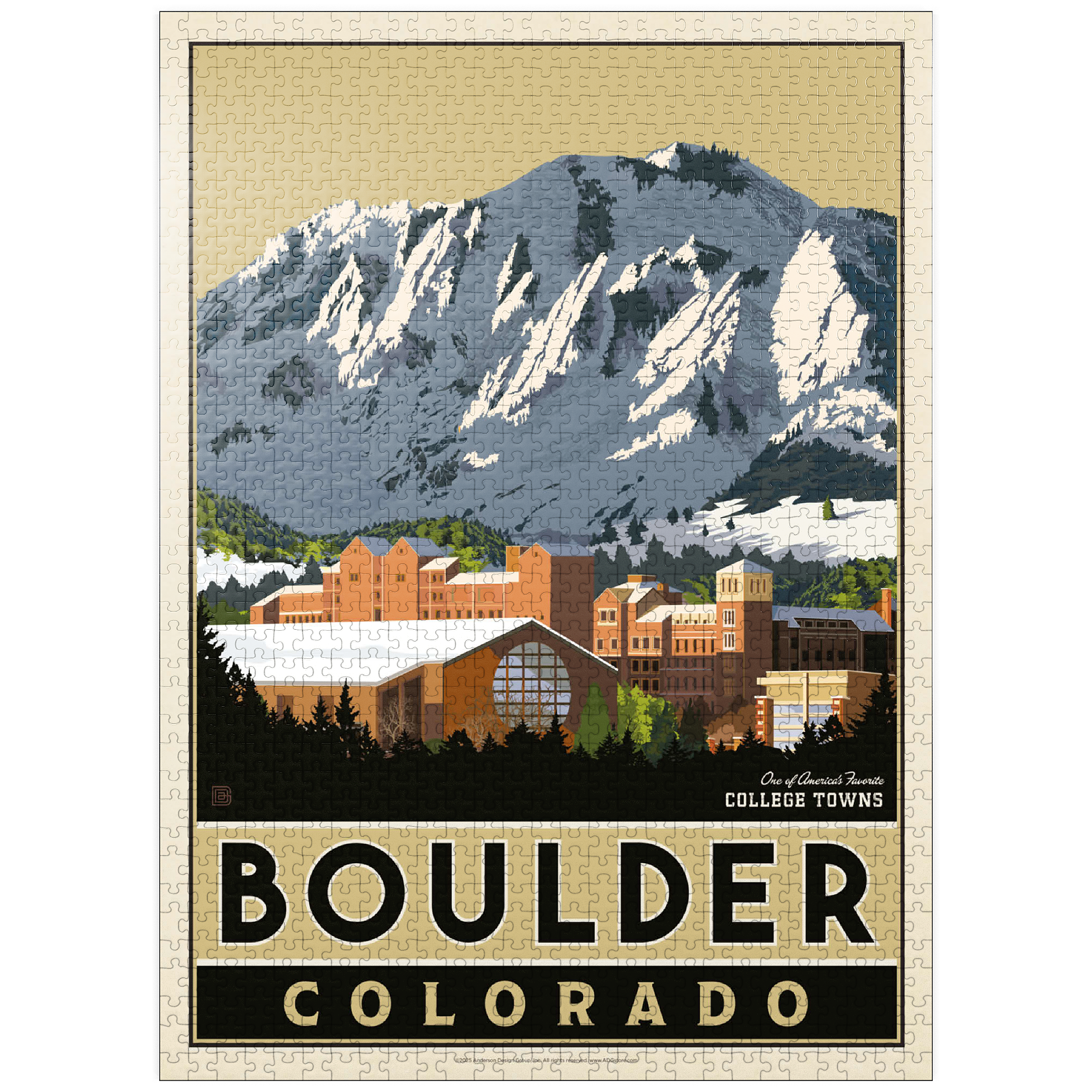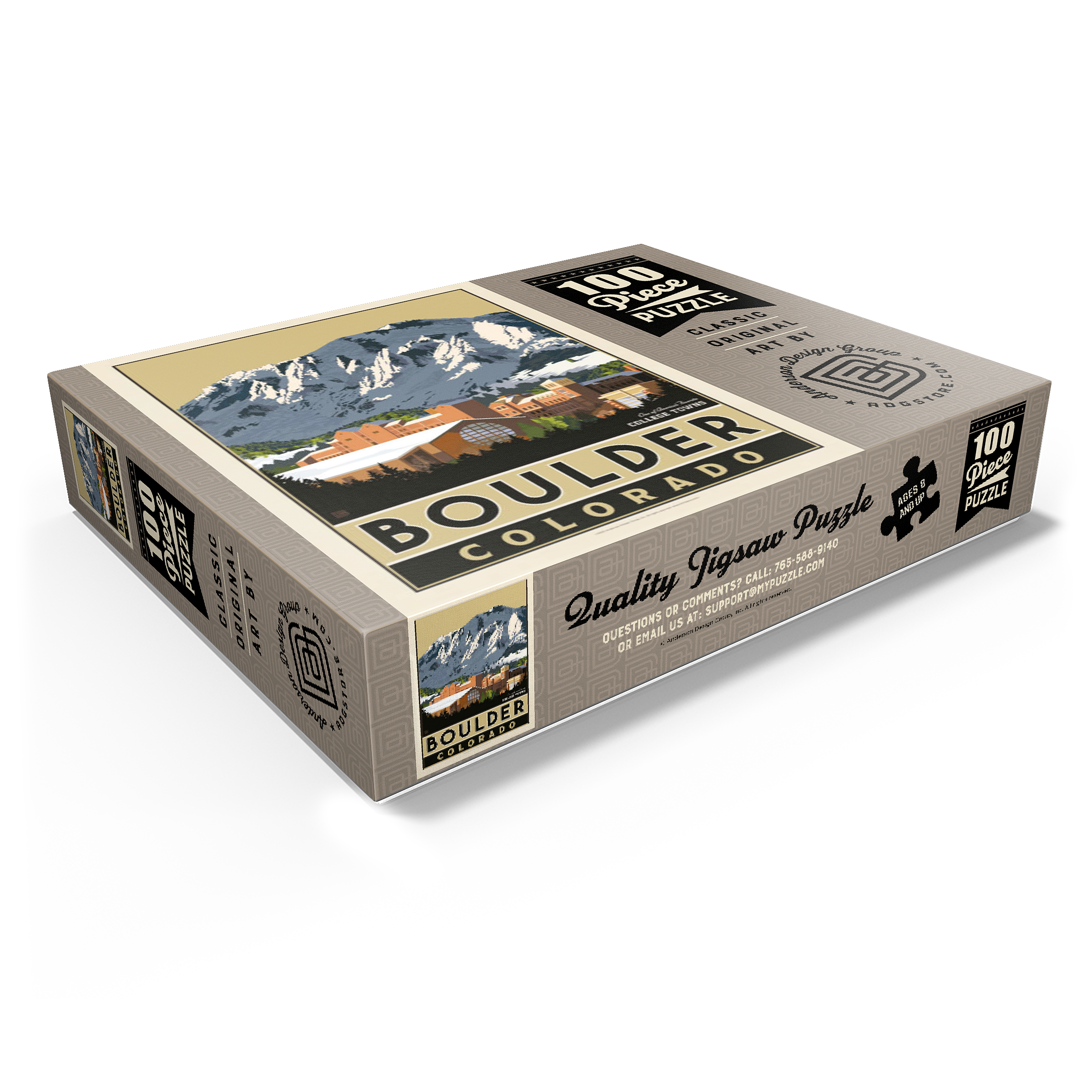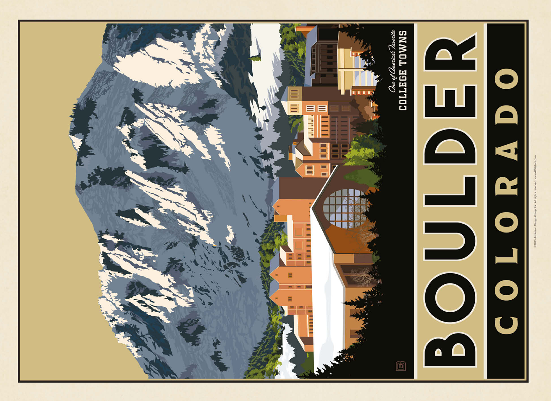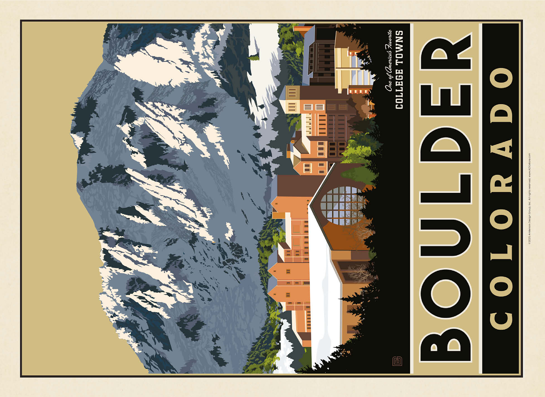 Boulder, Colorado, framed by the dramatic Flatirons, is beautifully illustrated in this artwork highlighting the University of Colorado campus against a stunning mountain backdrop. The snow-dusted peaks rise sharply above the terracotta rooftops and stone architecture, symbolizing the city's blend of natural beauty and academic energy. Known as one of America's favorite college towns, Boulder offers a unique mix of outdoor adventure, cultural vibrancy, and historic charm. This design captures the essence of the city's scenic setting in the Rocky Mountains, making it a timeless tribute to both the landscape and the university community.