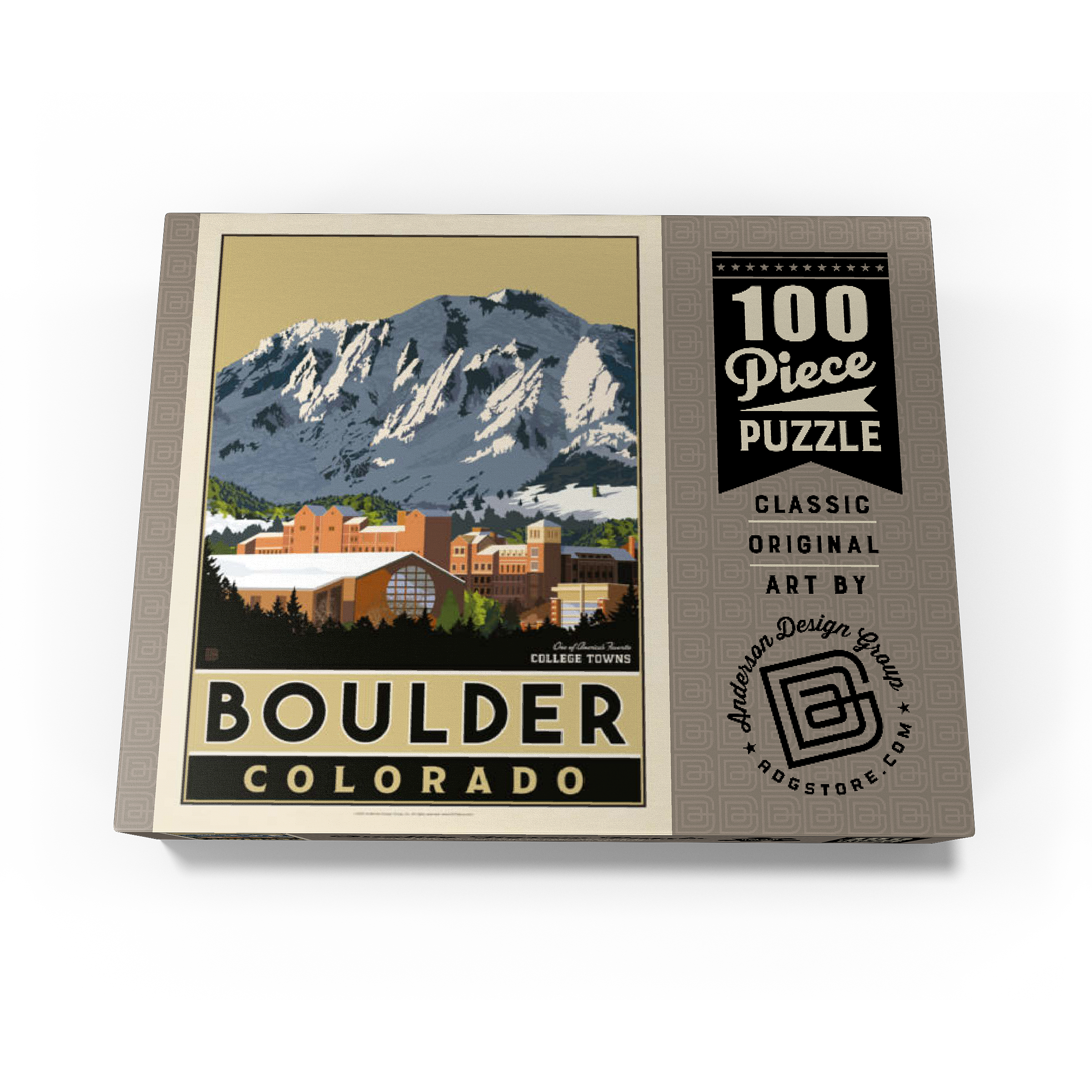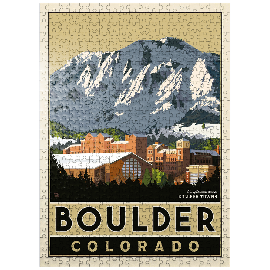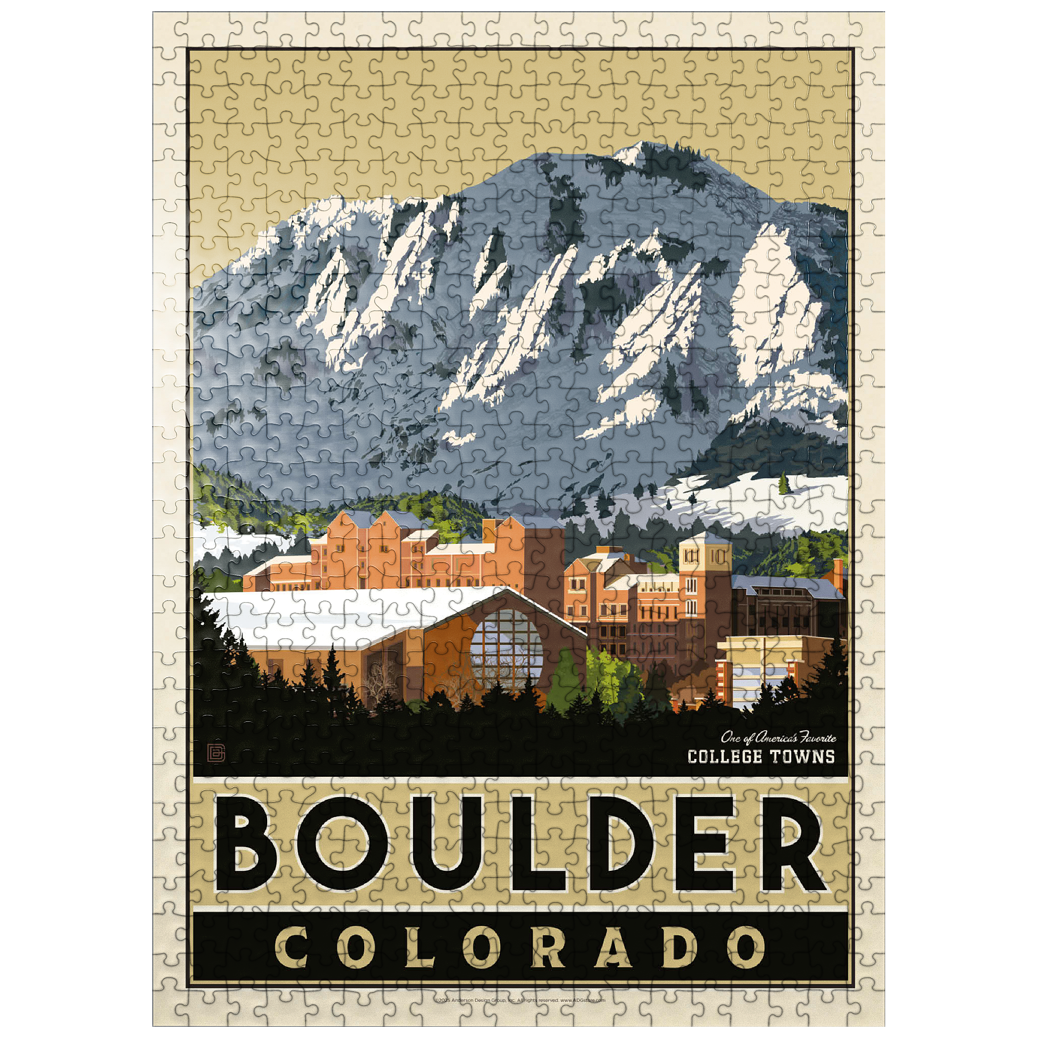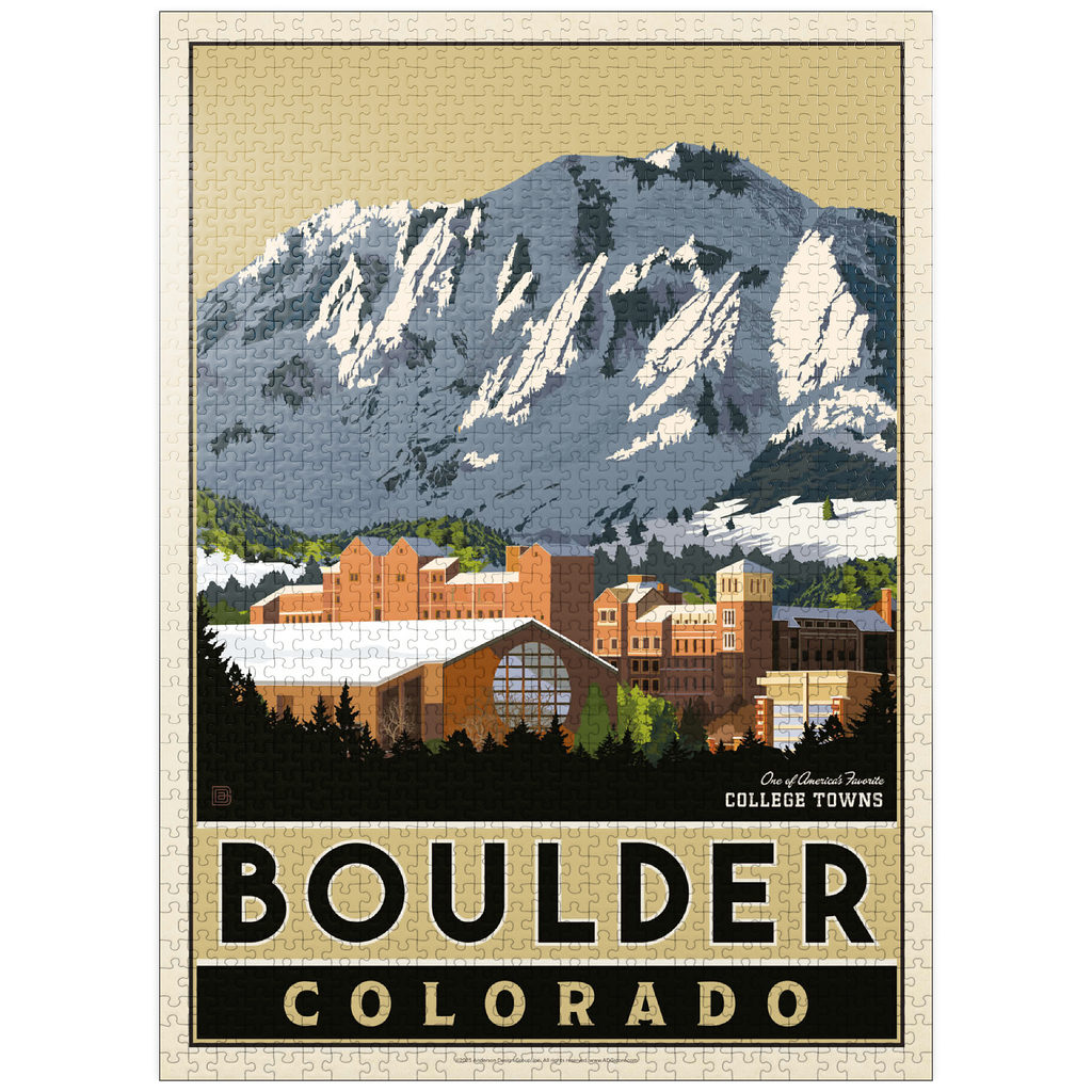 Boulder, Colorado, framed by the dramatic Flatirons, is beautifully illustrated in this artwork highlighting the University of Colorado campus against a stunning mountain backdrop. The snow-dusted peaks rise sharply above the terracotta rooftops and stone architecture, symbolizing the city's blend of natural beauty and academic energy. Known as one of America's favorite college towns, Boulder offers a unique mix of outdoor adventure, cultural vibrancy, and historic charm. This design captures the essence of the city's scenic setting in the Rocky Mountains, making it a timeless tribute to both the landscape and the university community.
