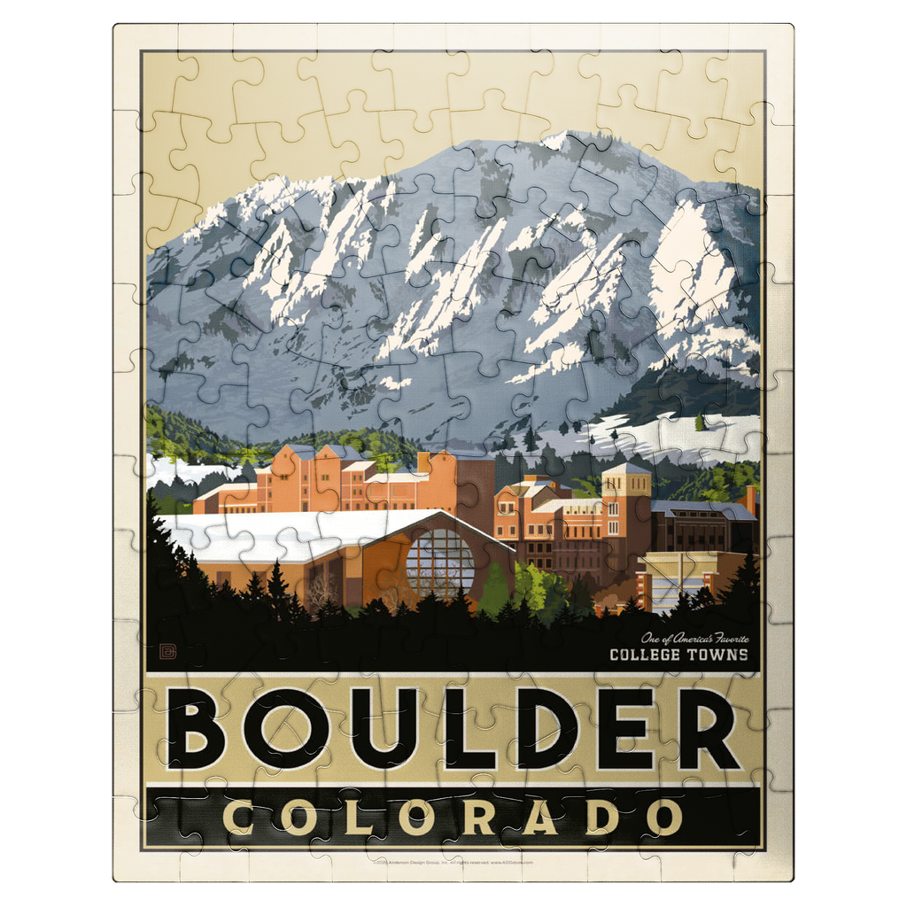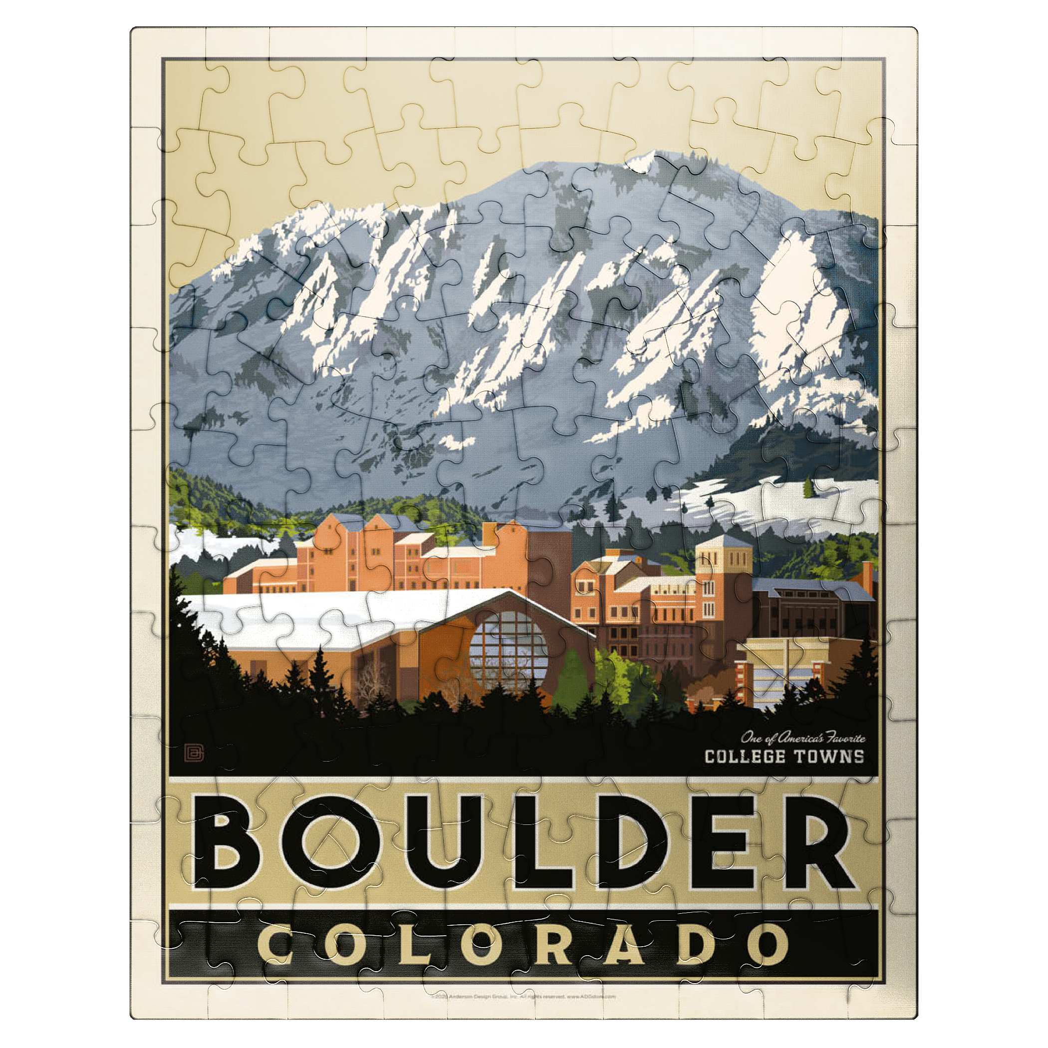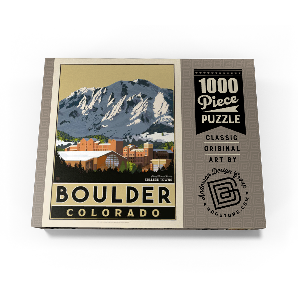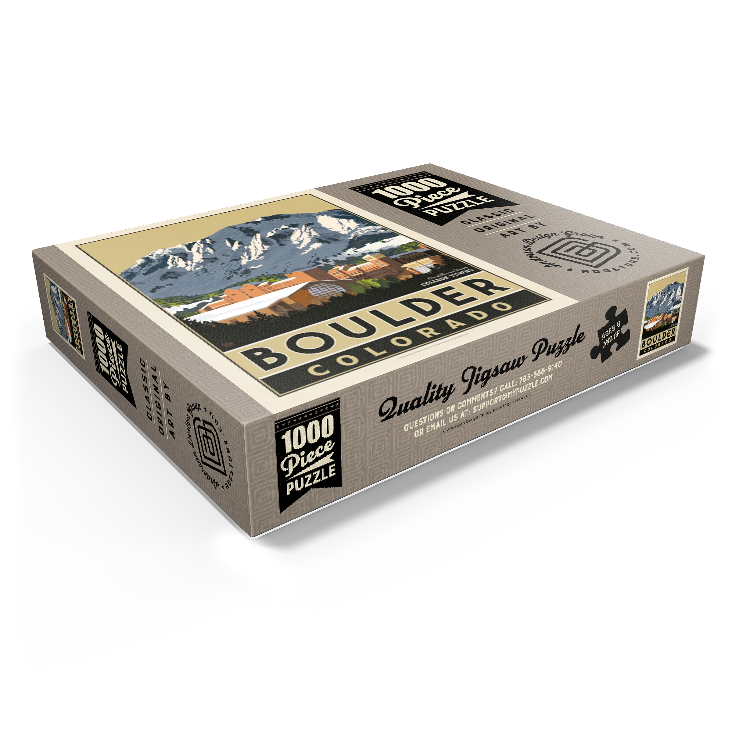 Boulder, Colorado, framed by the dramatic Flatirons, is beautifully illustrated in this artwork highlighting the University of Colorado campus against a stunning mountain backdrop. The snow-dusted peaks rise sharply above the terracotta rooftops and stone architecture, symbolizing the city's blend of natural beauty and academic energy. Known as one of America's favorite college towns, Boulder offers a unique mix of outdoor adventure, cultural vibrancy, and historic charm. This design captures the essence of the city's scenic setting in the Rocky Mountains, making it a timeless tribute to both the landscape and the university community.