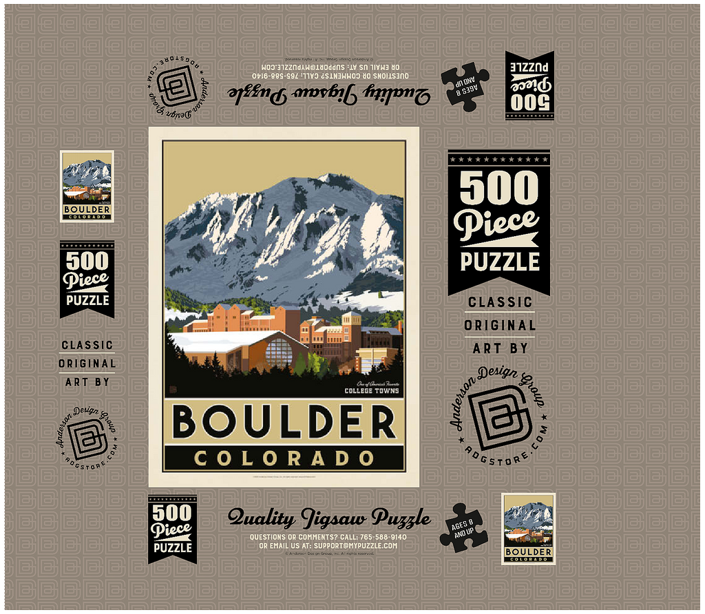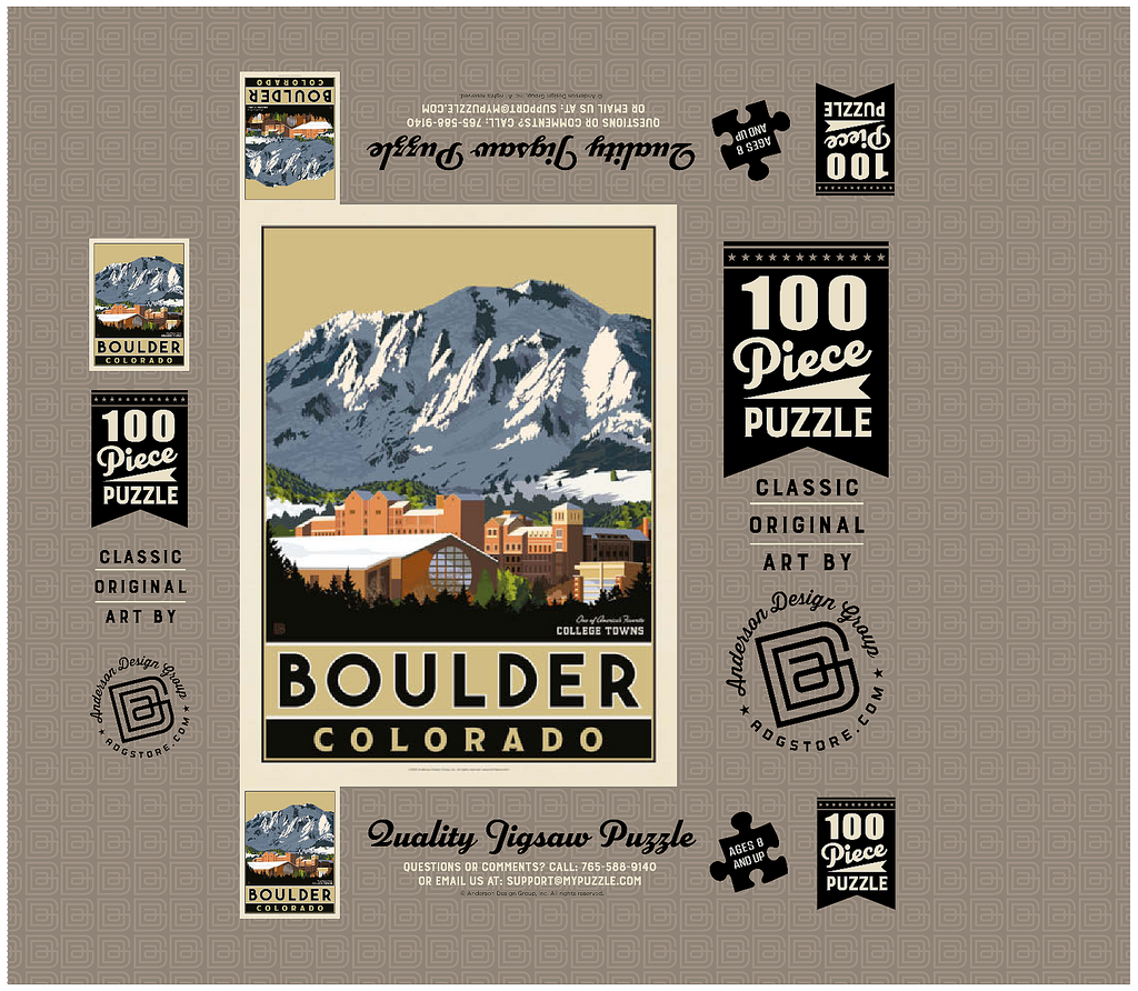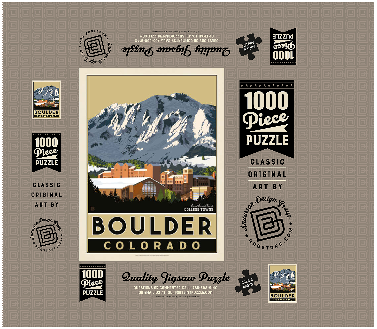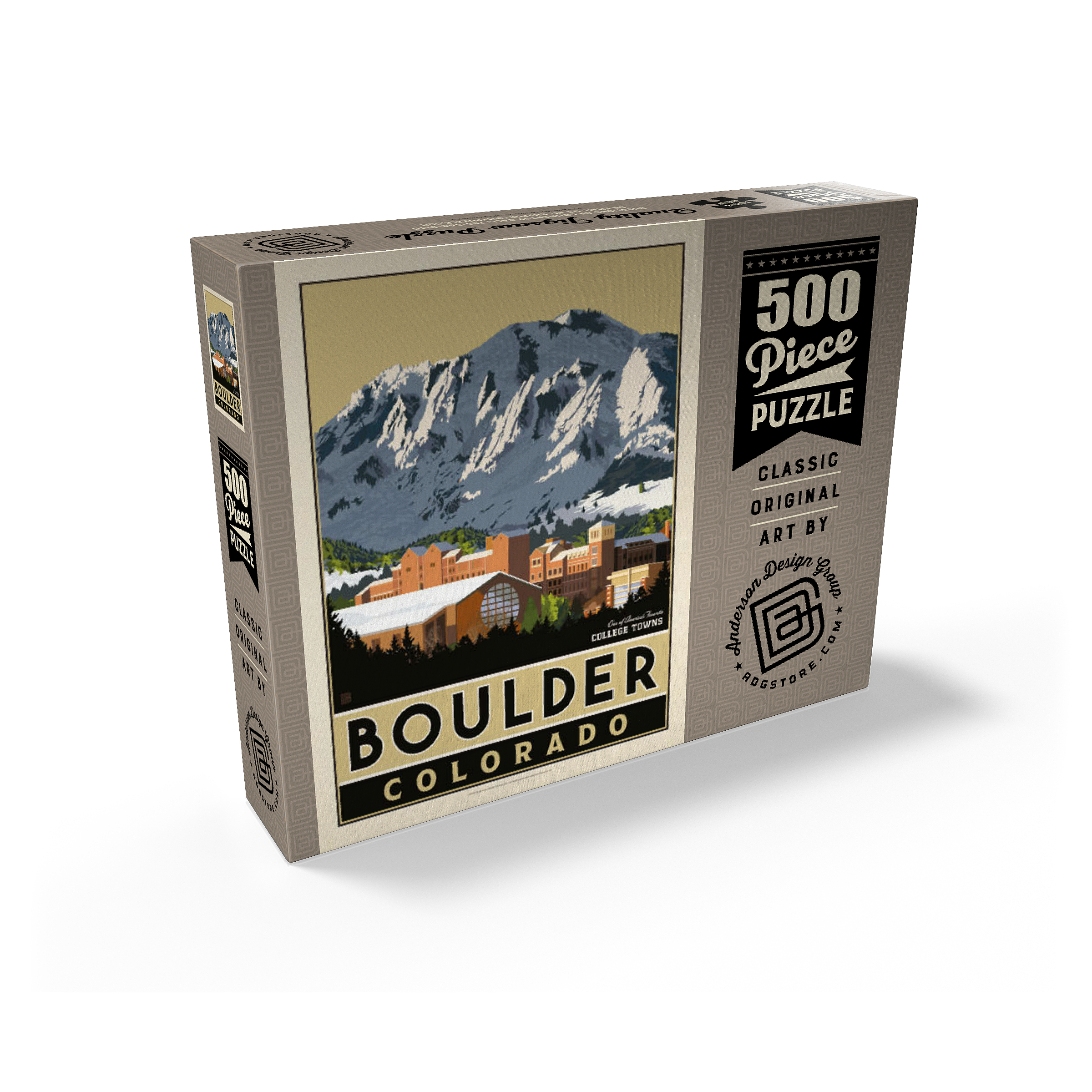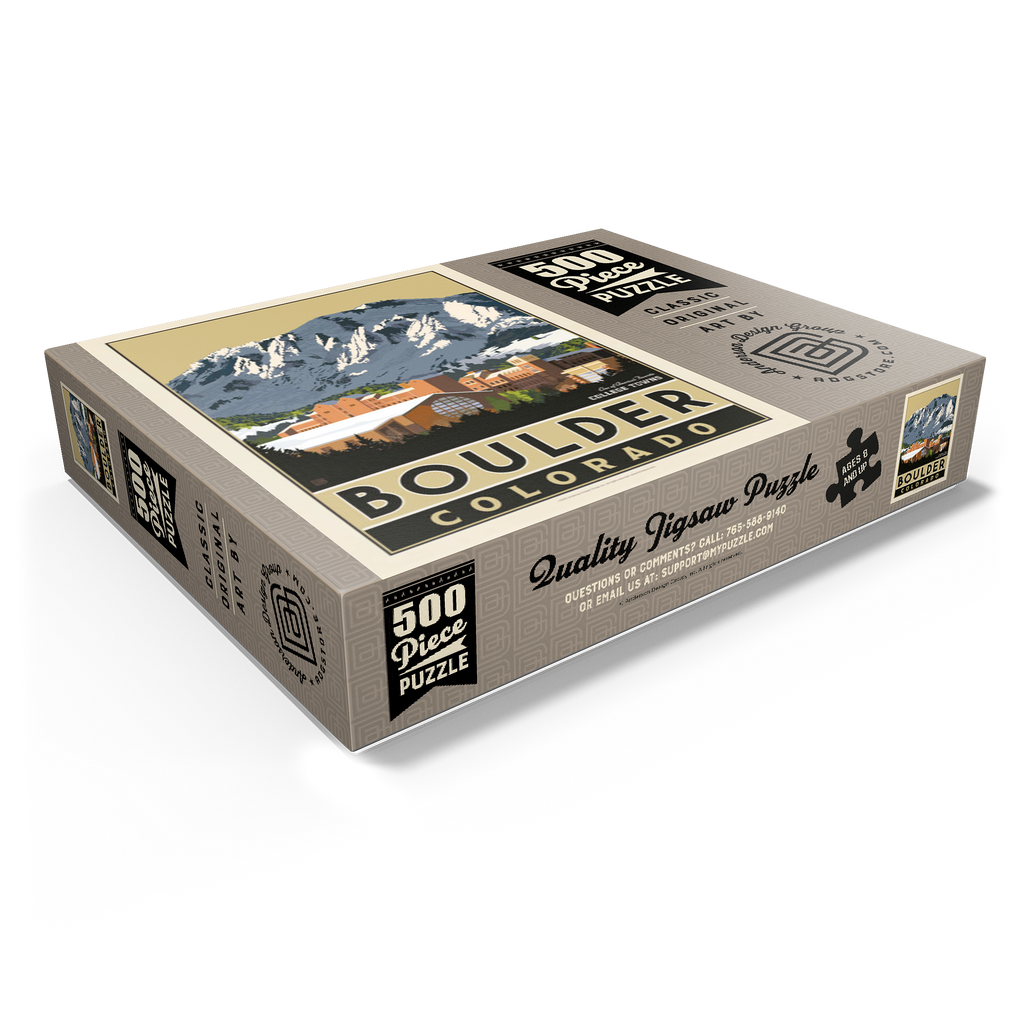 Boulder, Colorado, framed by the dramatic Flatirons, is beautifully illustrated in this artwork highlighting the University of Colorado campus against a stunning mountain backdrop. The snow-dusted peaks rise sharply above the terracotta rooftops and stone architecture, symbolizing the city's blend of natural beauty and academic energy. Known as one of America's favorite college towns, Boulder offers a unique mix of outdoor adventure, cultural vibrancy, and historic charm. This design captures the essence of the city's scenic setting in the Rocky Mountains, making it a timeless tribute to both the landscape and the university community.