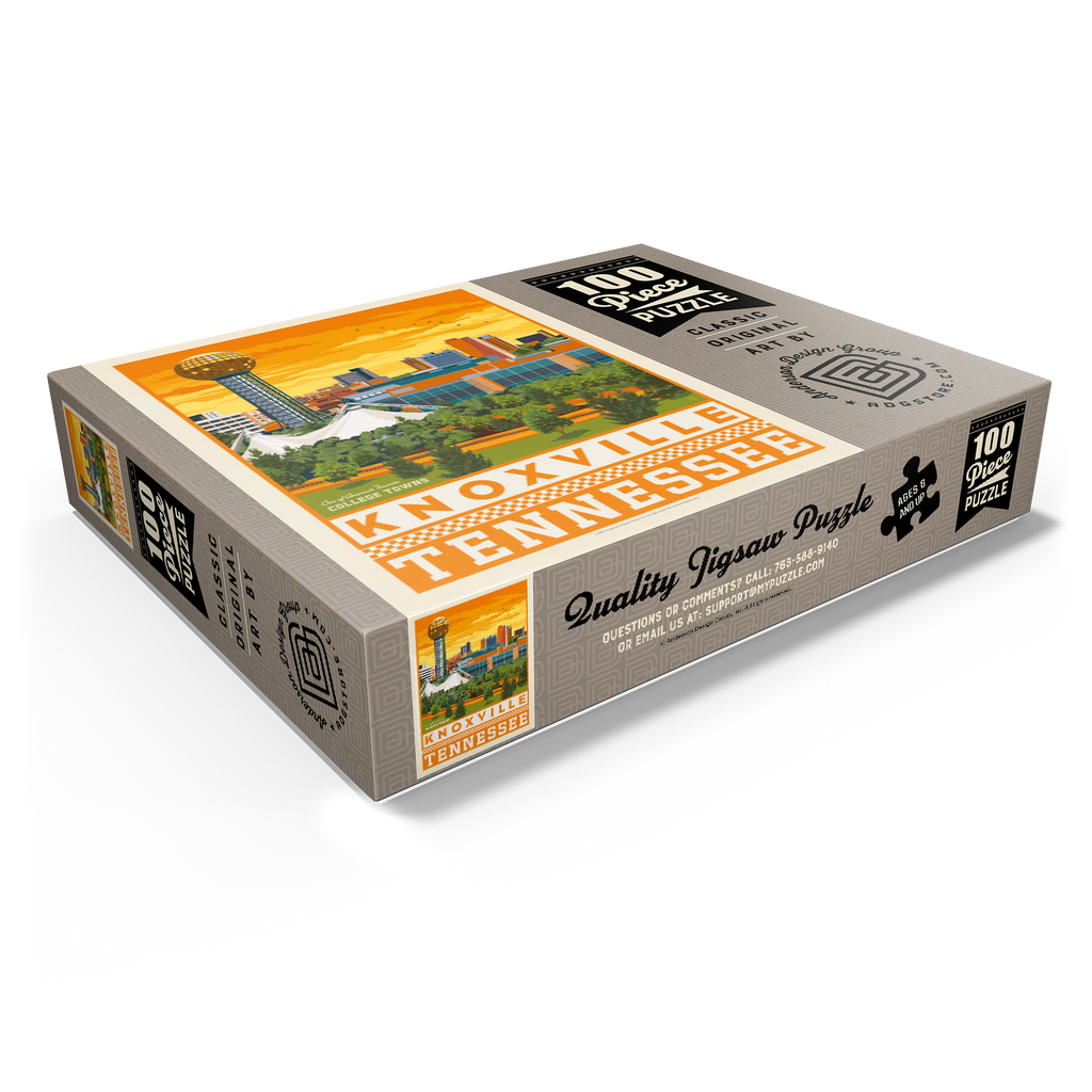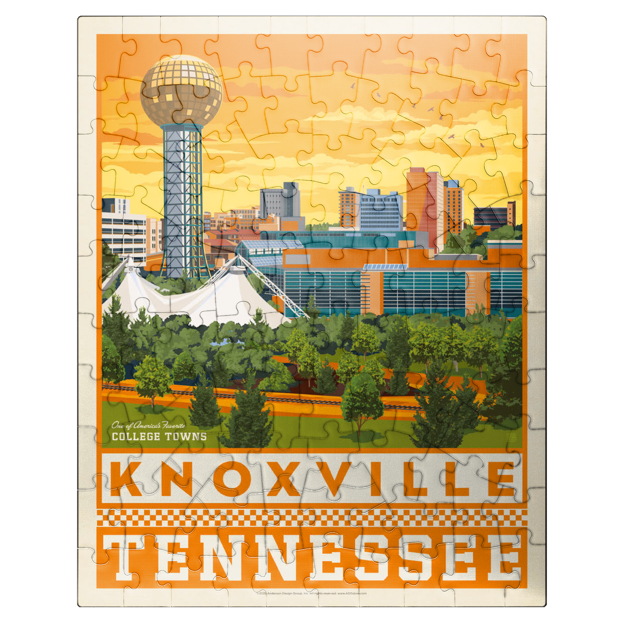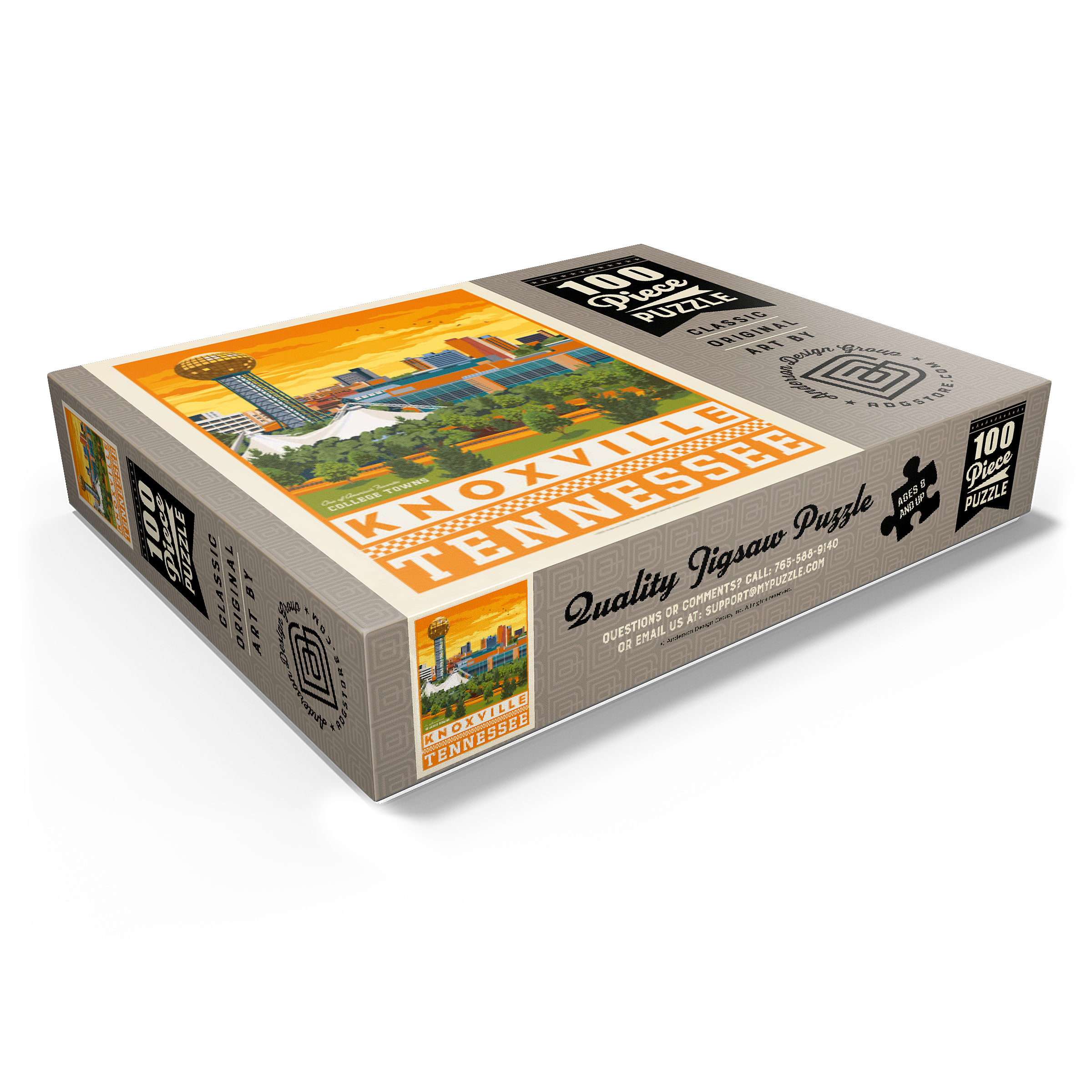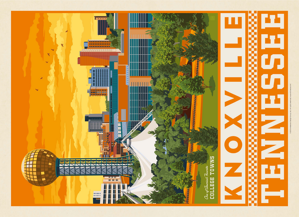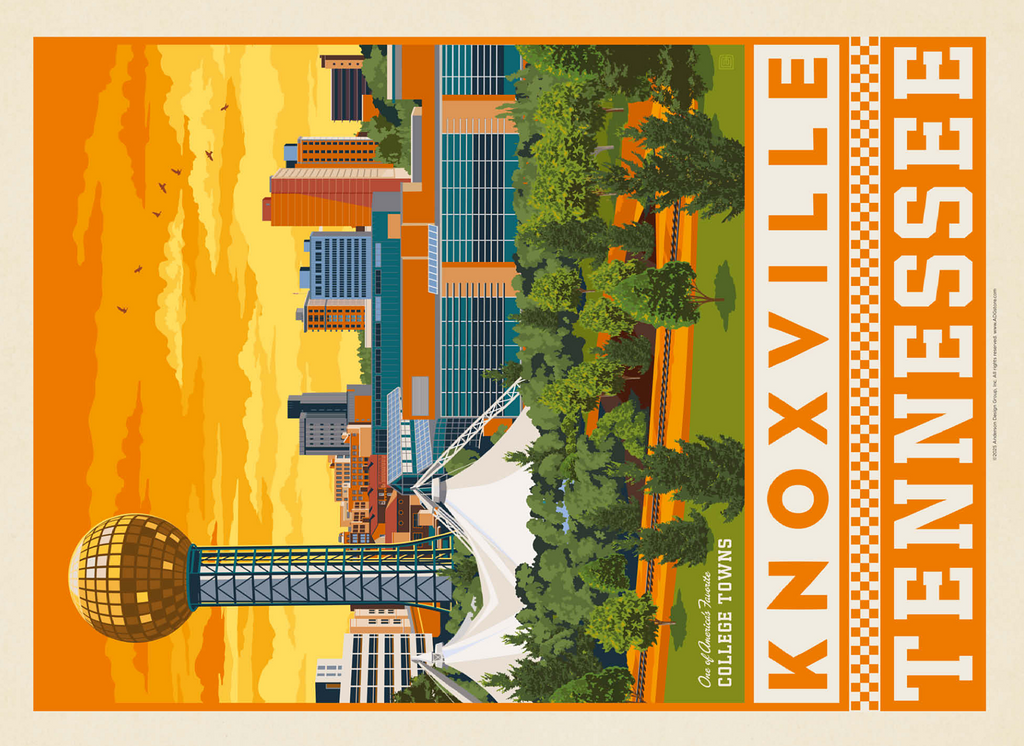 Knoxville, Tennessee is vividly illustrated with the iconic Sunsphere rising above the downtown skyline under a glowing orange sunset. The city's modern architecture blends with lush greenery, reflecting Knoxville's balance between urban energy and natural beauty. Birds glide through the warm evening sky, while the Sunsphere's golden glass surface captures the last rays of sunlight. This depiction celebrates Knoxville's status as one of America's favorite college towns, home to the University of Tennessee and a vibrant cultural scene. The bold composition and warm tones embody the city's welcoming Southern charm and lively atmosphere.