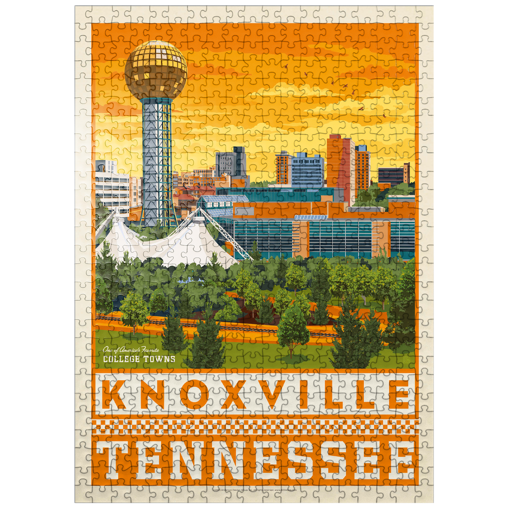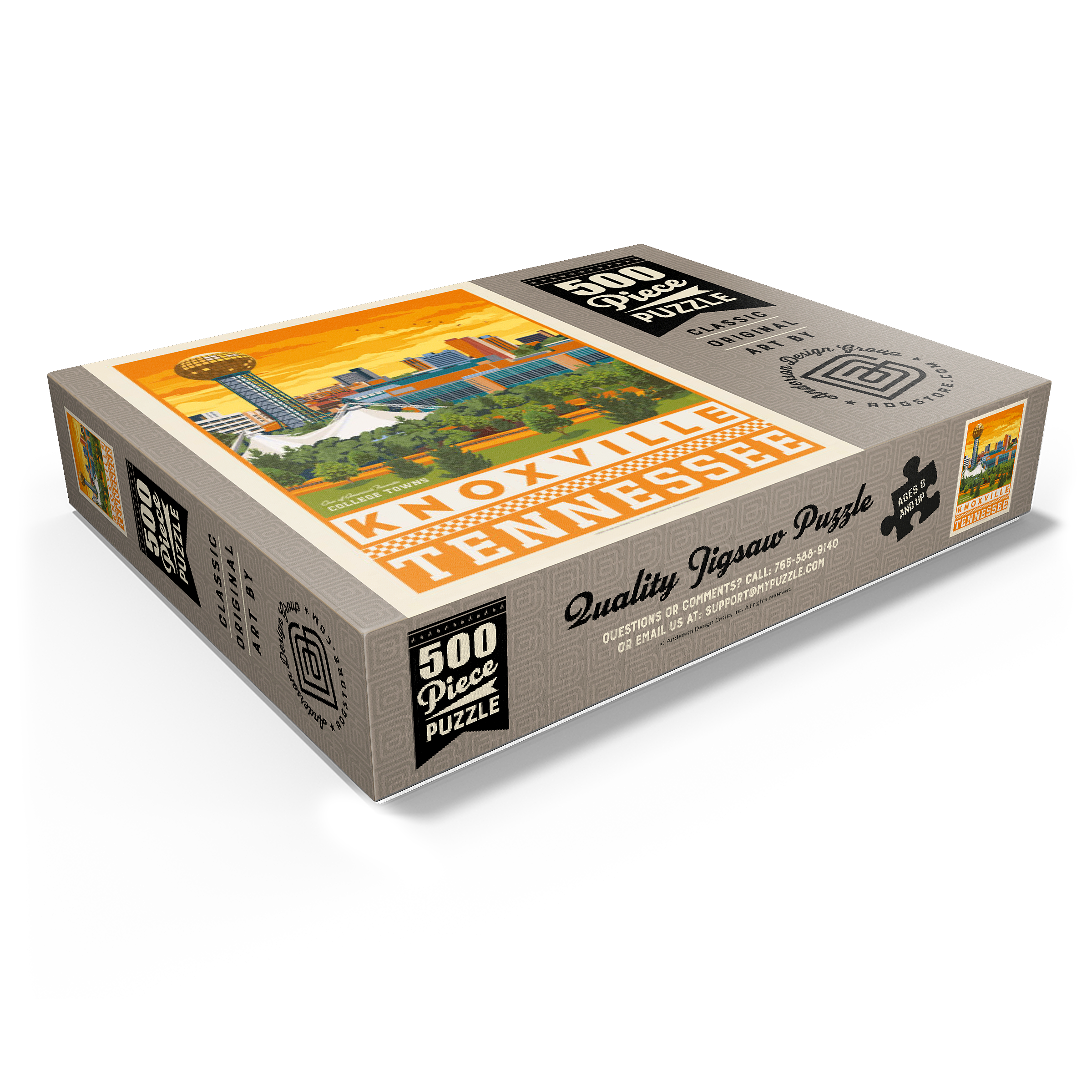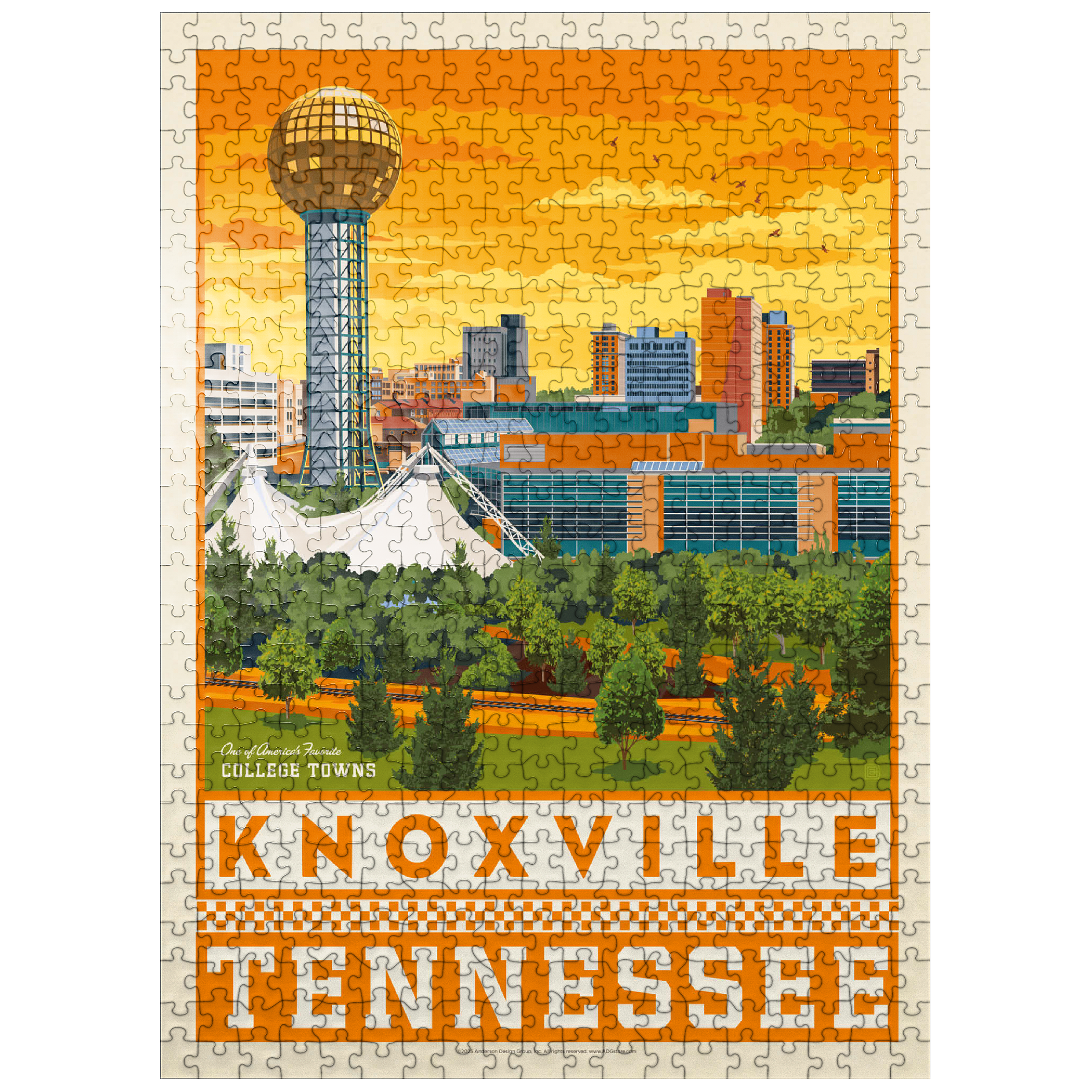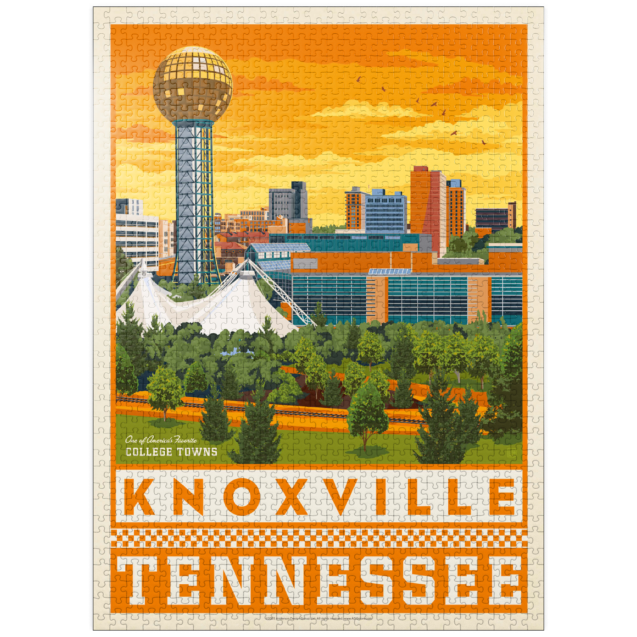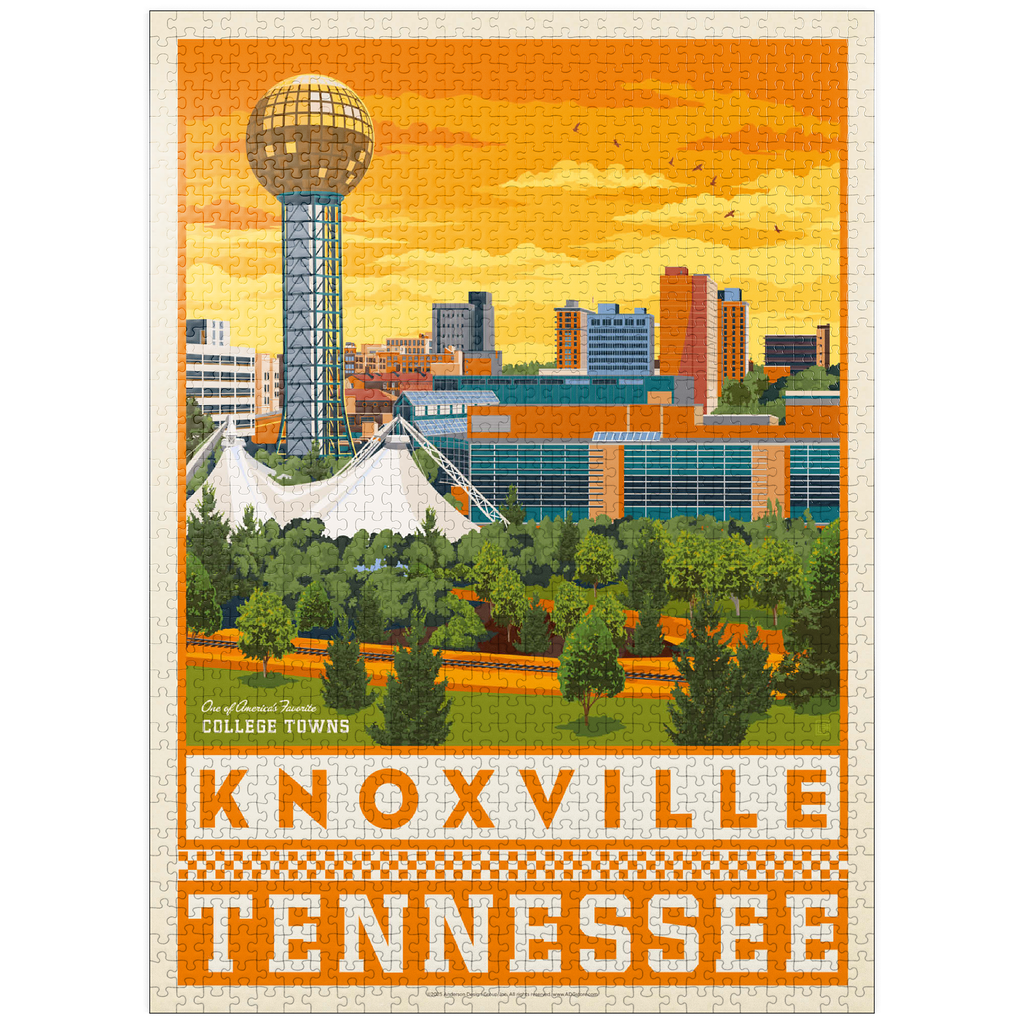 Knoxville, Tennessee is vividly illustrated with the iconic Sunsphere rising above the downtown skyline under a glowing orange sunset. The city's modern architecture blends with lush greenery, reflecting Knoxville's balance between urban energy and natural beauty. Birds glide through the warm evening sky, while the Sunsphere's golden glass surface captures the last rays of sunlight. This depiction celebrates Knoxville's status as one of America's favorite college towns, home to the University of Tennessee and a vibrant cultural scene. The bold composition and warm tones embody the city's welcoming Southern charm and lively atmosphere.