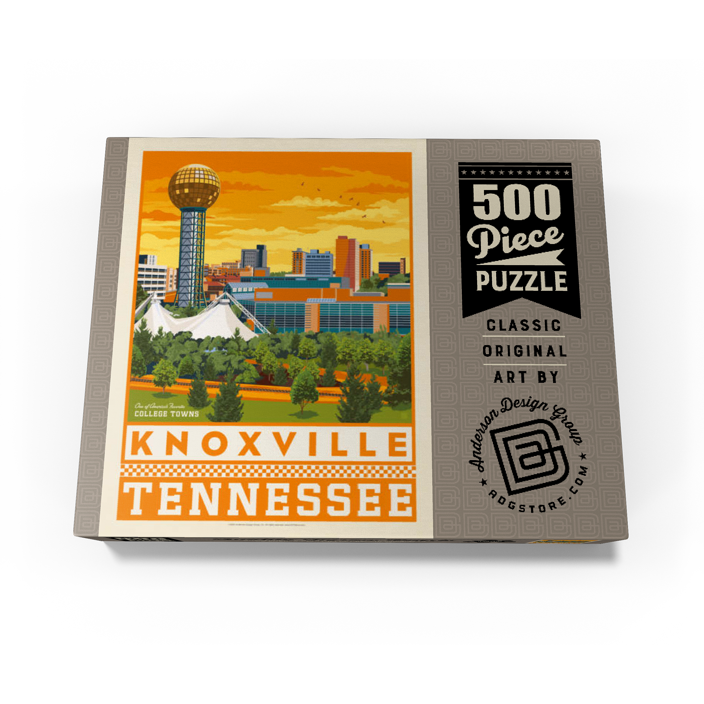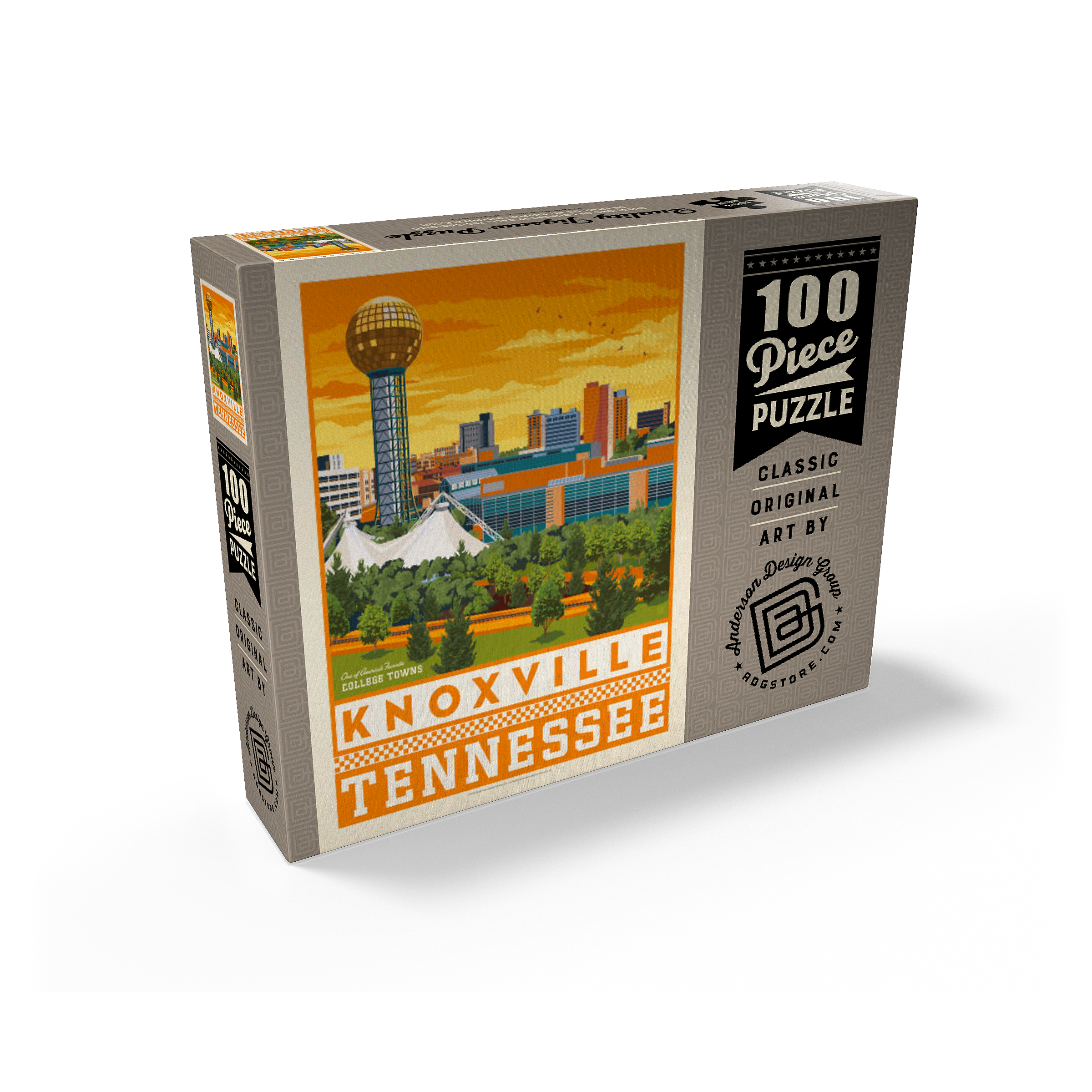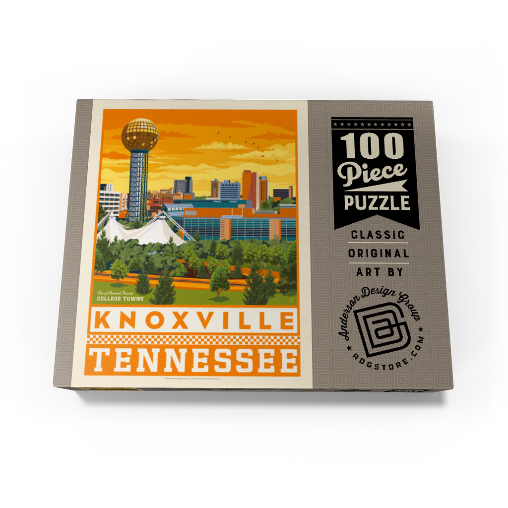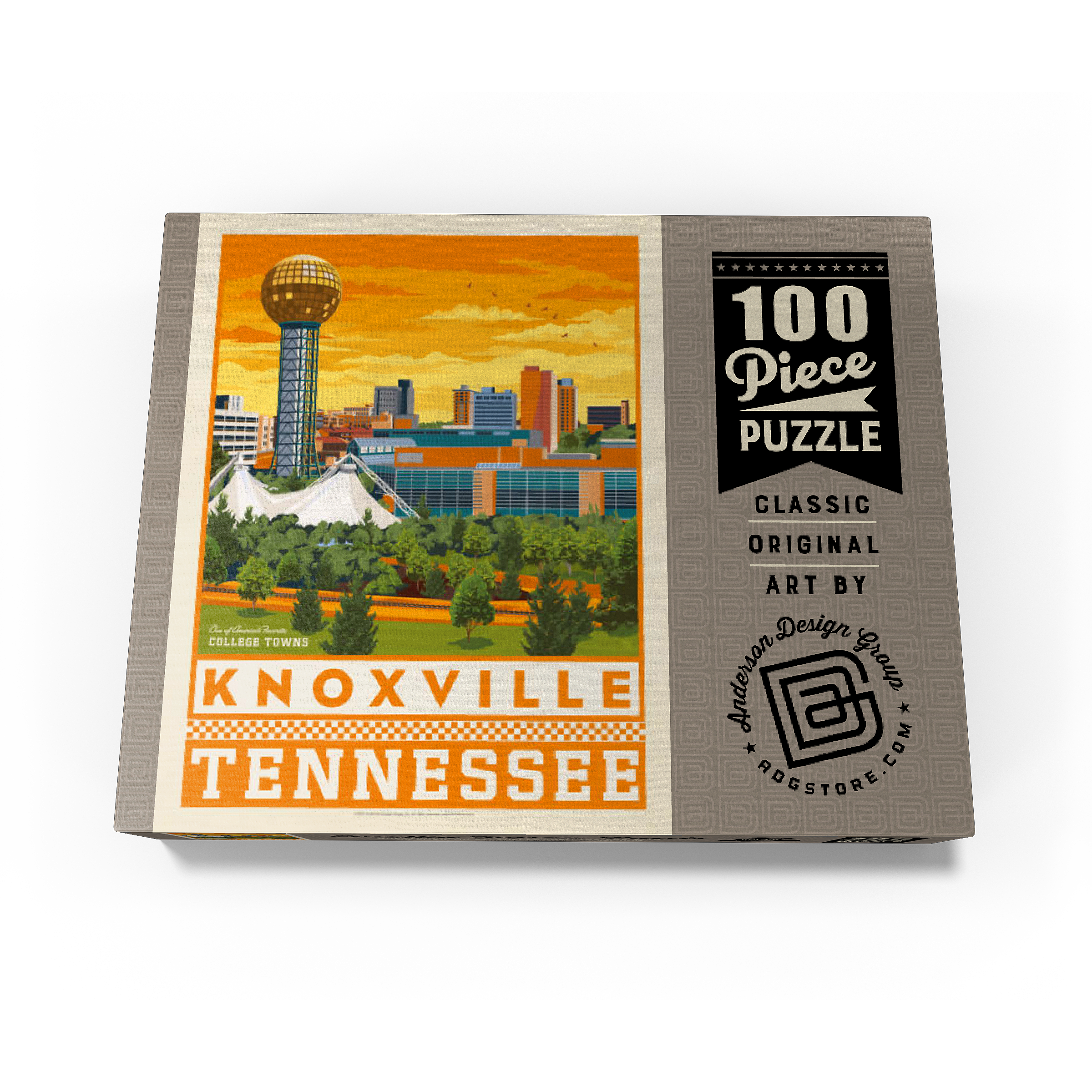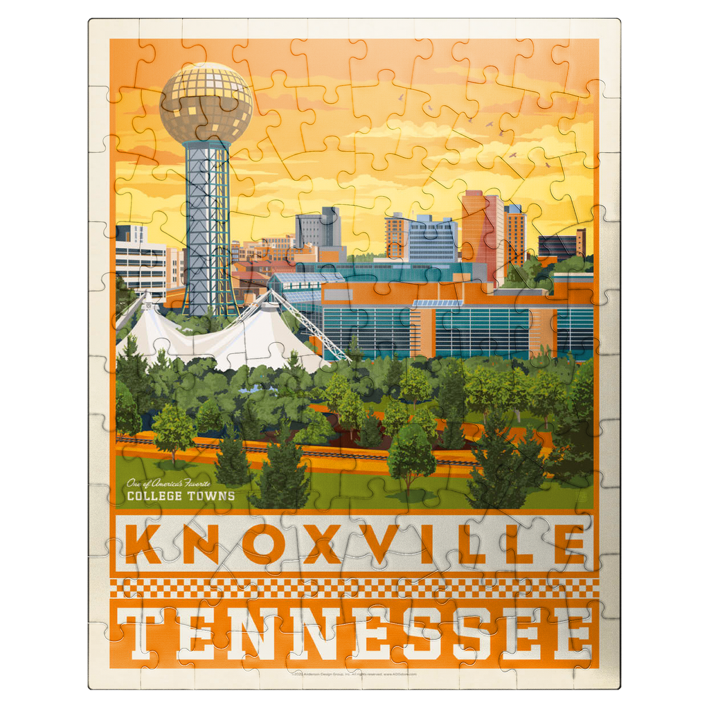 Knoxville, Tennessee is vividly illustrated with the iconic Sunsphere rising above the downtown skyline under a glowing orange sunset. The city's modern architecture blends with lush greenery, reflecting Knoxville's balance between urban energy and natural beauty. Birds glide through the warm evening sky, while the Sunsphere's golden glass surface captures the last rays of sunlight. This depiction celebrates Knoxville's status as one of America's favorite college towns, home to the University of Tennessee and a vibrant cultural scene. The bold composition and warm tones embody the city's welcoming Southern charm and lively atmosphere.