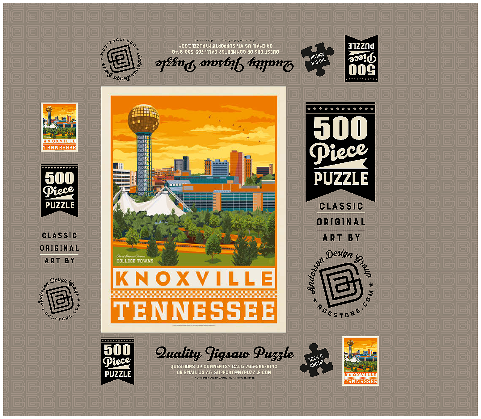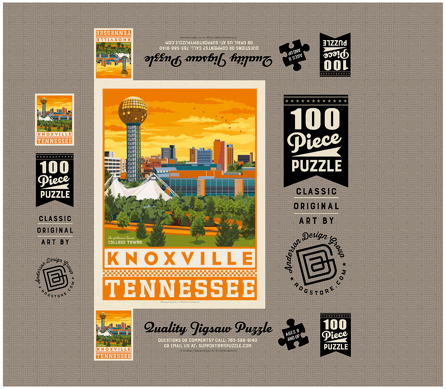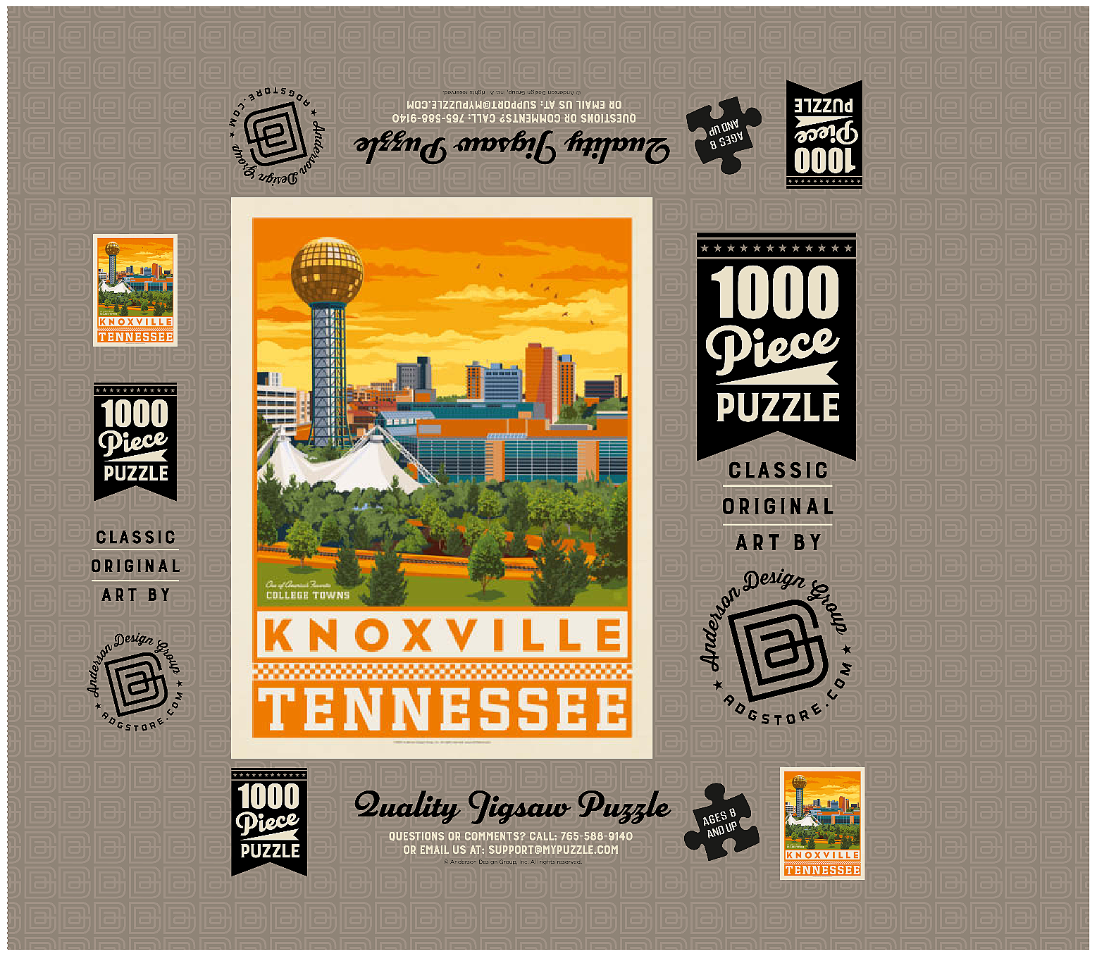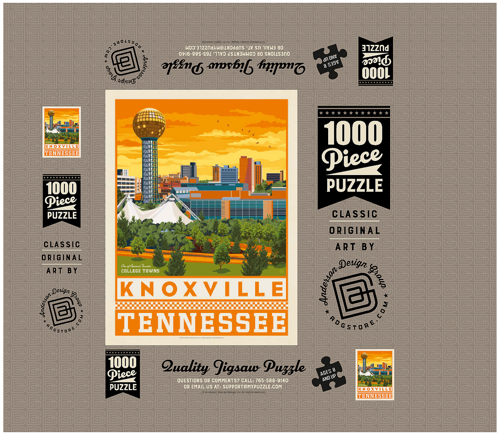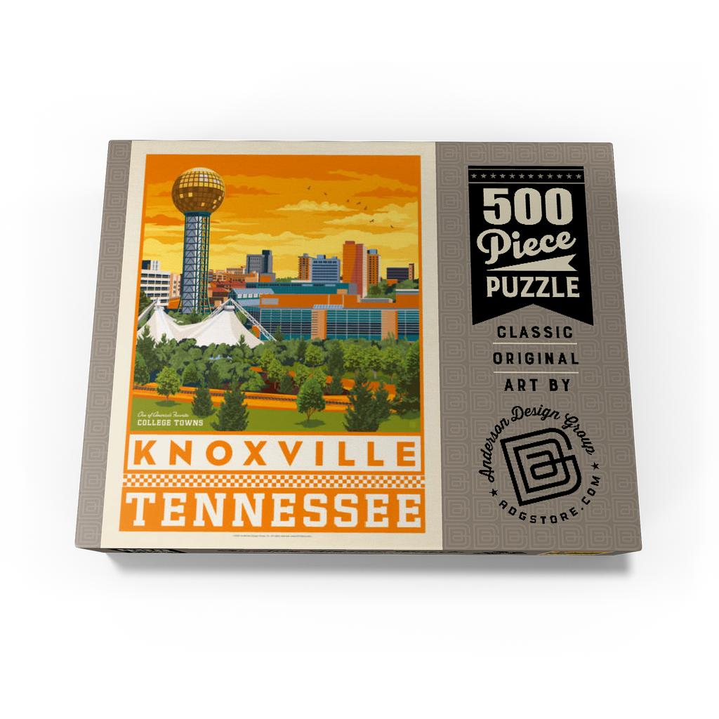 Knoxville, Tennessee is vividly illustrated with the iconic Sunsphere rising above the downtown skyline under a glowing orange sunset. The city's modern architecture blends with lush greenery, reflecting Knoxville's balance between urban energy and natural beauty. Birds glide through the warm evening sky, while the Sunsphere's golden glass surface captures the last rays of sunlight. This depiction celebrates Knoxville's status as one of America's favorite college towns, home to the University of Tennessee and a vibrant cultural scene. The bold composition and warm tones embody the city's welcoming Southern charm and lively atmosphere.