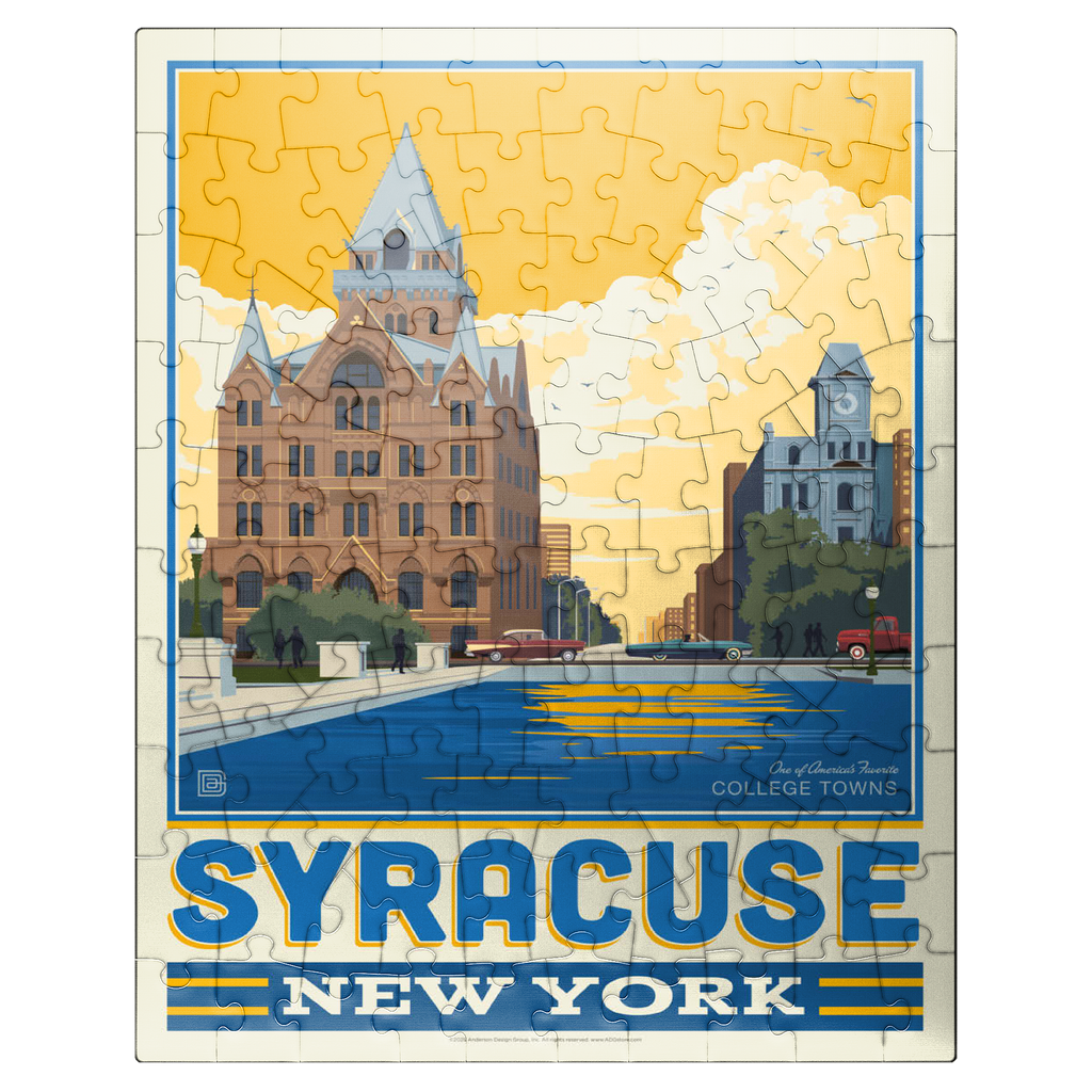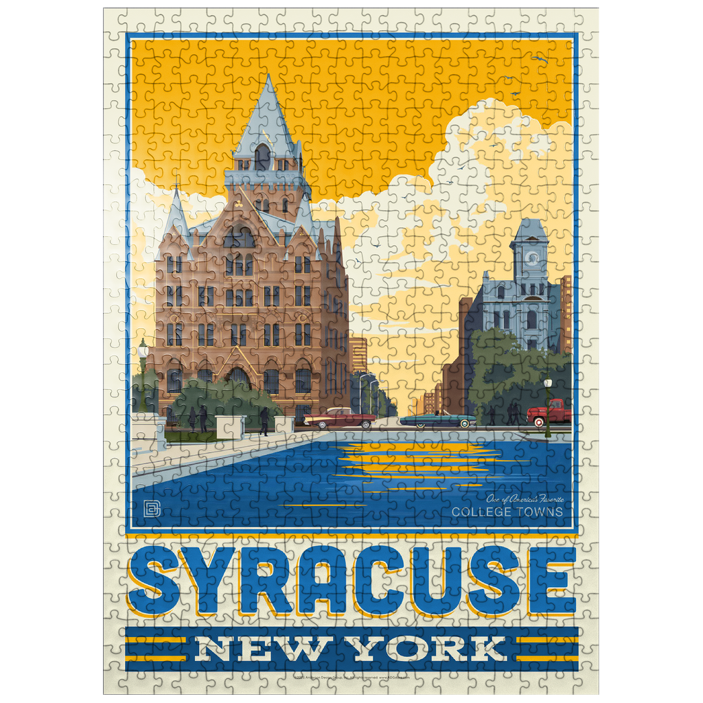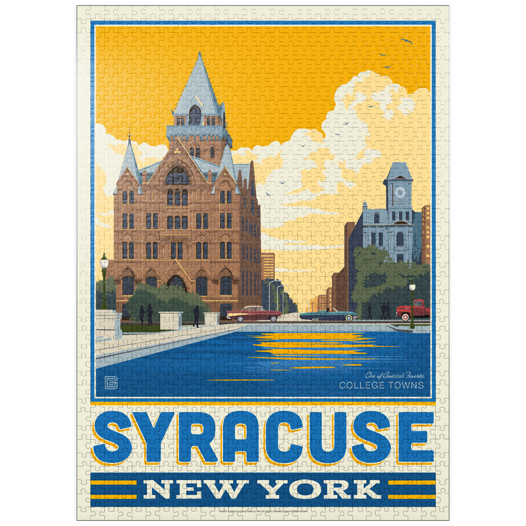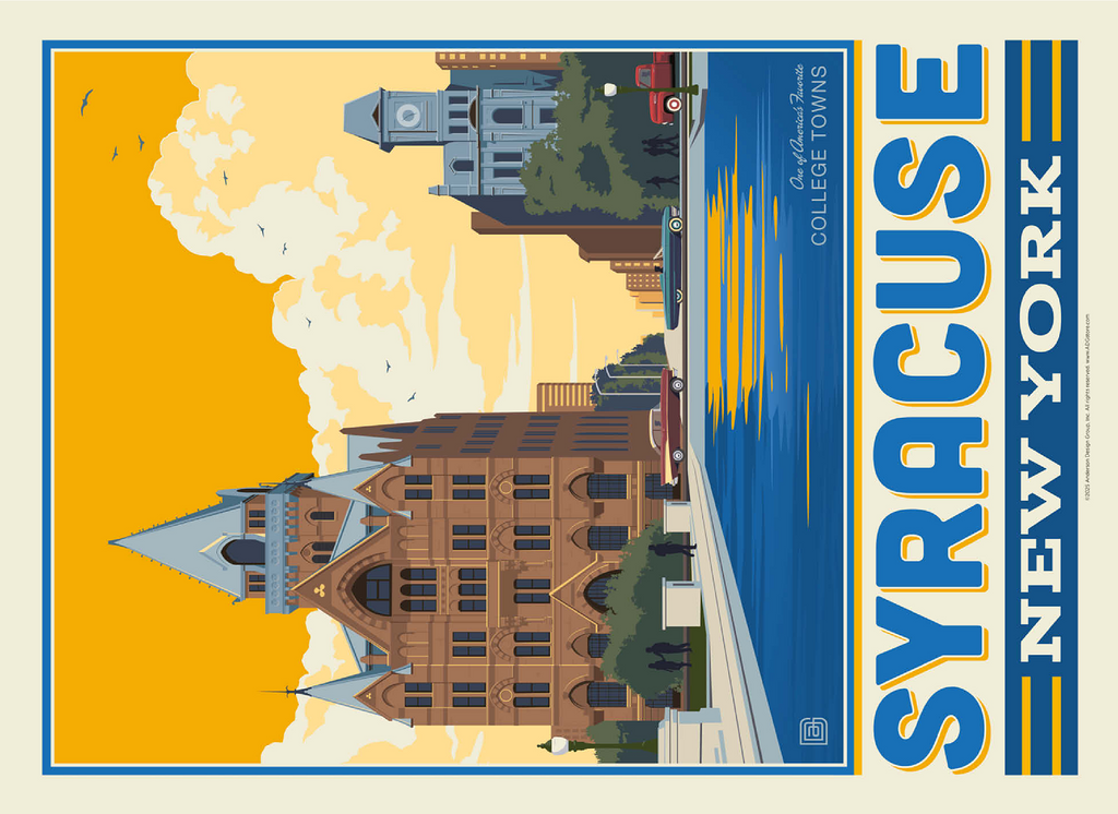 Syracuse, New York, home to Syracuse University, is beautifully captured in this artwork featuring its historic downtown architecture reflected in the city's waterways. The striking red-brick Gothic Revival building with its pointed spires and intricate details stands proudly in the foreground, while a clocktower and classic cars add to the city's timeless character. Known as one of America's favorite college towns, Syracuse blends academic excellence, historic landmarks, and a vibrant cultural scene. This design highlights both the architectural beauty and the welcoming community spirit that define Syracuse.