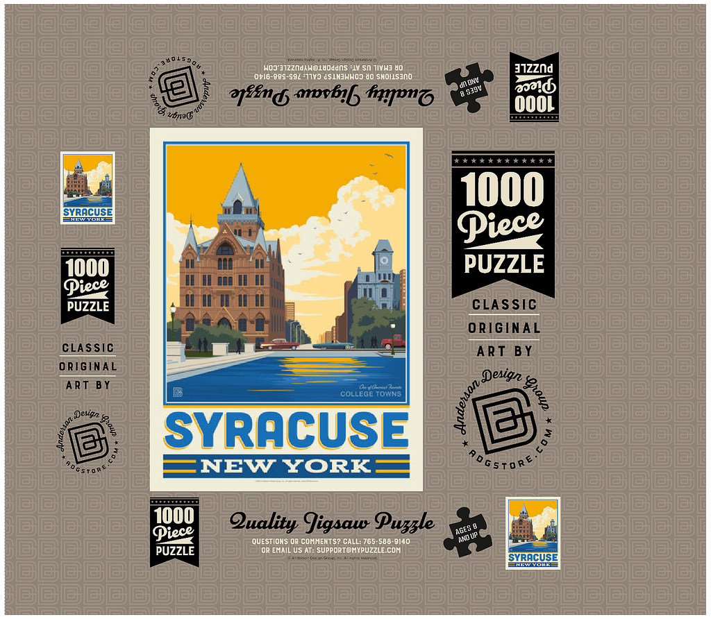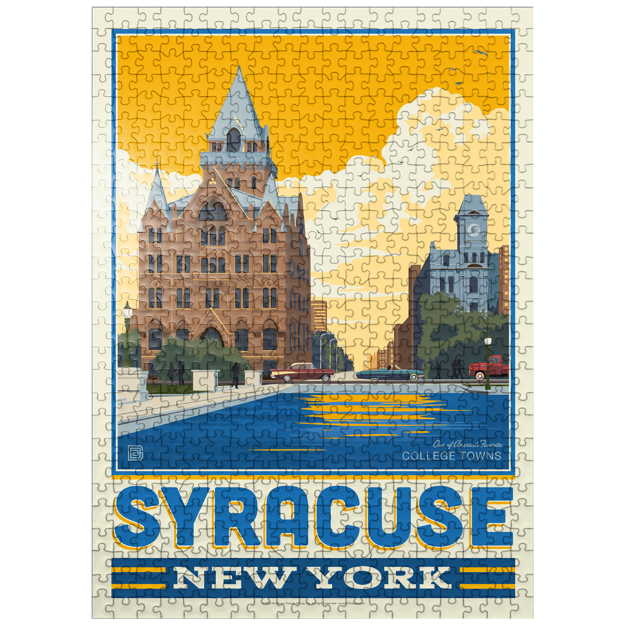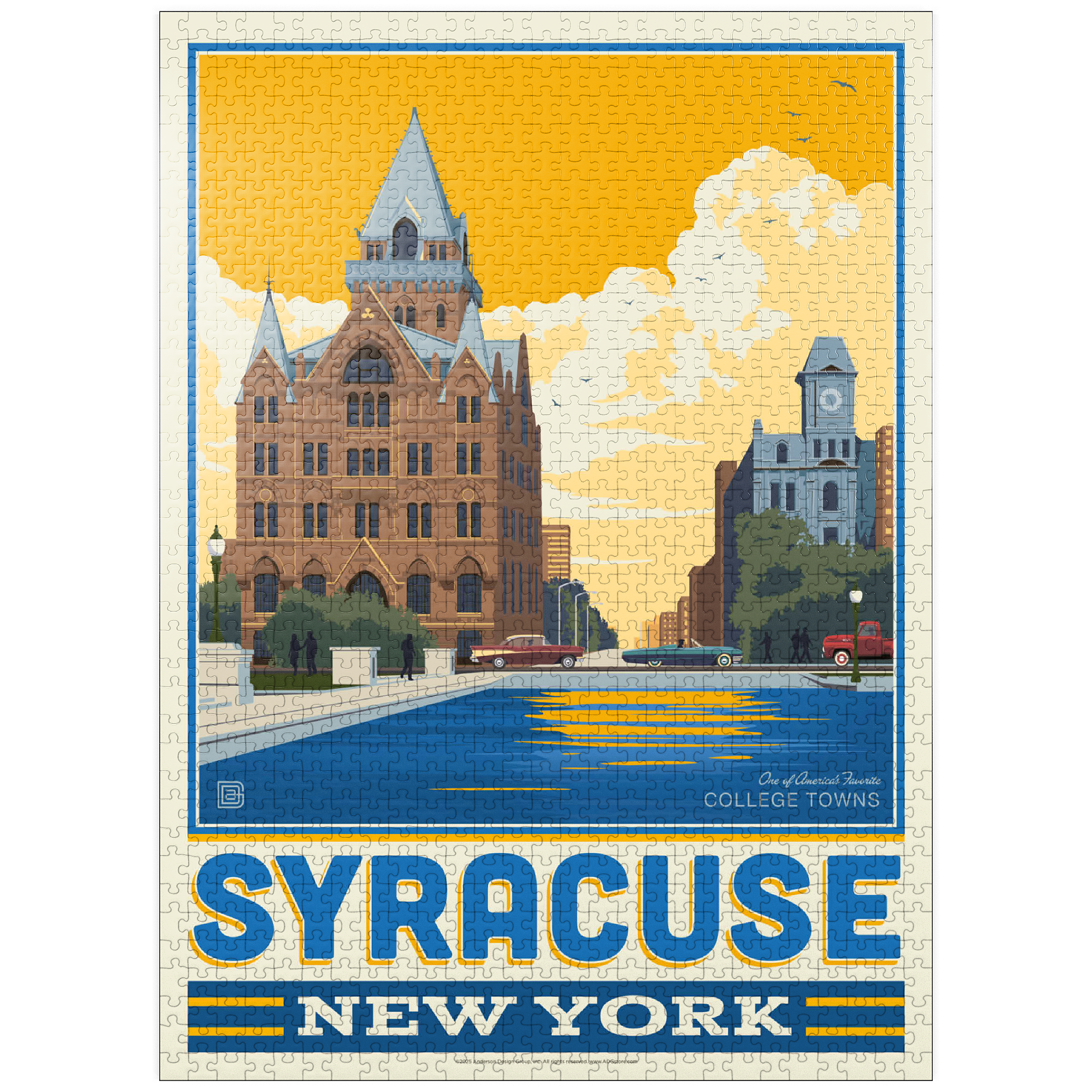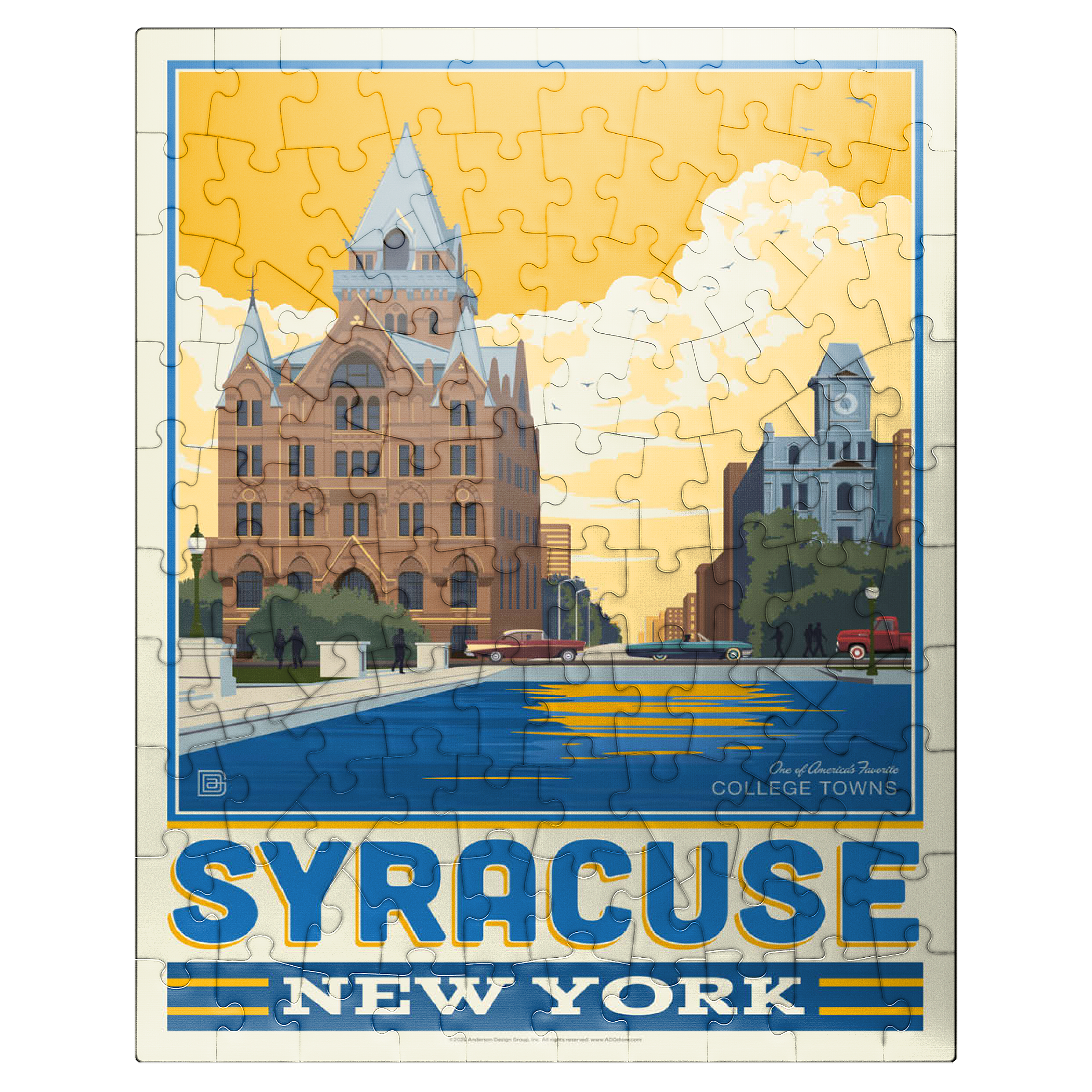 Syracuse, New York, home to Syracuse University, is beautifully captured in this artwork featuring its historic downtown architecture reflected in the city's waterways. The striking red-brick Gothic Revival building with its pointed spires and intricate details stands proudly in the foreground, while a clocktower and classic cars add to the city's timeless character. Known as one of America's favorite college towns, Syracuse blends academic excellence, historic landmarks, and a vibrant cultural scene. This design highlights both the architectural beauty and the welcoming community spirit that define Syracuse.