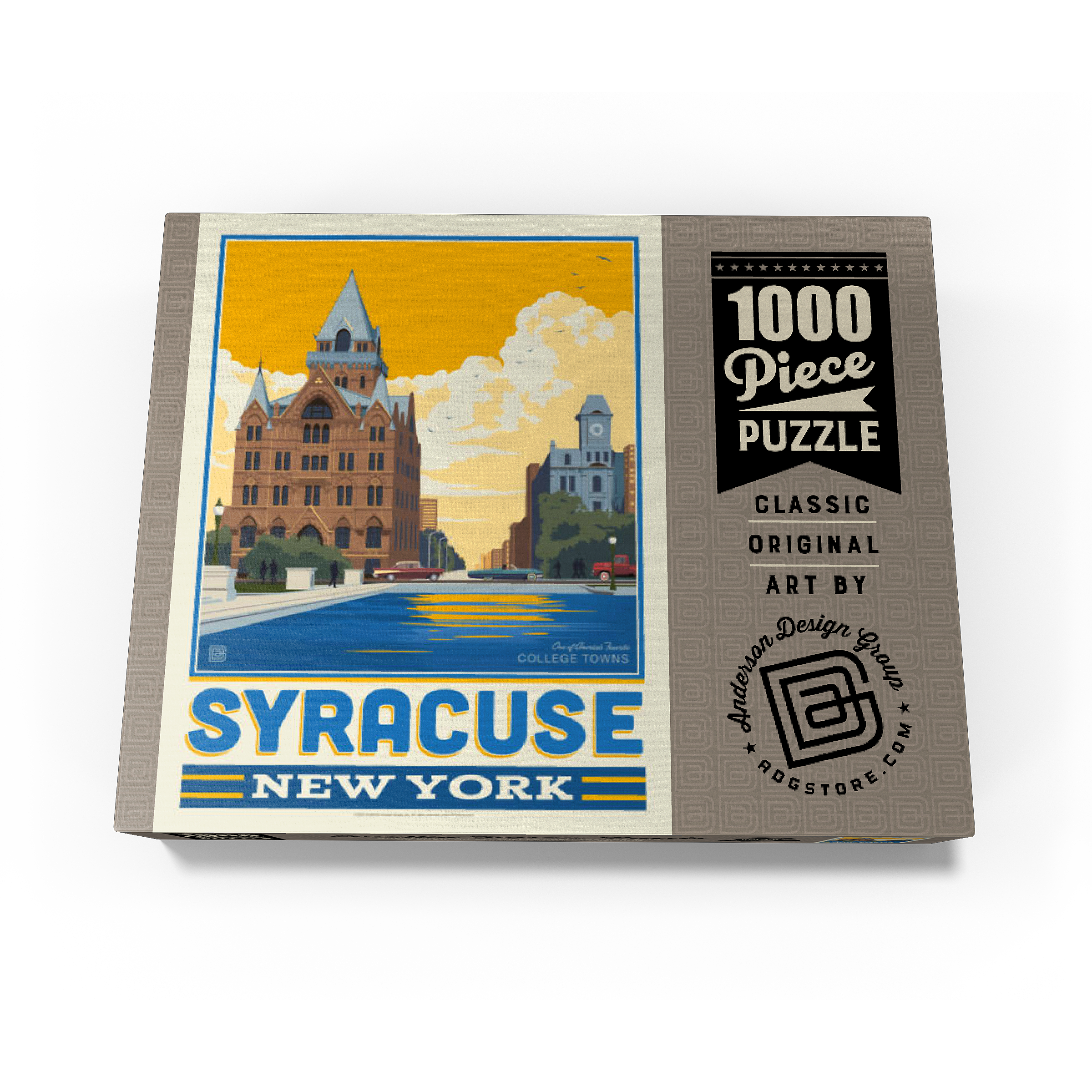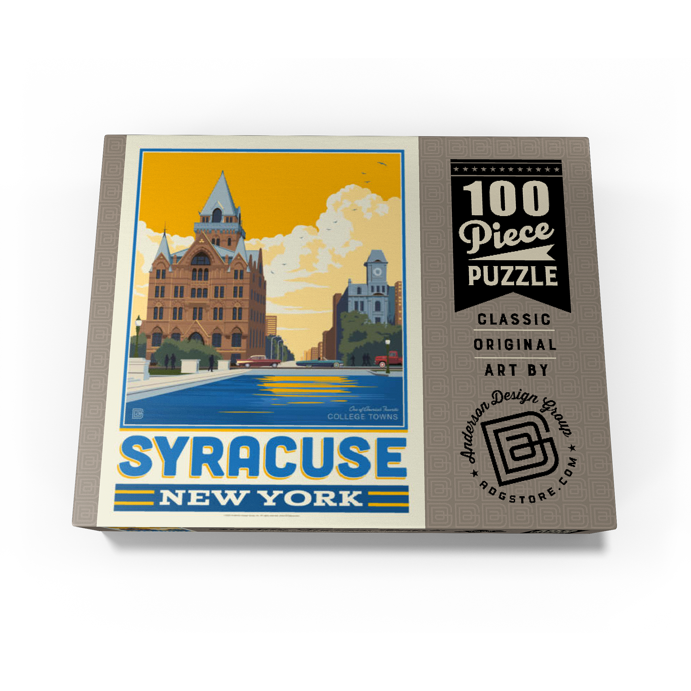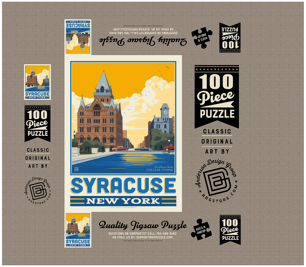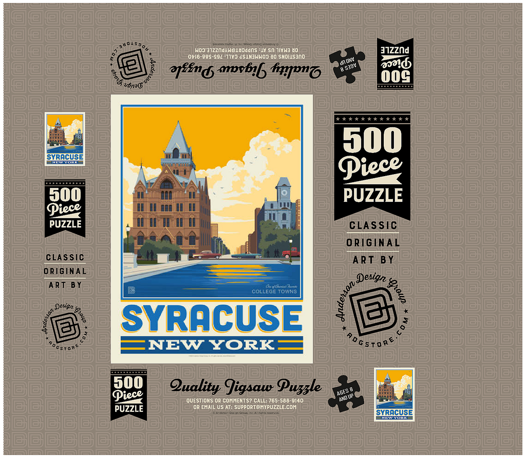 Syracuse, New York, home to Syracuse University, is beautifully captured in this artwork featuring its historic downtown architecture reflected in the city's waterways. The striking red-brick Gothic Revival building with its pointed spires and intricate details stands proudly in the foreground, while a clocktower and classic cars add to the city's timeless character. Known as one of America's favorite college towns, Syracuse blends academic excellence, historic landmarks, and a vibrant cultural scene. This design highlights both the architectural beauty and the welcoming community spirit that define Syracuse.