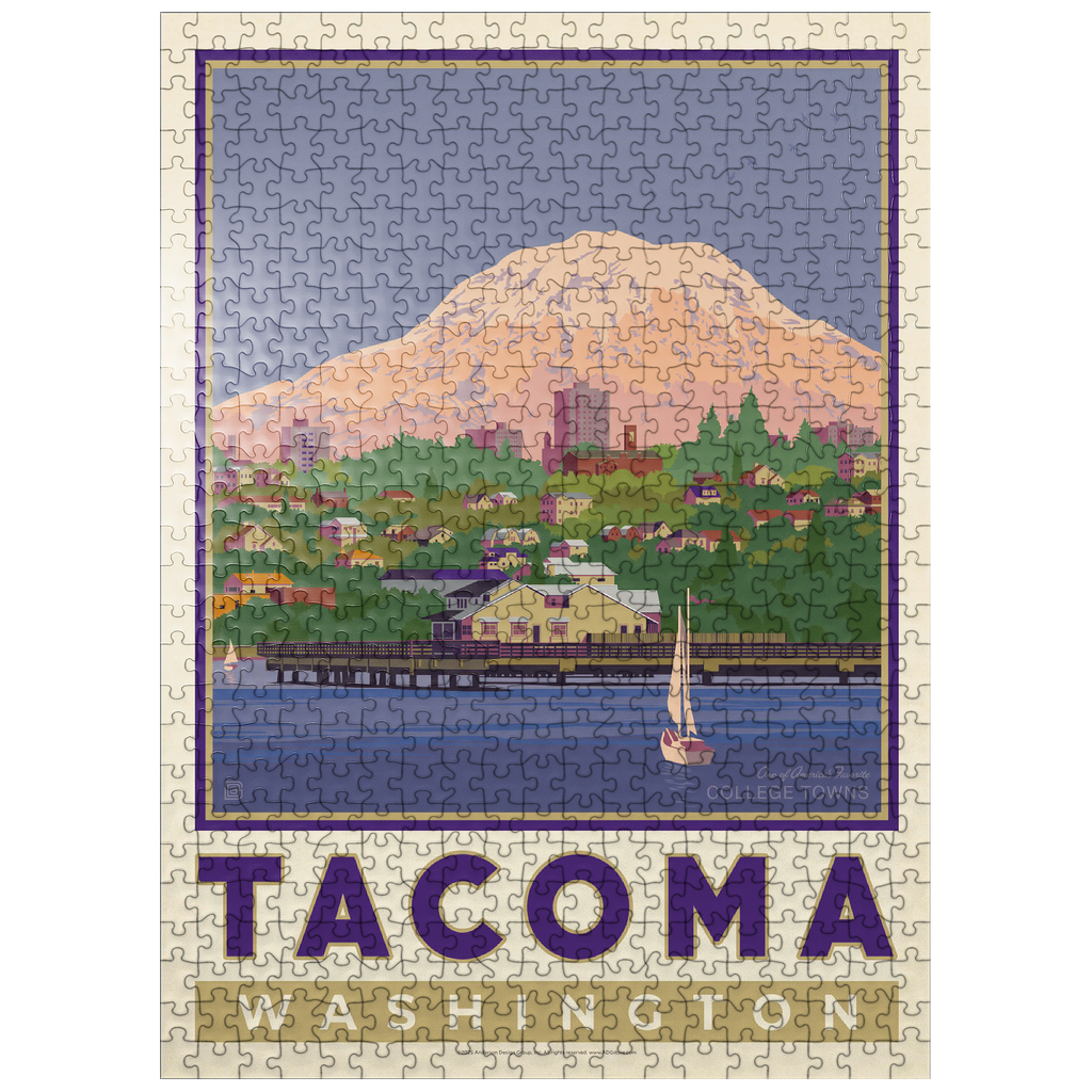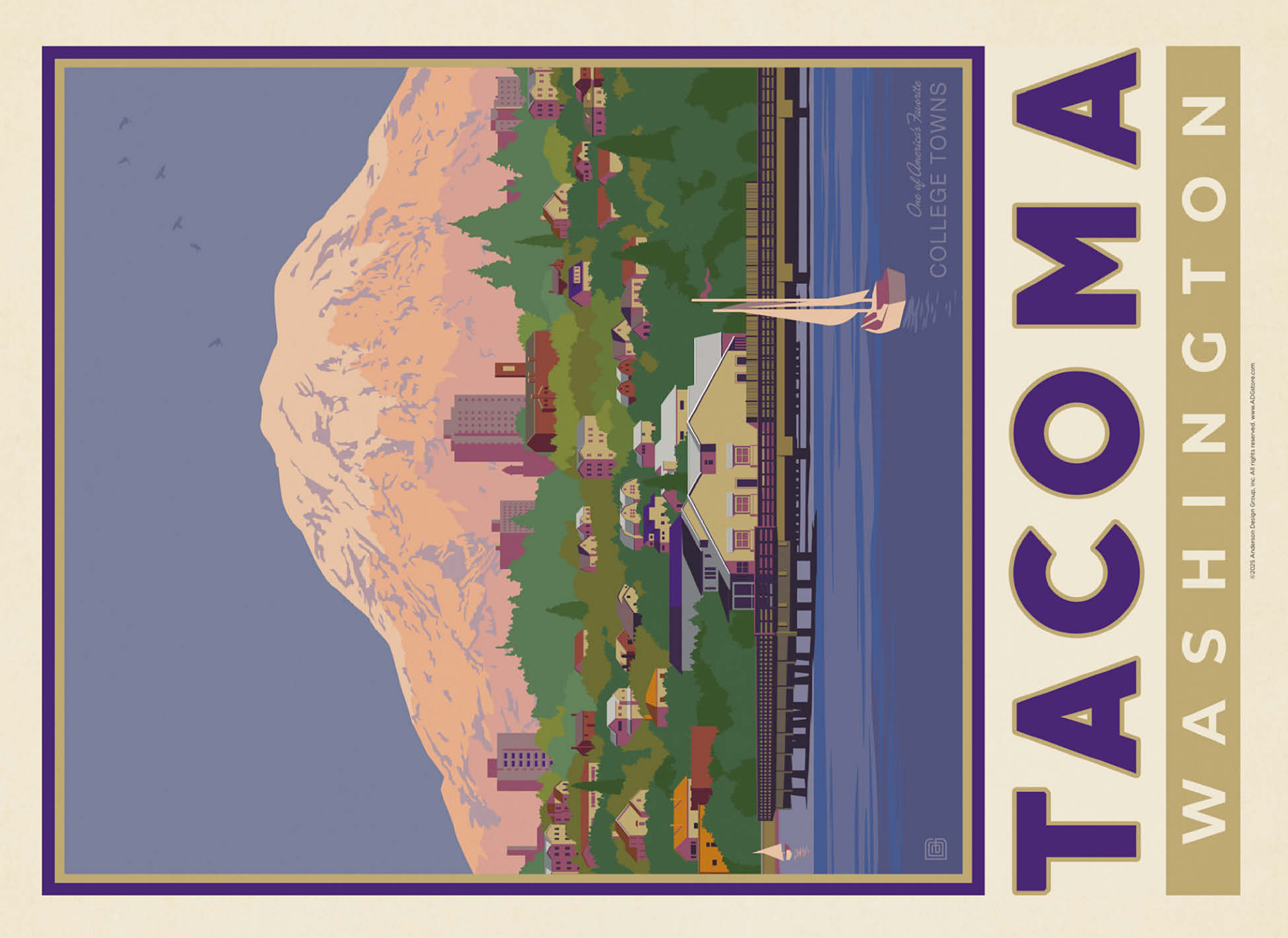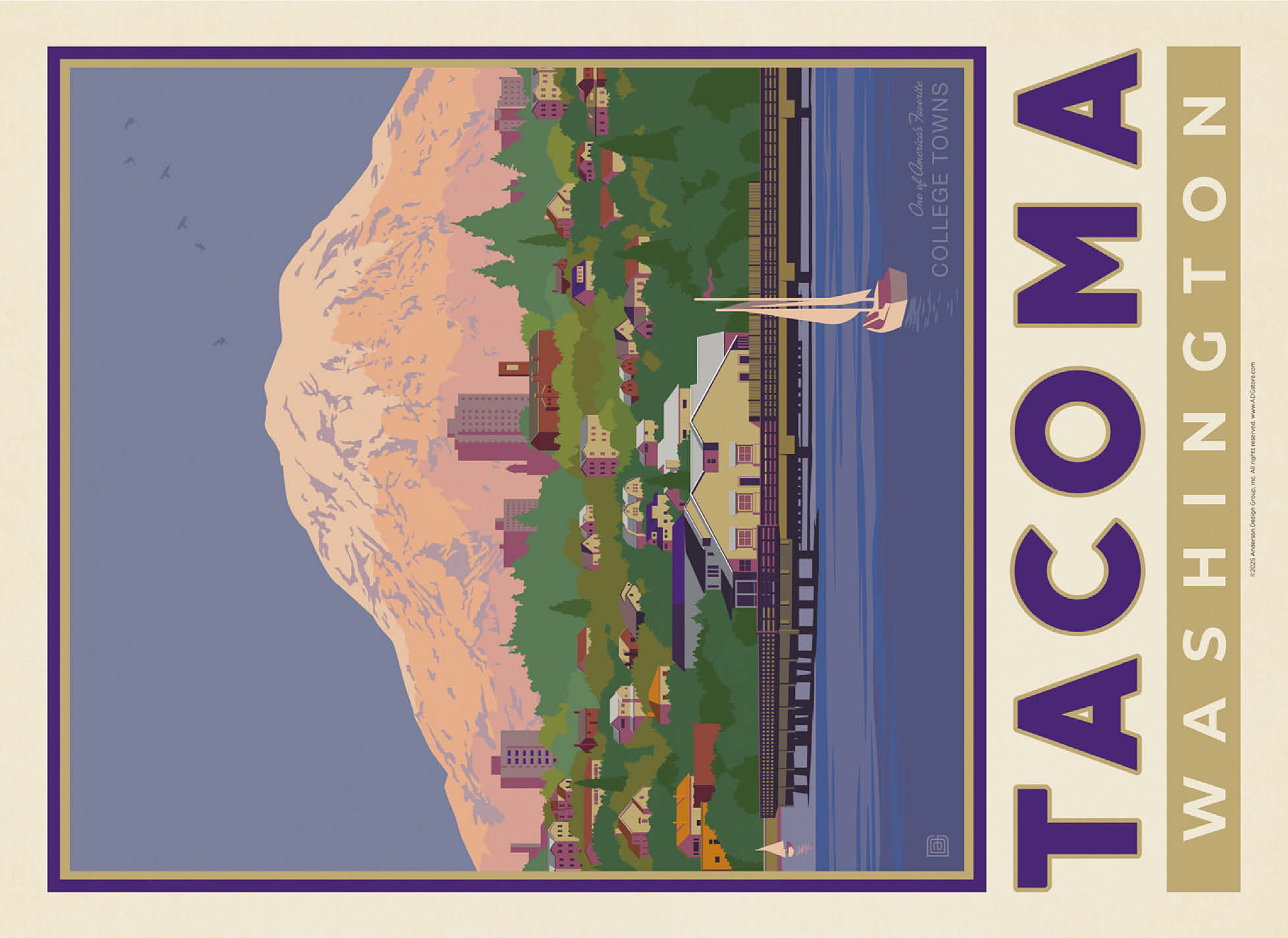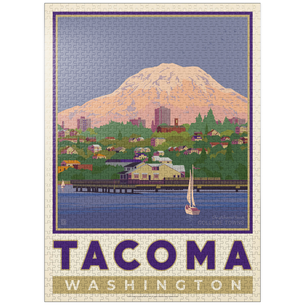 Tacoma, Washington, home to the University of Puget Sound, is beautifully illustrated in this artwork featuring the city's waterfront with Mount Rainier towering in the background. Colorful homes and buildings line the hillside, while sailboats glide across the calm waters of Commencement Bay. The majestic, snow-capped peak of Rainier dominates the skyline, symbolizing the natural beauty that surrounds the Pacific Northwest. Known as one of America's favorite college towns, Tacoma blends academic life, vibrant culture, and outdoor adventure. This design captures both the charm of the waterfront and the grandeur of Washington's most famous mountain.