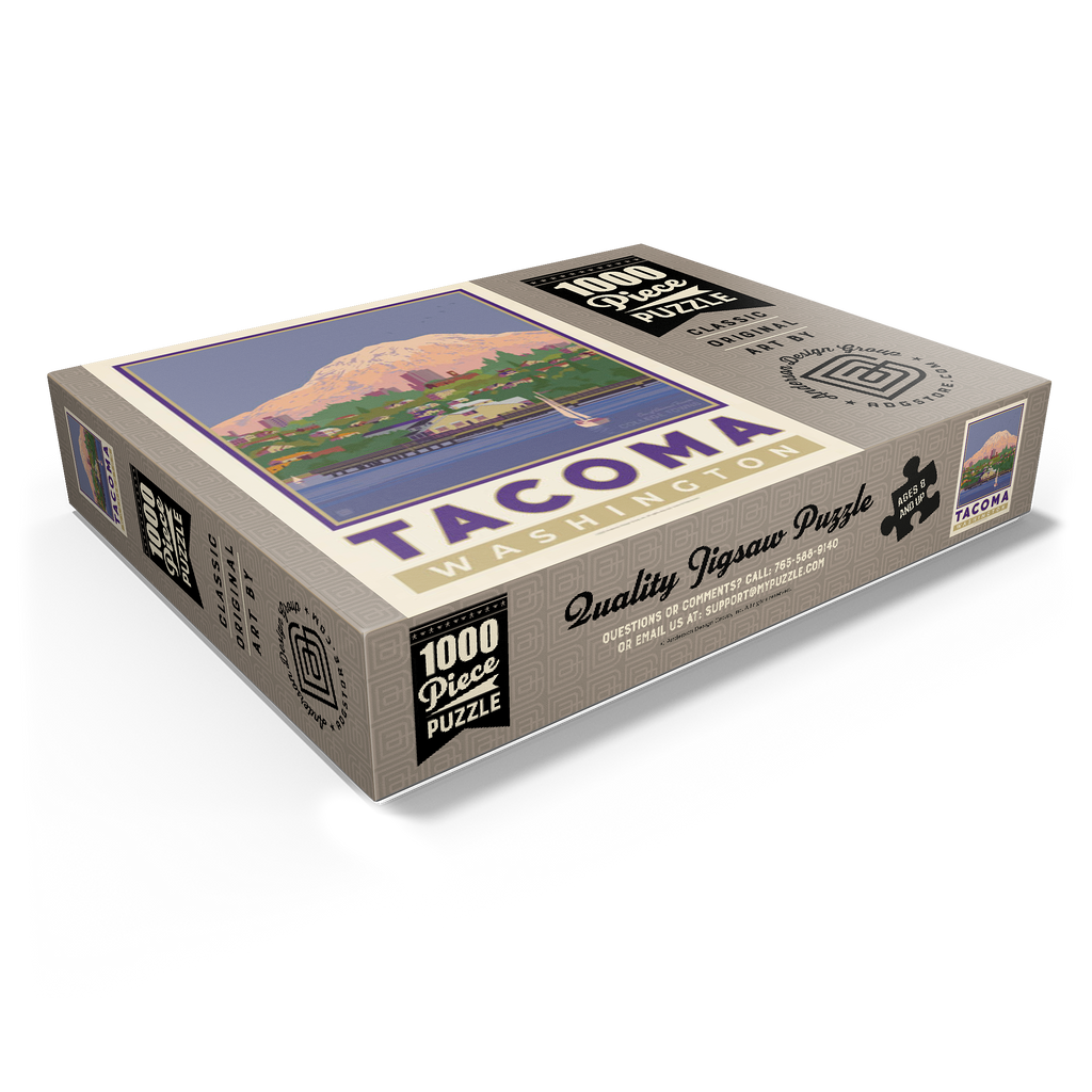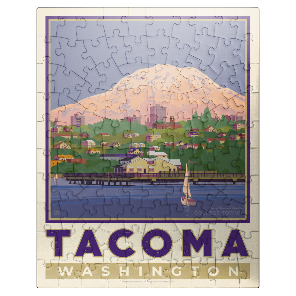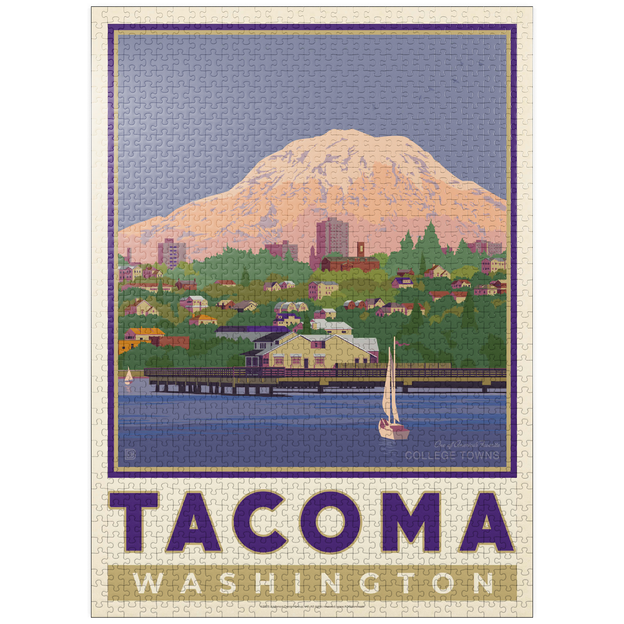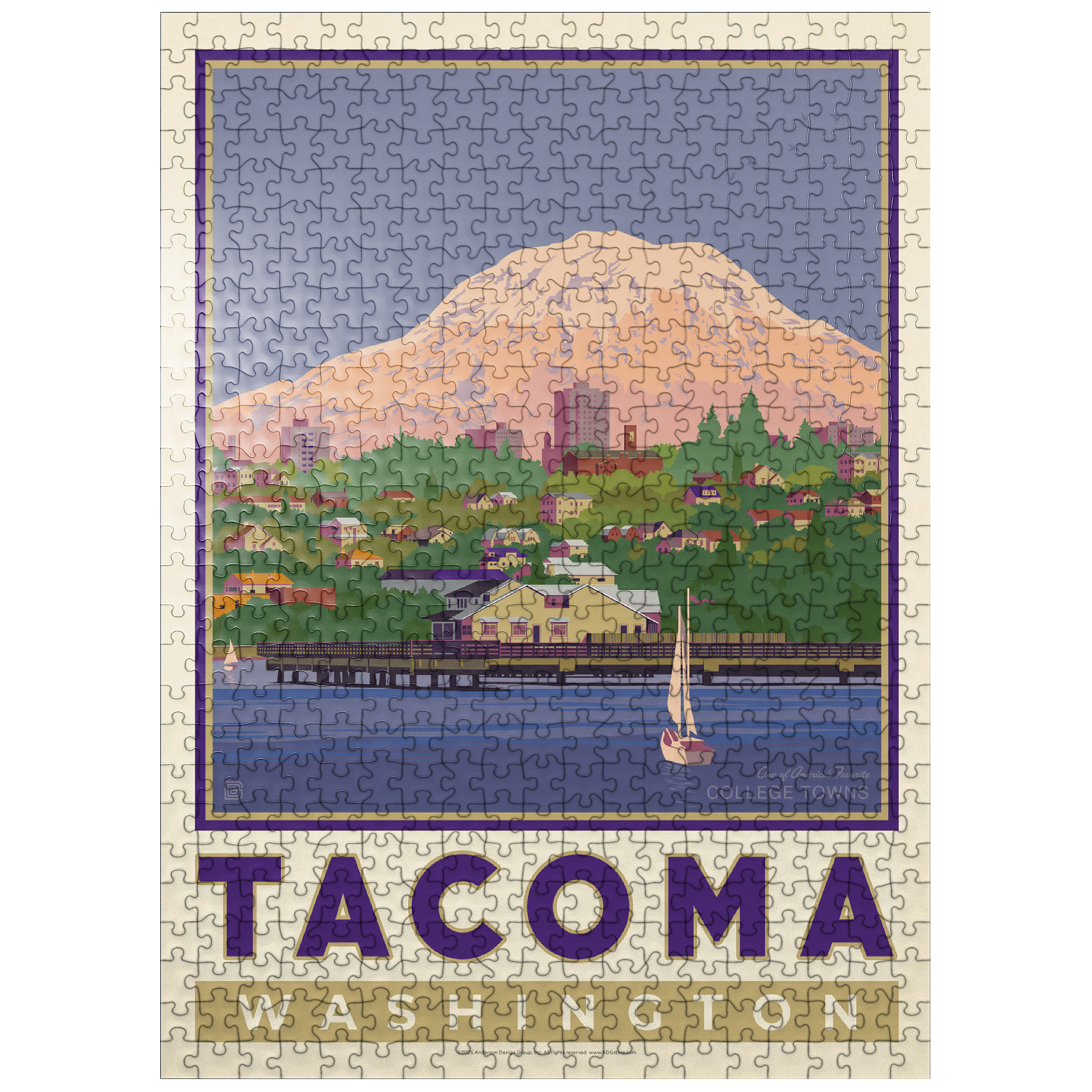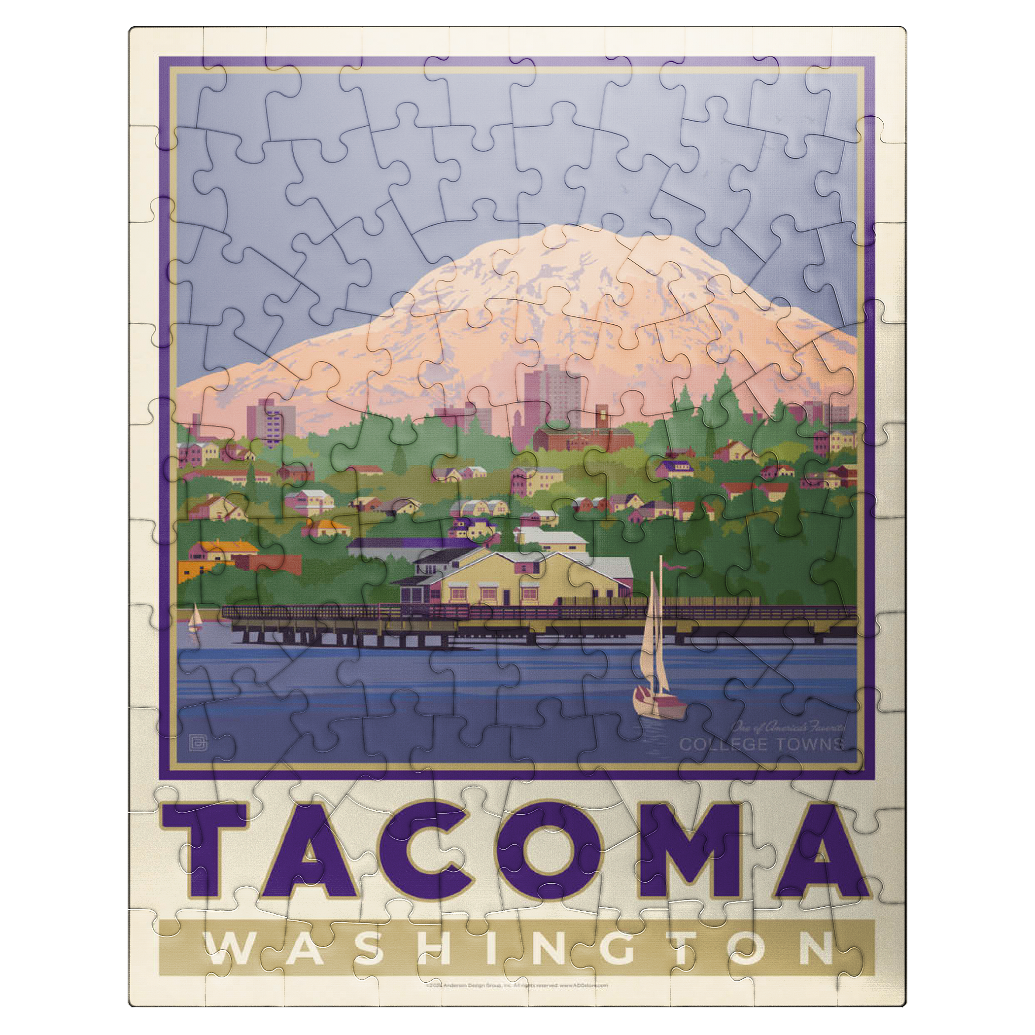 Tacoma, Washington, home to the University of Puget Sound, is beautifully illustrated in this artwork featuring the city's waterfront with Mount Rainier towering in the background. Colorful homes and buildings line the hillside, while sailboats glide across the calm waters of Commencement Bay. The majestic, snow-capped peak of Rainier dominates the skyline, symbolizing the natural beauty that surrounds the Pacific Northwest. Known as one of America's favorite college towns, Tacoma blends academic life, vibrant culture, and outdoor adventure. This design captures both the charm of the waterfront and the grandeur of Washington's most famous mountain.
