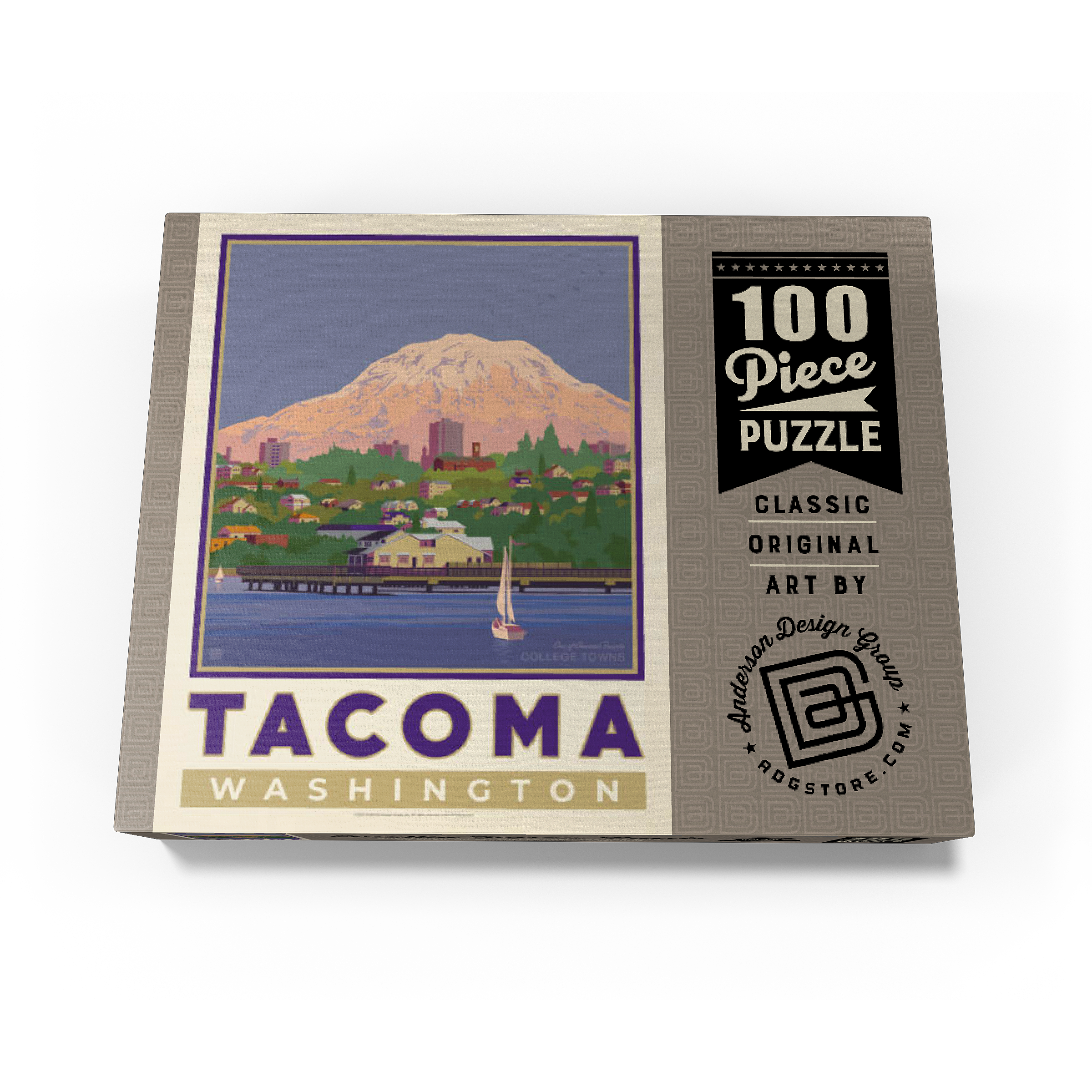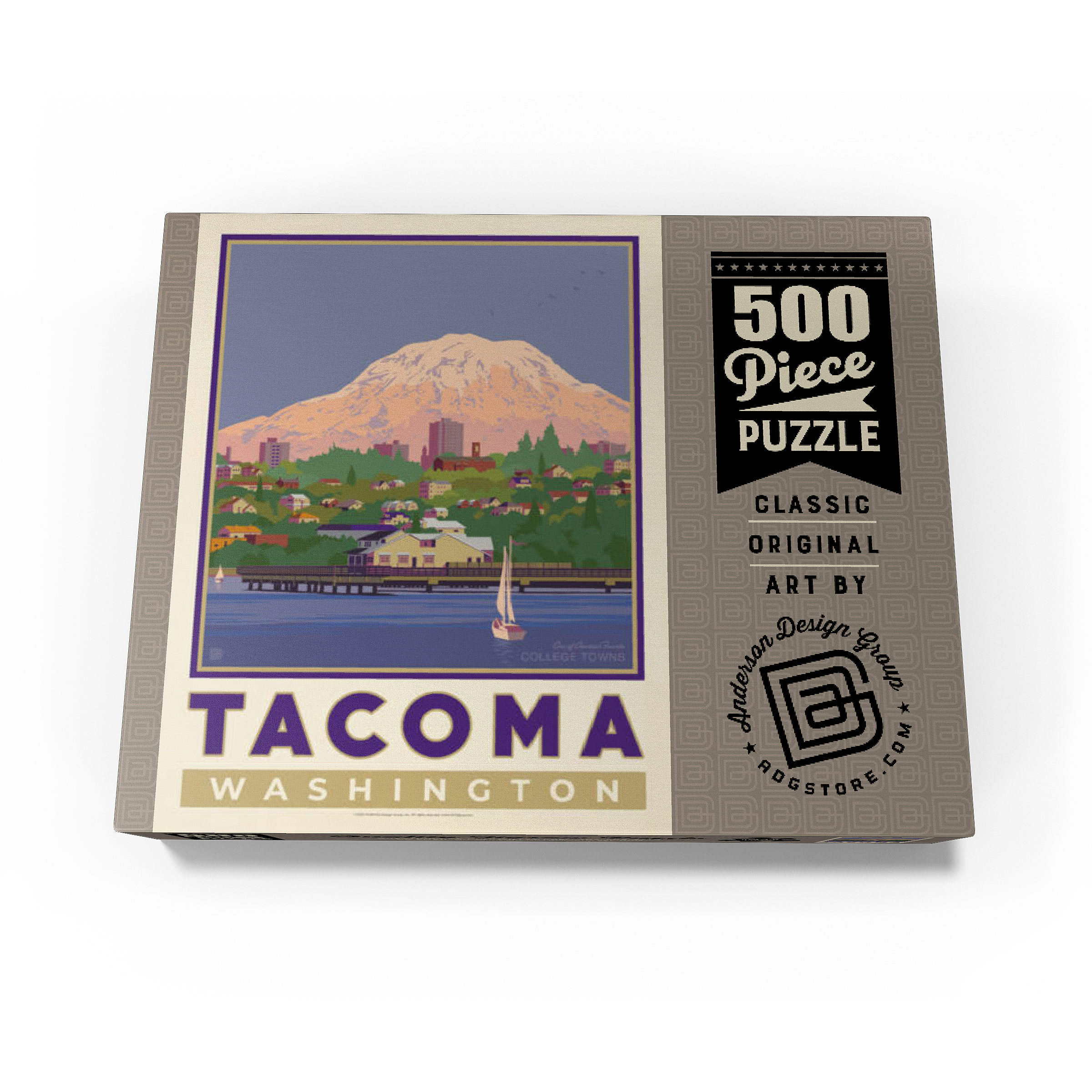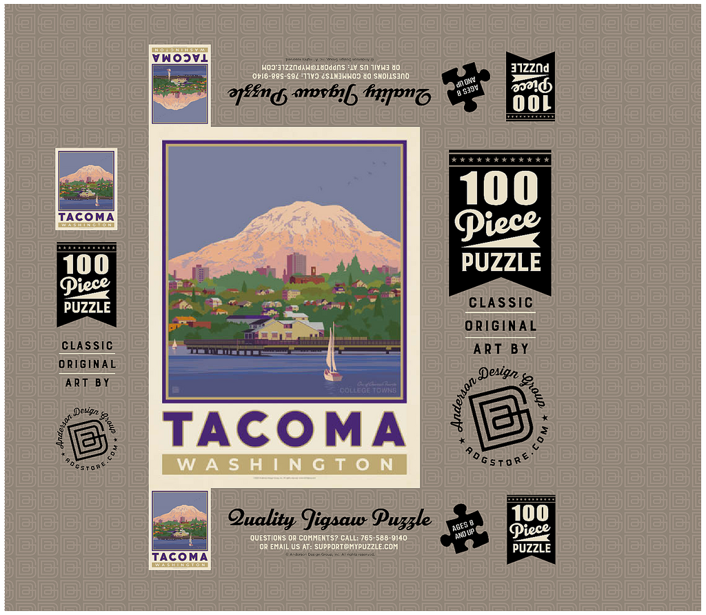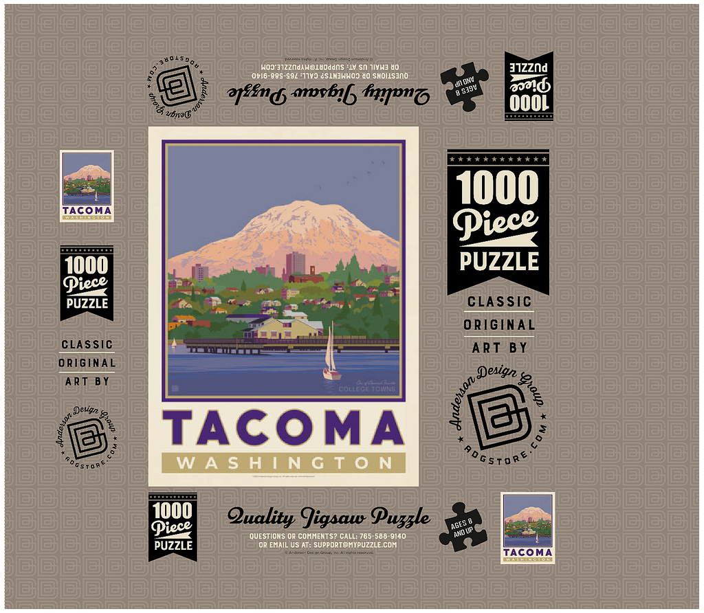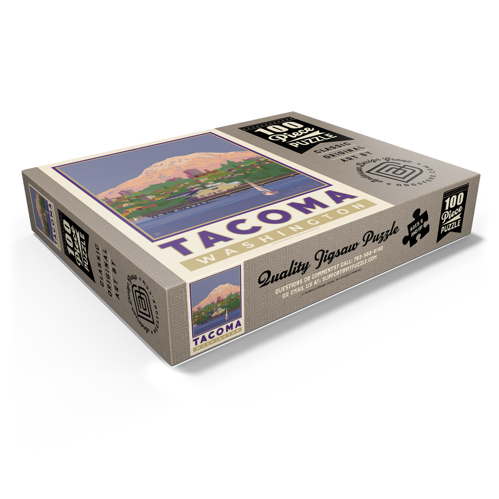Tacoma, Washington, home to the University of Puget Sound, is beautifully illustrated in this artwork featuring the city's waterfront with Mount Rainier towering in the background. Colorful homes and buildings line the hillside, while sailboats glide across the calm waters of Commencement Bay. The majestic, snow-capped peak of Rainier dominates the skyline, symbolizing the natural beauty that surrounds the Pacific Northwest. Known as one of America's favorite college towns, Tacoma blends academic life, vibrant culture, and outdoor adventure. This design captures both the charm of the waterfront and the grandeur of Washington's most famous mountain.