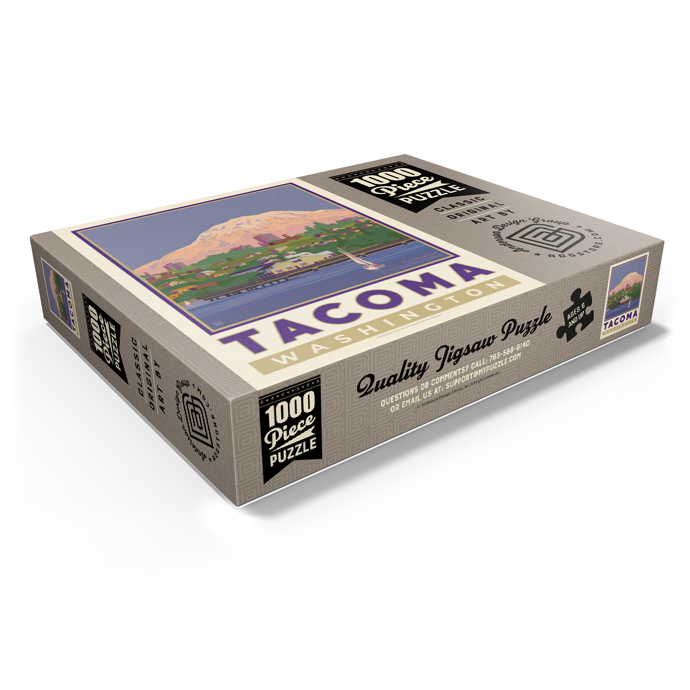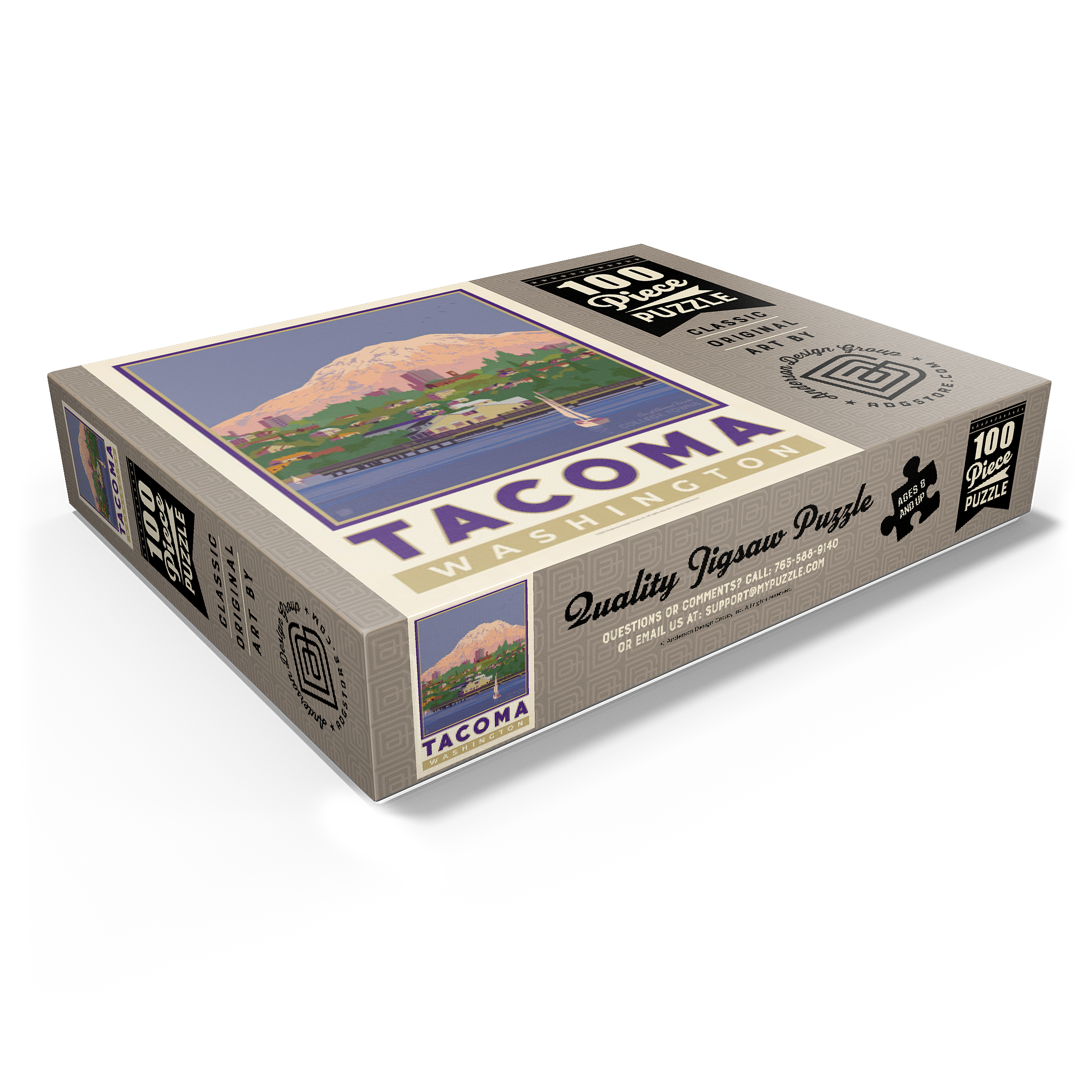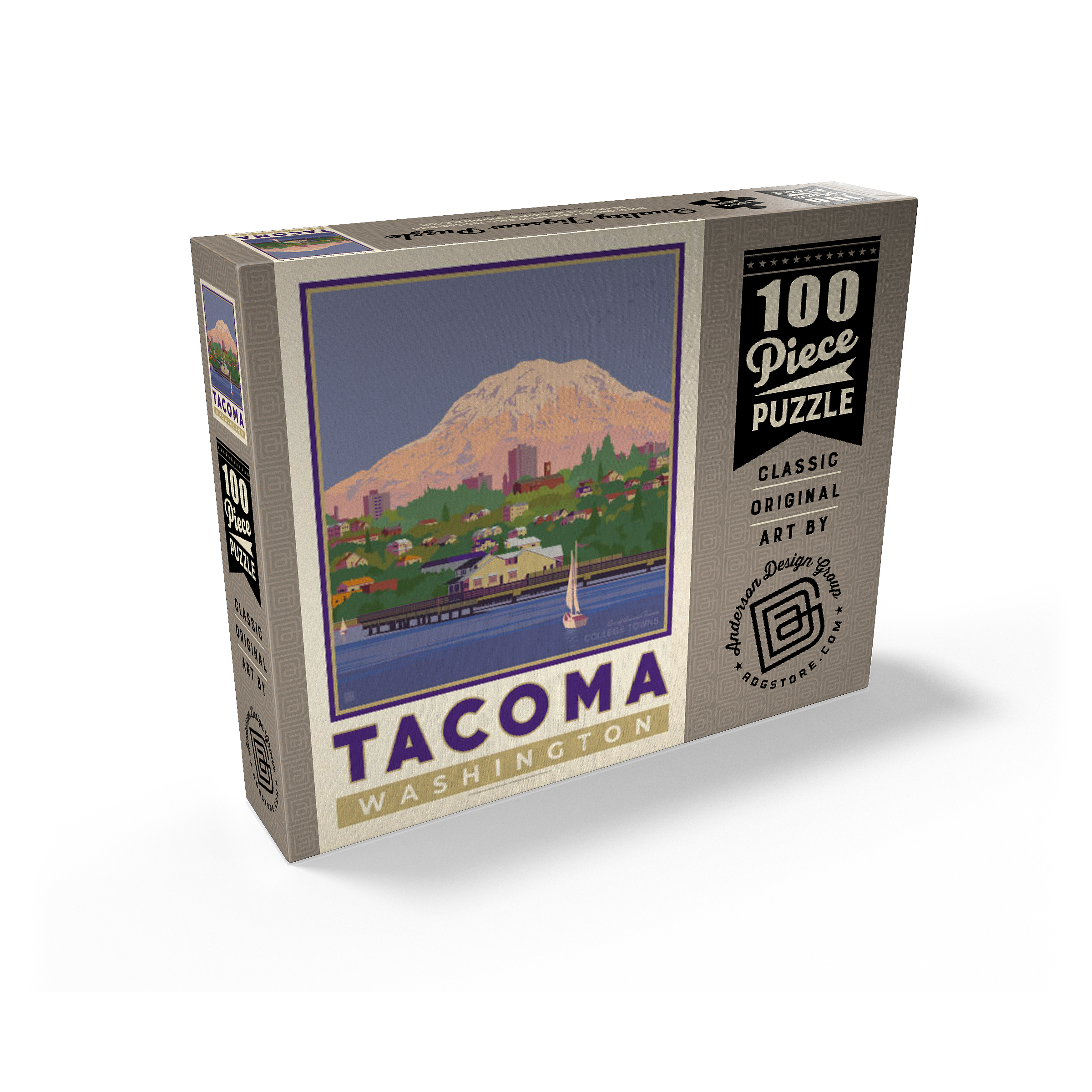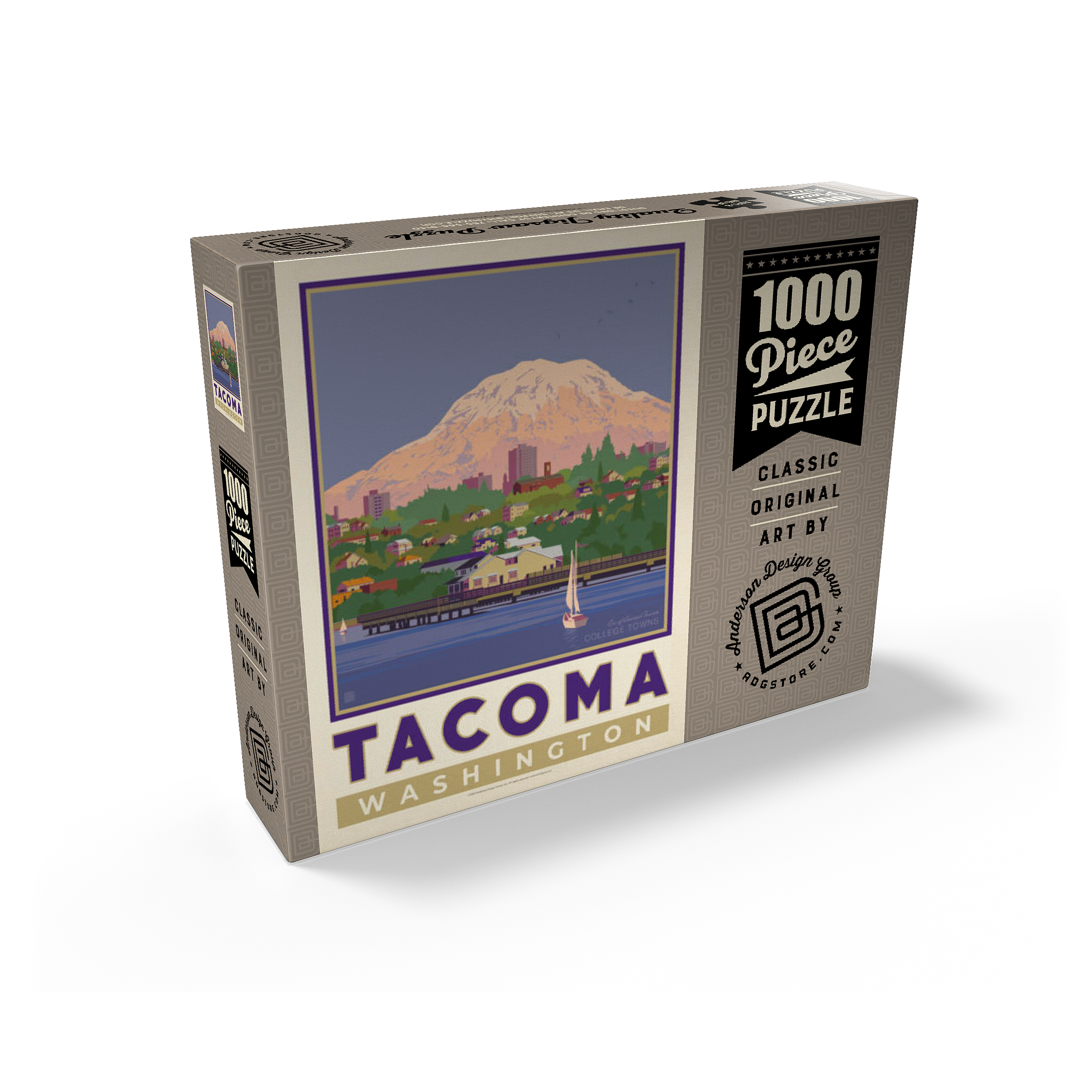 Tacoma, Washington, home to the University of Puget Sound, is beautifully illustrated in this artwork featuring the city's waterfront with Mount Rainier towering in the background. Colorful homes and buildings line the hillside, while sailboats glide across the calm waters of Commencement Bay. The majestic, snow-capped peak of Rainier dominates the skyline, symbolizing the natural beauty that surrounds the Pacific Northwest. Known as one of America's favorite college towns, Tacoma blends academic life, vibrant culture, and outdoor adventure. This design captures both the charm of the waterfront and the grandeur of Washington's most famous mountain.