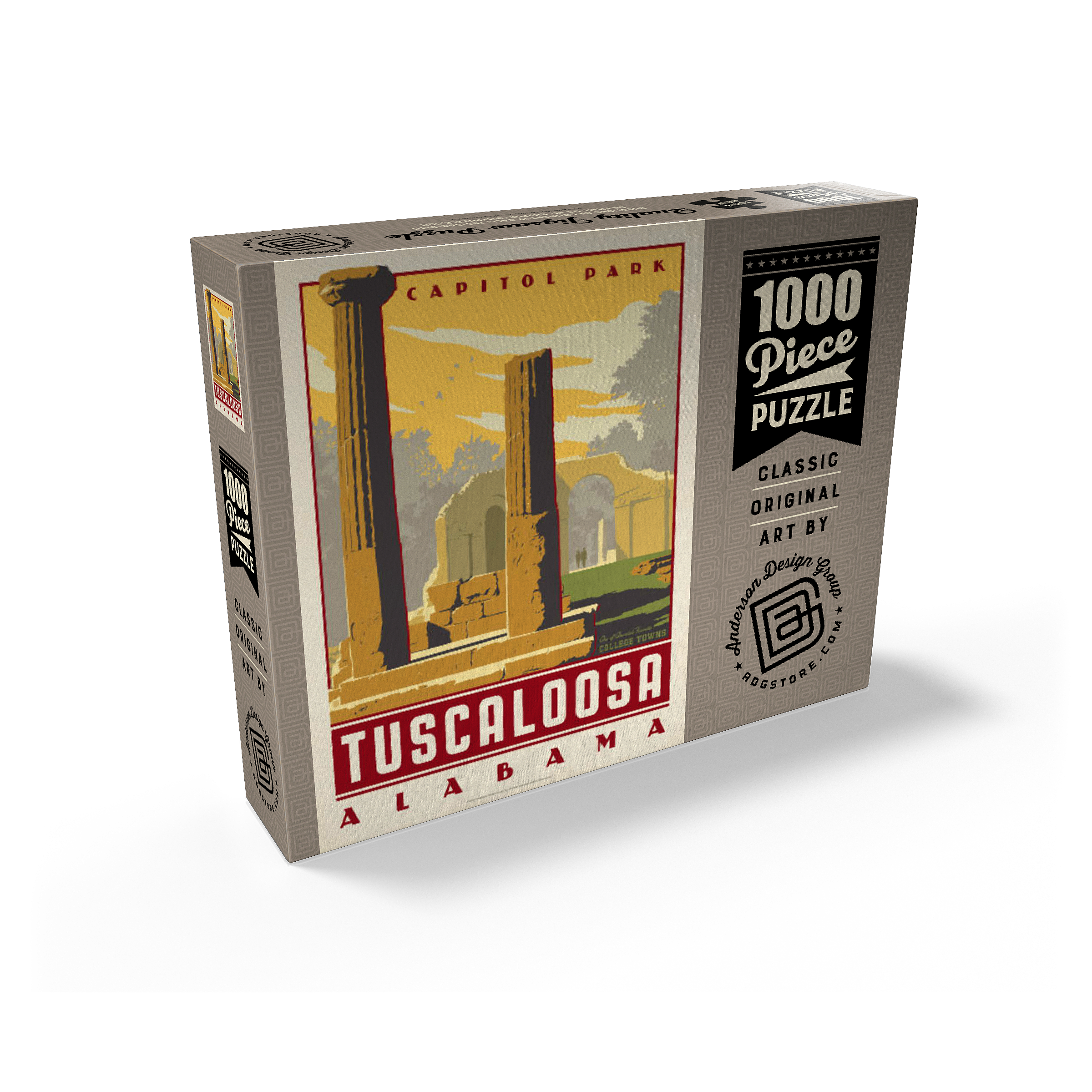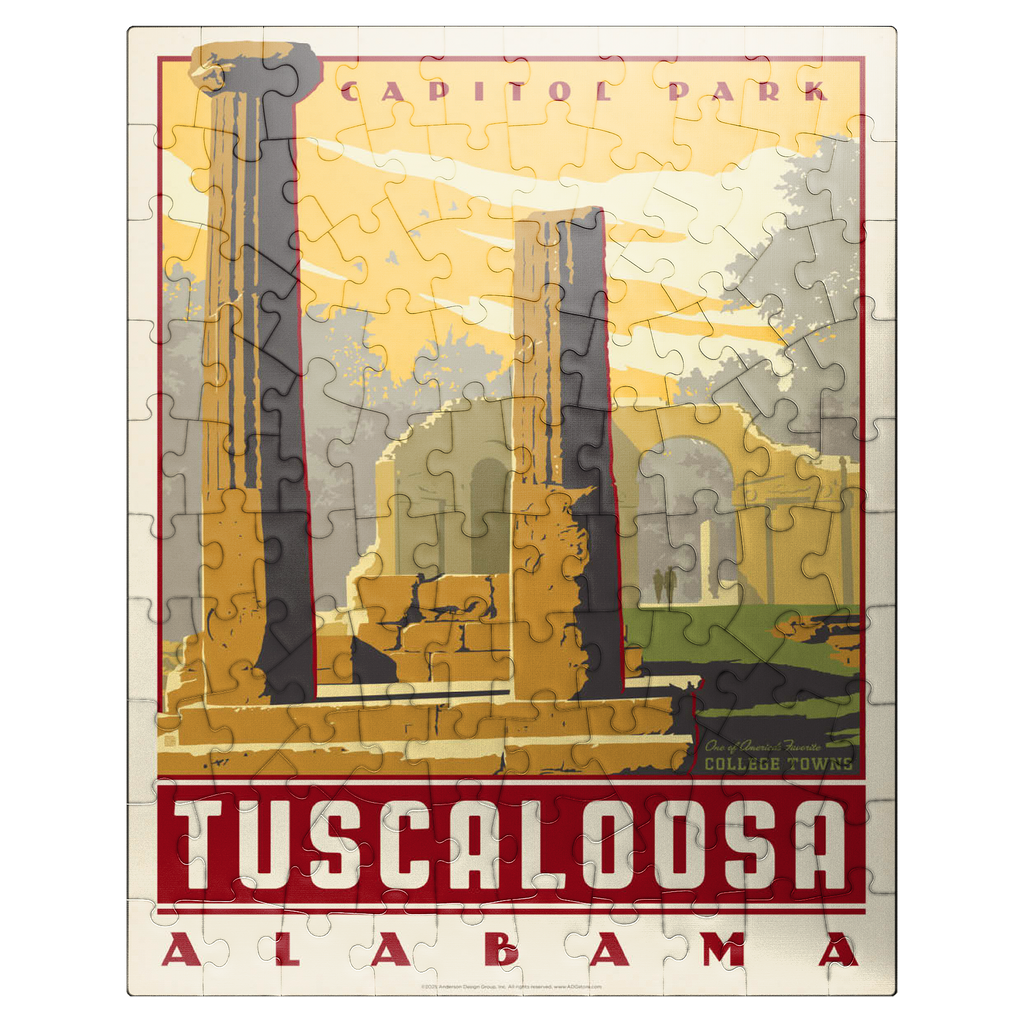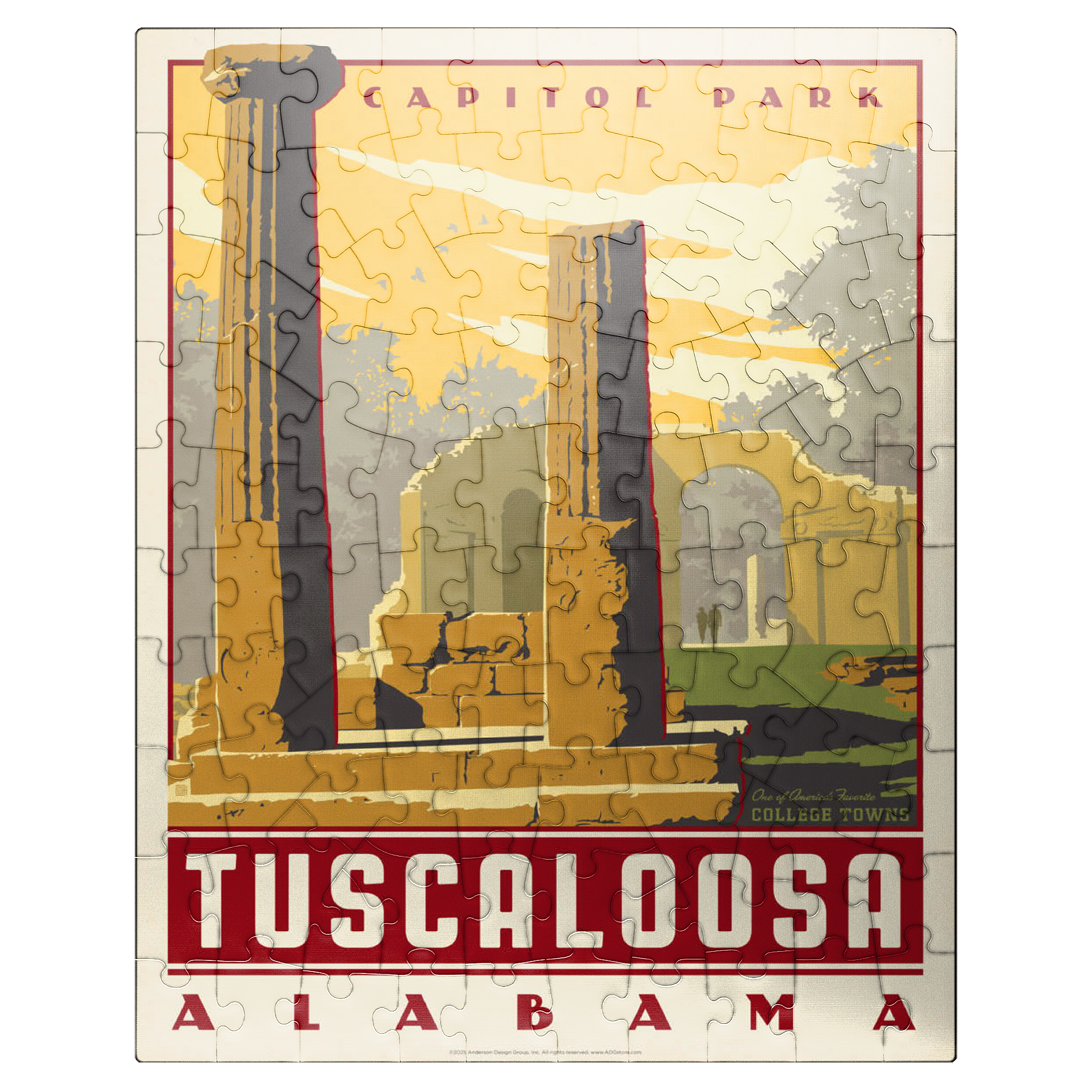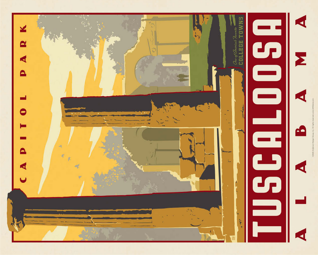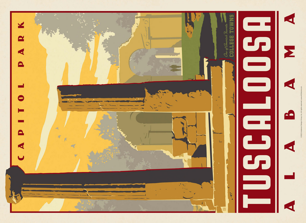 Tuscaloosa, Alabama, home to the University of Alabama, is represented here through the striking ruins of Capitol Park, where the state's former capitol building once stood. the weathered stone columns and remnants of arches evoke a sense of history and resilience, set against a warm Southern sunset sky. this site, a reminder of Alabama's 19th-century heritage, is now a peaceful park enjoyed by locals, students, and visitors. Tuscaloosa blends its rich history with vibrant university life, making it one of the South's most distinctive college towns. this artwork highlights its historic charm and cultural legacy.