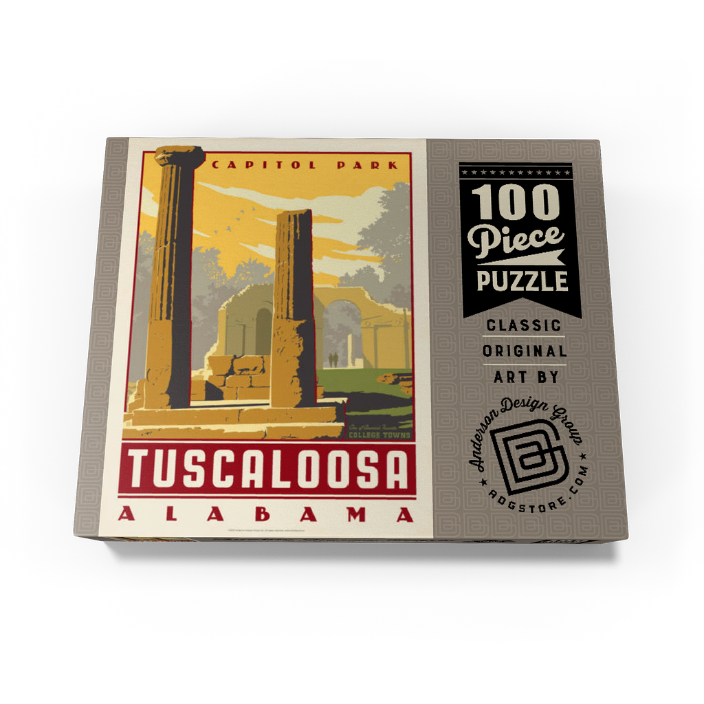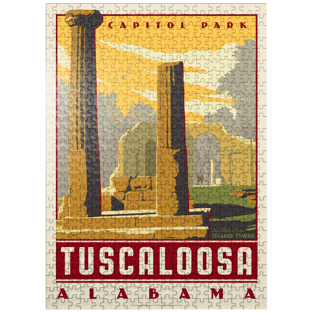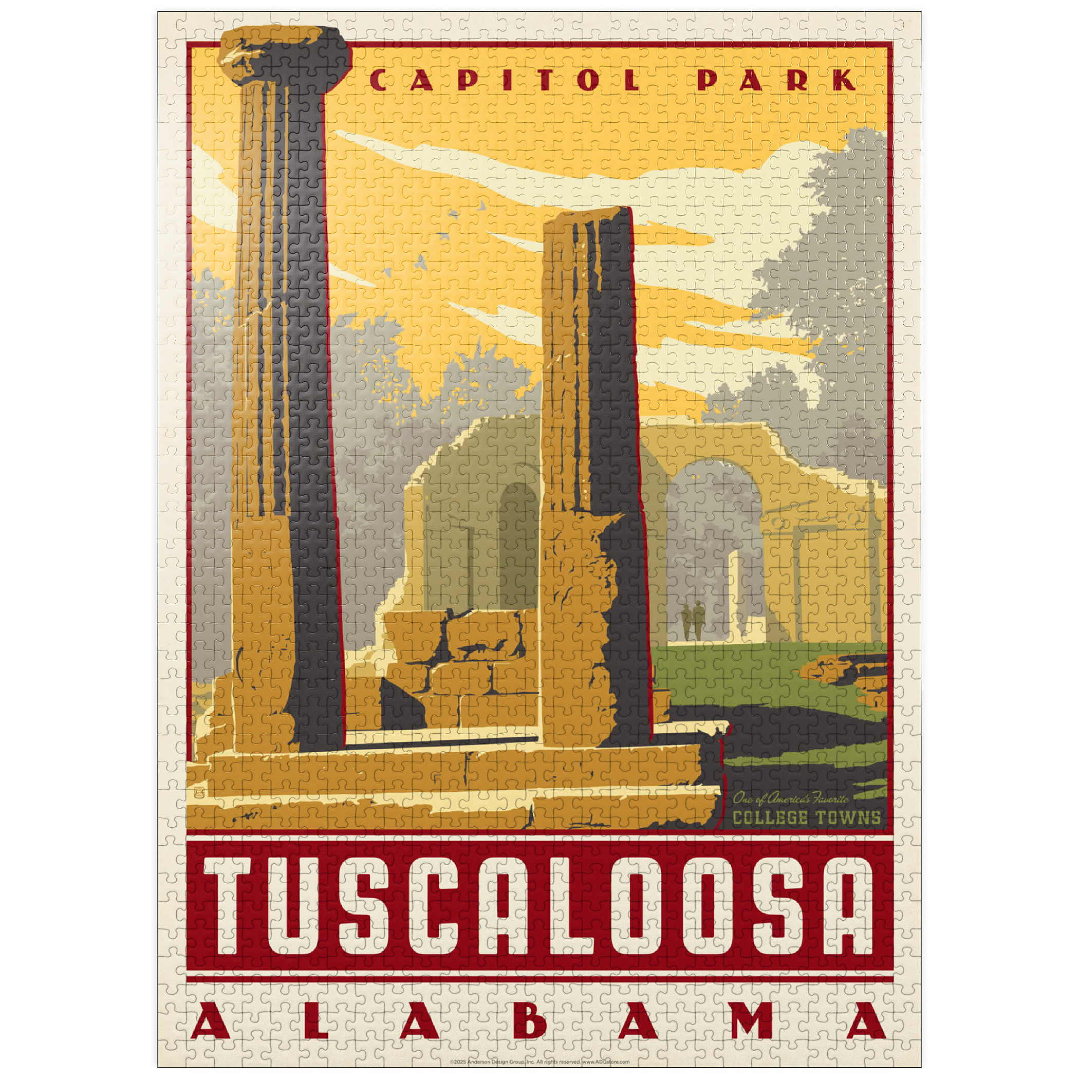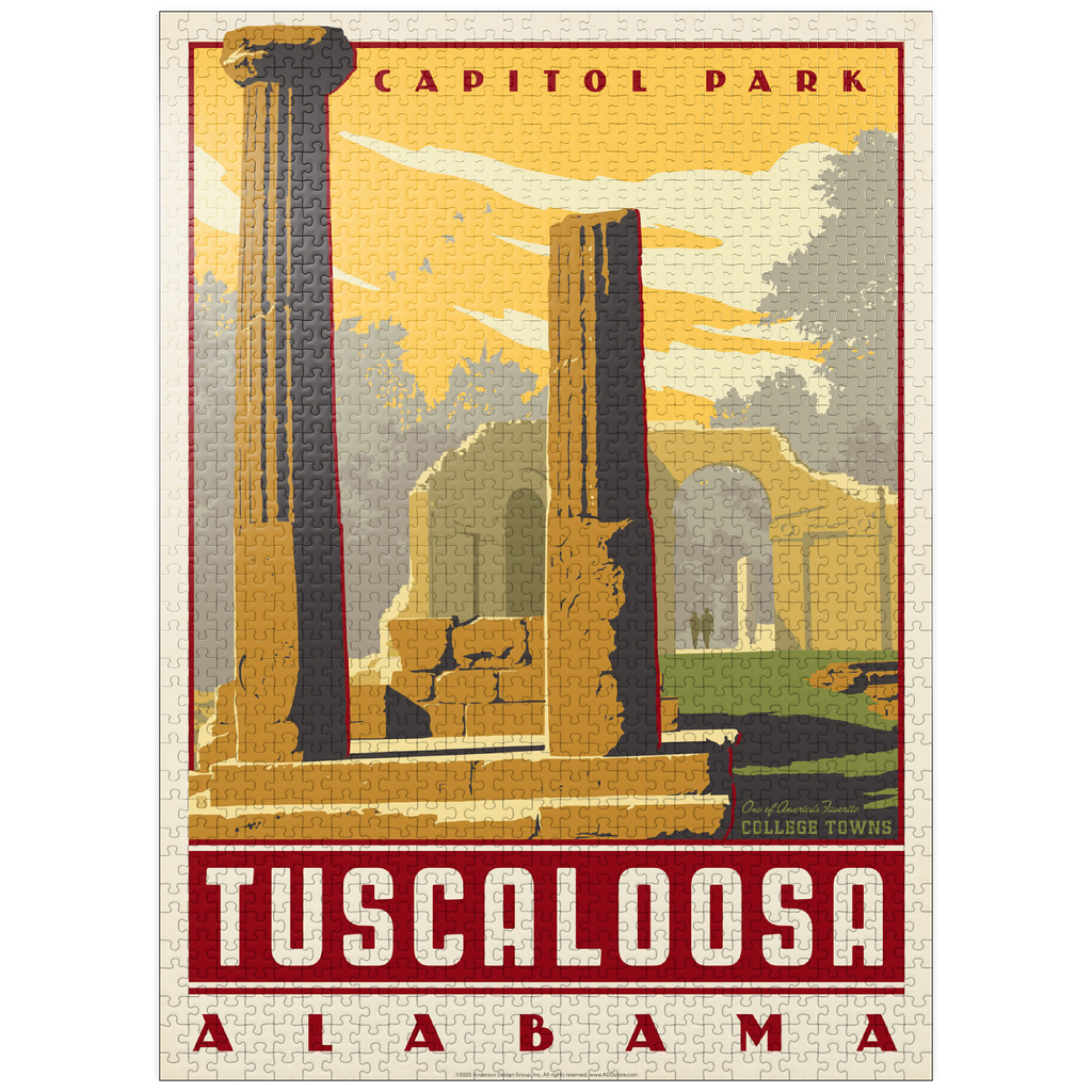 Tuscaloosa, Alabama, home to the University of Alabama, is represented here through the striking ruins of Capitol Park, where the state's former capitol building once stood. the weathered stone columns and remnants of arches evoke a sense of history and resilience, set against a warm Southern sunset sky. this site, a reminder of Alabama's 19th-century heritage, is now a peaceful park enjoyed by locals, students, and visitors. Tuscaloosa blends its rich history with vibrant university life, making it one of the South's most distinctive college towns. this artwork highlights its historic charm and cultural legacy.