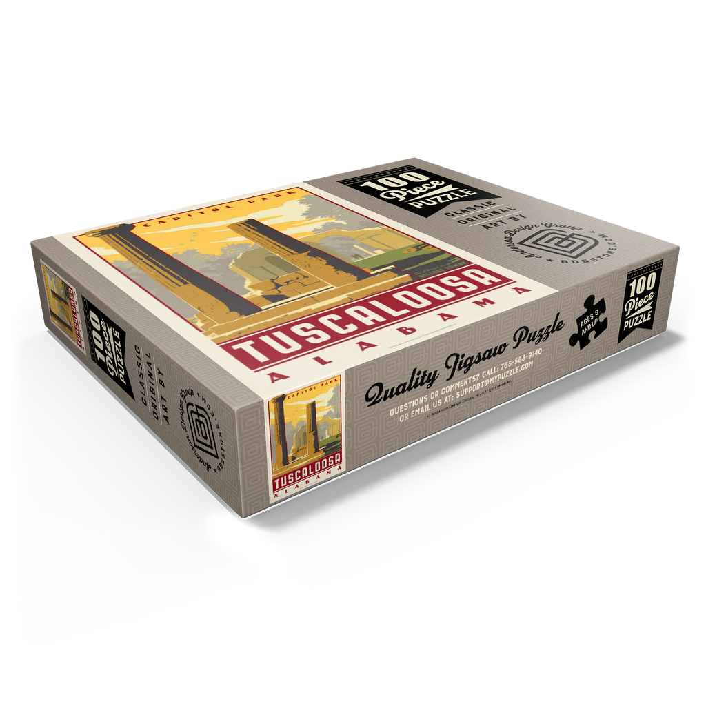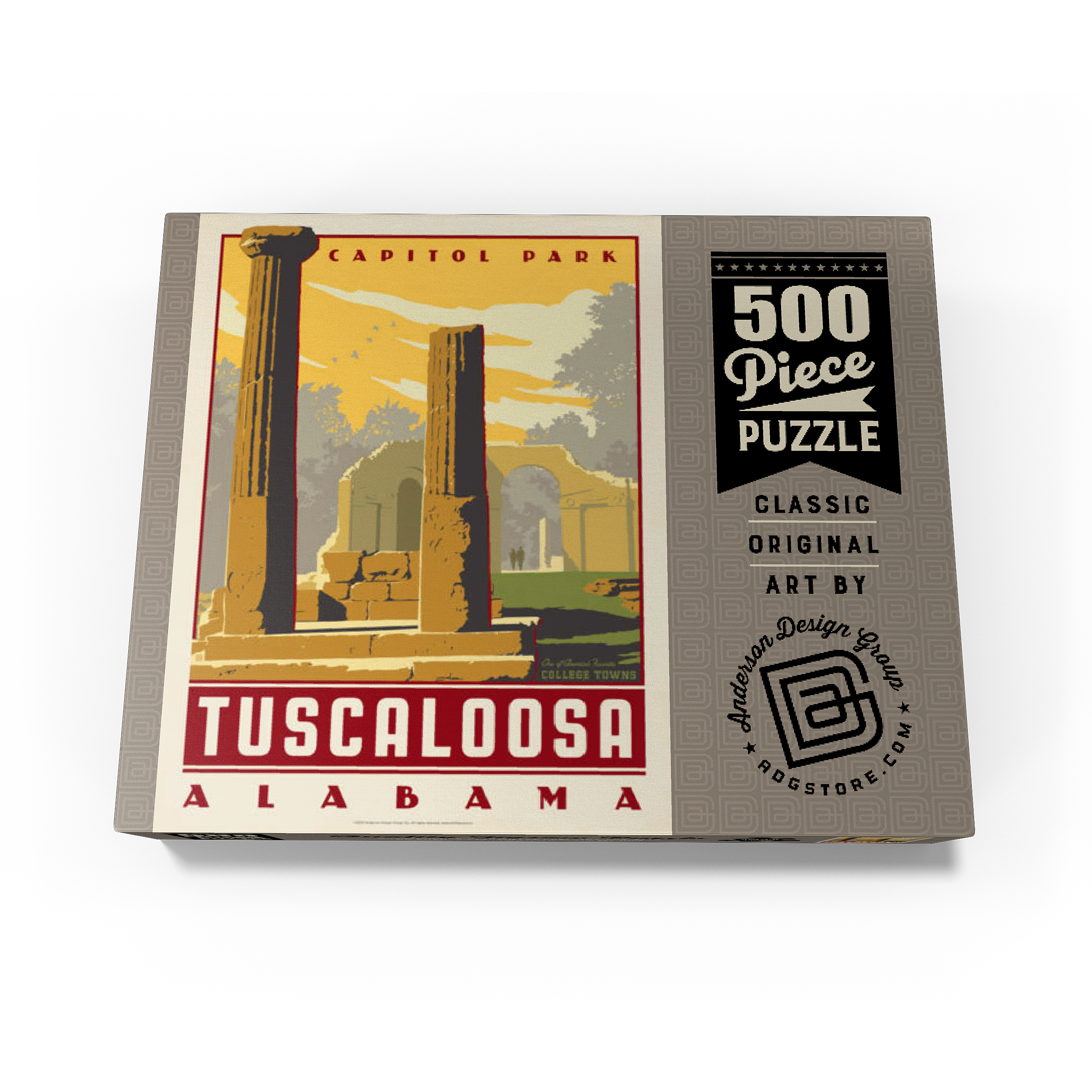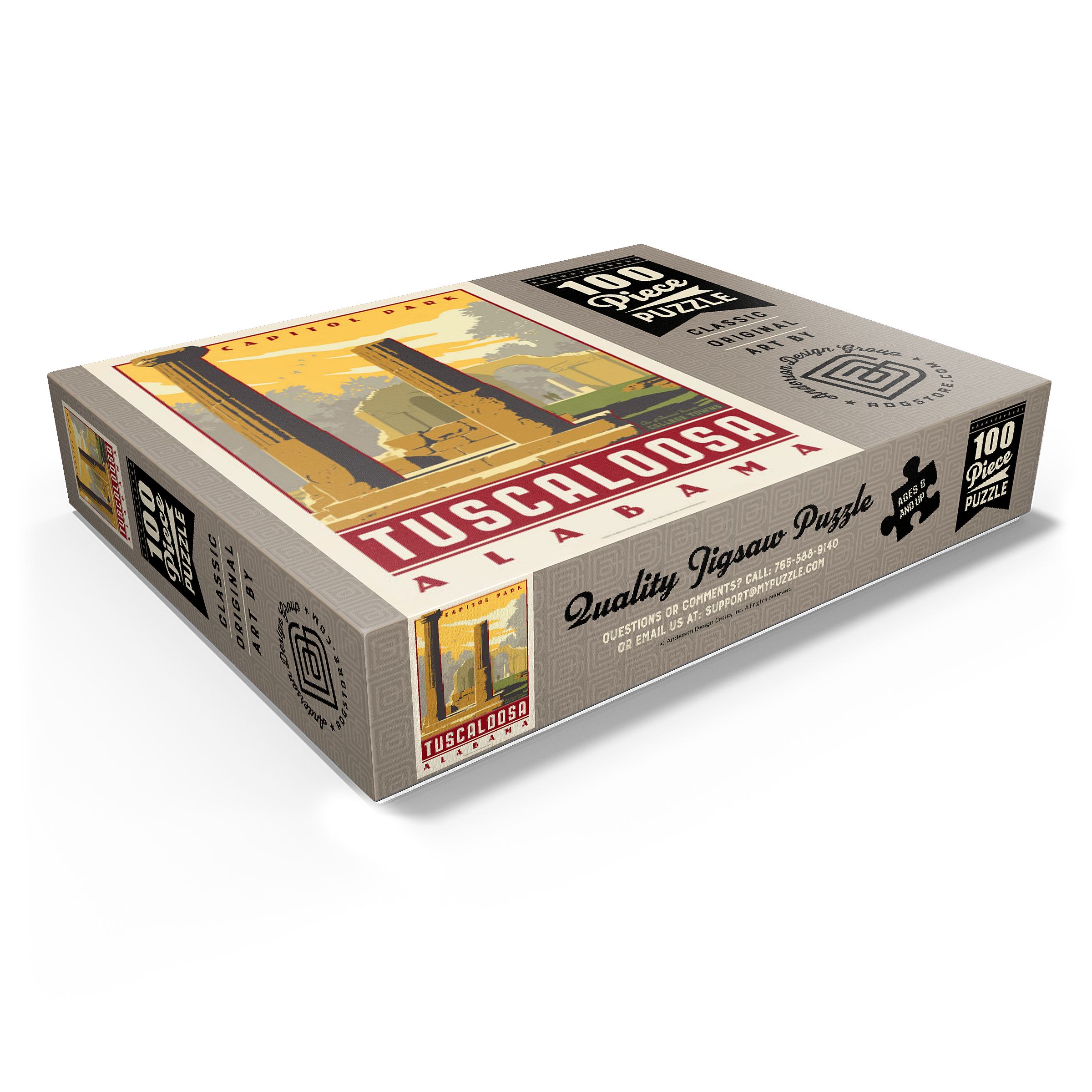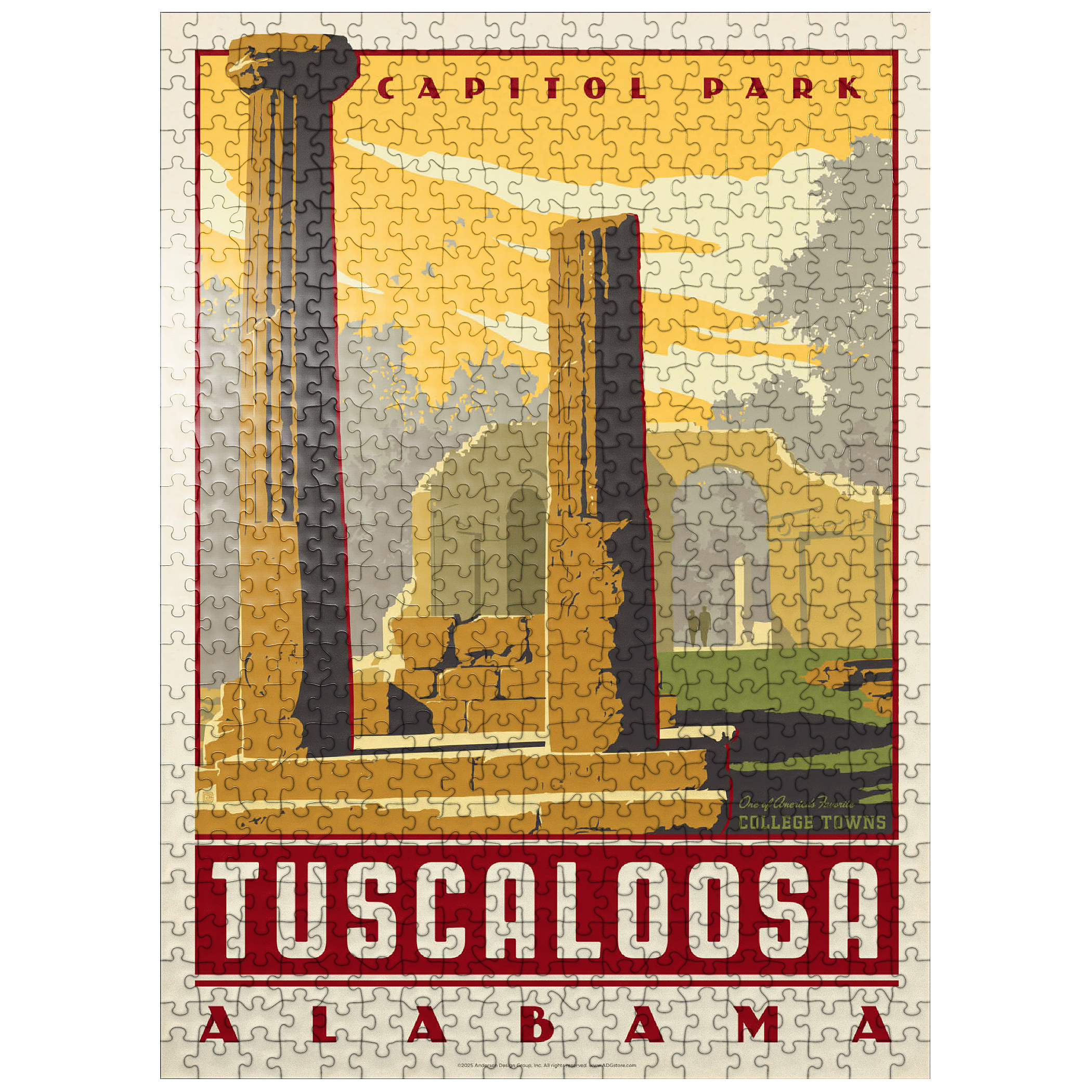 Tuscaloosa, Alabama, home to the University of Alabama, is represented here through the striking ruins of Capitol Park, where the state's former capitol building once stood. the weathered stone columns and remnants of arches evoke a sense of history and resilience, set against a warm Southern sunset sky. this site, a reminder of Alabama's 19th-century heritage, is now a peaceful park enjoyed by locals, students, and visitors. Tuscaloosa blends its rich history with vibrant university life, making it one of the South's most distinctive college towns. this artwork highlights its historic charm and cultural legacy.