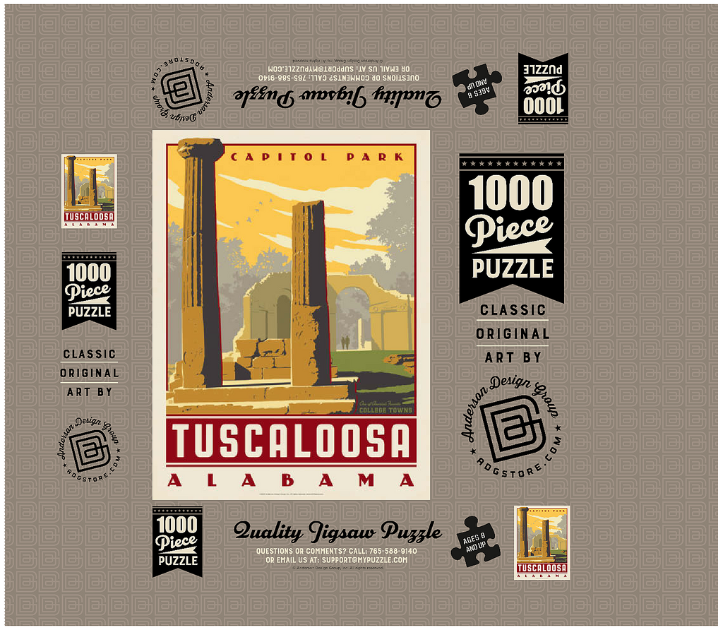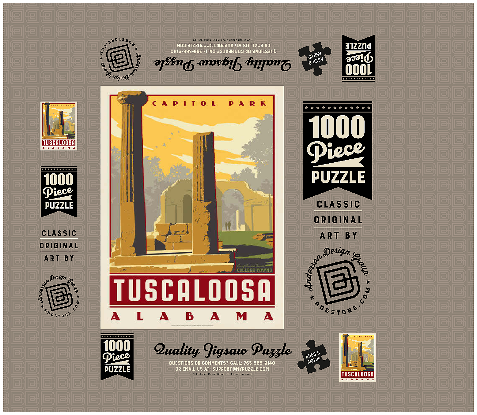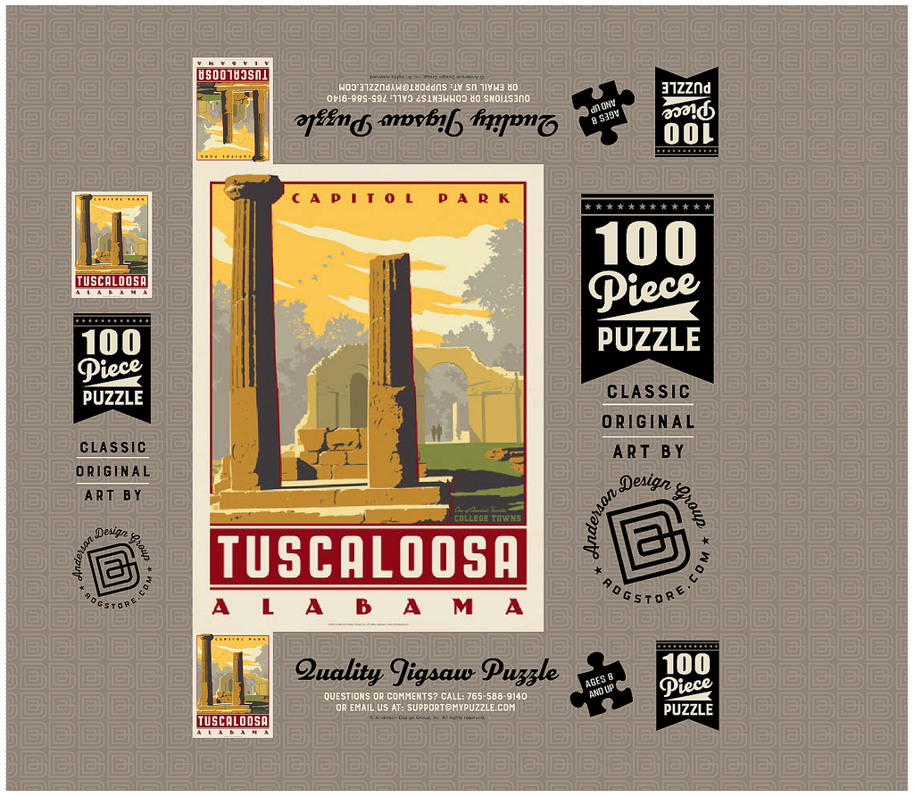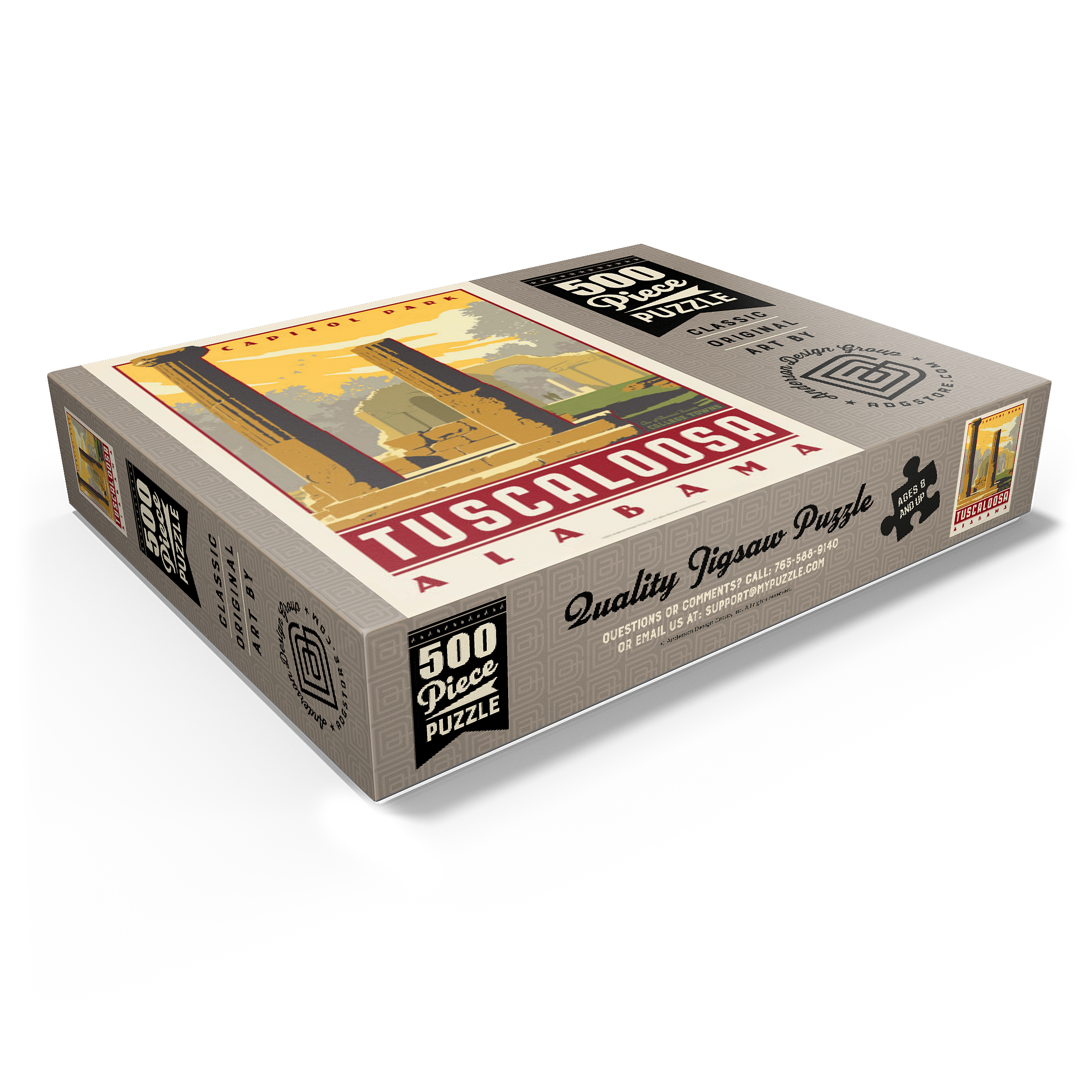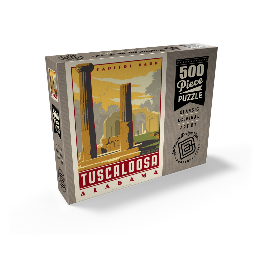 Tuscaloosa, Alabama, home to the University of Alabama, is represented here through the striking ruins of Capitol Park, where the state's former capitol building once stood. the weathered stone columns and remnants of arches evoke a sense of history and resilience, set against a warm Southern sunset sky. this site, a reminder of Alabama's 19th-century heritage, is now a peaceful park enjoyed by locals, students, and visitors. Tuscaloosa blends its rich history with vibrant university life, making it one of the South's most distinctive college towns. this artwork highlights its historic charm and cultural legacy.