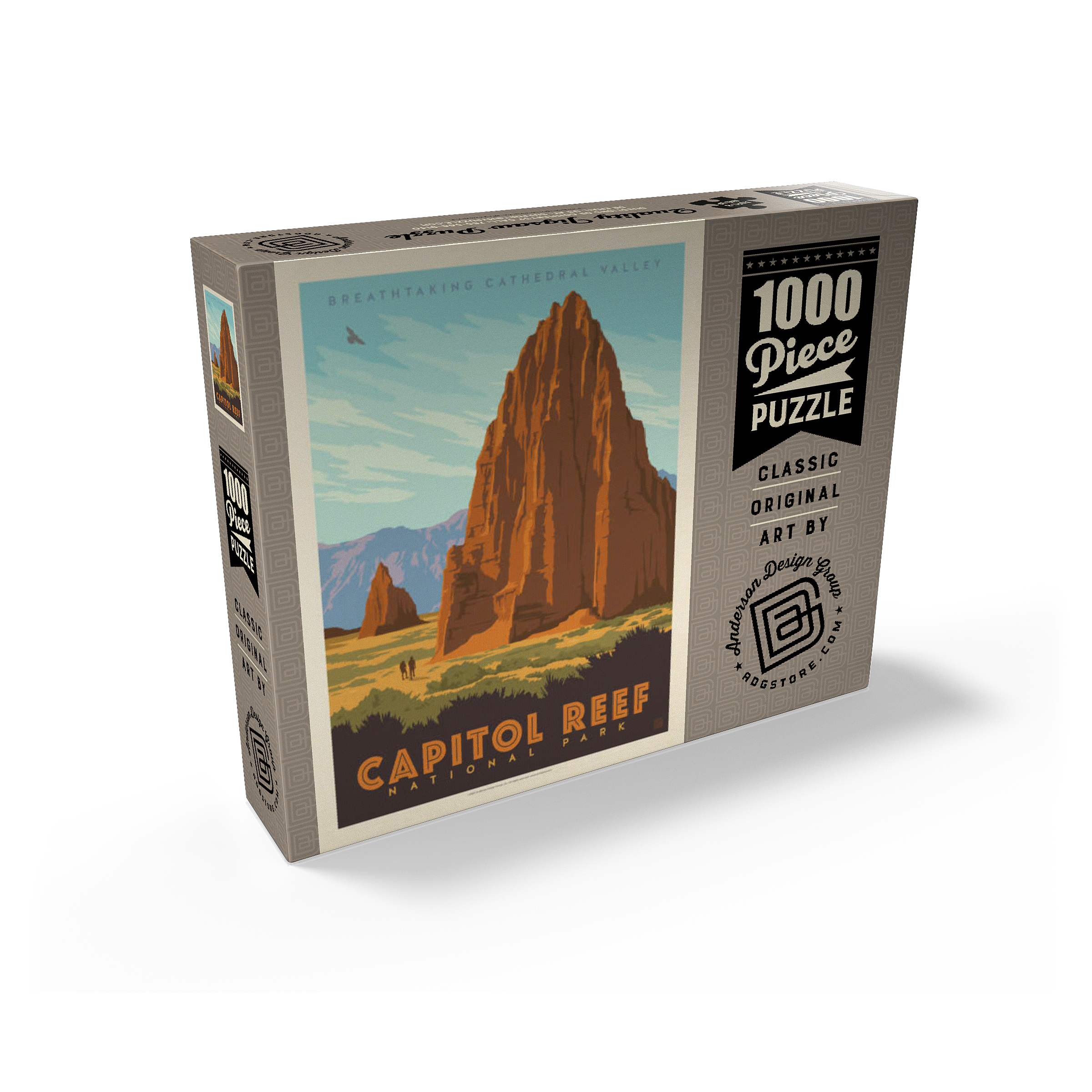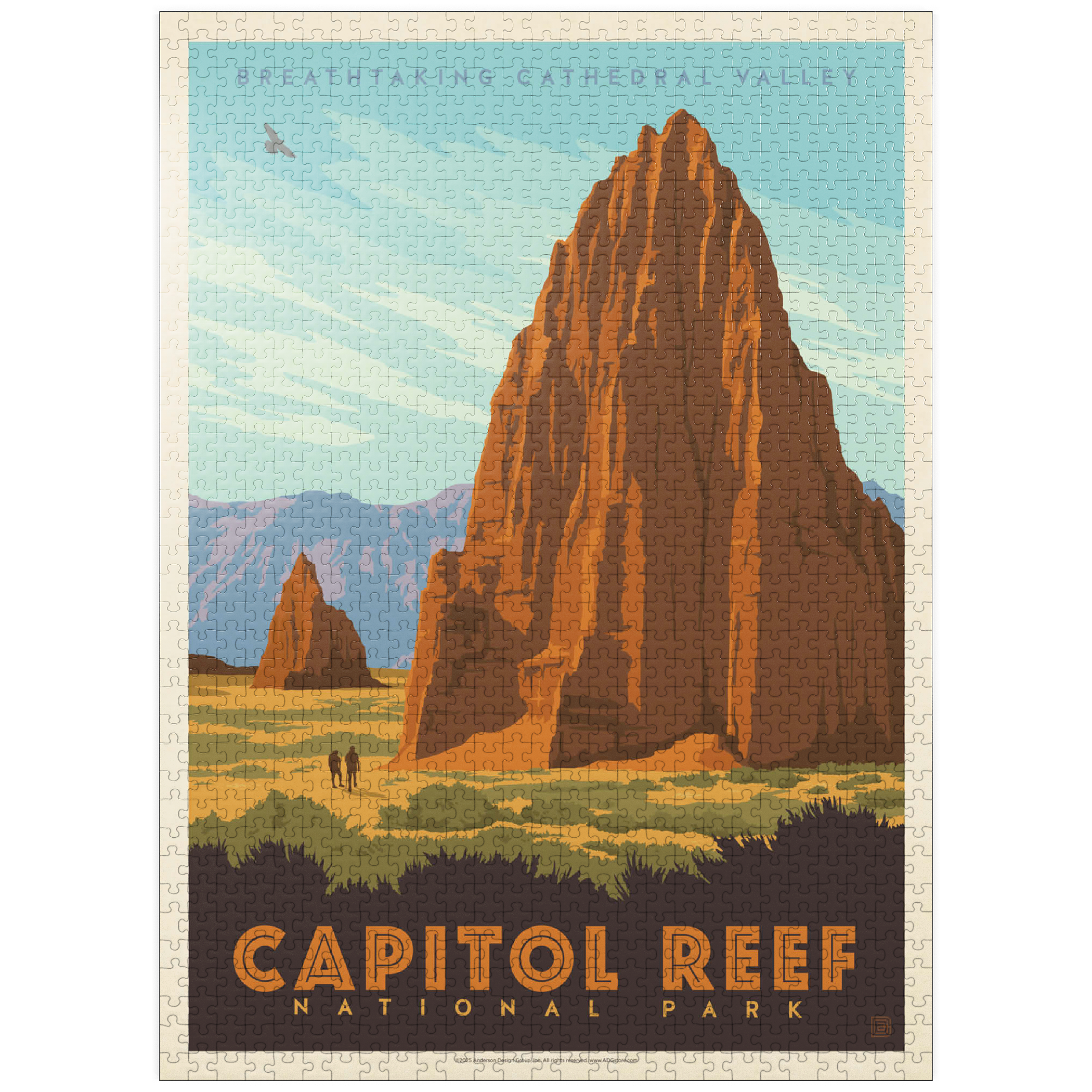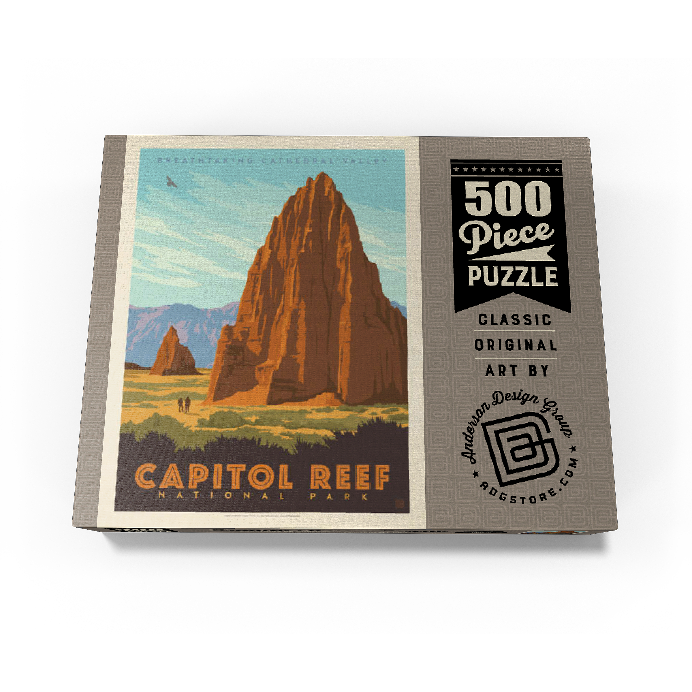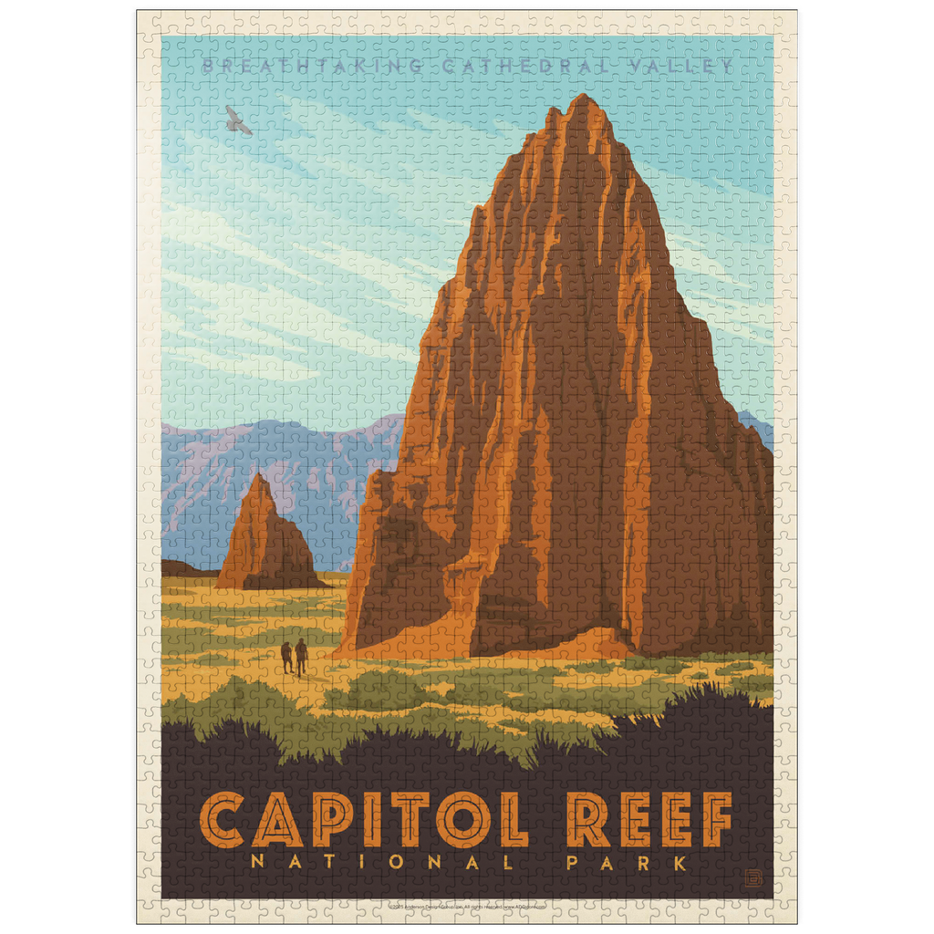 Cathedral Valley in Capitol Reef National Park, Utah, features towering monolithic sandstone formations that rise dramatically from the desert floor. This stylized depiction captures the iconic Temple of the Sun and Temple of the Moon under a wide blue sky, with two hikers walking through the vast, open landscape. The scene highlights the valley's stark beauty, sculpted by erosion and time, and showcases the remote grandeur that defines Capitol Reef. Known for its geologic wonders, solitude, and panoramic desert views, Cathedral Valley is a must-visit for adventurers and photographers drawn to Utah's rugged red rock country.