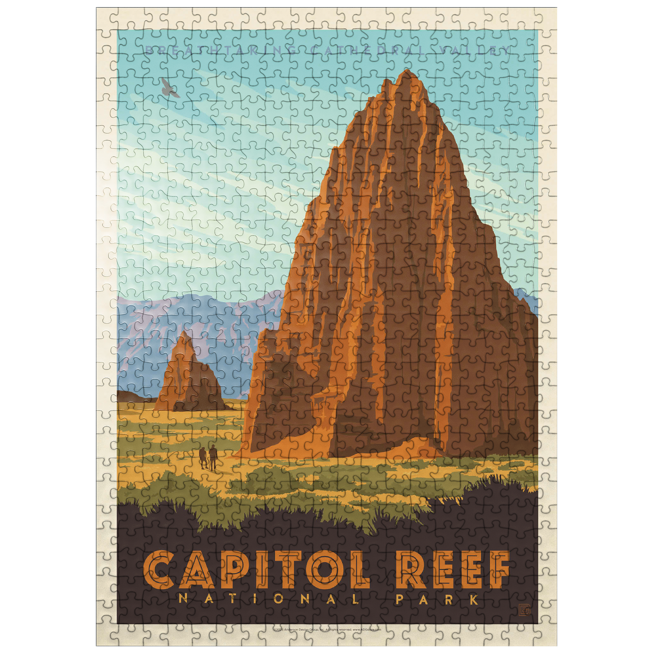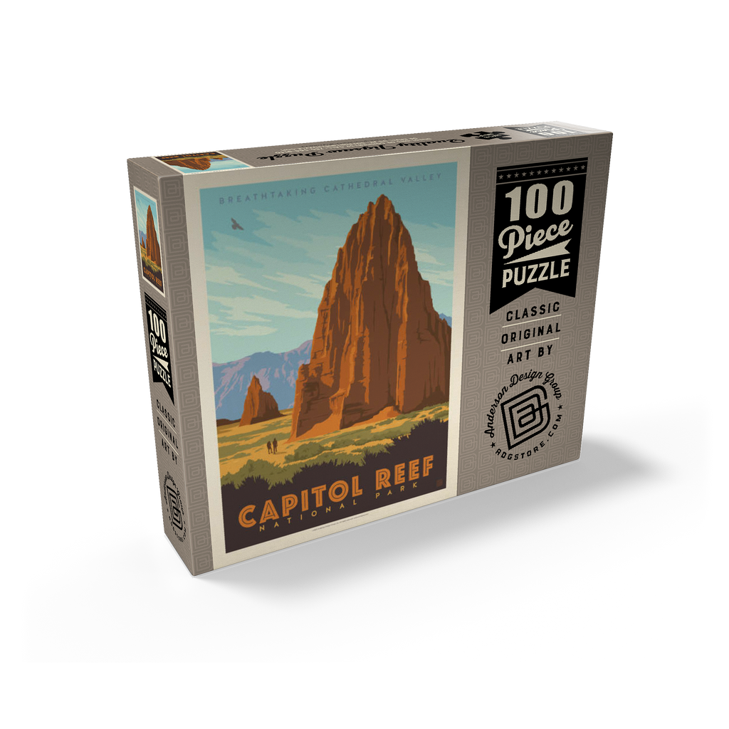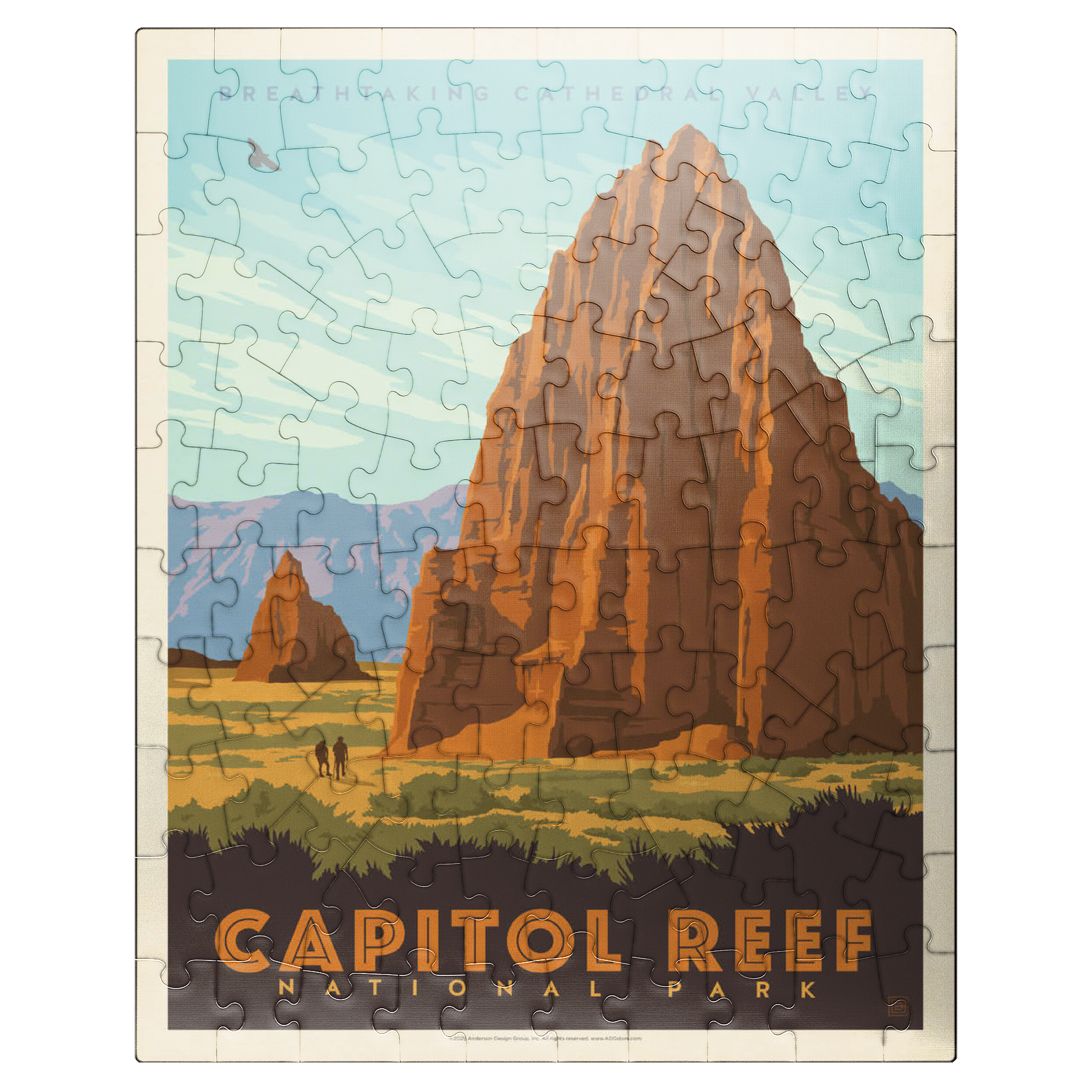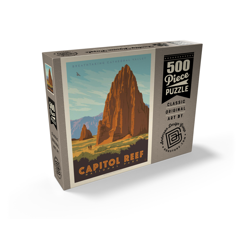 Cathedral Valley in Capitol Reef National Park, Utah, features towering monolithic sandstone formations that rise dramatically from the desert floor. This stylized depiction captures the iconic Temple of the Sun and Temple of the Moon under a wide blue sky, with two hikers walking through the vast, open landscape. The scene highlights the valley's stark beauty, sculpted by erosion and time, and showcases the remote grandeur that defines Capitol Reef. Known for its geologic wonders, solitude, and panoramic desert views, Cathedral Valley is a must-visit for adventurers and photographers drawn to Utah's rugged red rock country.